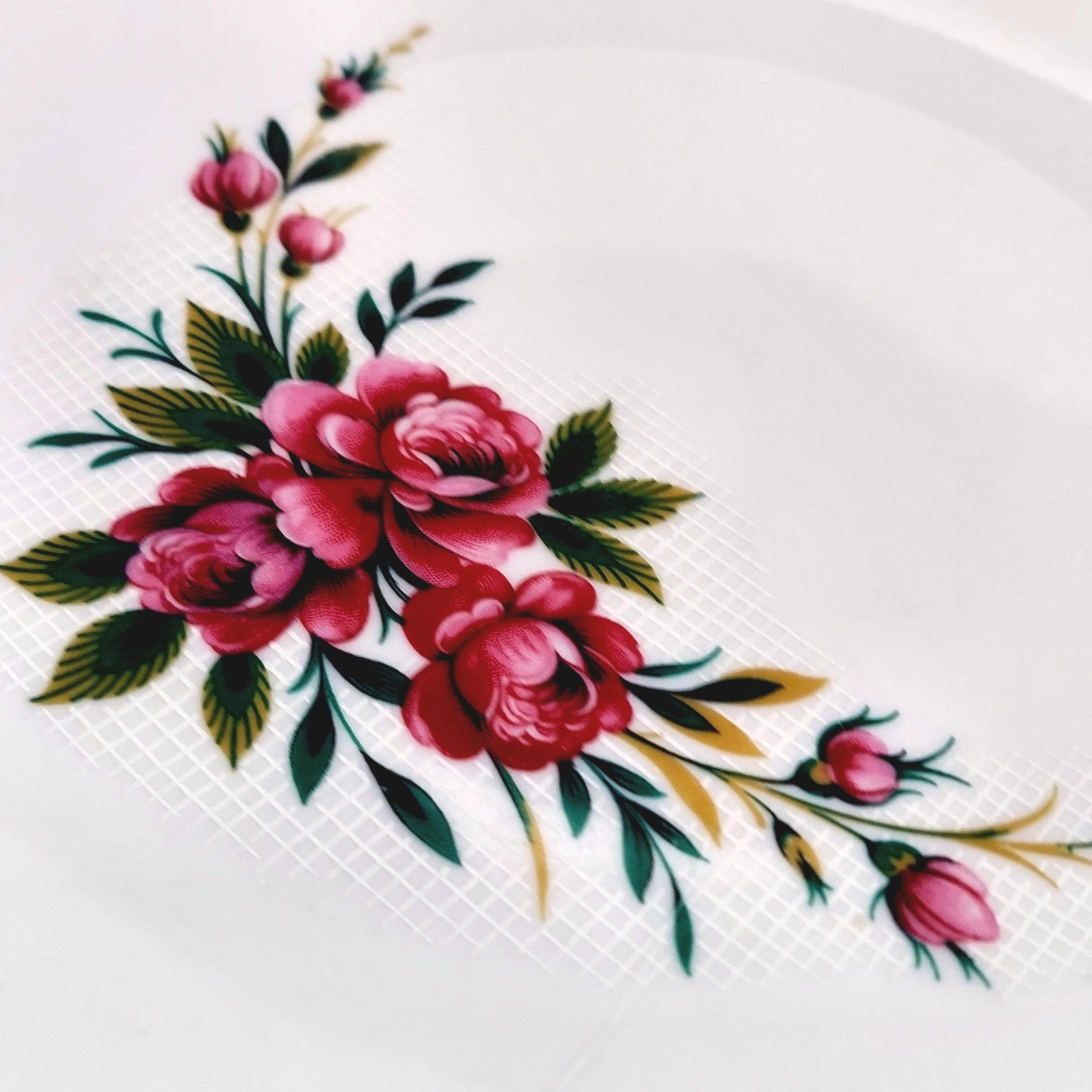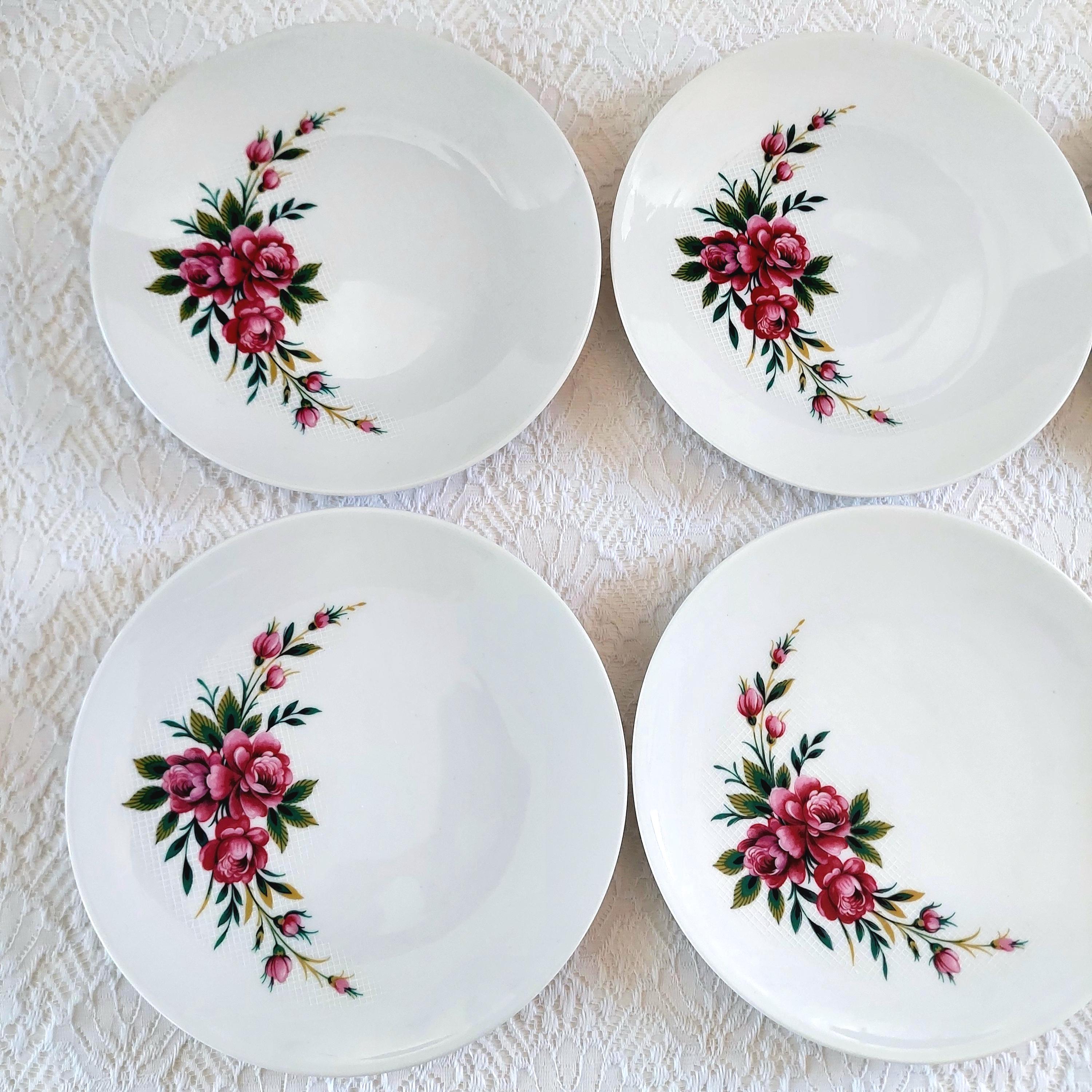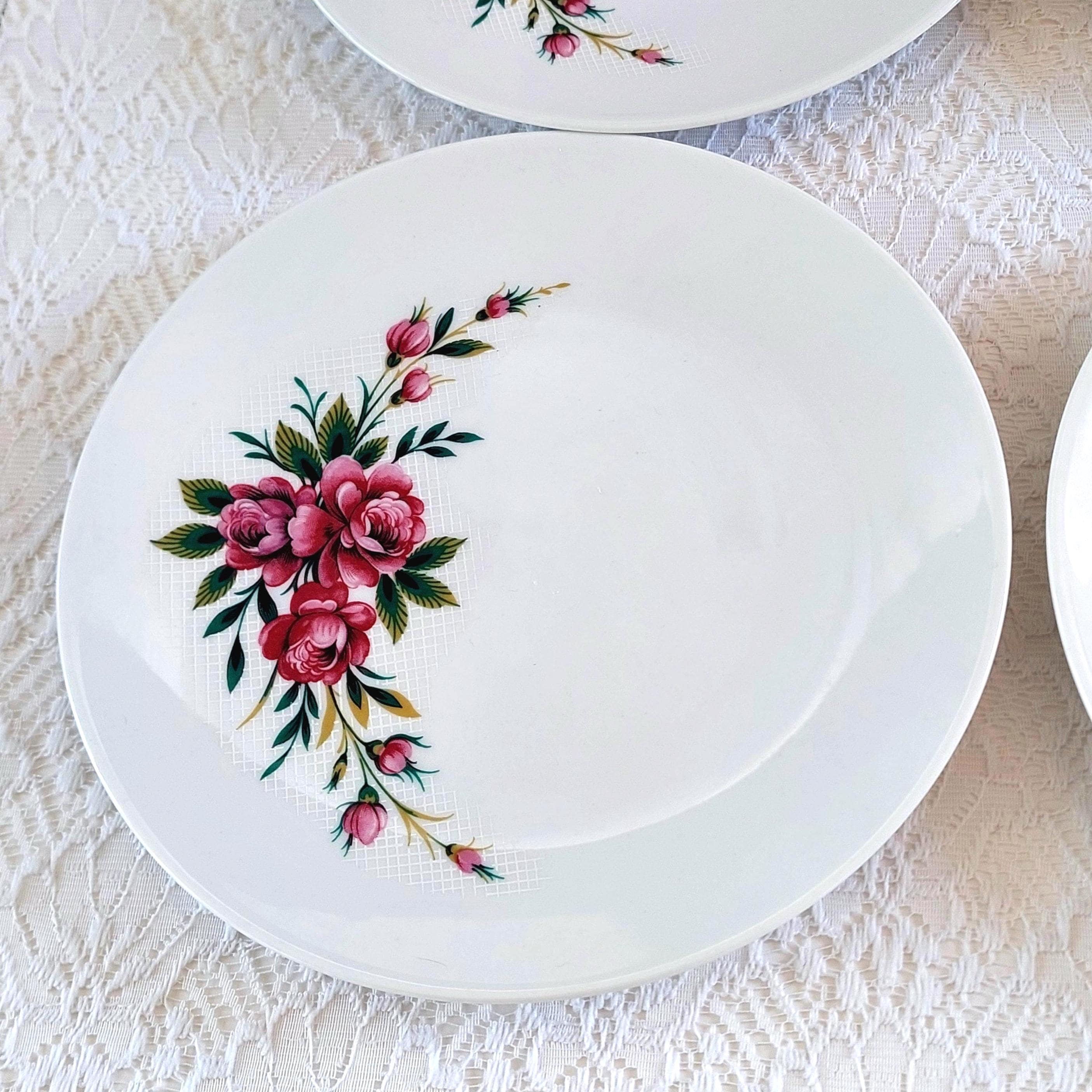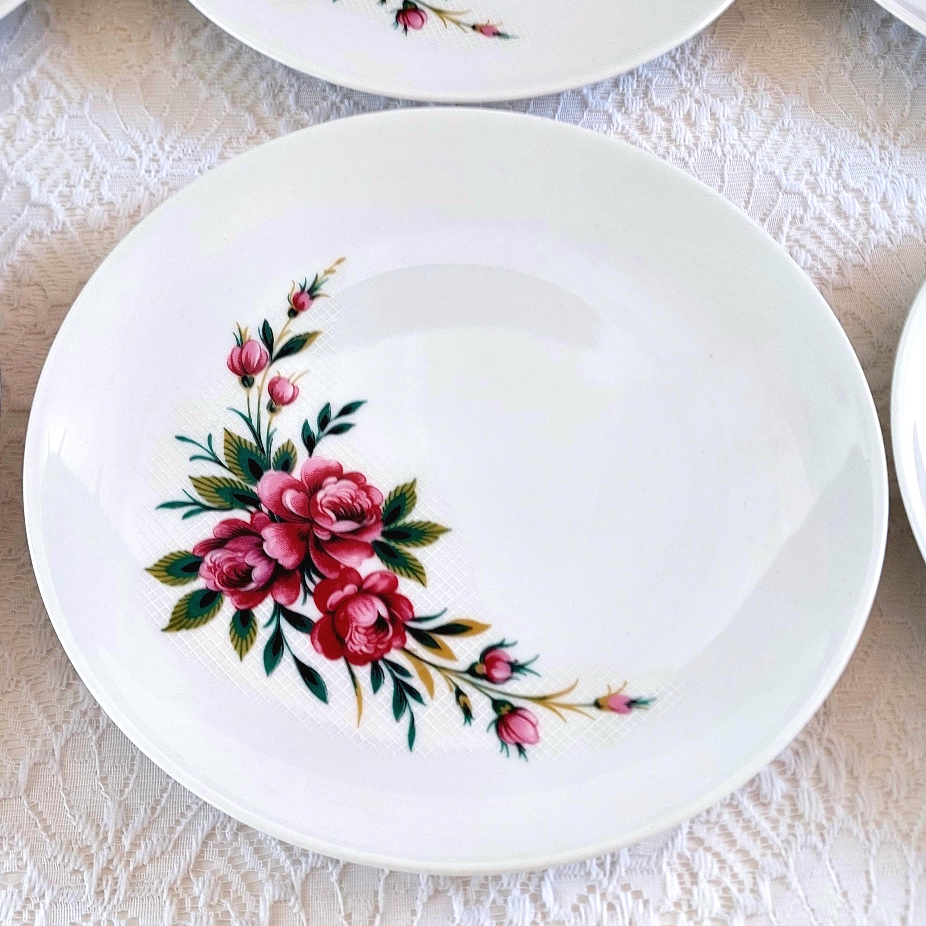 Vintage Schumann Germany snow-white porcelain dessert plates featuring clusters of pink roses on a white lattice or crosshatch background. Made in Germany, circa 1950-1960s