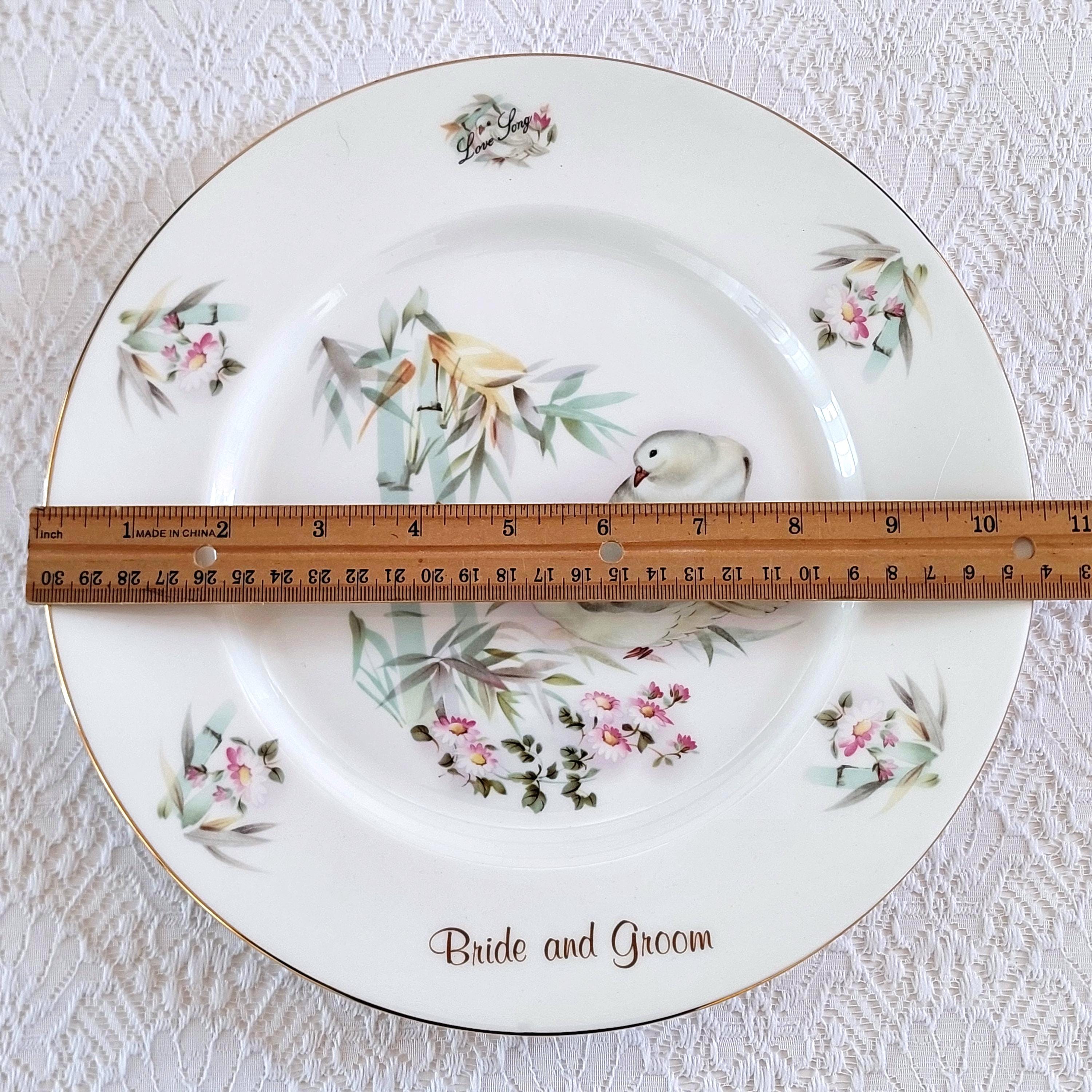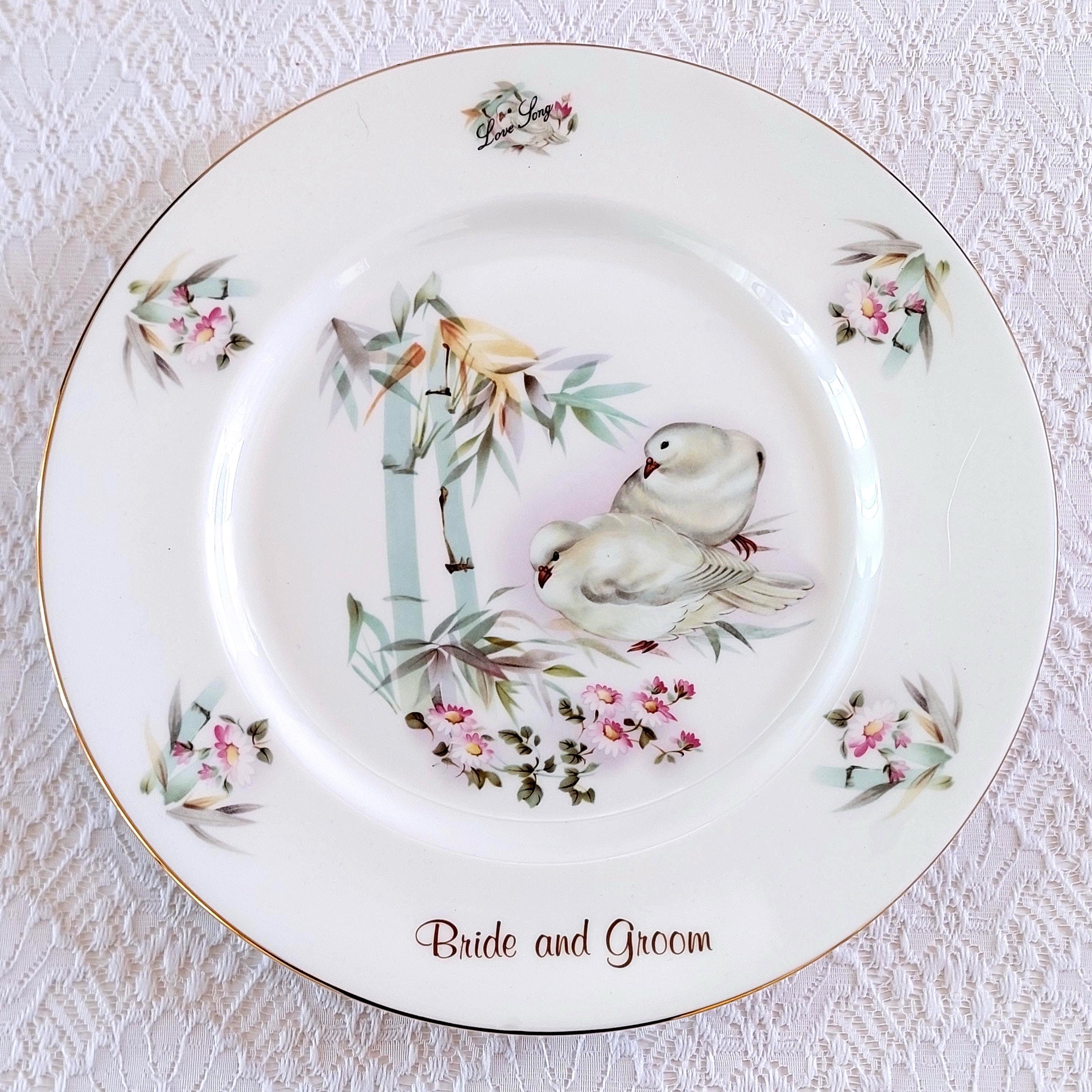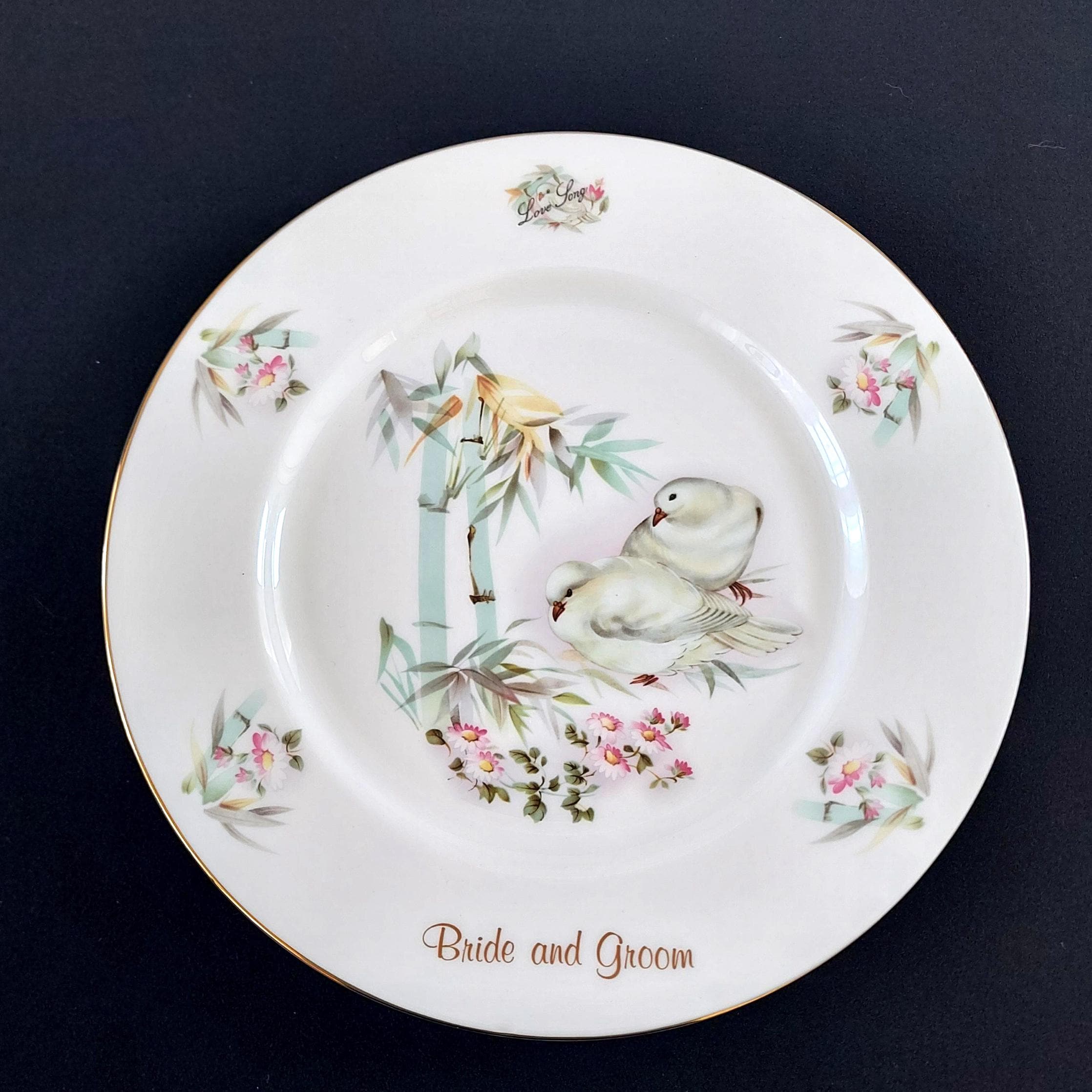 Celebrate a special union with this exquisite vintage Harleigh Bone China 10.25" display plate from England. Part of the romantic "Love Song" series, it features two elegant white birds (doves) nestled among delicate bamboo and pink blossoms.
