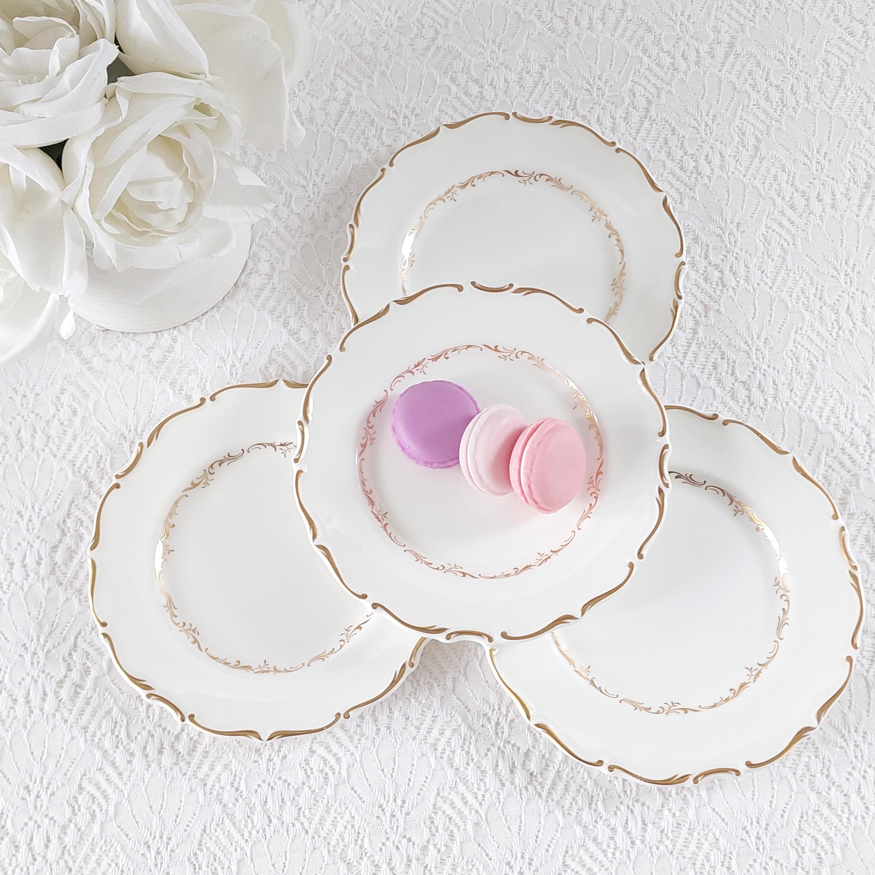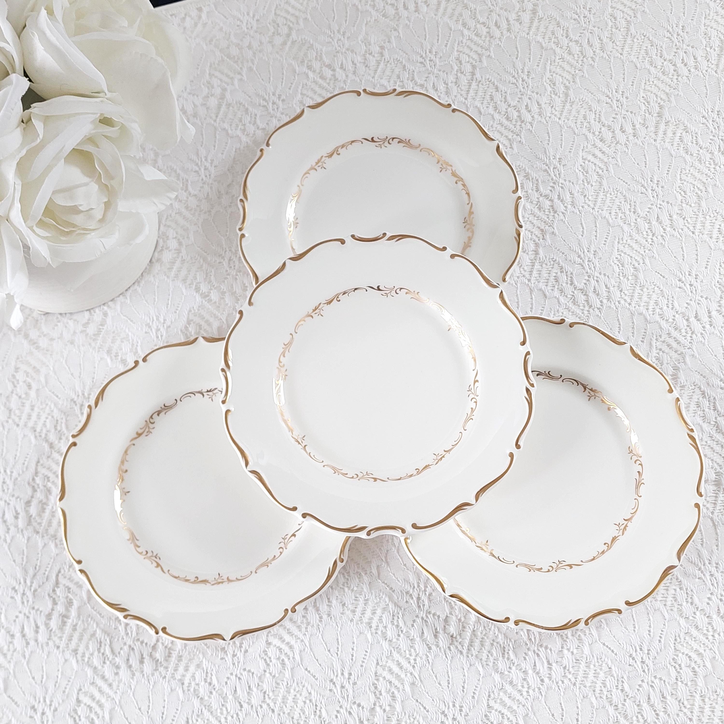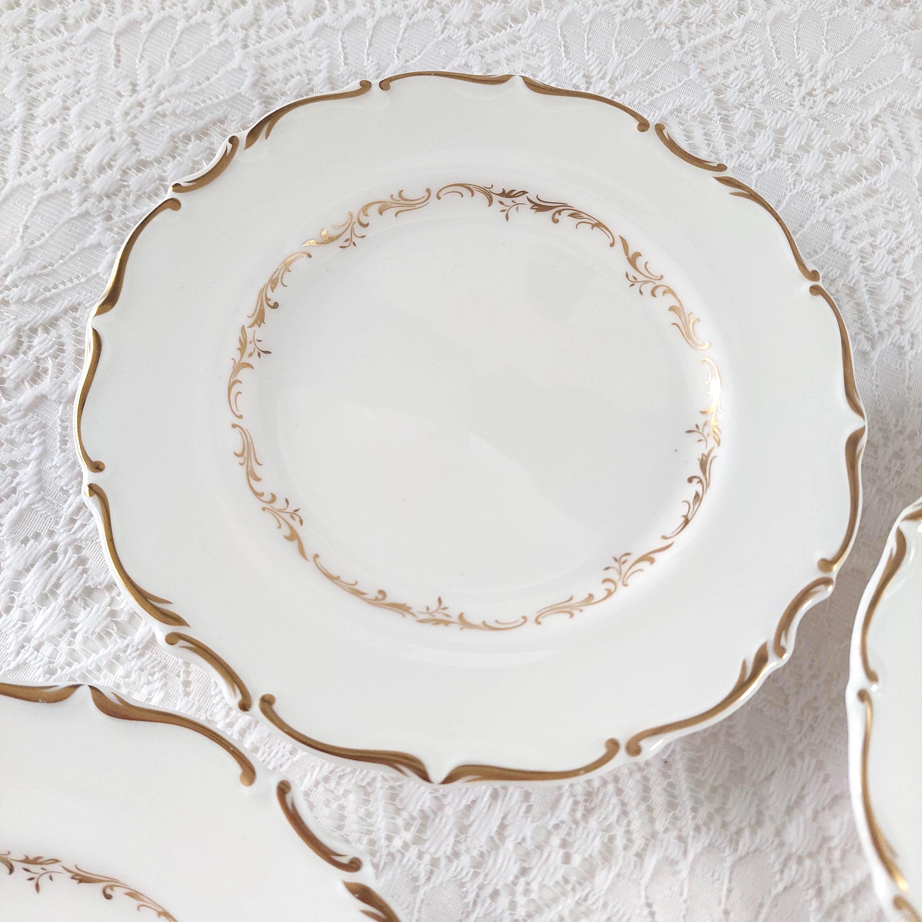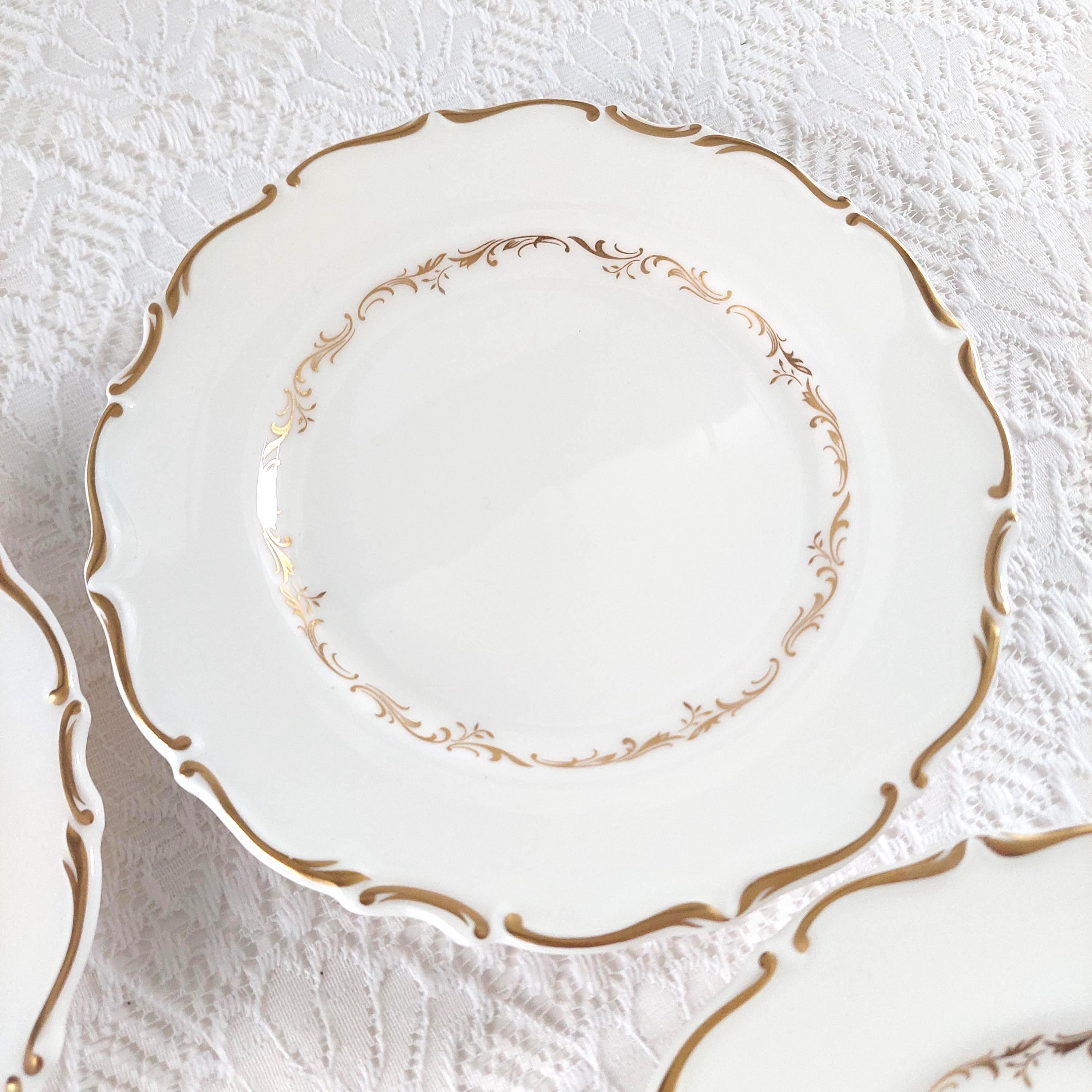 Vintage Royal Doulton "Richelieu" (H4957) side plate set. Crafted in England, this discontinued pattern is a hallmark of Mid-Century elegance, featuring timeless gold scrolls and a delicate scalloped edge on fine white bone china.