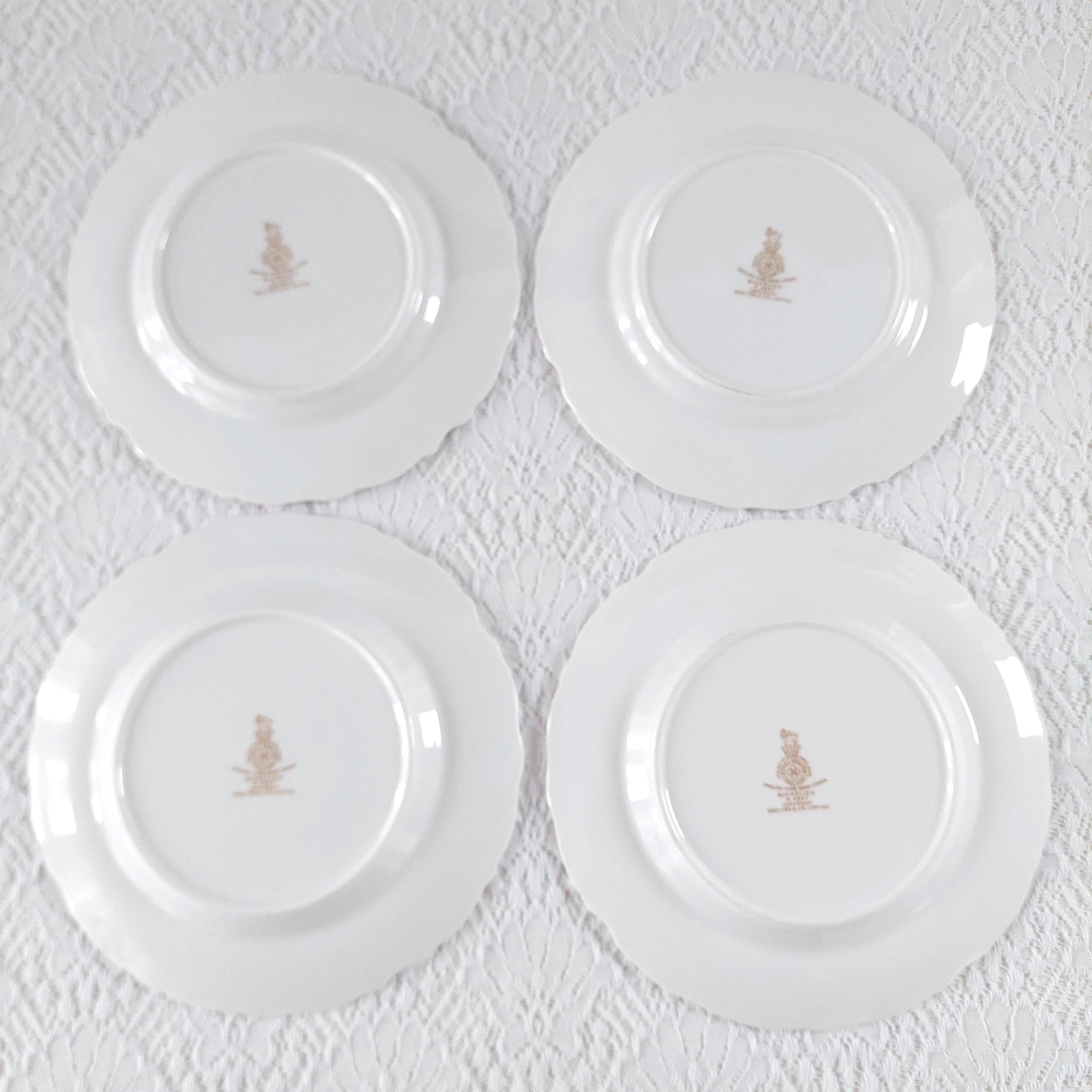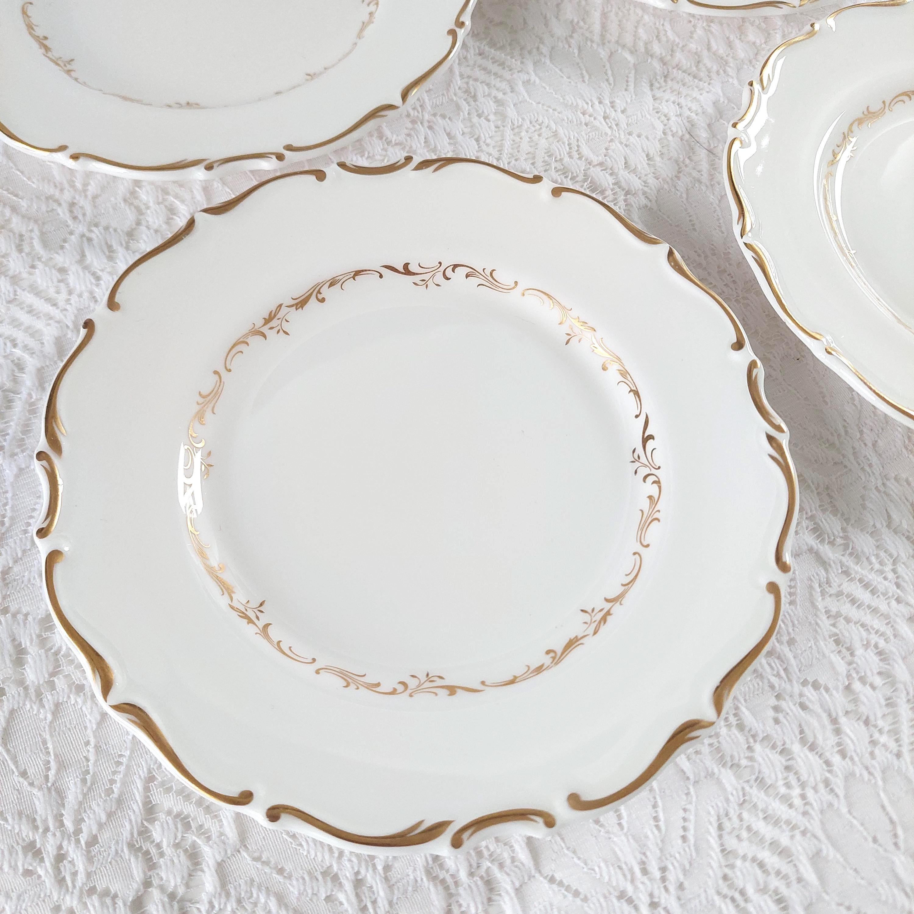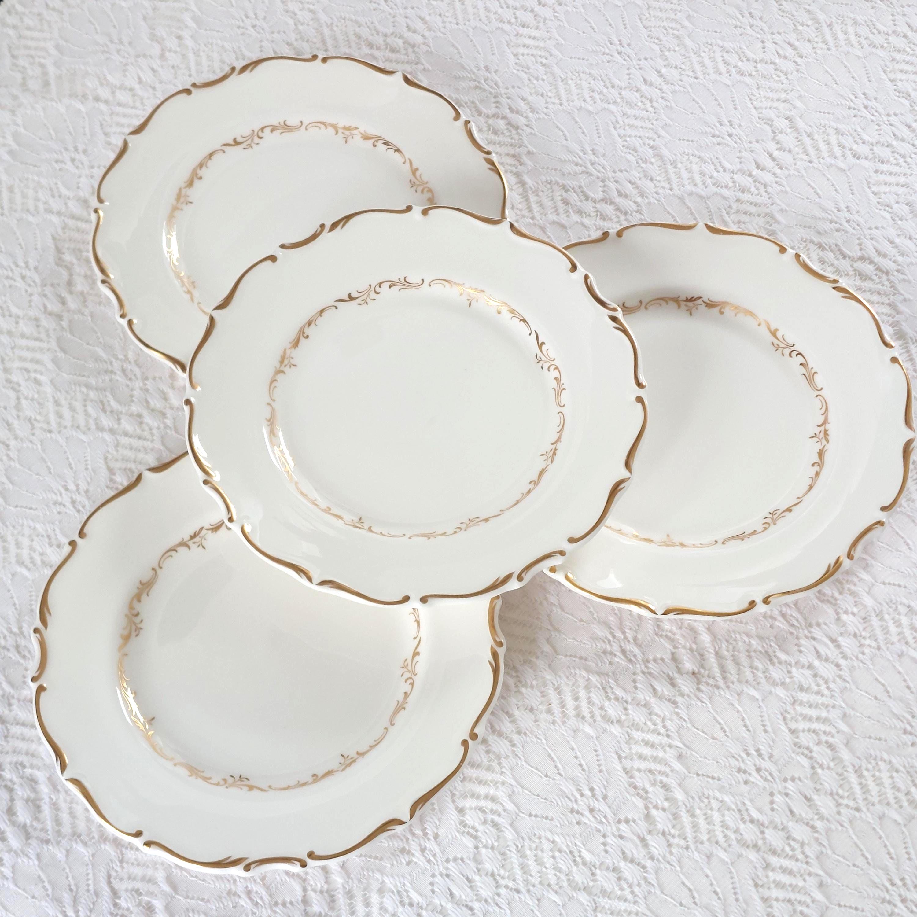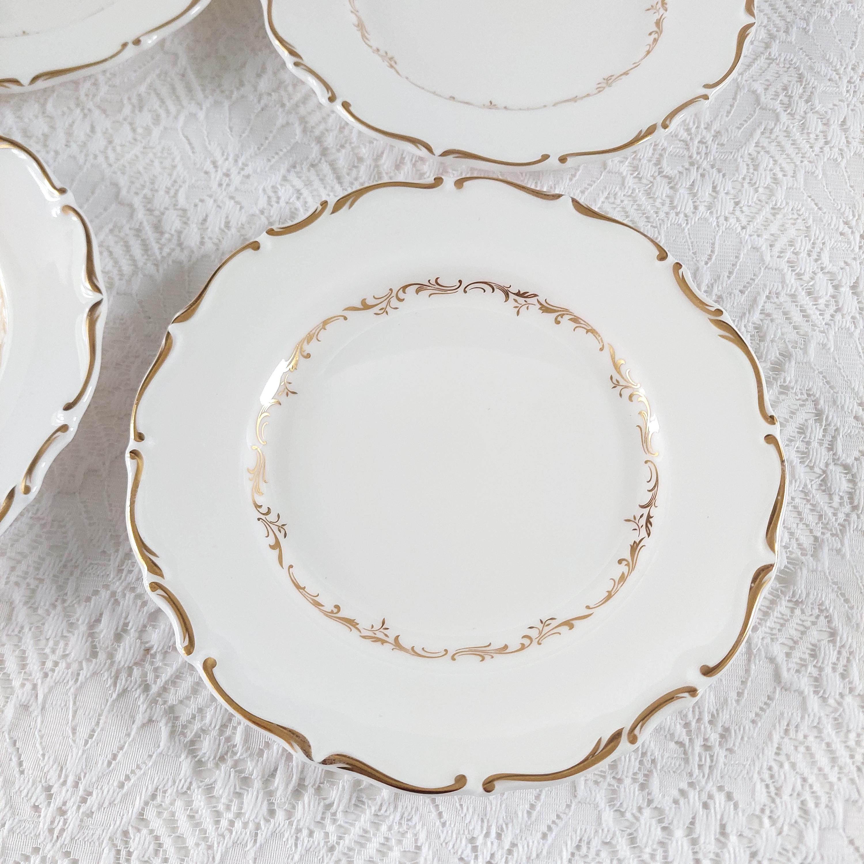 Vintage Royal Doulton "Richelieu" (H4957) side plate set. Crafted in England, this discontinued pattern is a hallmark of Mid-Century elegance, featuring timeless gold scrolls and a delicate scalloped edge on fine white bone china.