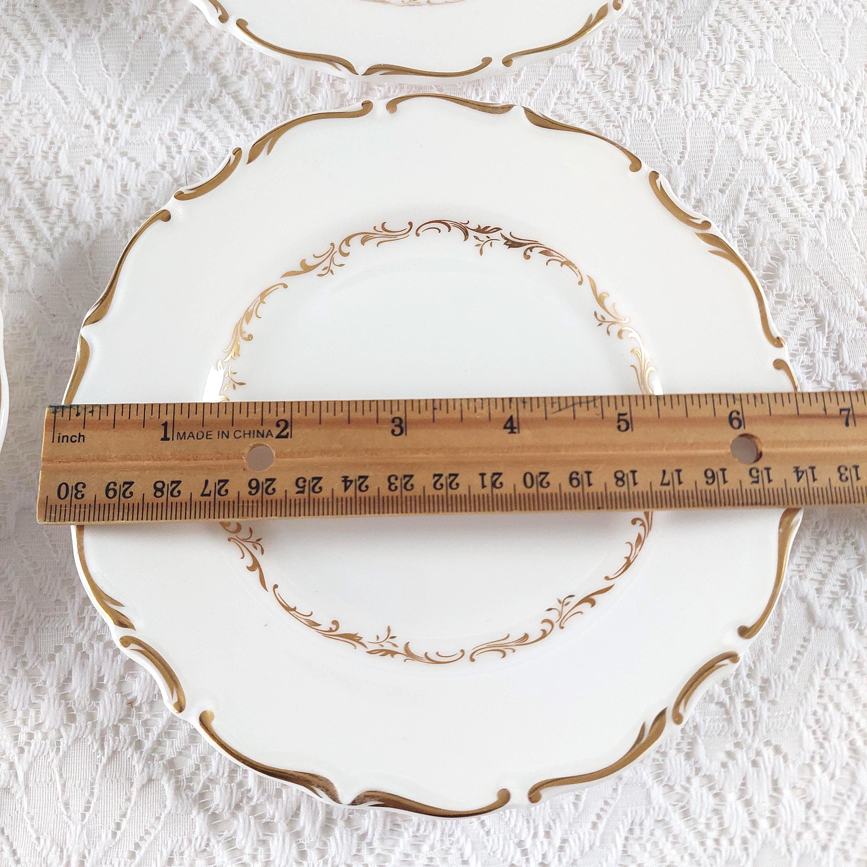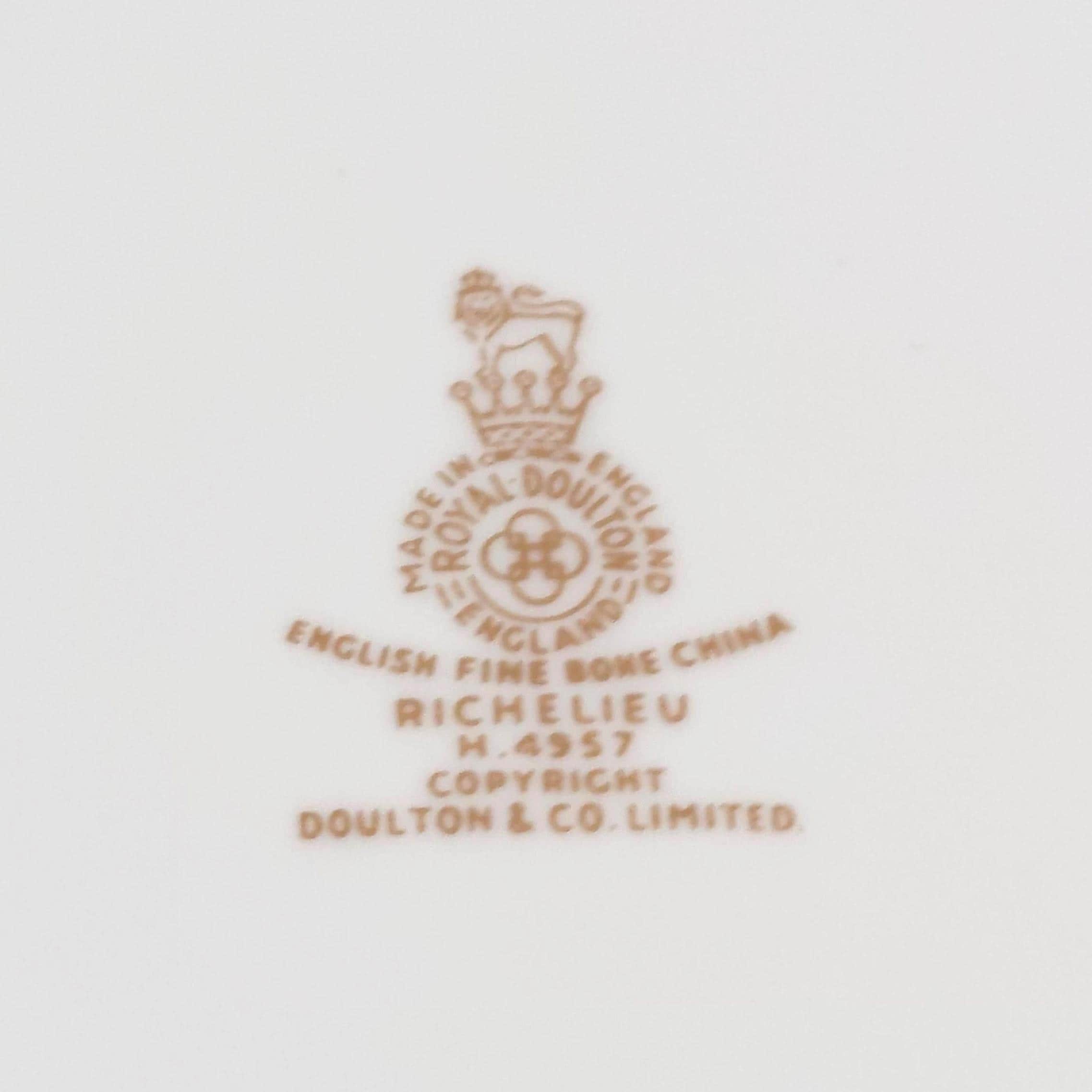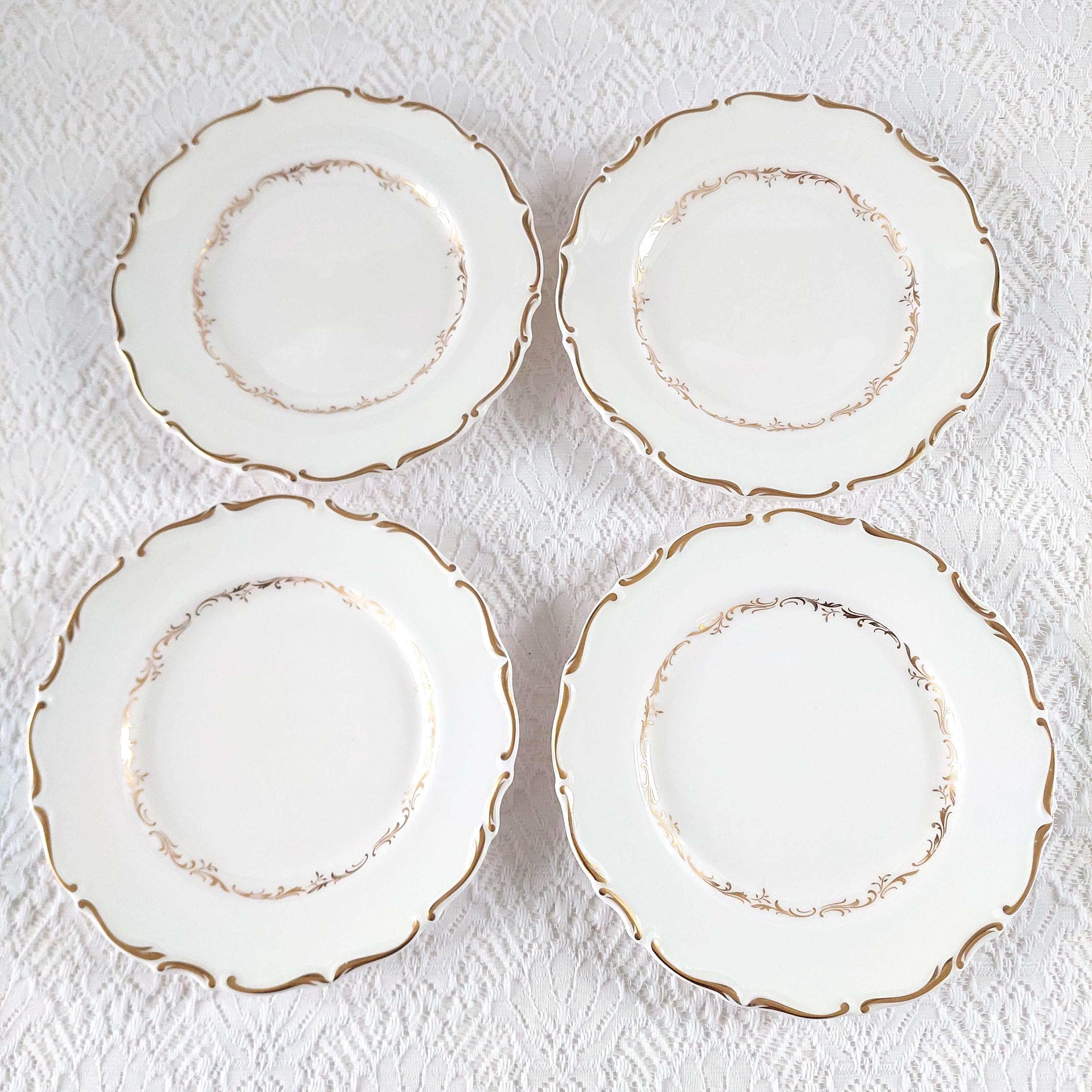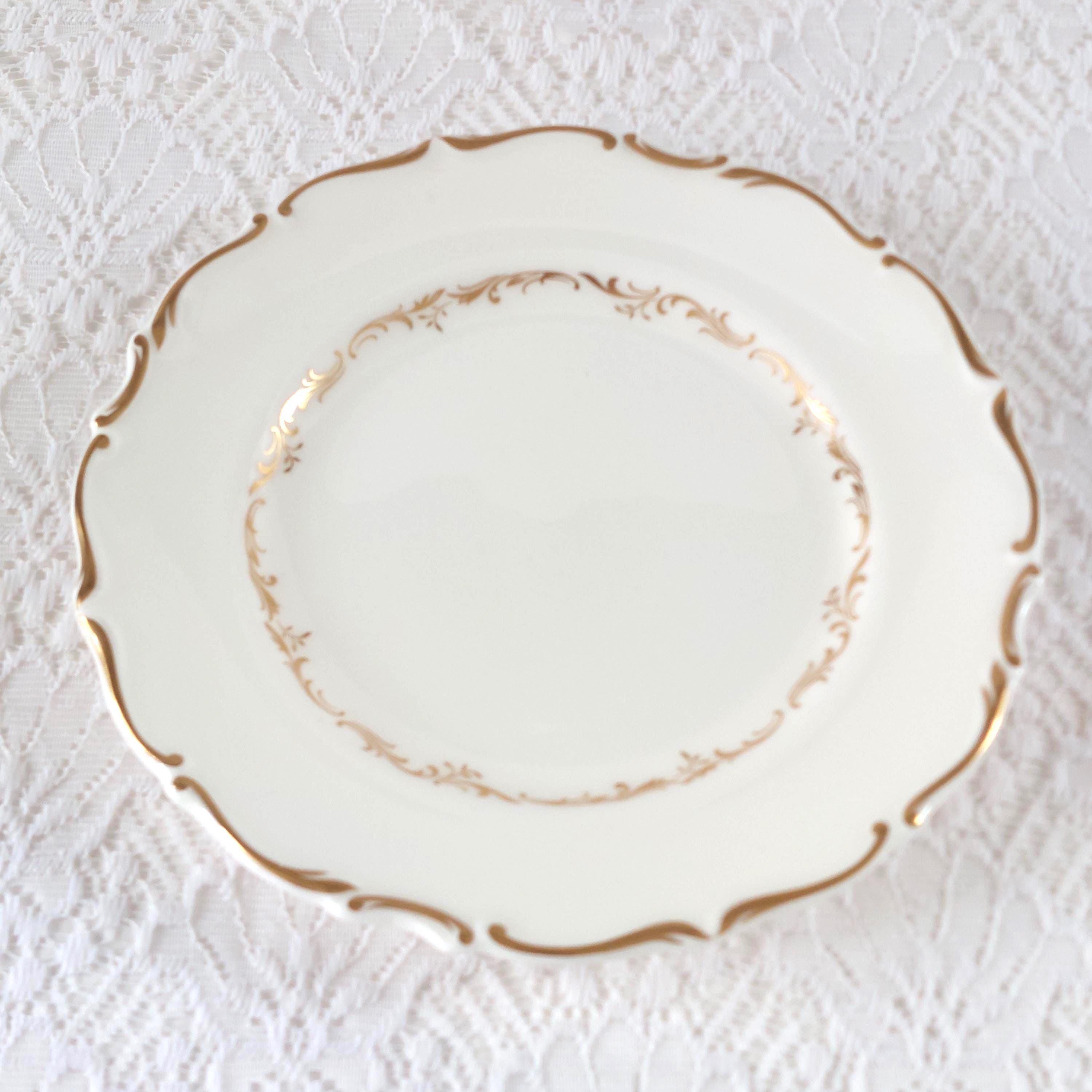 Vintage Royal Doulton "Richelieu" (H4957) side plate set. Crafted in England, this discontinued pattern is a hallmark of Mid-Century elegance, featuring timeless gold scrolls and a delicate scalloped edge on fine white bone china.