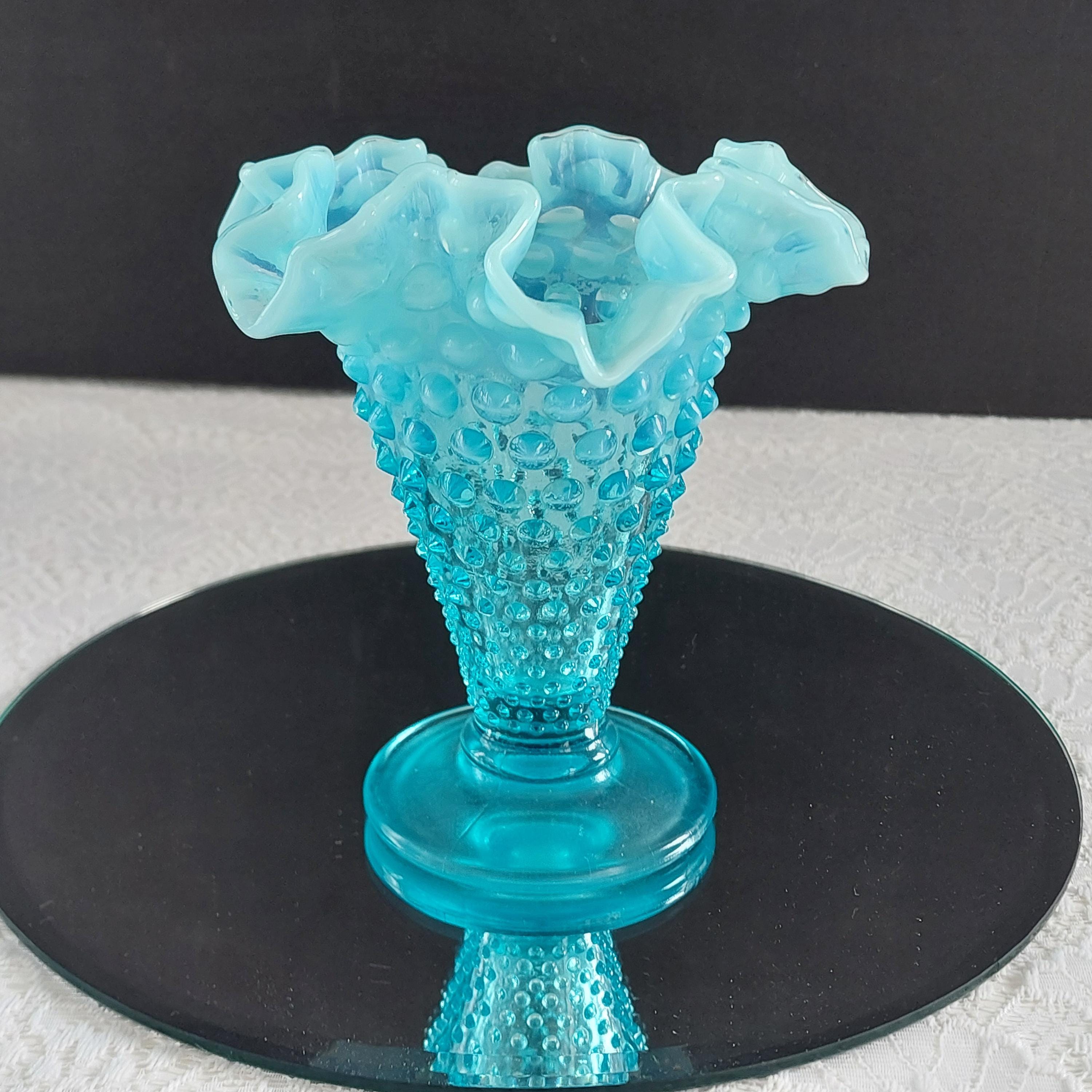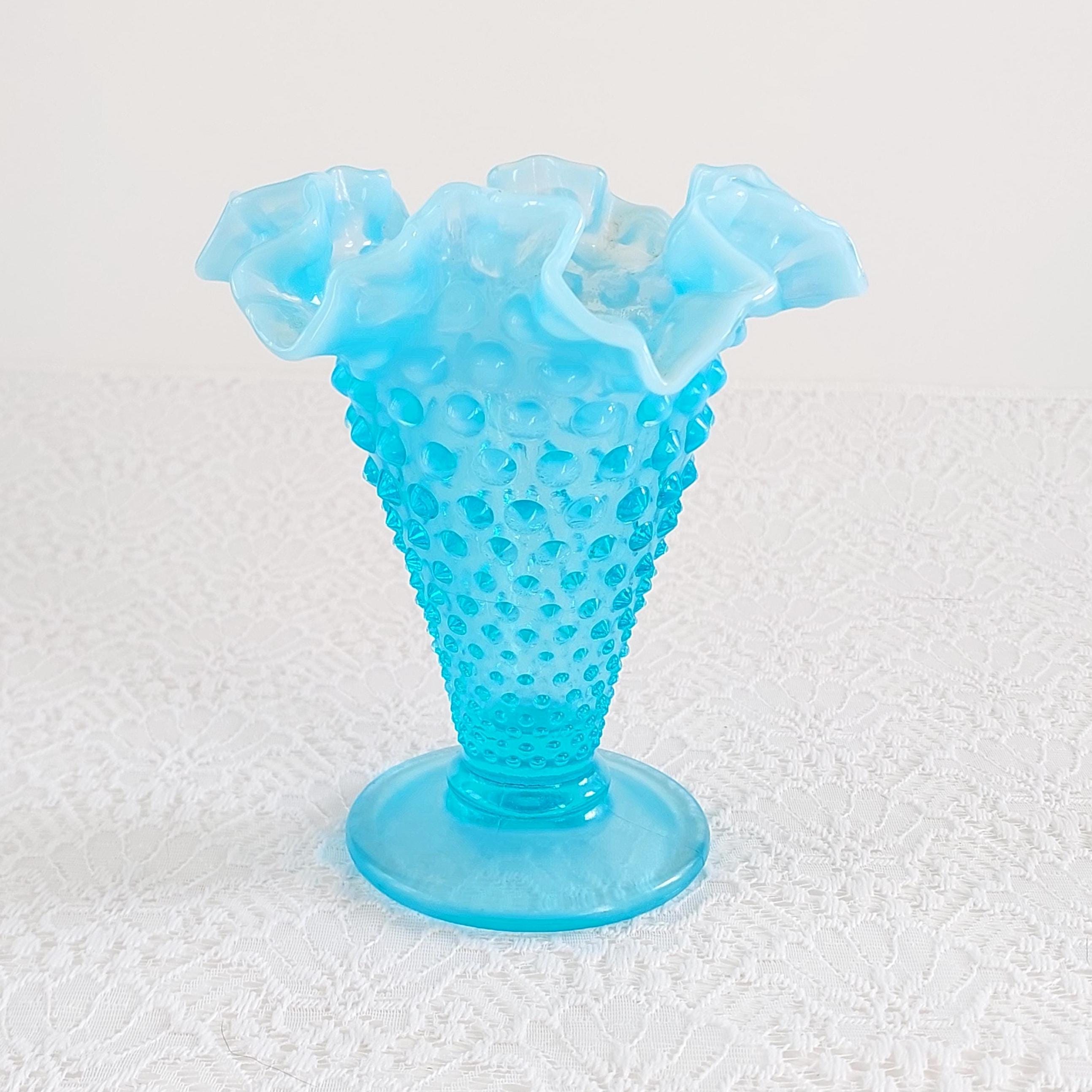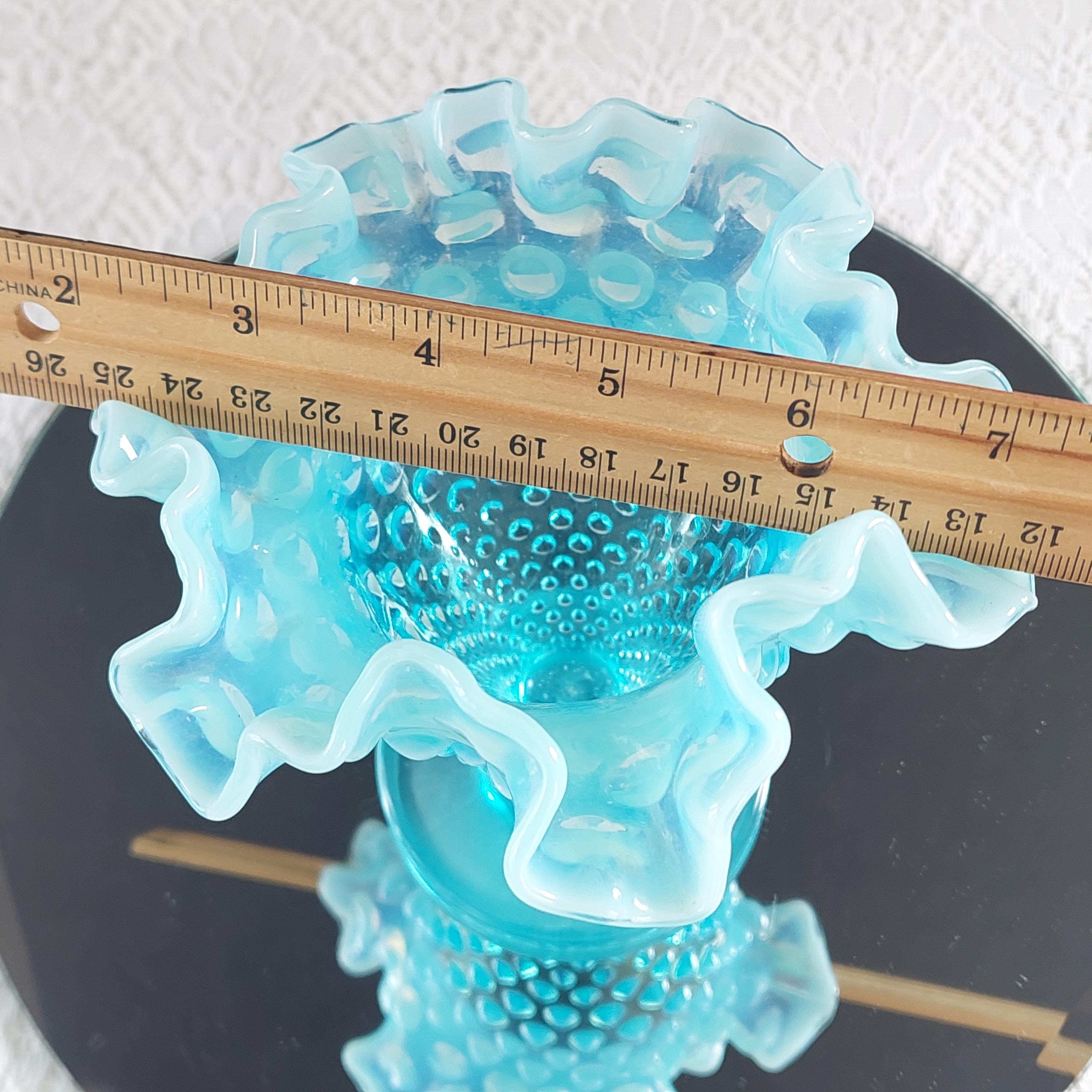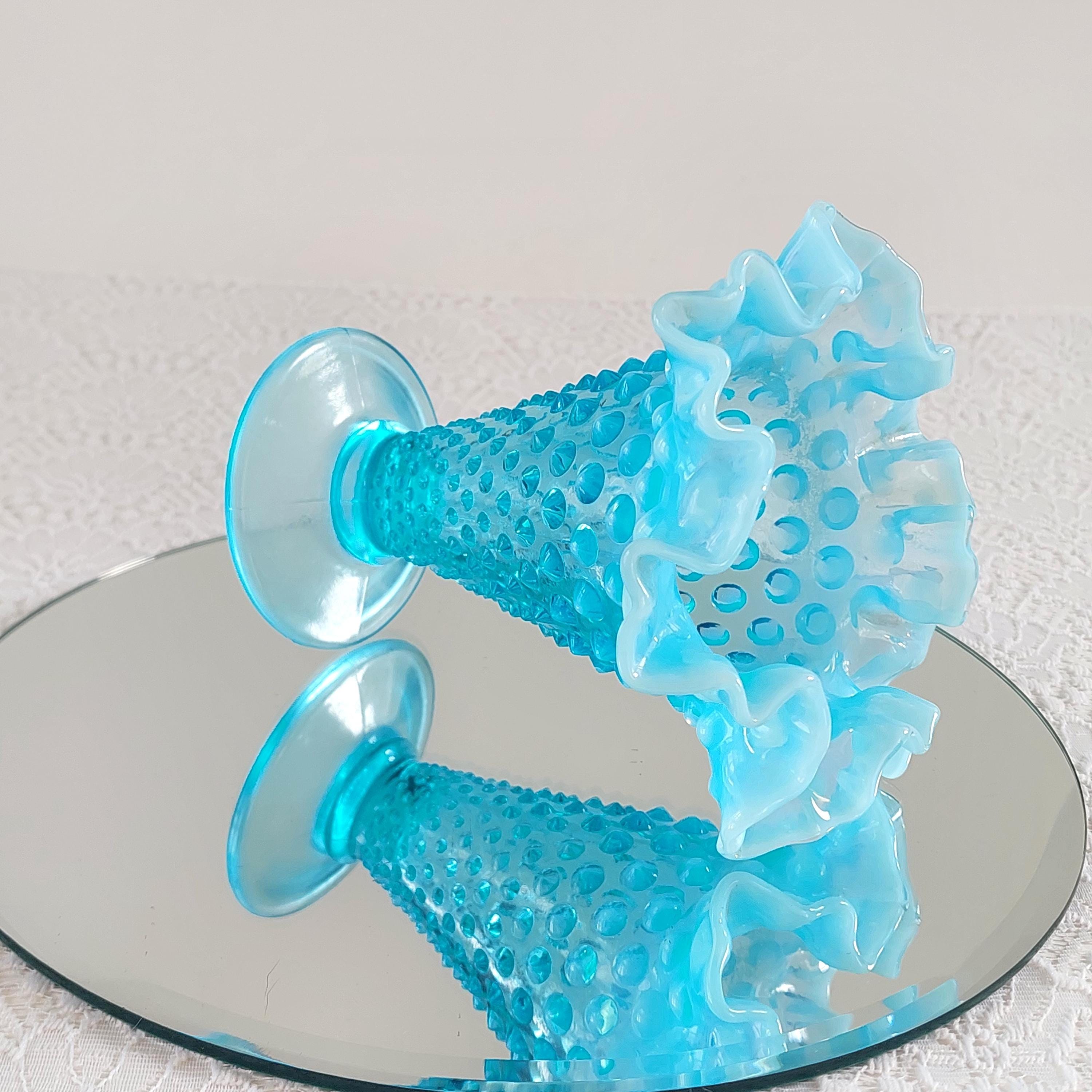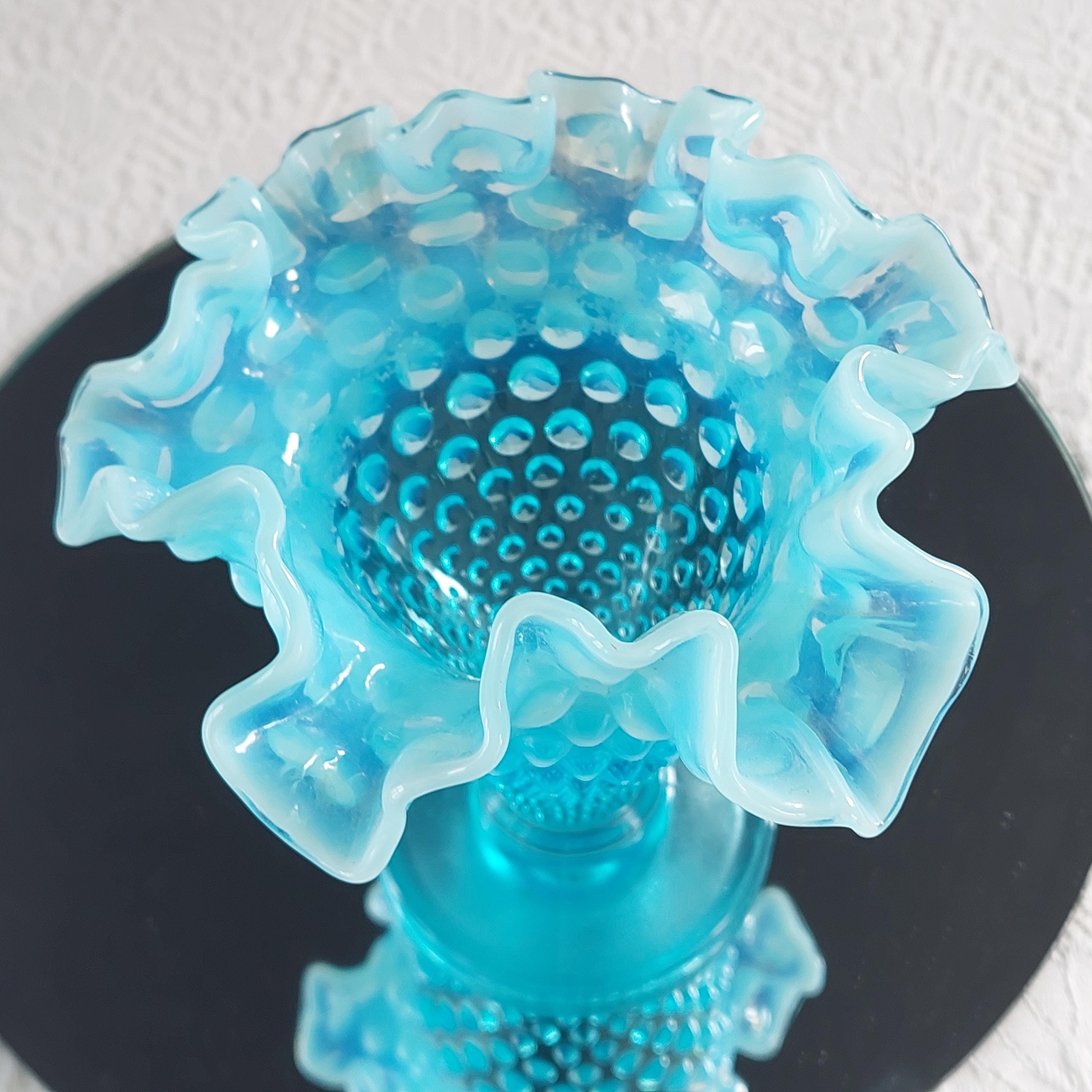 This stunning 5.5-inch art glass vase features Fenton’s iconic hobnail pattern in a vibrant aqua blue. The striking opalescent ruffled (crimped) rim transitions beautifully from milky white to translucent blue.