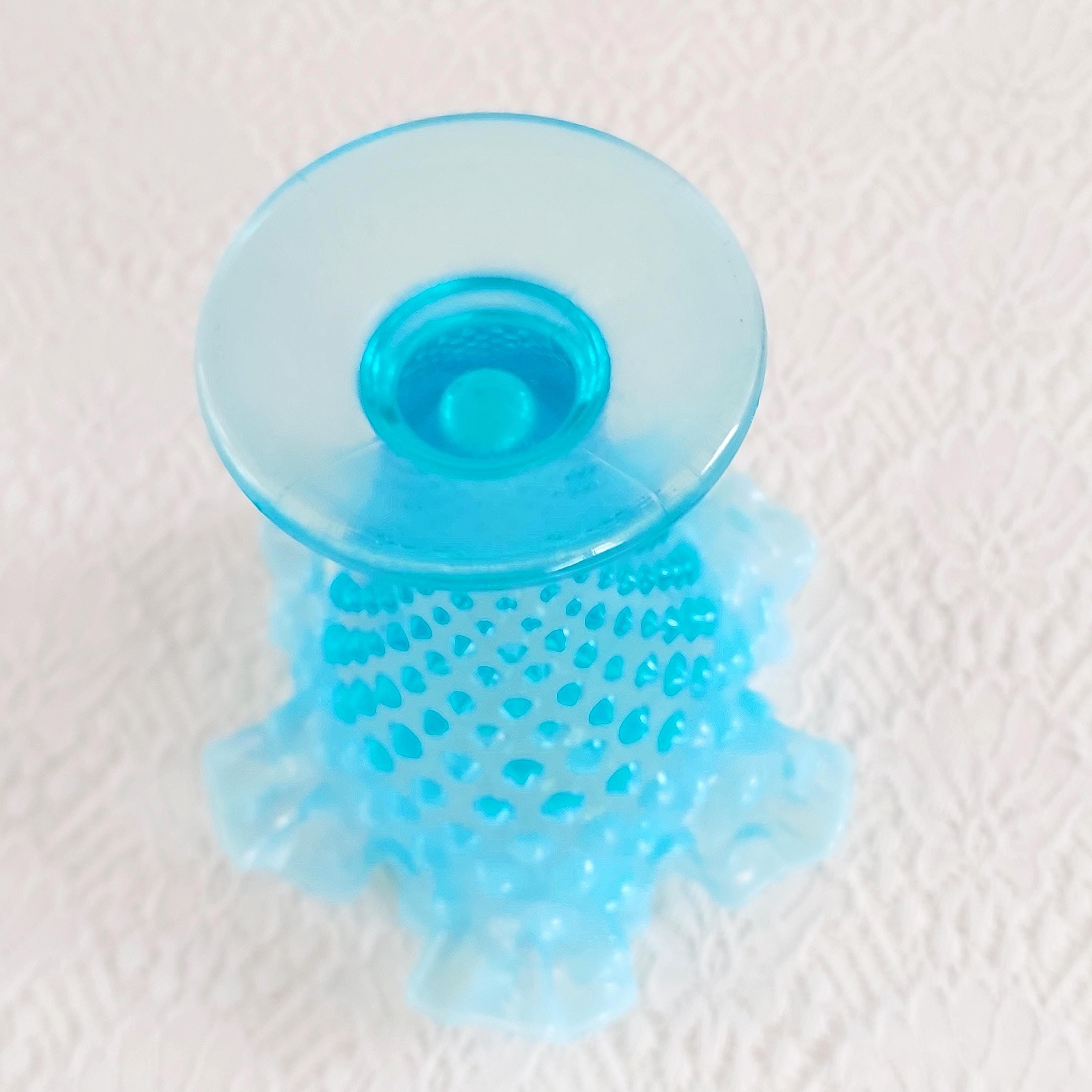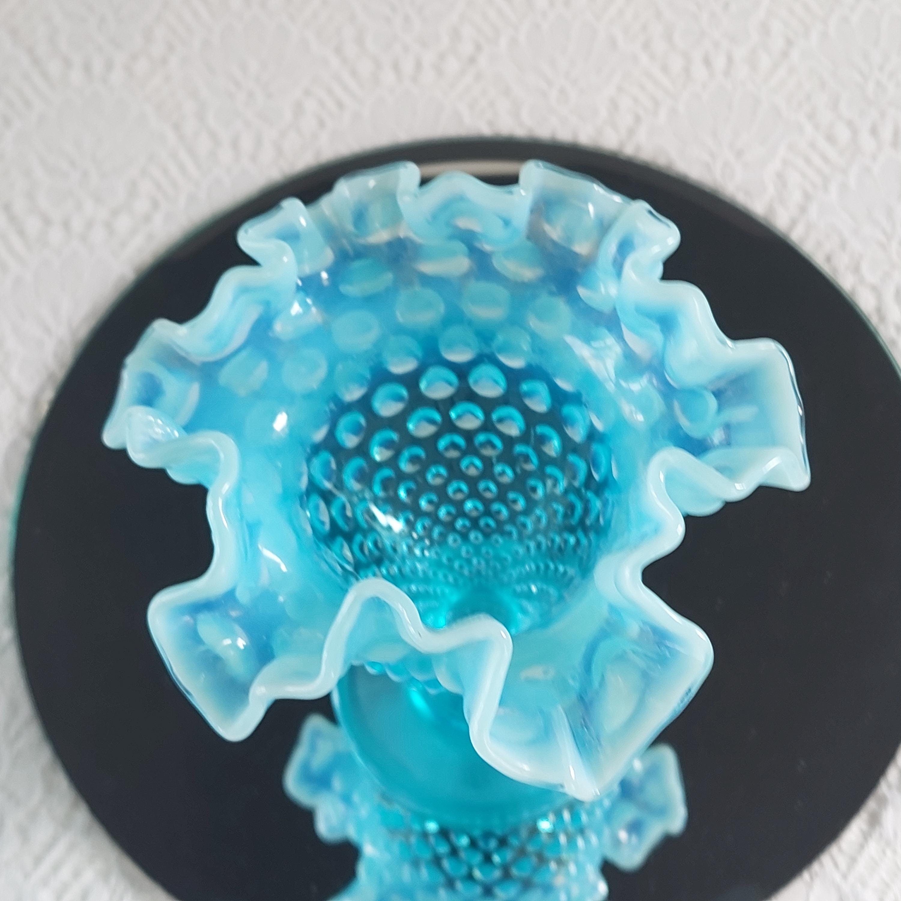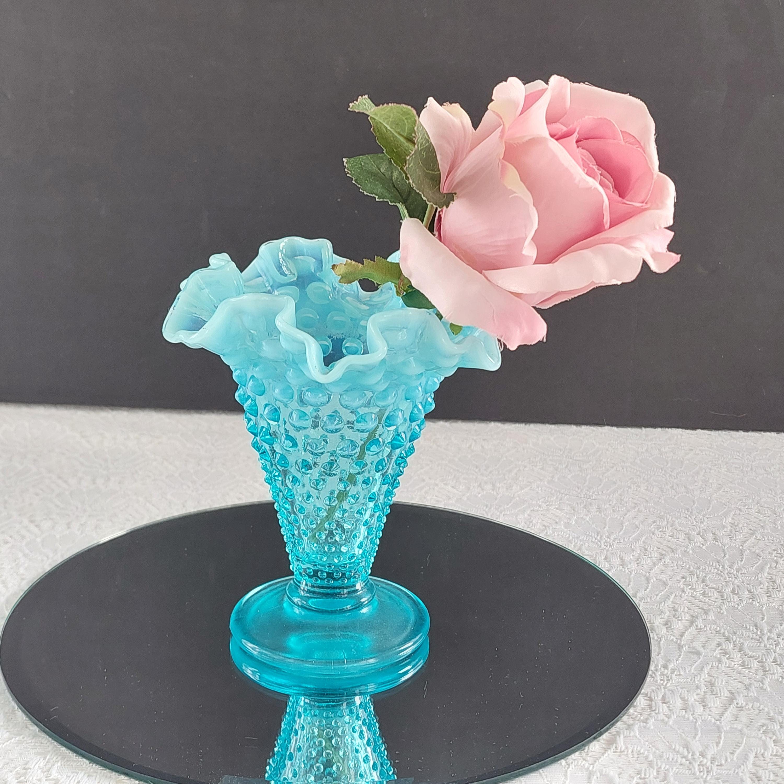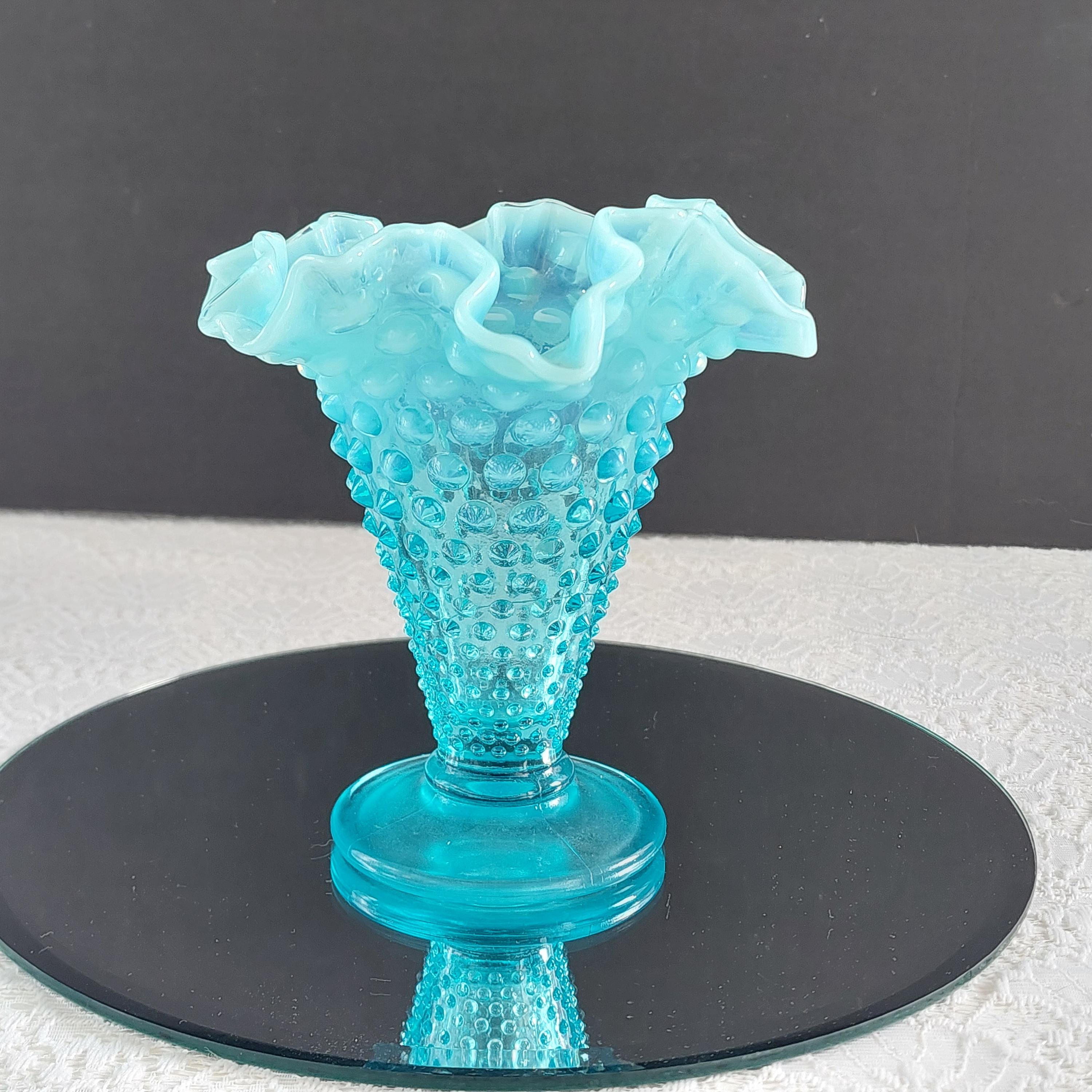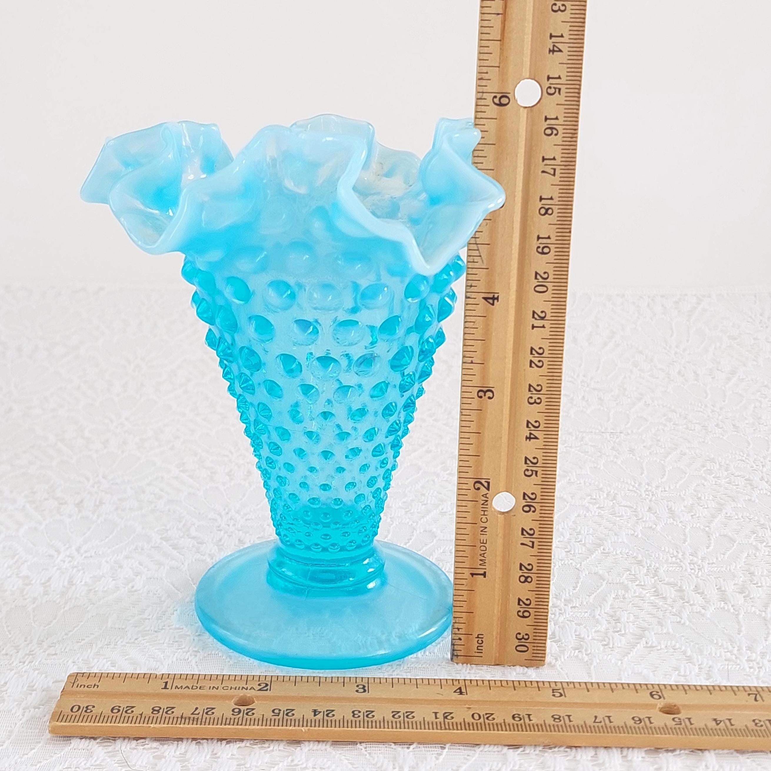 This stunning 5.5-inch art glass vase features Fenton’s iconic hobnail pattern in a vibrant aqua blue. The striking opalescent ruffled (crimped) rim transitions beautifully from milky white to translucent blue.