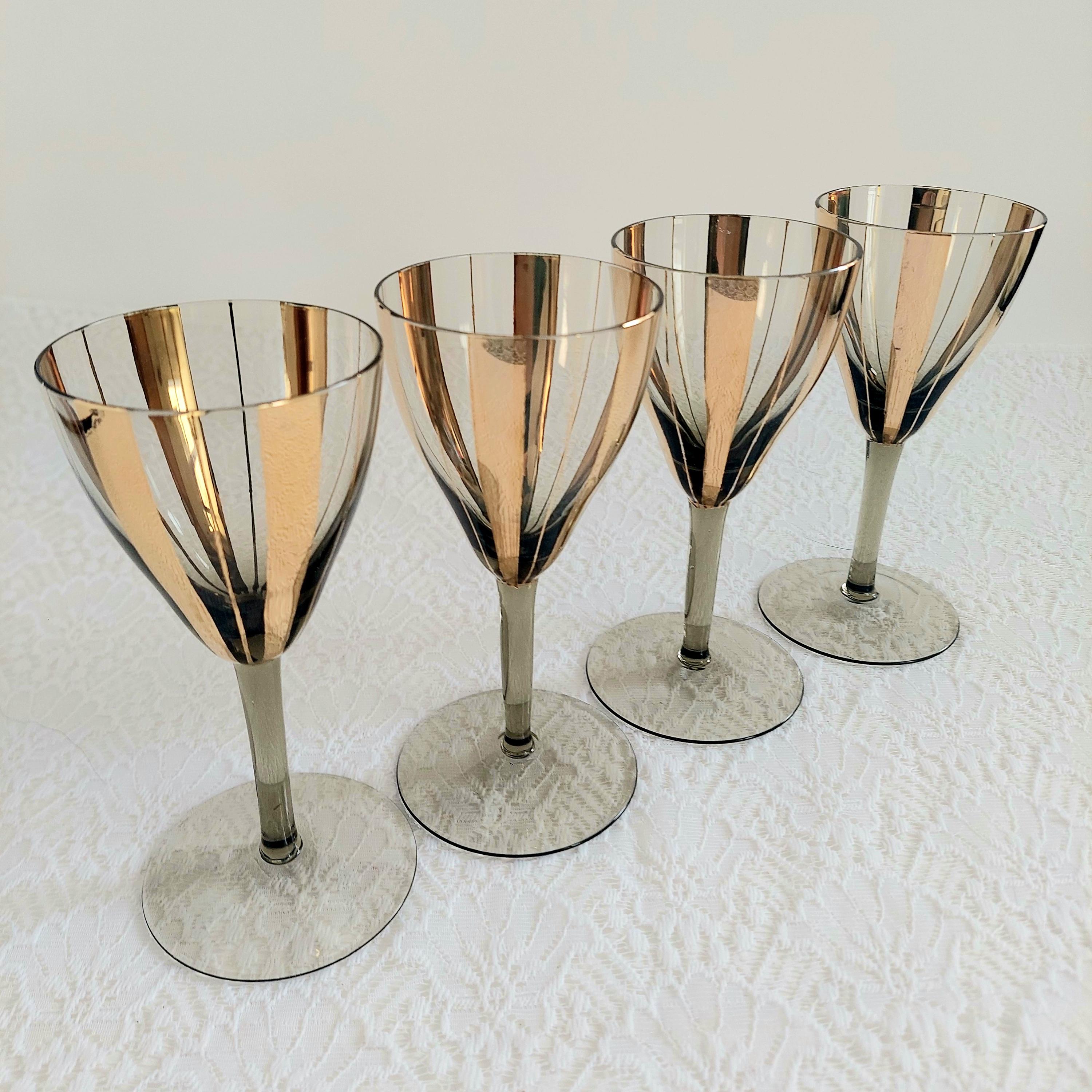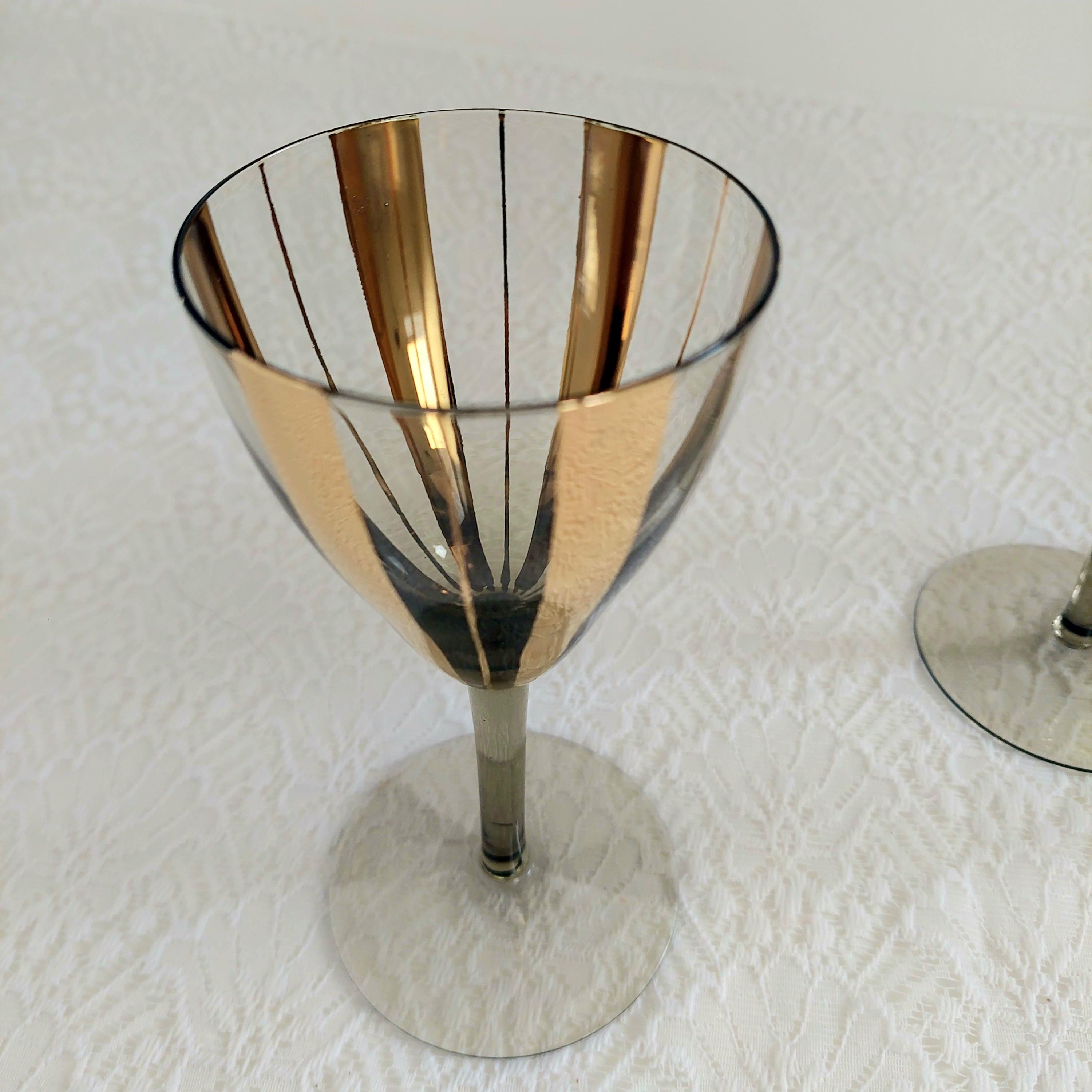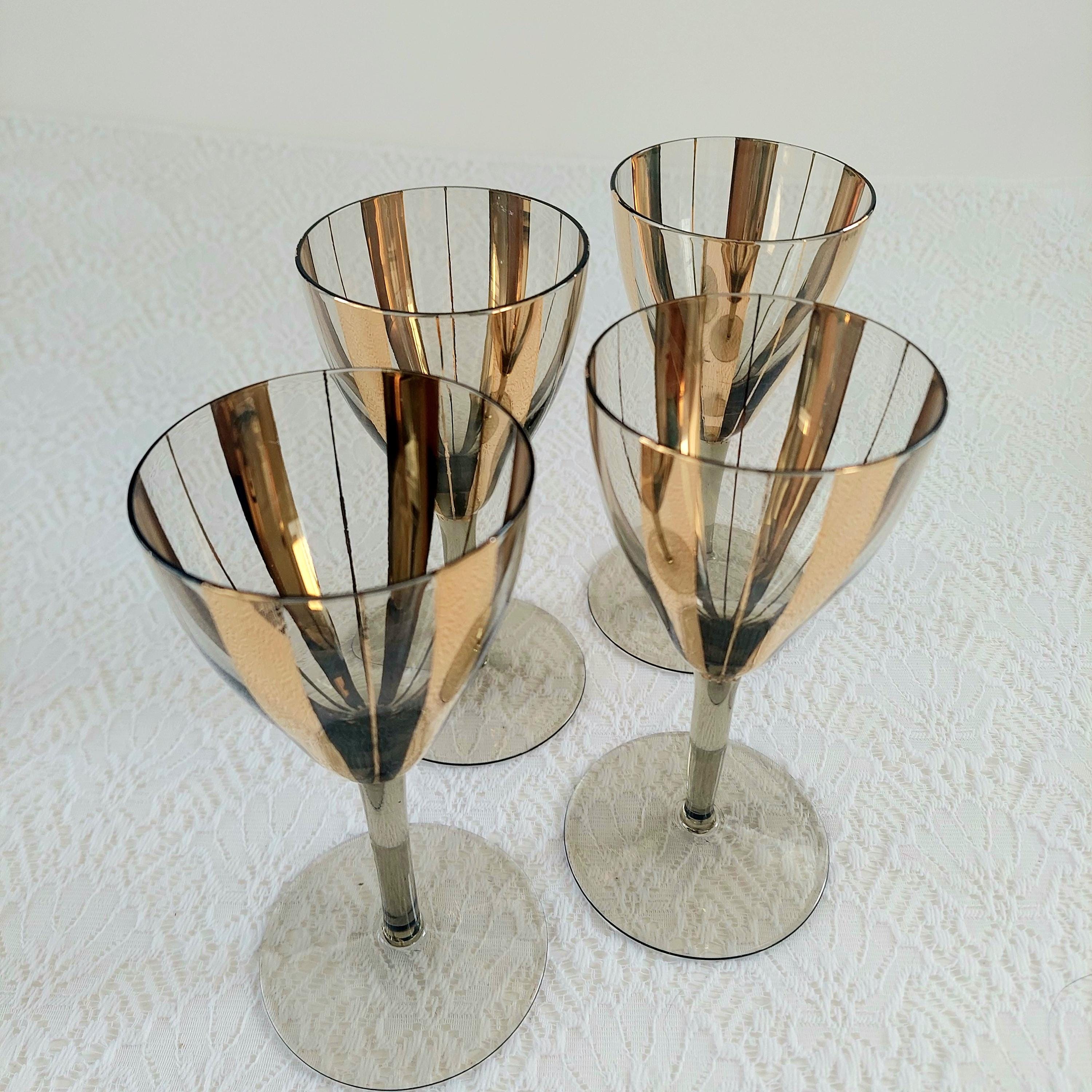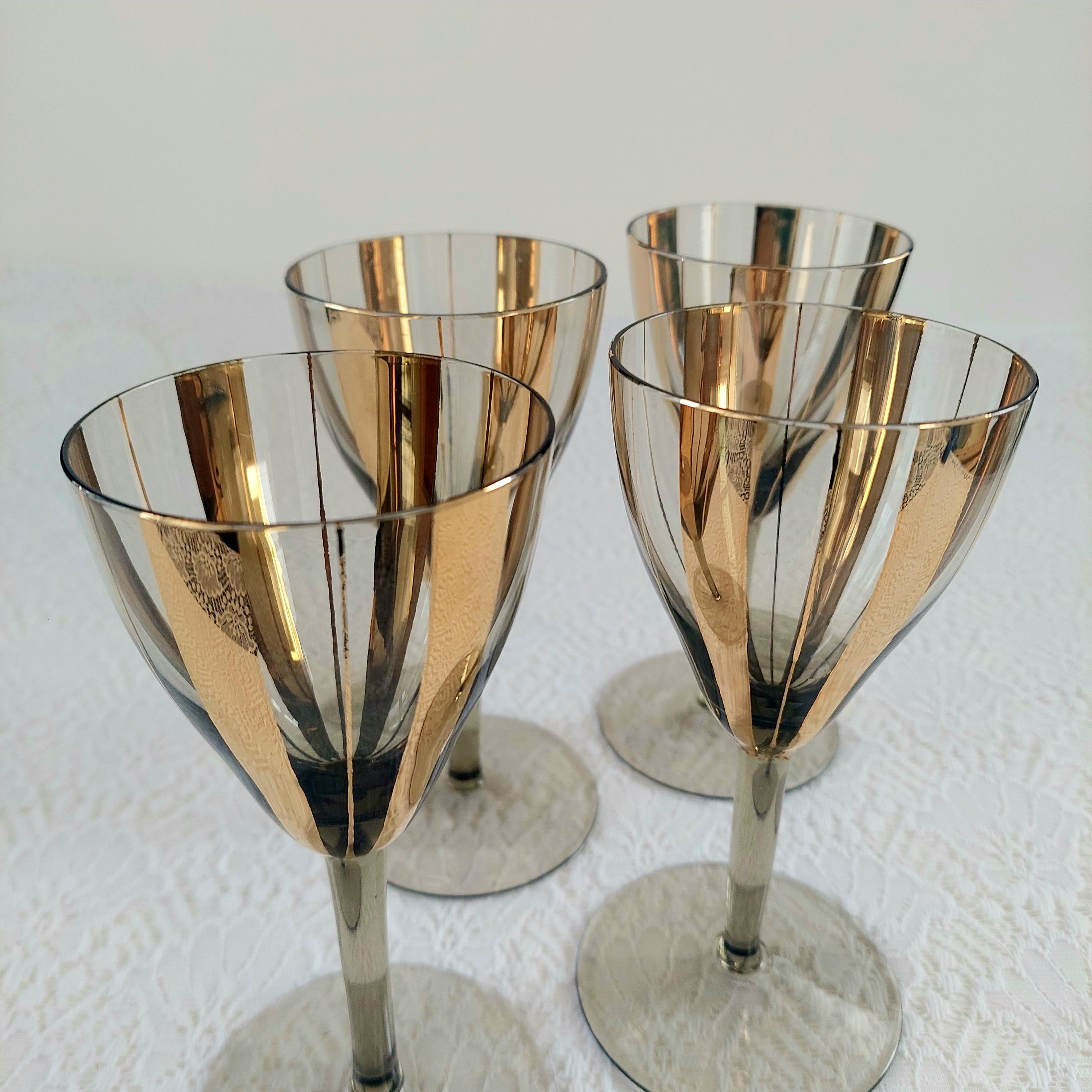 Elevate your bar cart with this stunning set of 4 vintage Mid-Century Modern wine glasses. Featuring a sophisticated smoky grey tint and bold, vertical gold fluted stripes, these glasses embody the Hollywood Regency aesthetic.