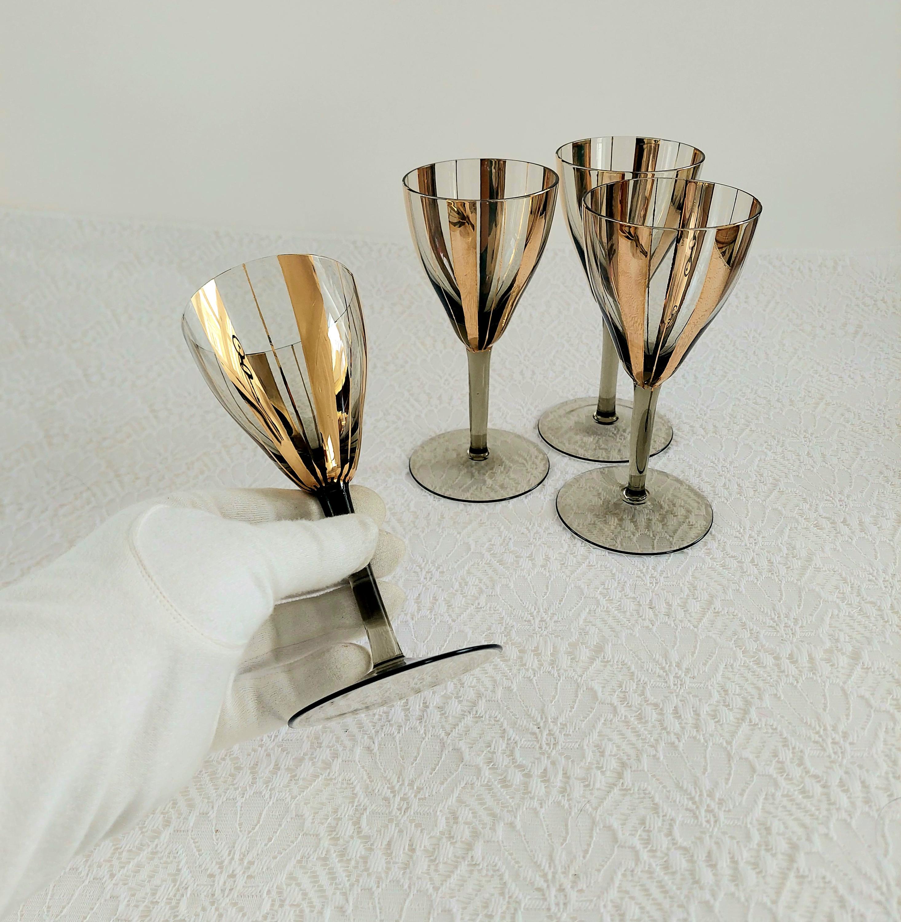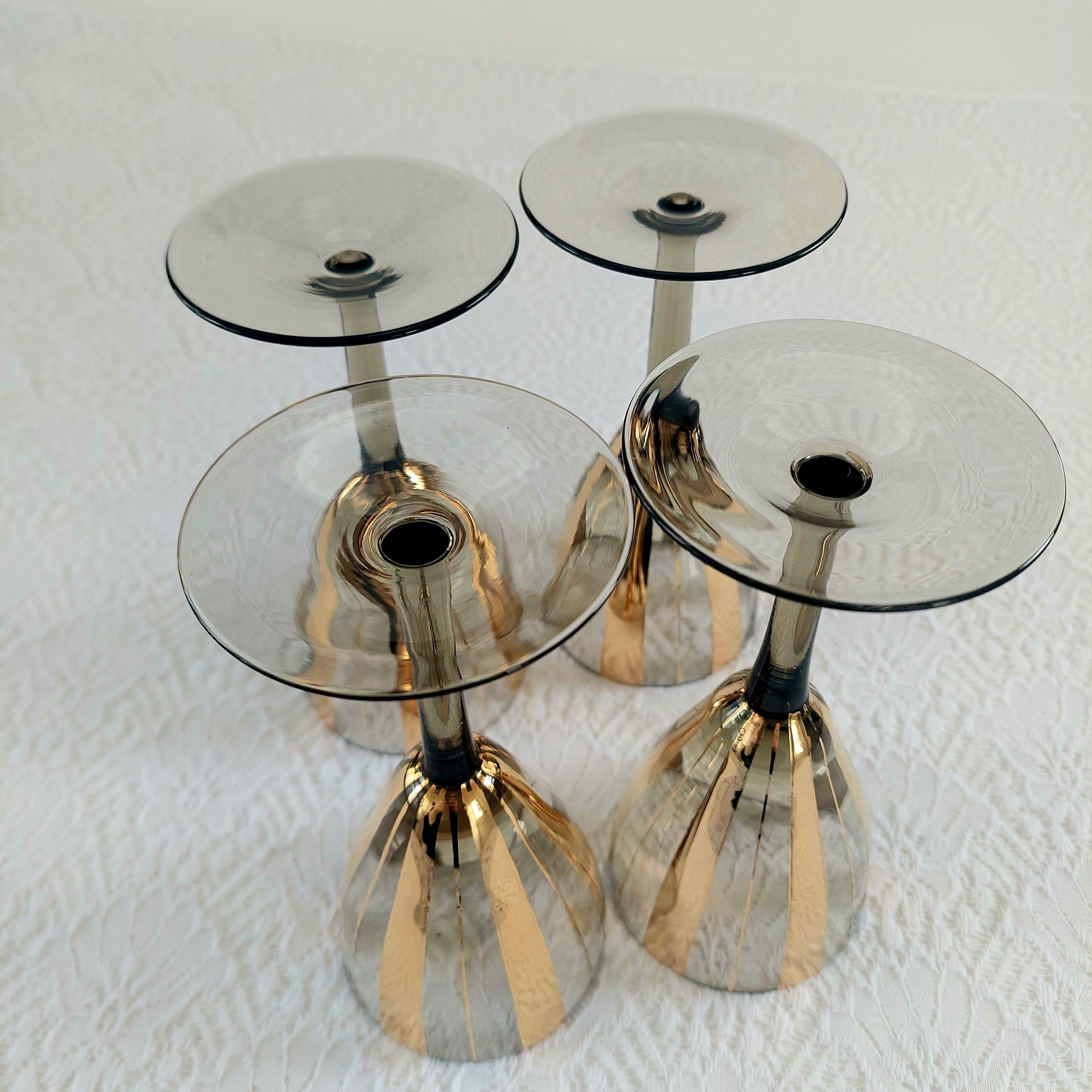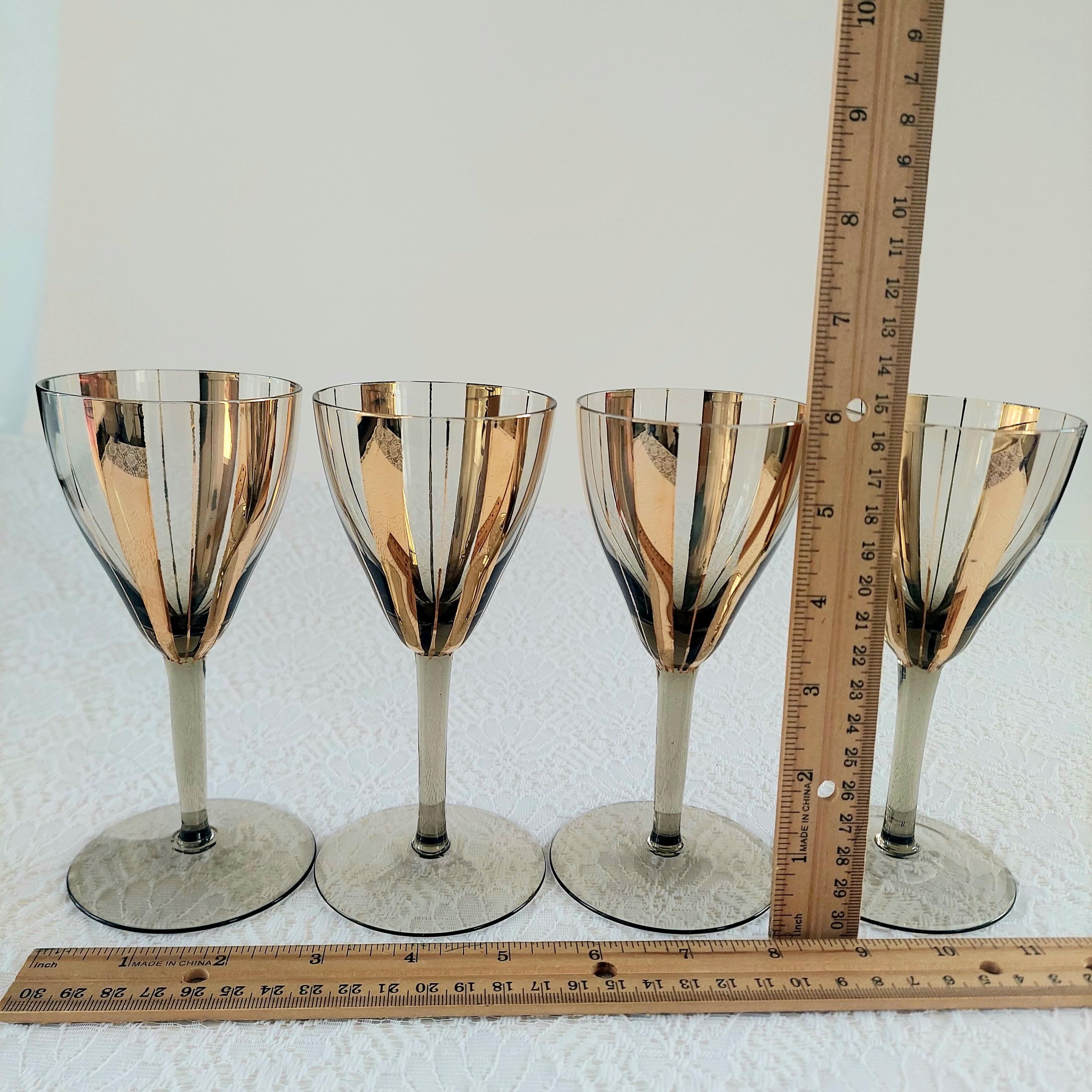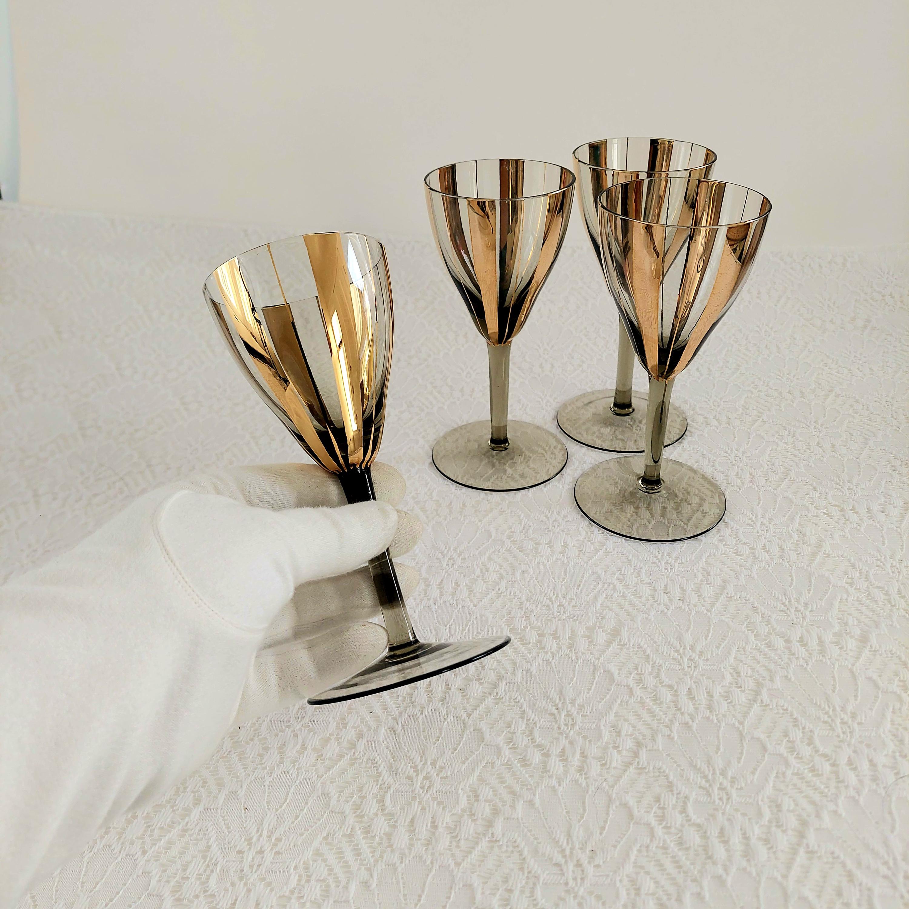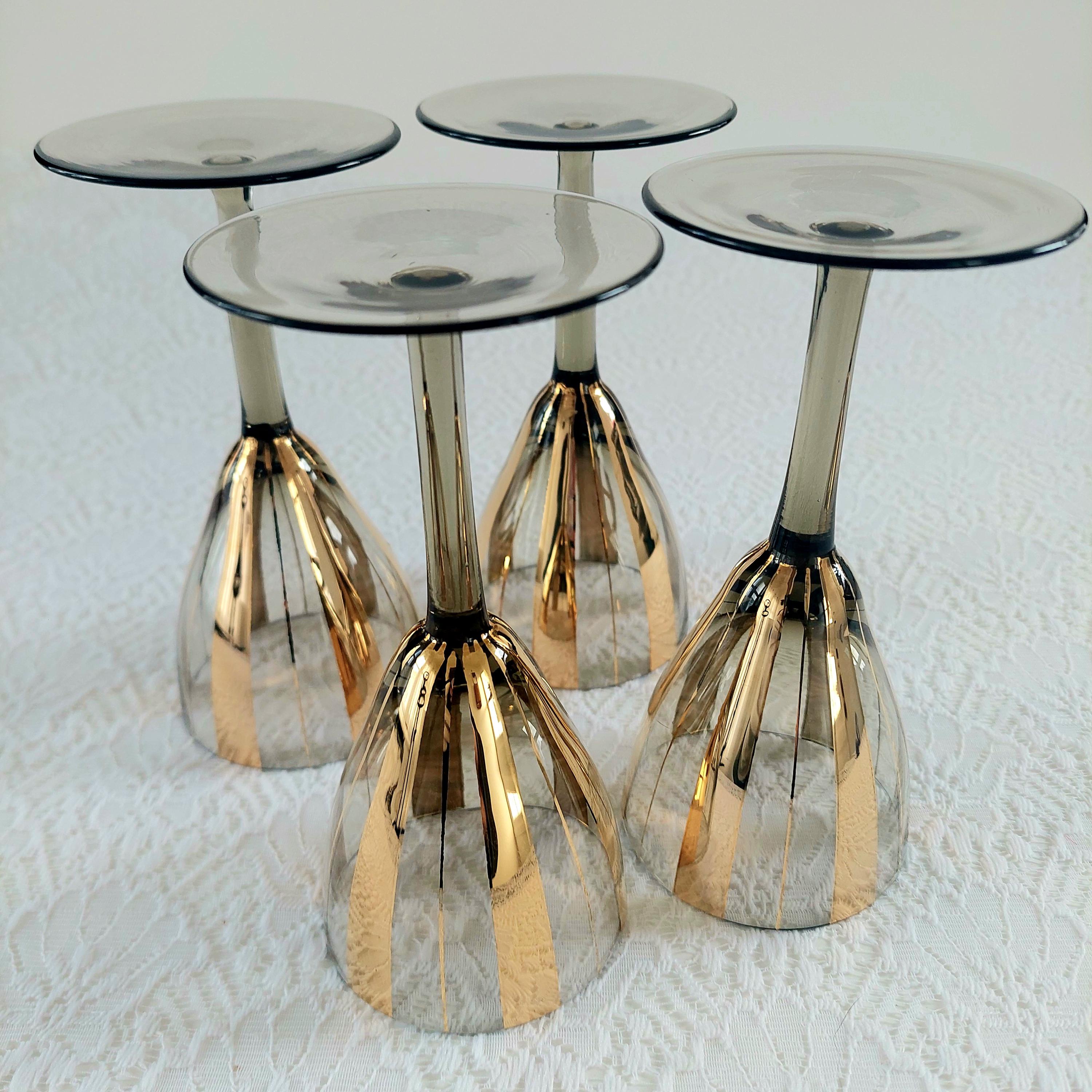 Elevate your bar cart with this stunning set of 4 vintage Mid-Century Modern wine glasses. Featuring a sophisticated smoky grey tint and bold, vertical gold fluted stripes, these glasses embody the Hollywood Regency aesthetic.