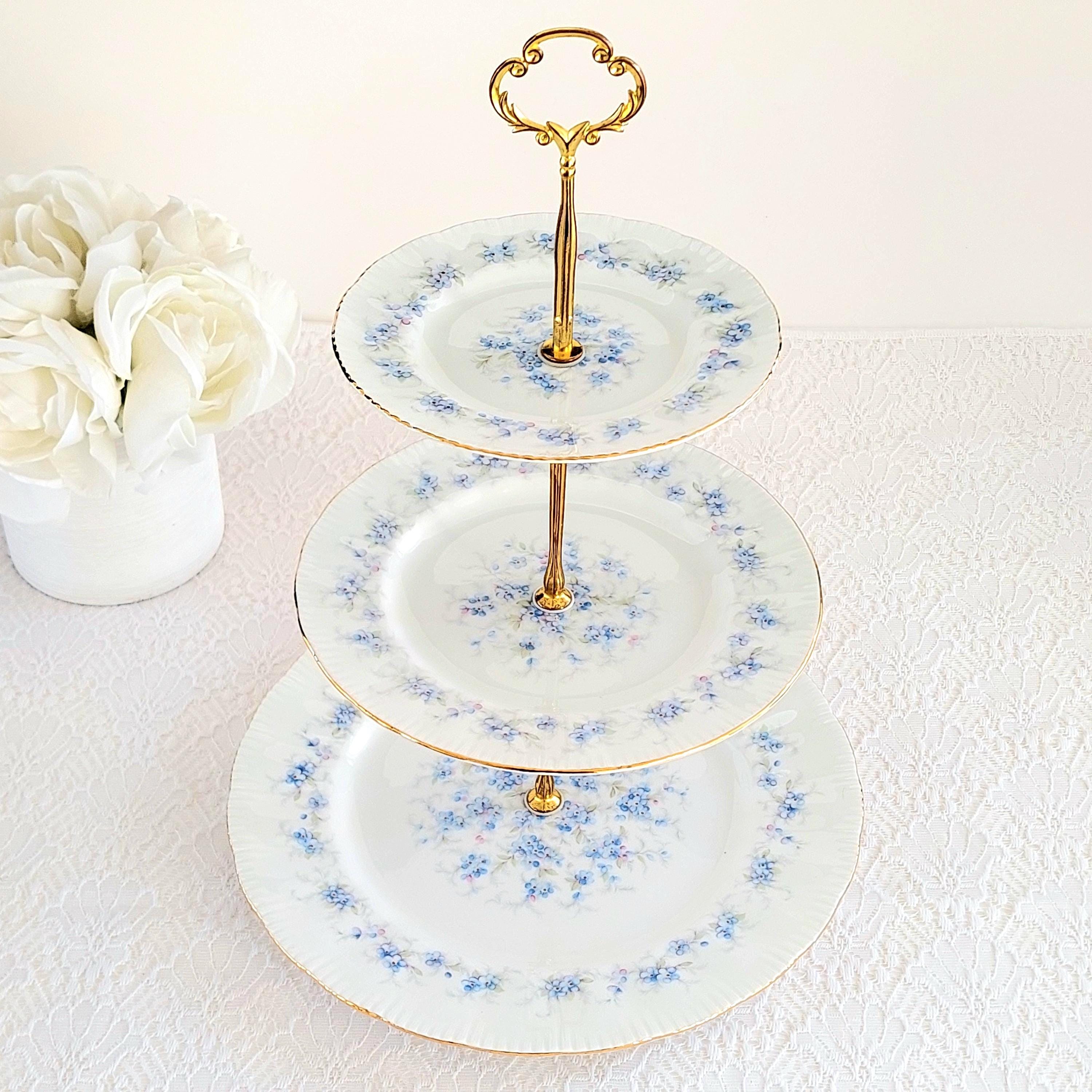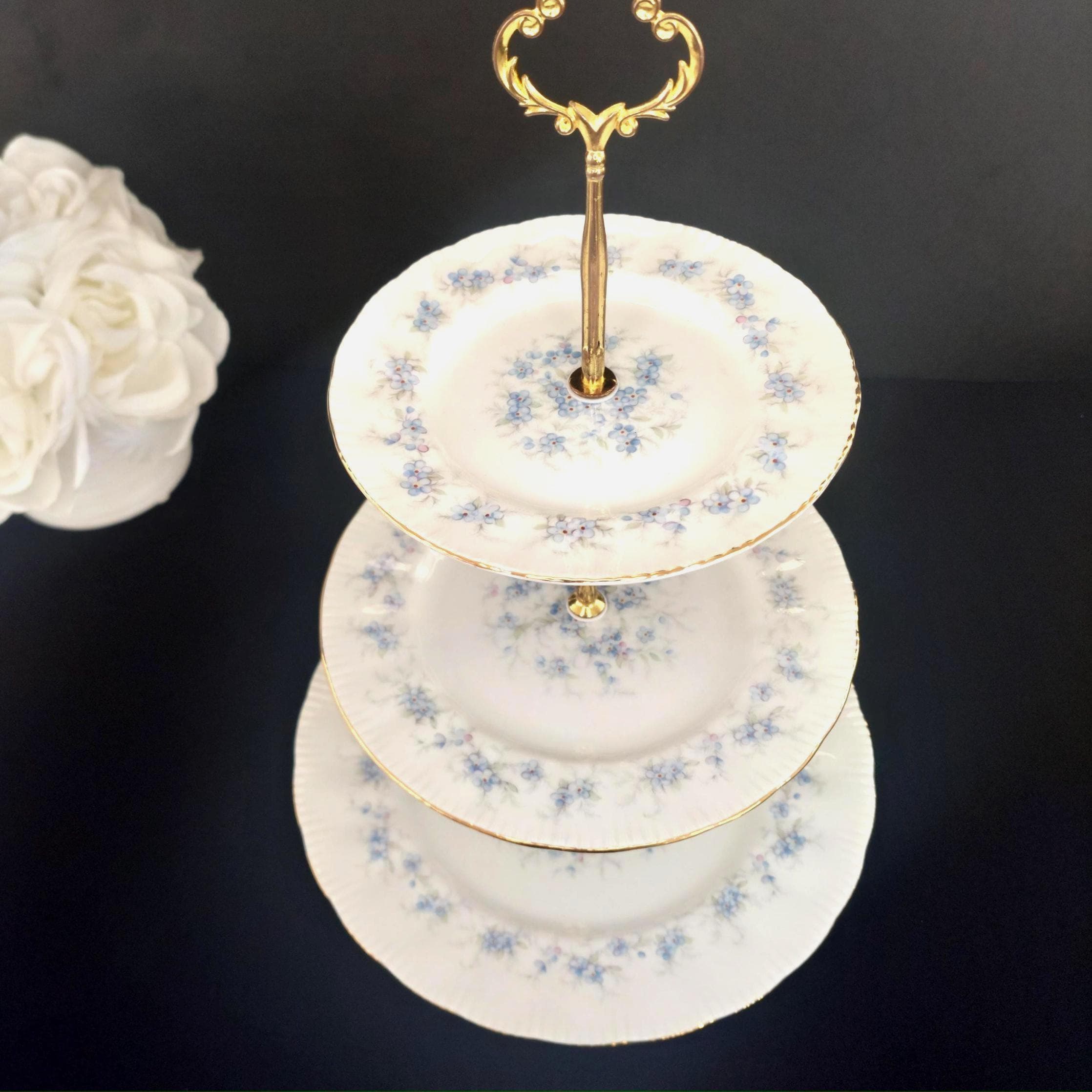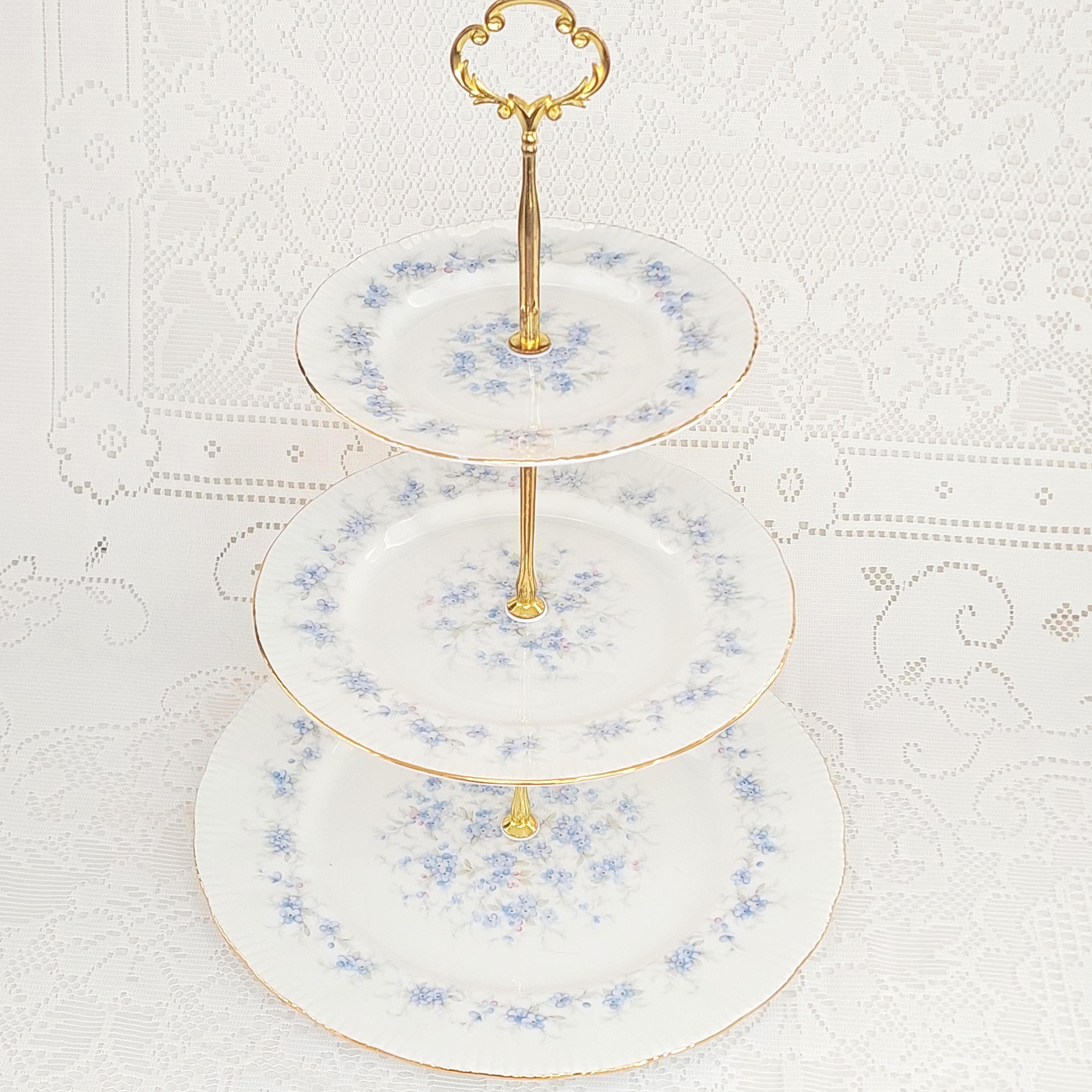 Three tier cake stand, made by me, using Paragon Morning Petit Fleurs side, salad and dinner plates with gold edge. Plates feature little blue flowers and soft gray and green foliage on crisp white English bone china.