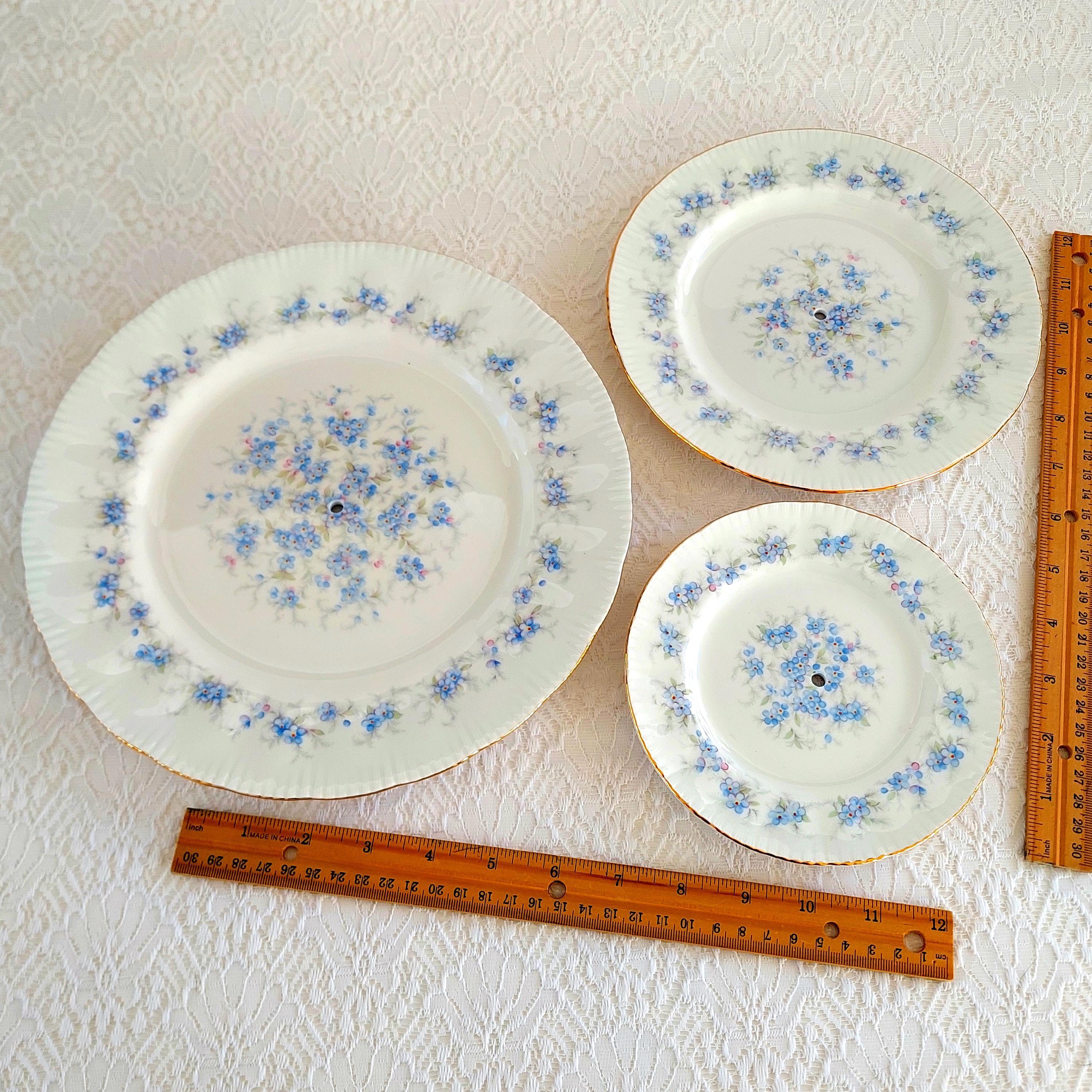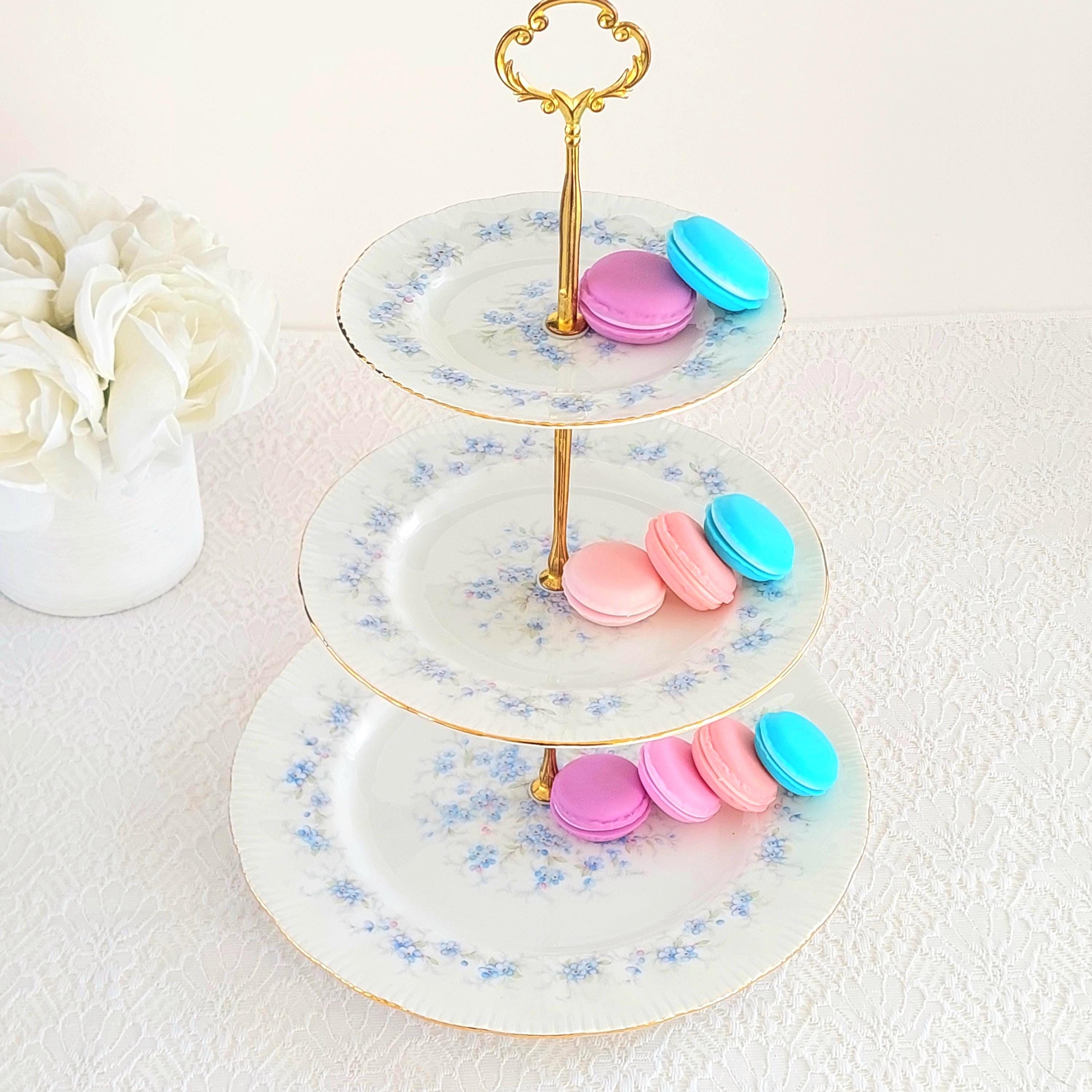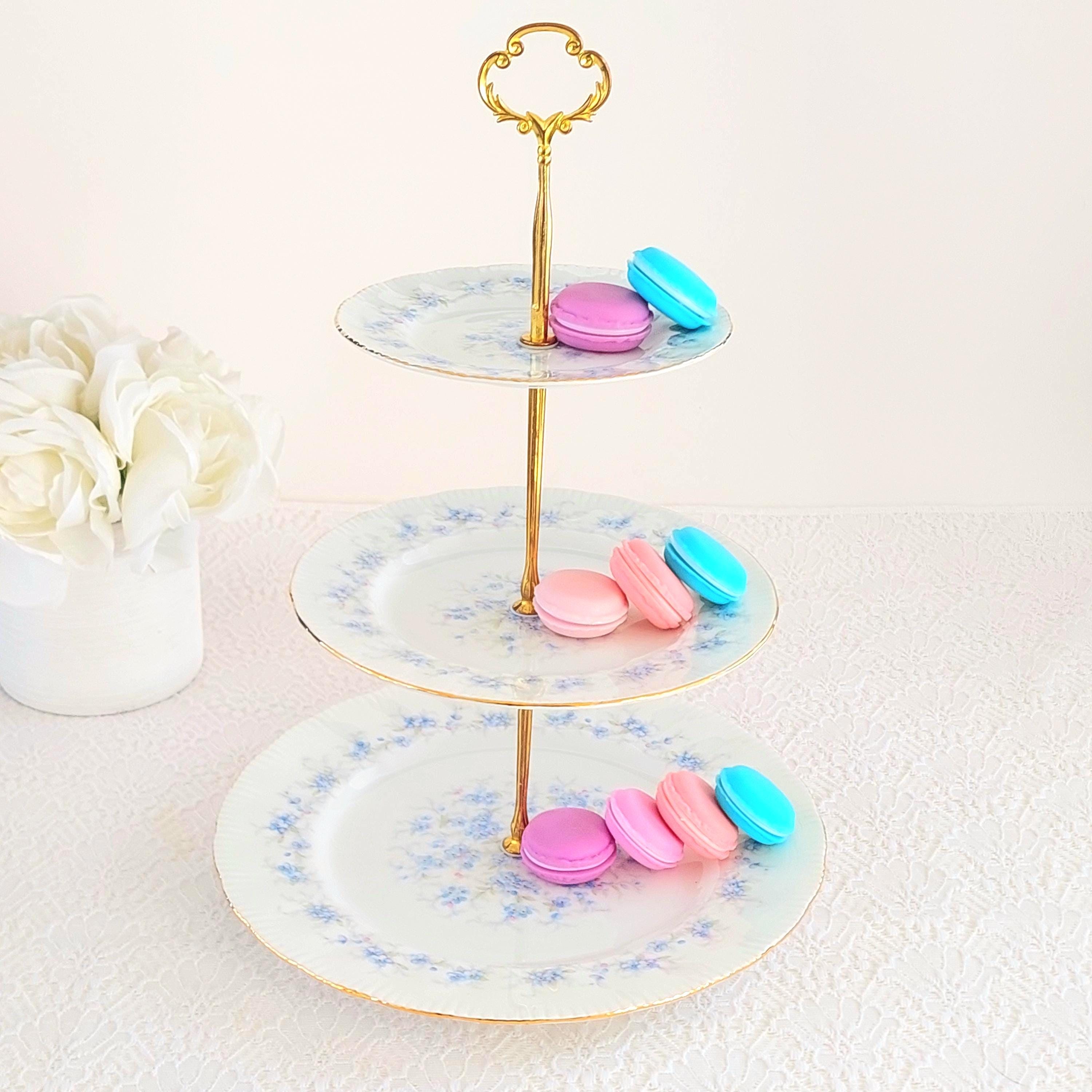 Three tier cake stand, made by me, using Paragon Morning Petit Fleurs side, salad and dinner plates with gold edge. Plates feature little blue flowers and soft gray and green foliage on crisp white English bone china.