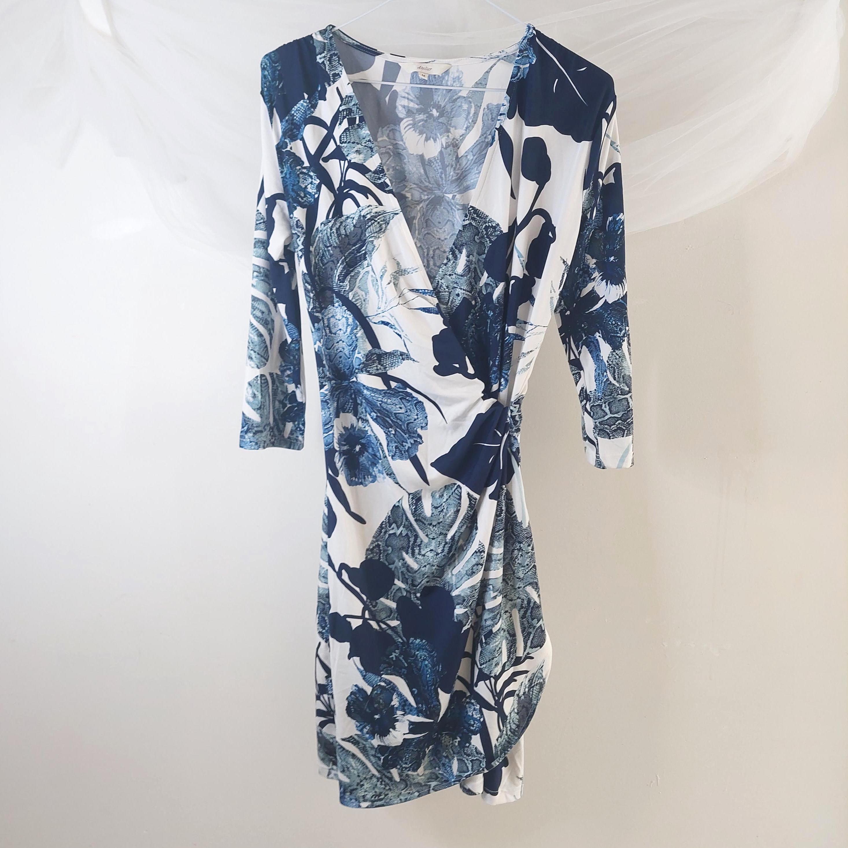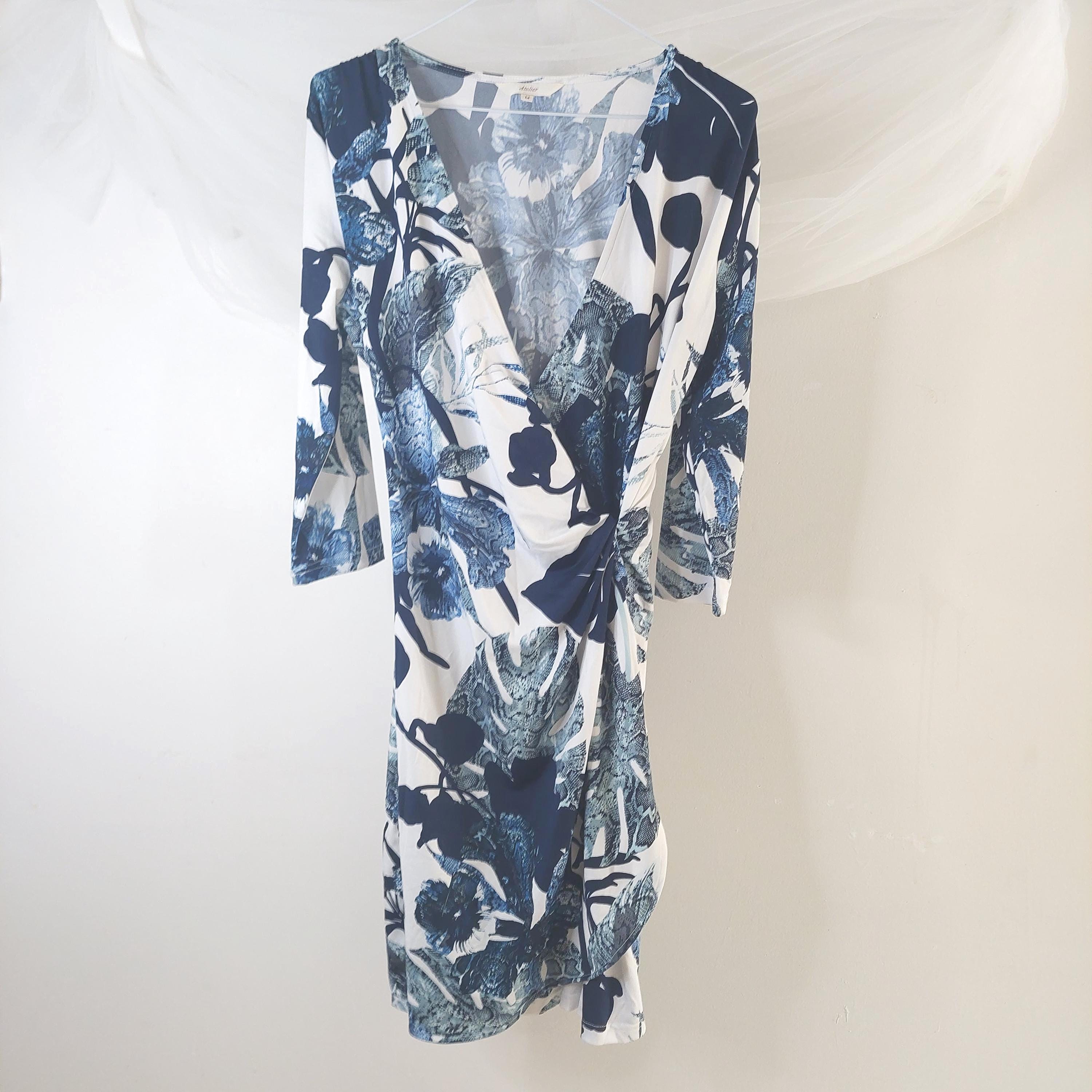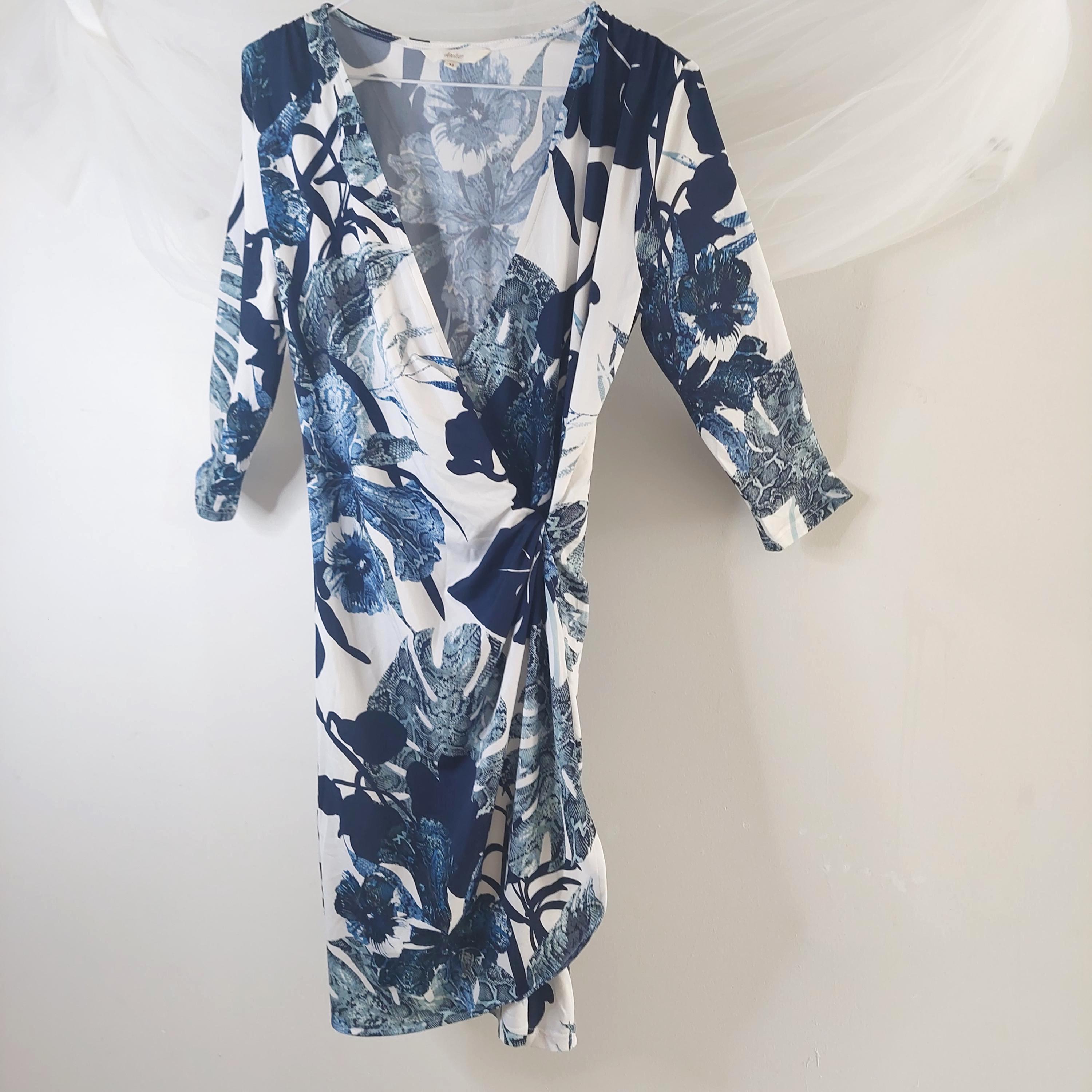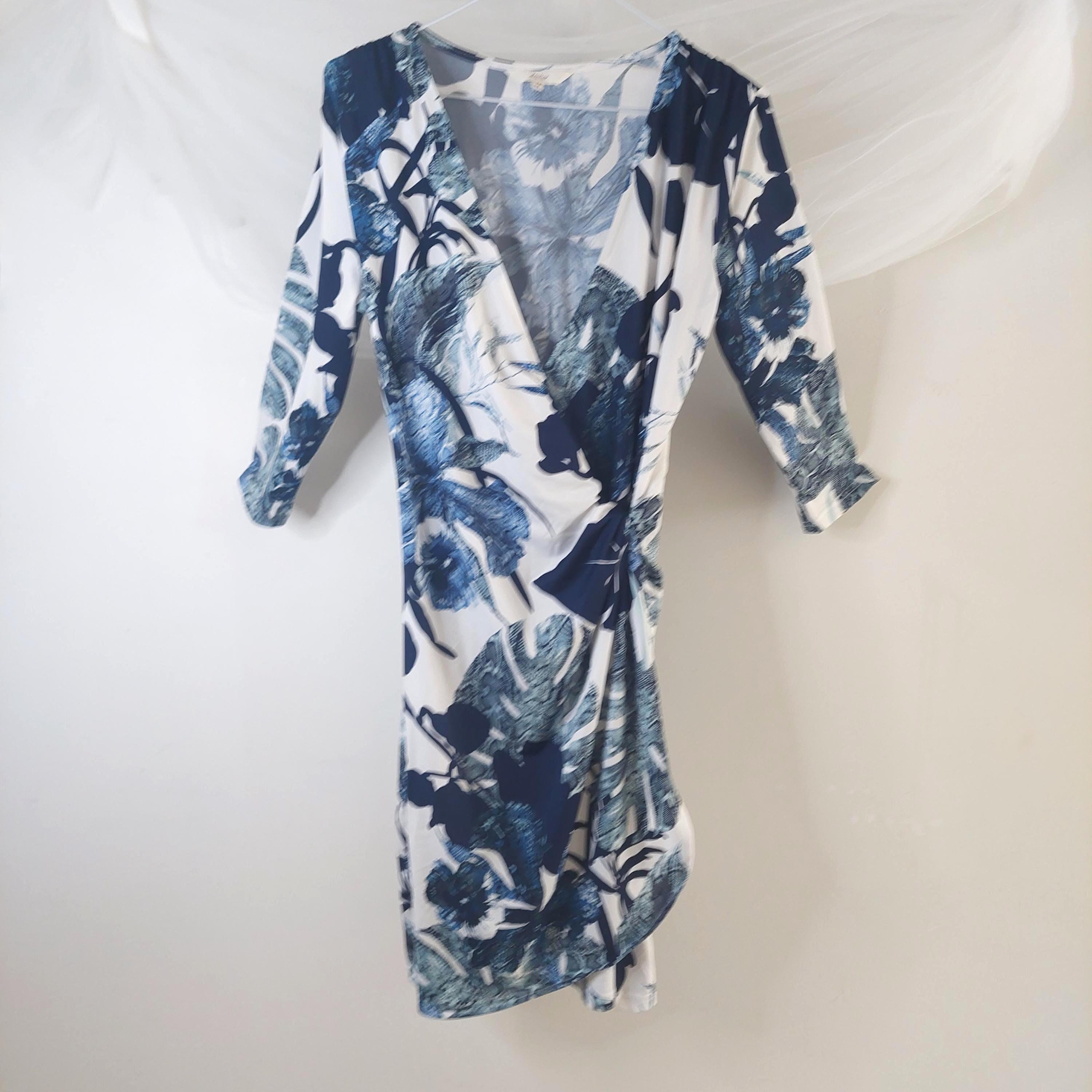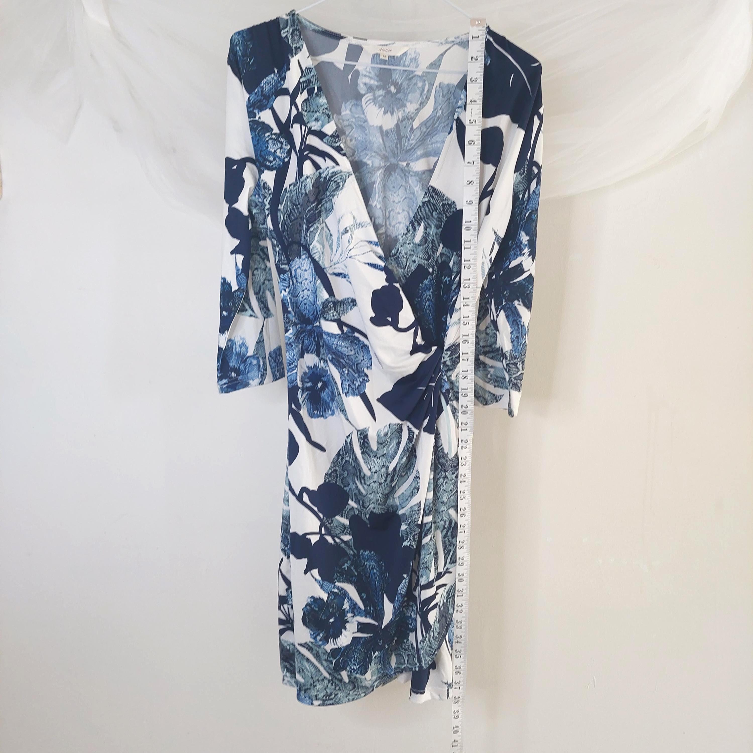 Upgrade your wardrobe with this elegant faux wrap dress. Featuring a timeless navy blue and white floral print, this piece offers a flattering surplice neckline and comfortable 3/4 sleeves. The faux wrap detail provides the classic silhouette with a secure, worry-free fit. Crafted from a soft, stretch jersey fabric that is travel-friendly and wrinkle-resistant.