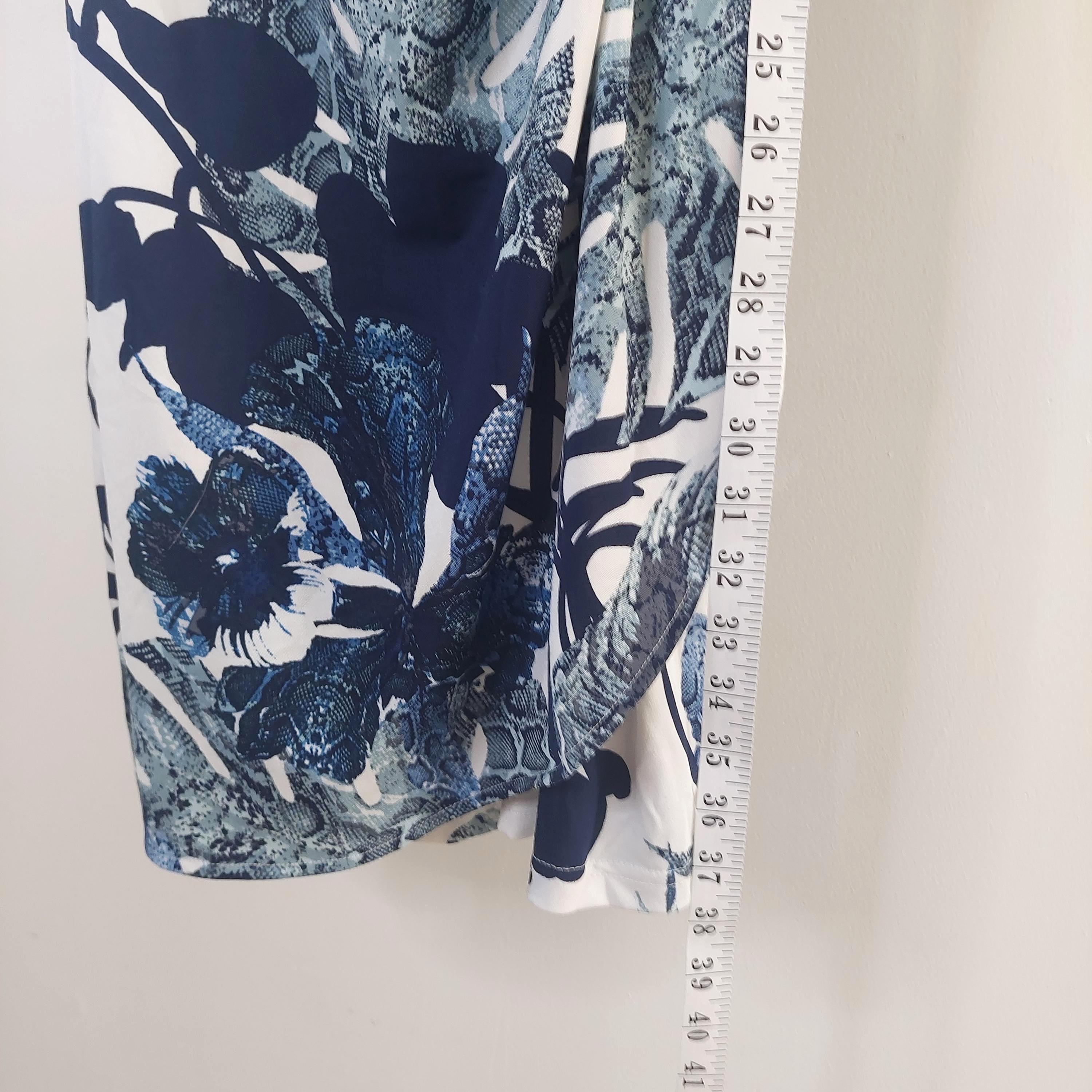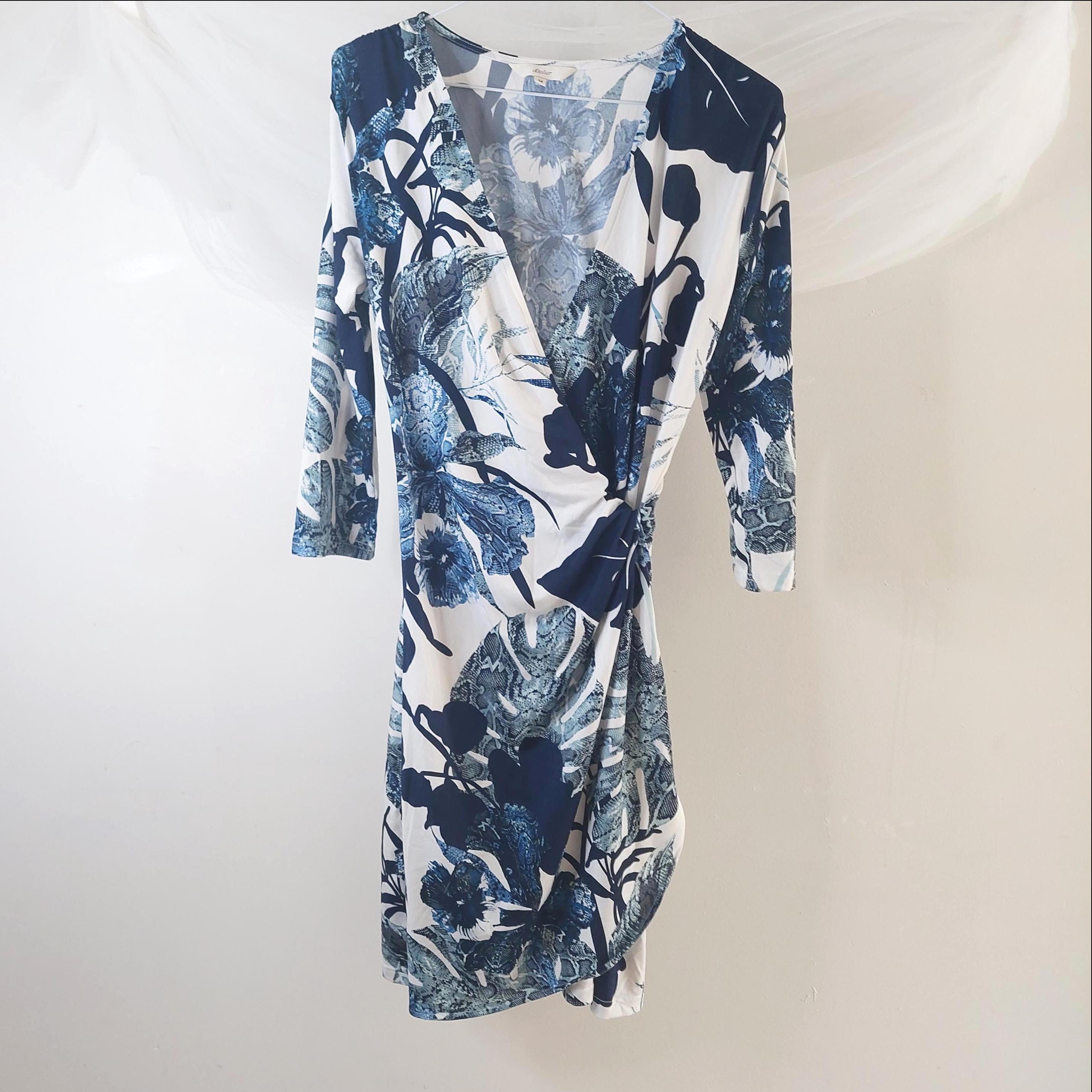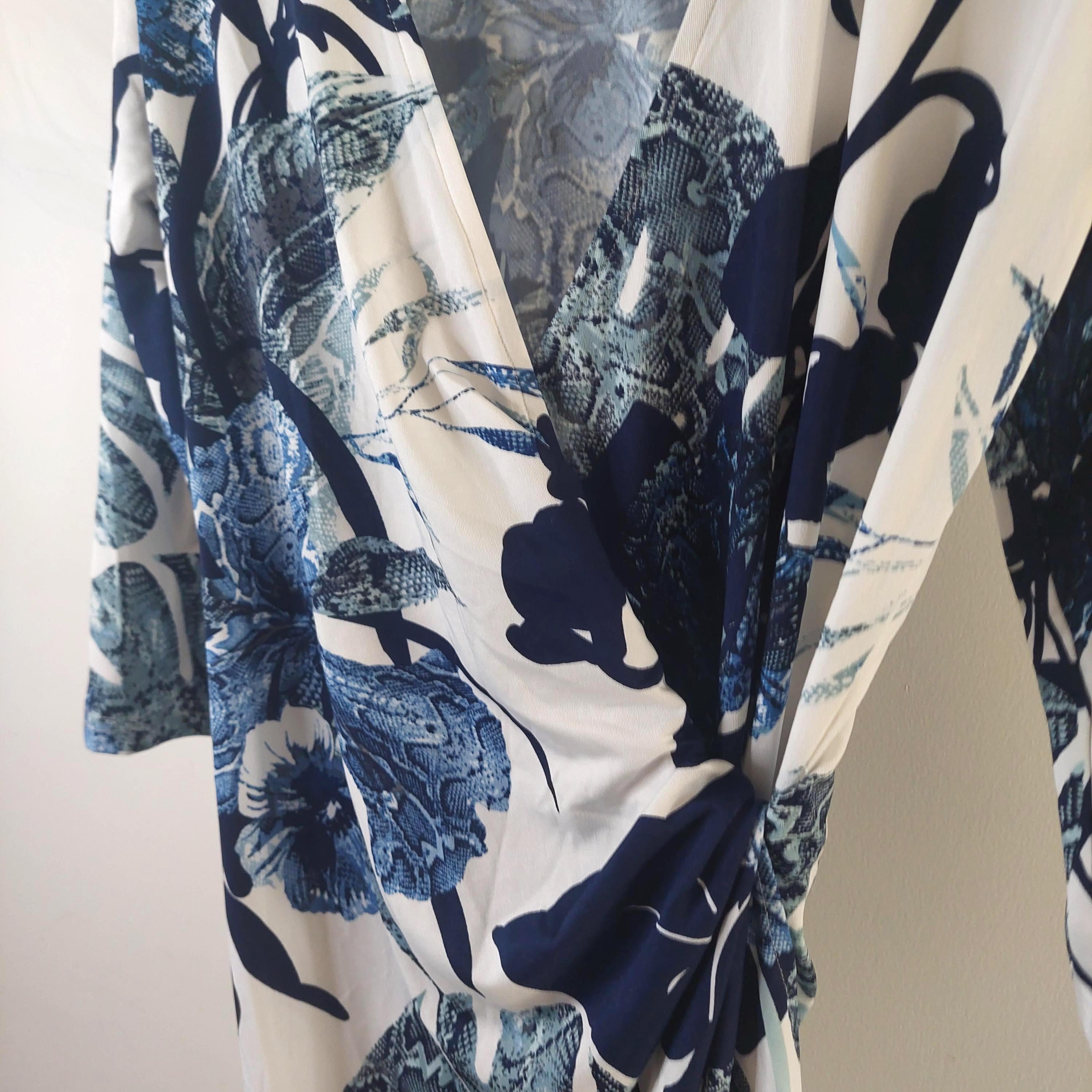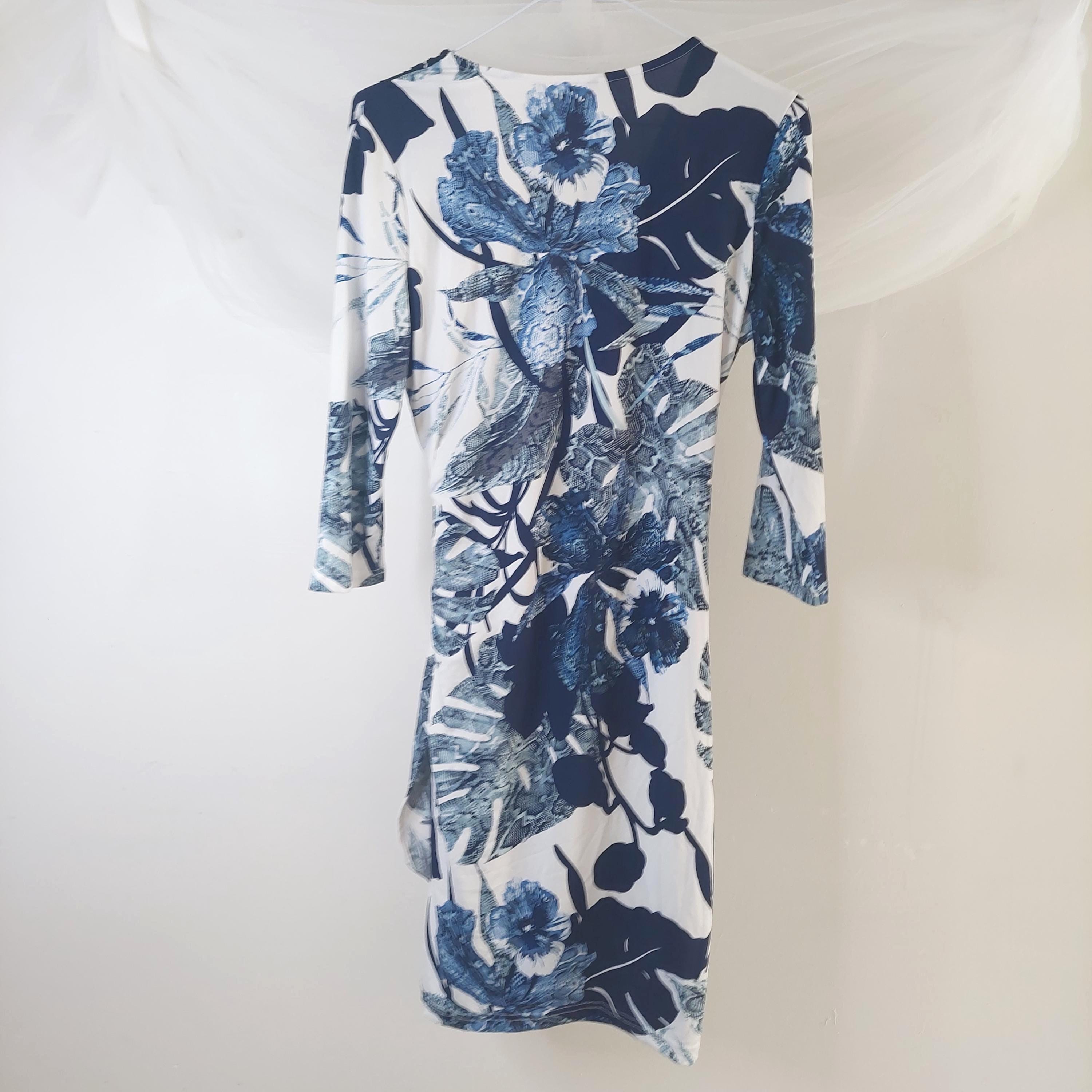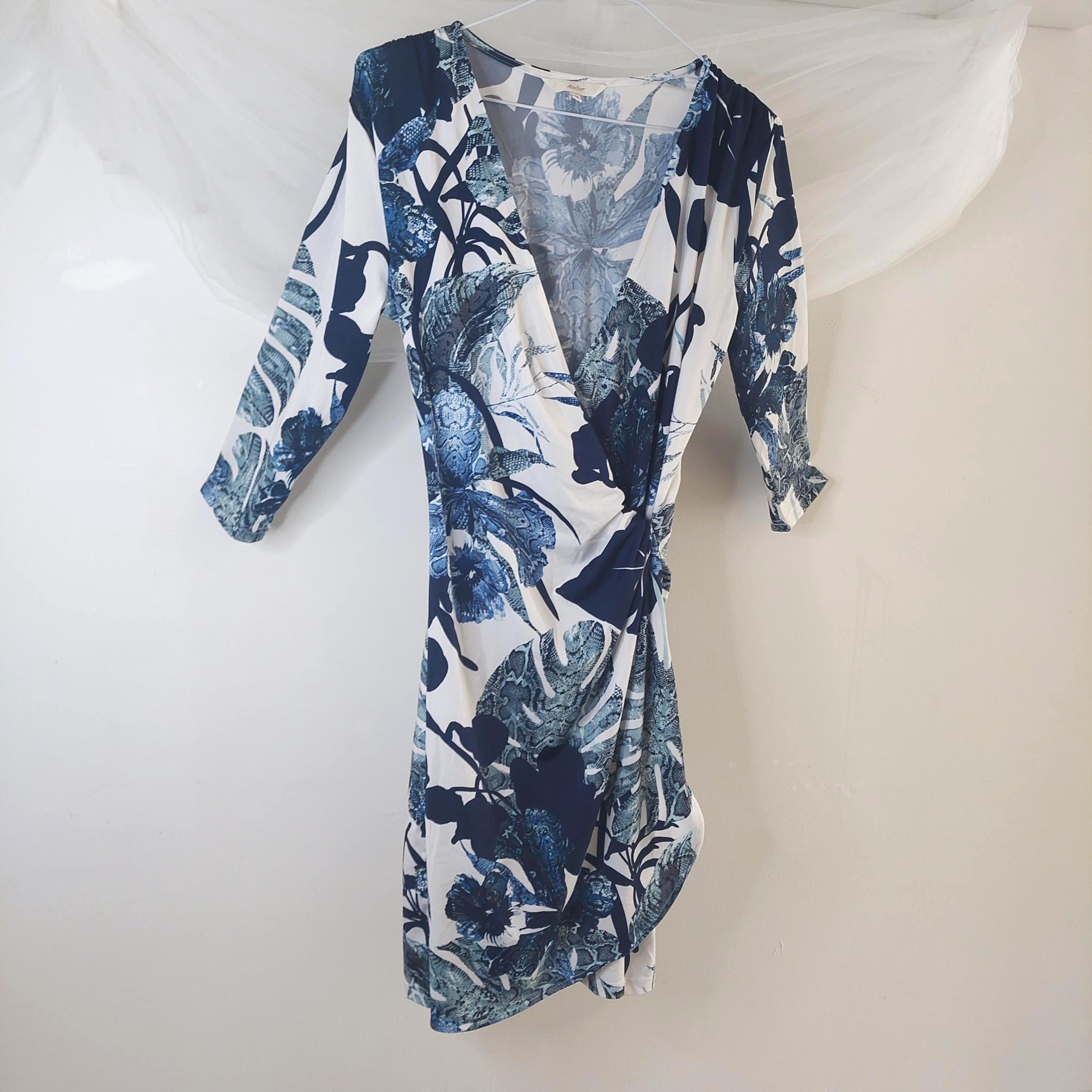 Upgrade your wardrobe with this elegant faux wrap dress. Featuring a timeless navy blue and white floral print, this piece offers a flattering surplice neckline and comfortable 3/4 sleeves. The faux wrap detail provides the classic silhouette with a secure, worry-free fit. Crafted from a soft, stretch jersey fabric that is travel-friendly and wrinkle-resistant.