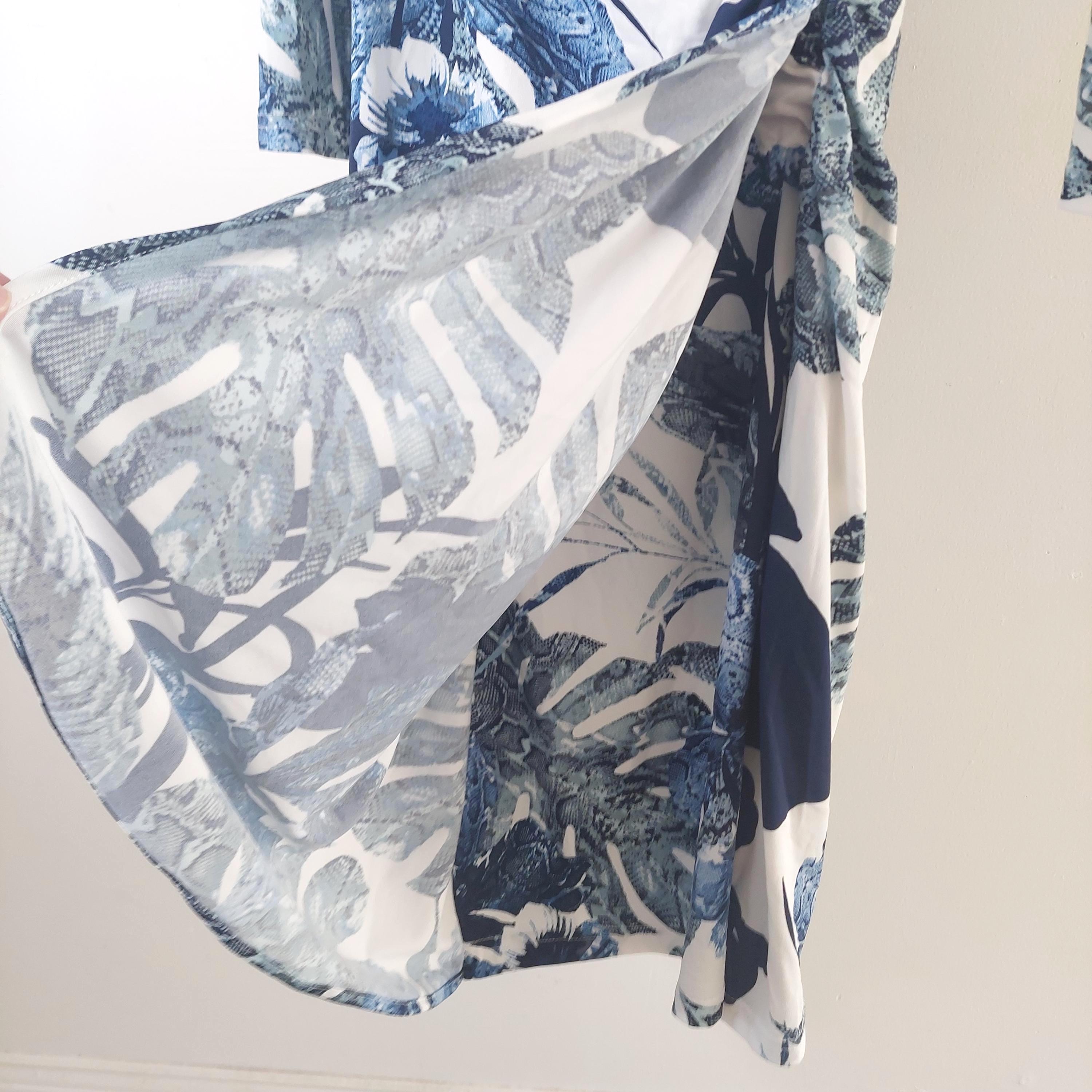 To the left at the mid waist the fabric is bunched to appear like a knot
