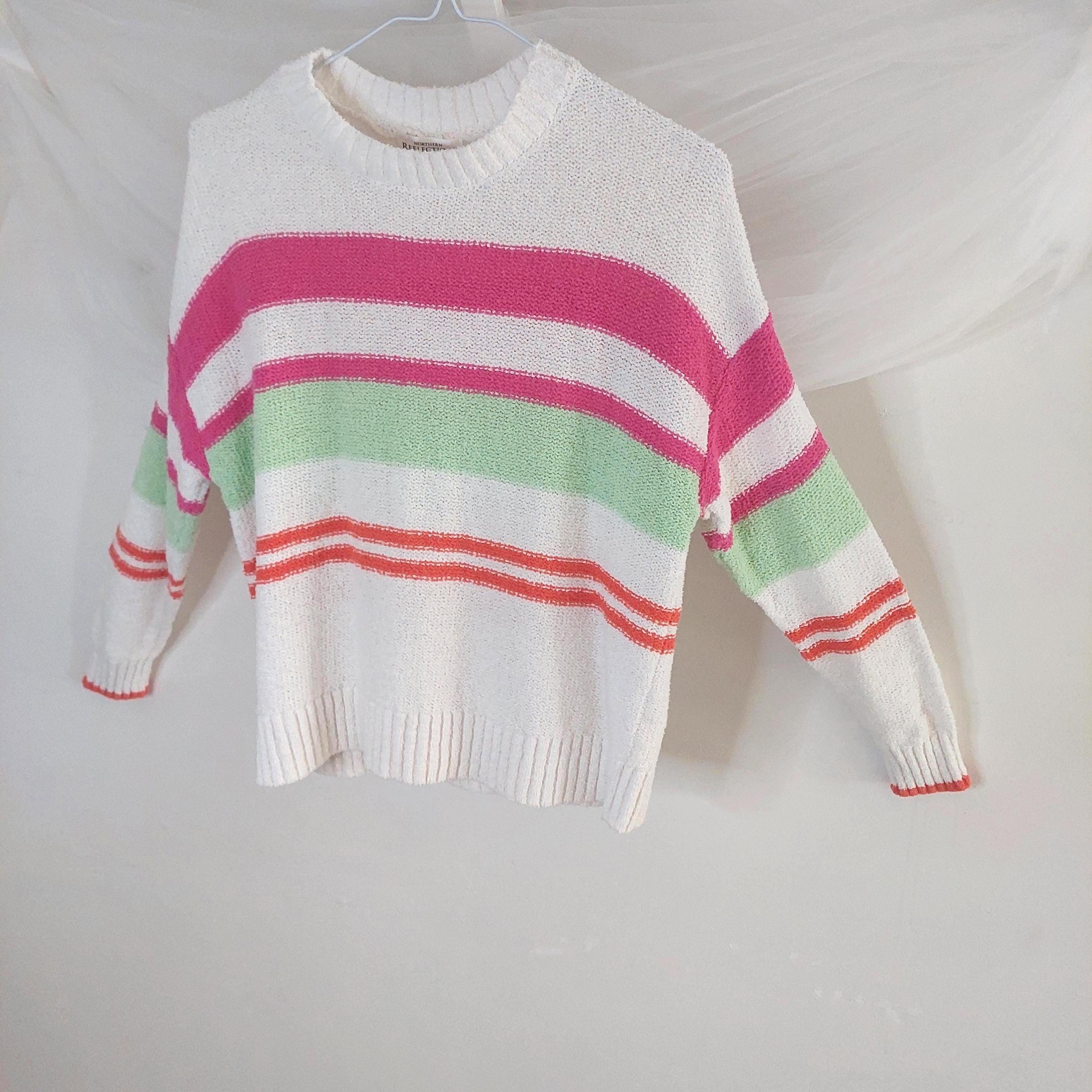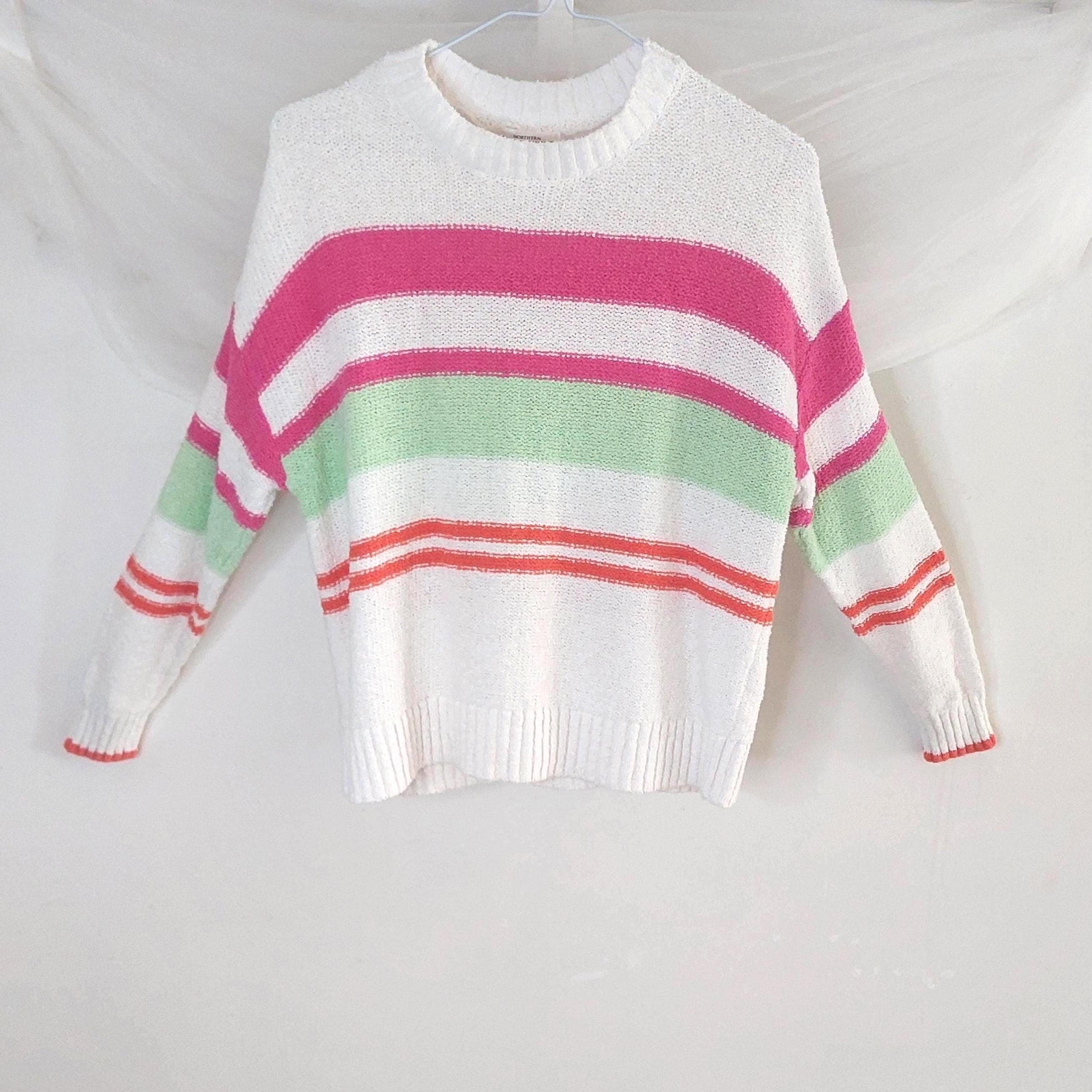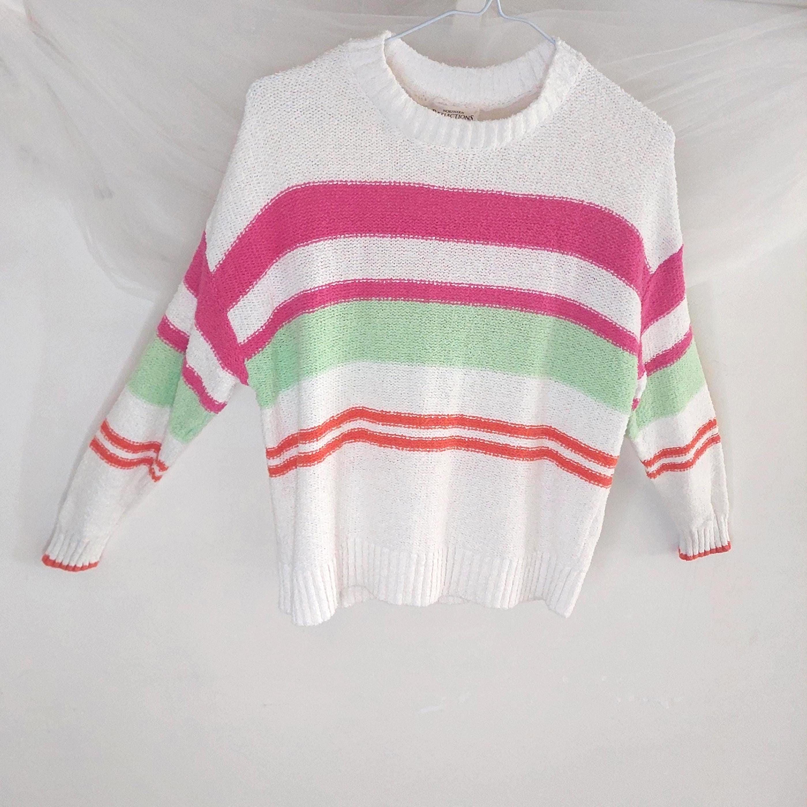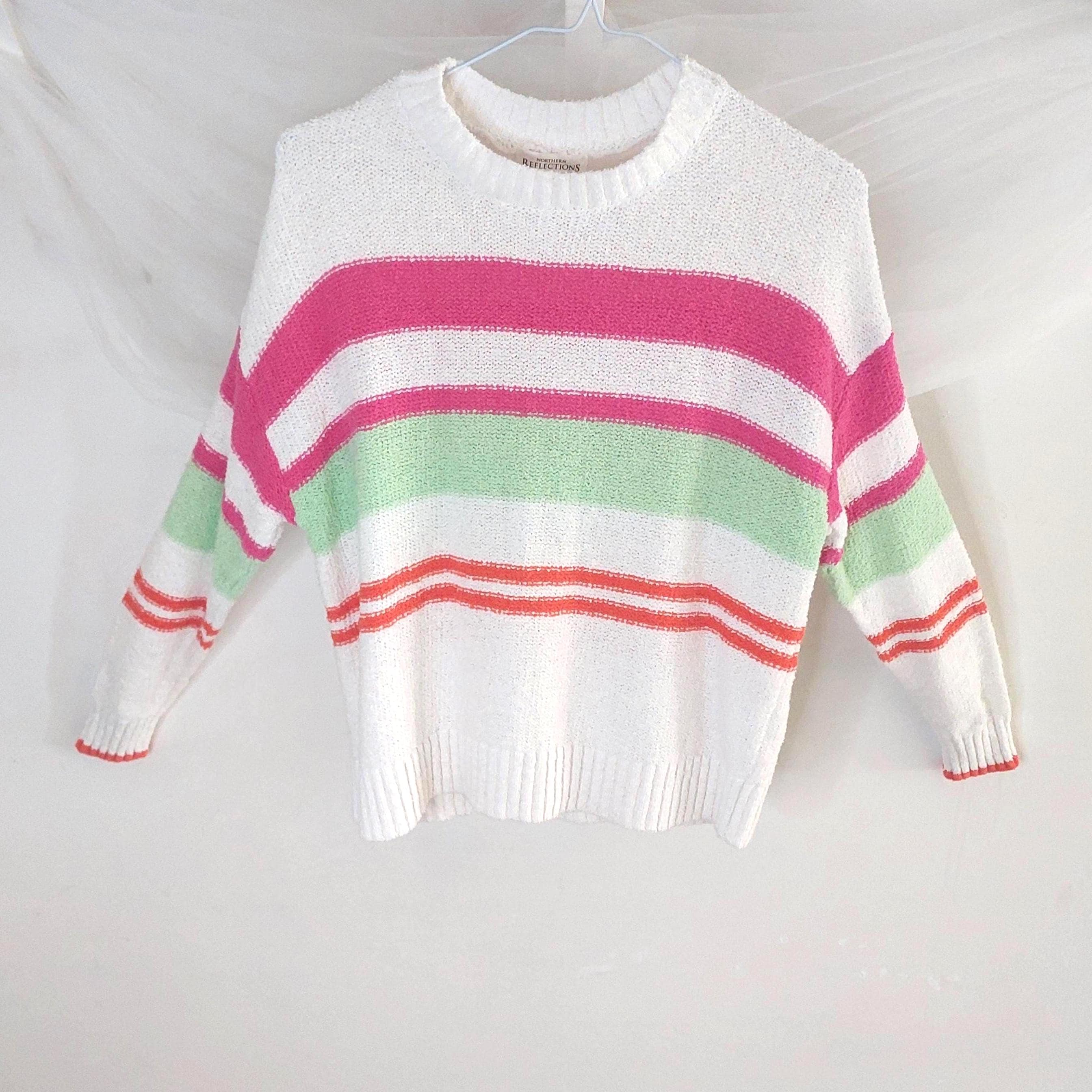 Add a pop of color to your casual wardrobe with this iconic piece from Northern Reflections. This white knit sweater features vibrant horizontal stripes in shades of bubblegum pink, lime green, and sunset orange. Known for their durable quality and "Canadian cottage" comfort, this sweater is perfect for layering during breezy summer nights or crisp fall days.