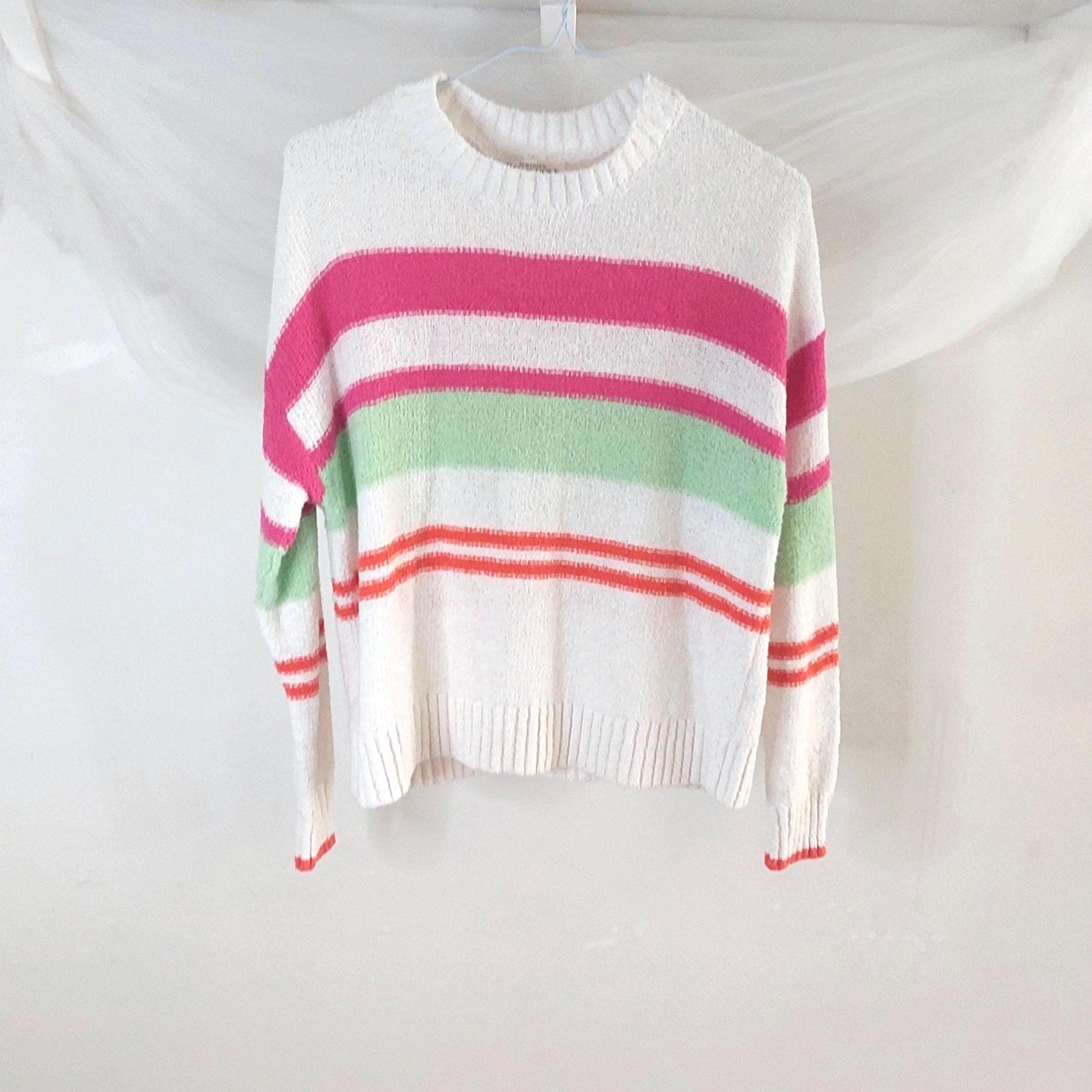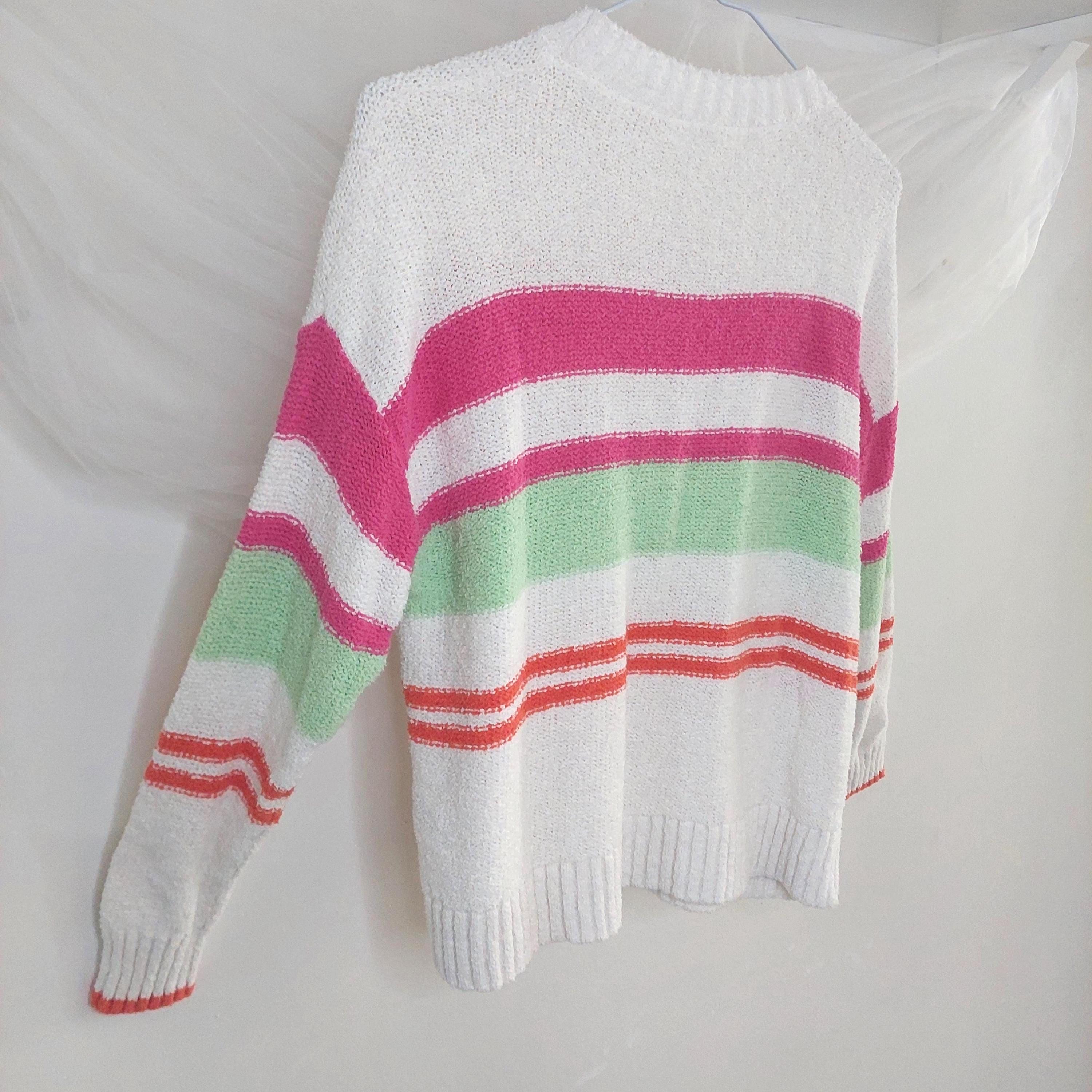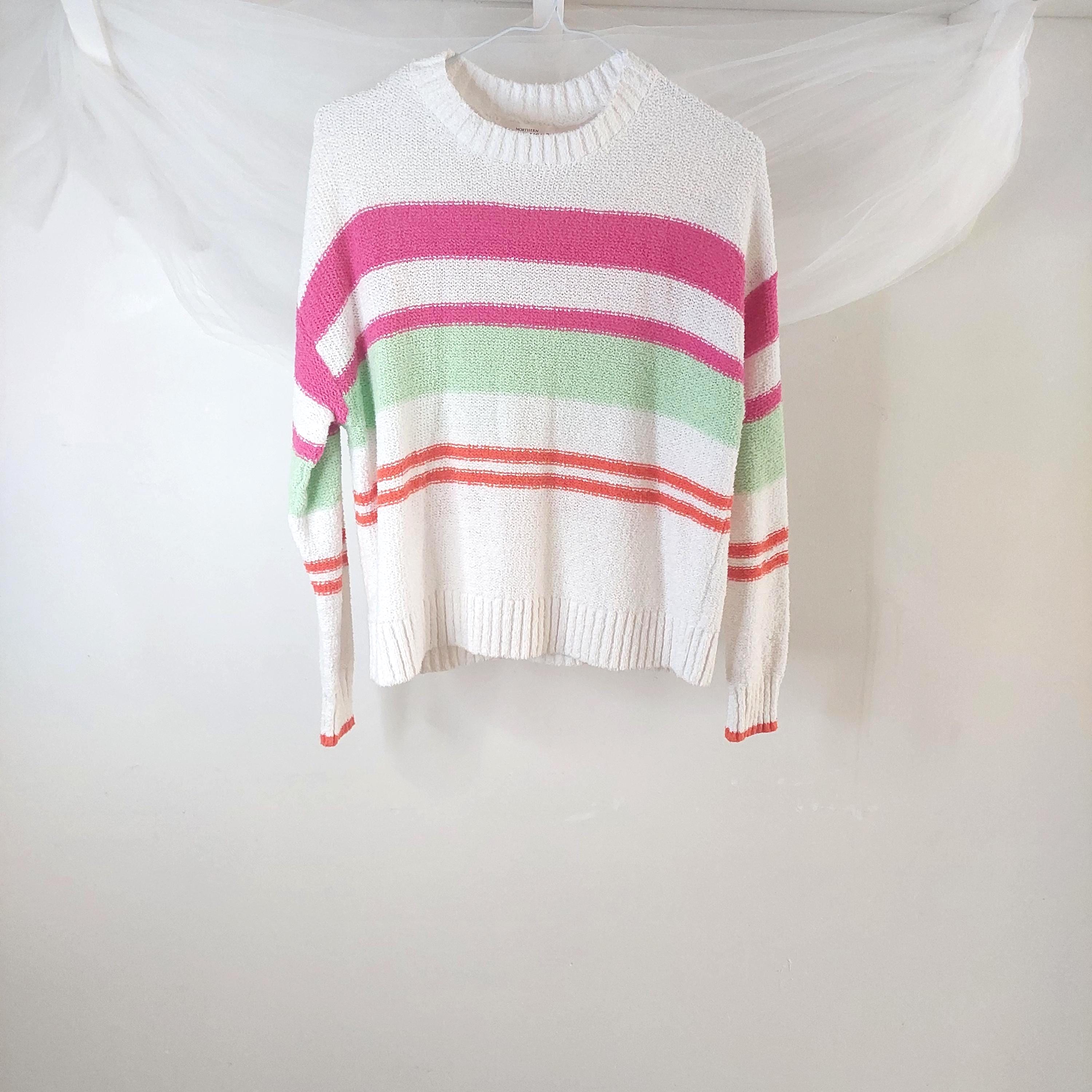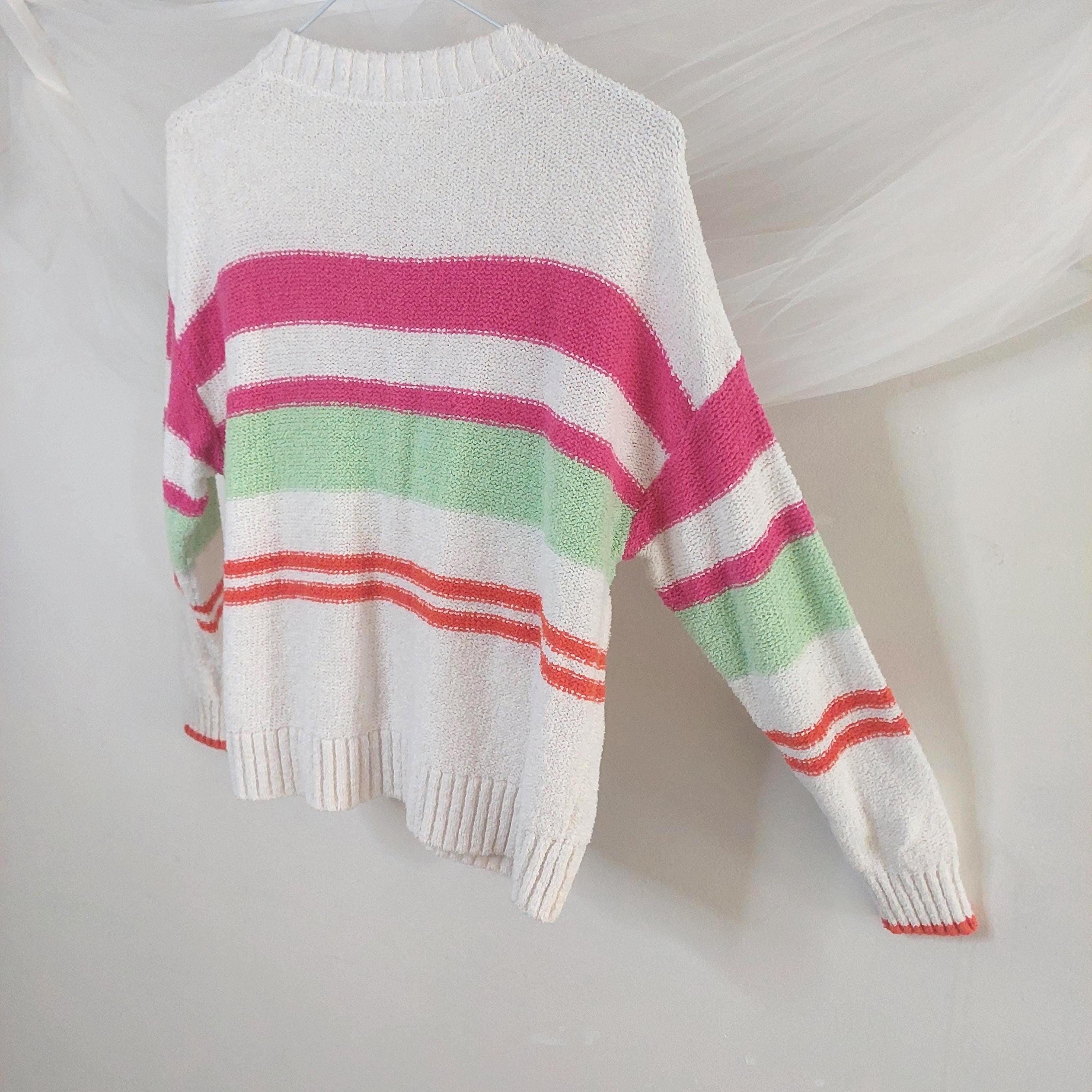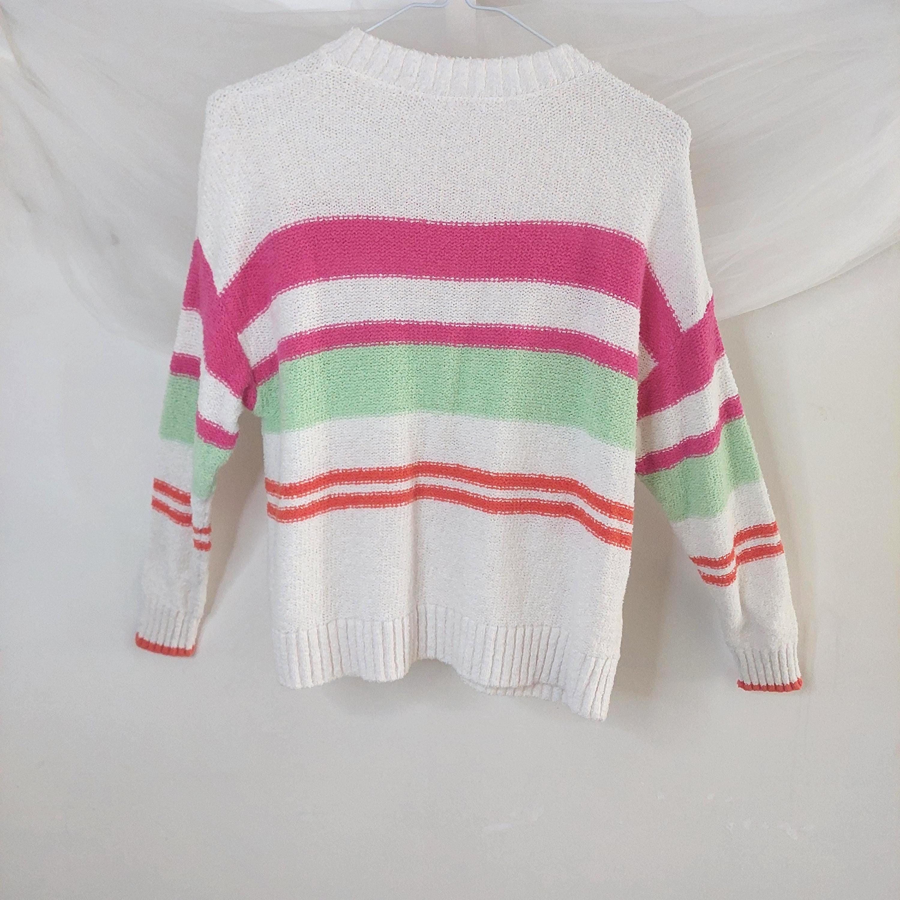 Add a pop of color to your casual wardrobe with this iconic piece from Northern Reflections. This white knit sweater features vibrant horizontal stripes in shades of bubblegum pink, lime green, and sunset orange. Known for their durable quality and "Canadian cottage" comfort, this sweater is perfect for layering during breezy summer nights or crisp fall days.