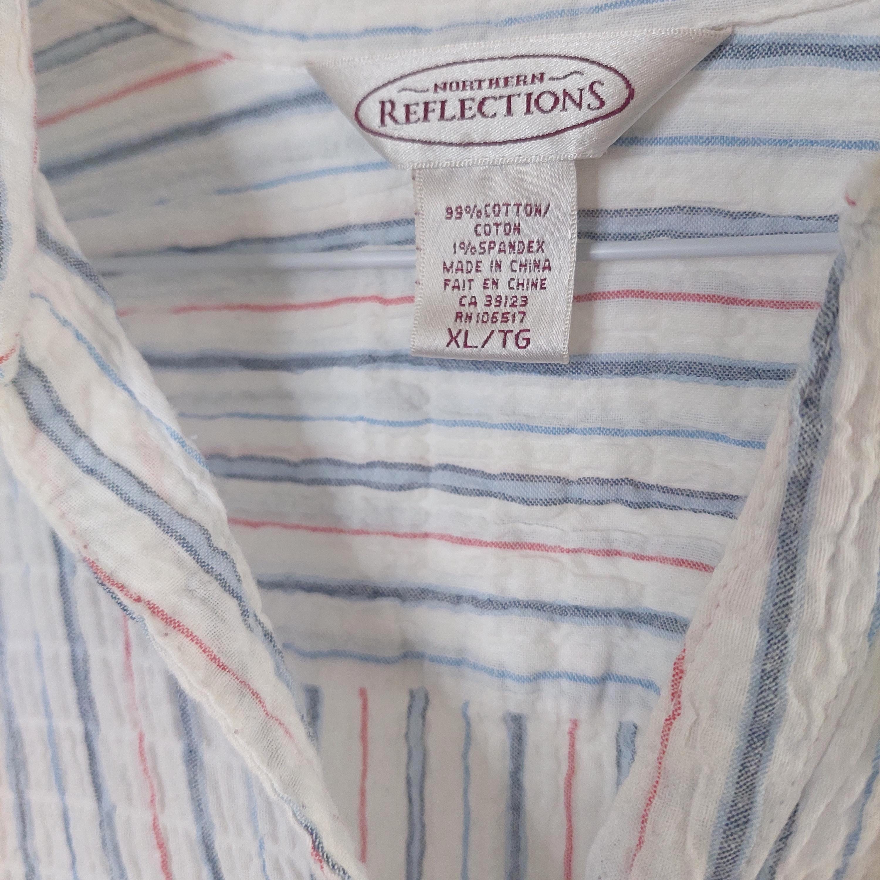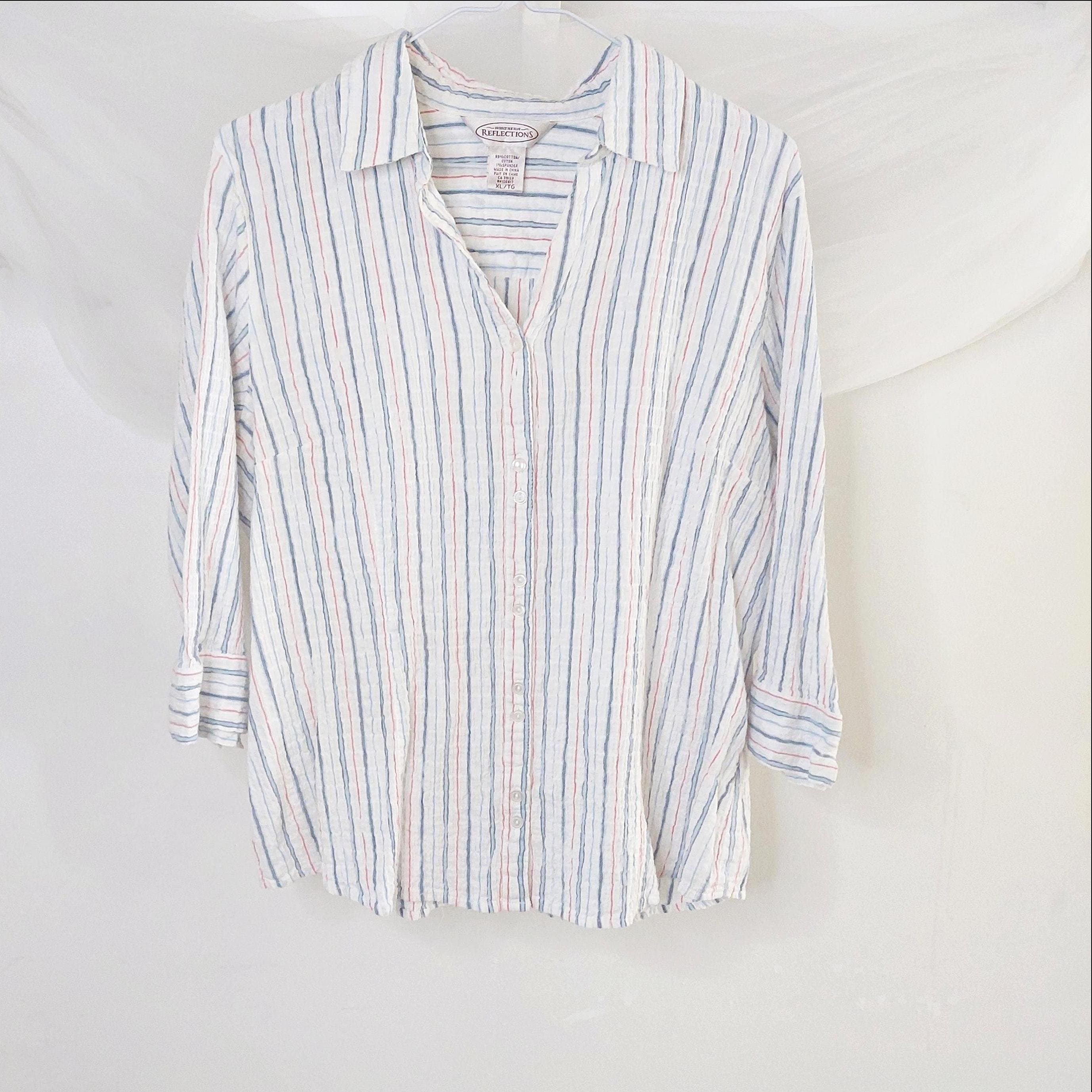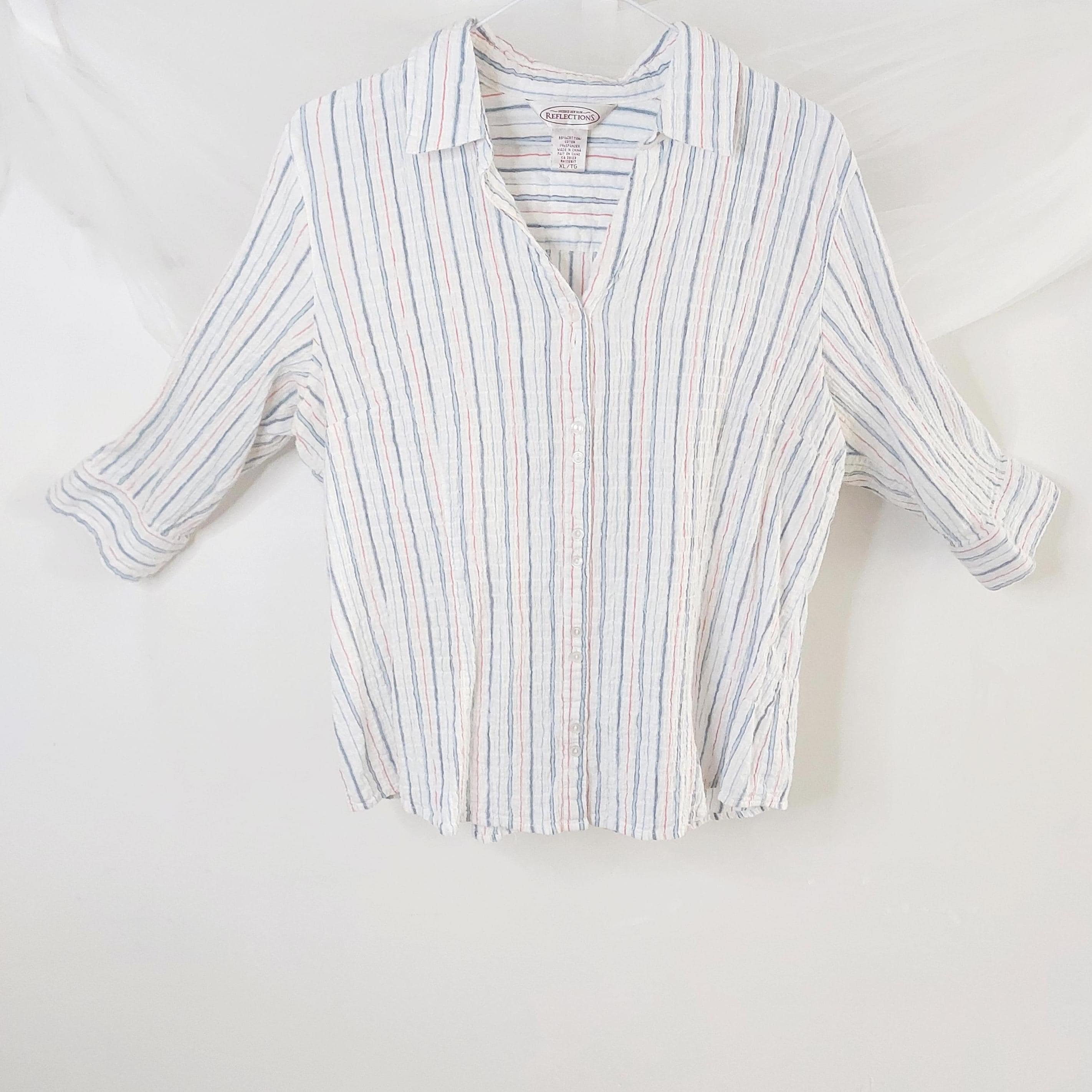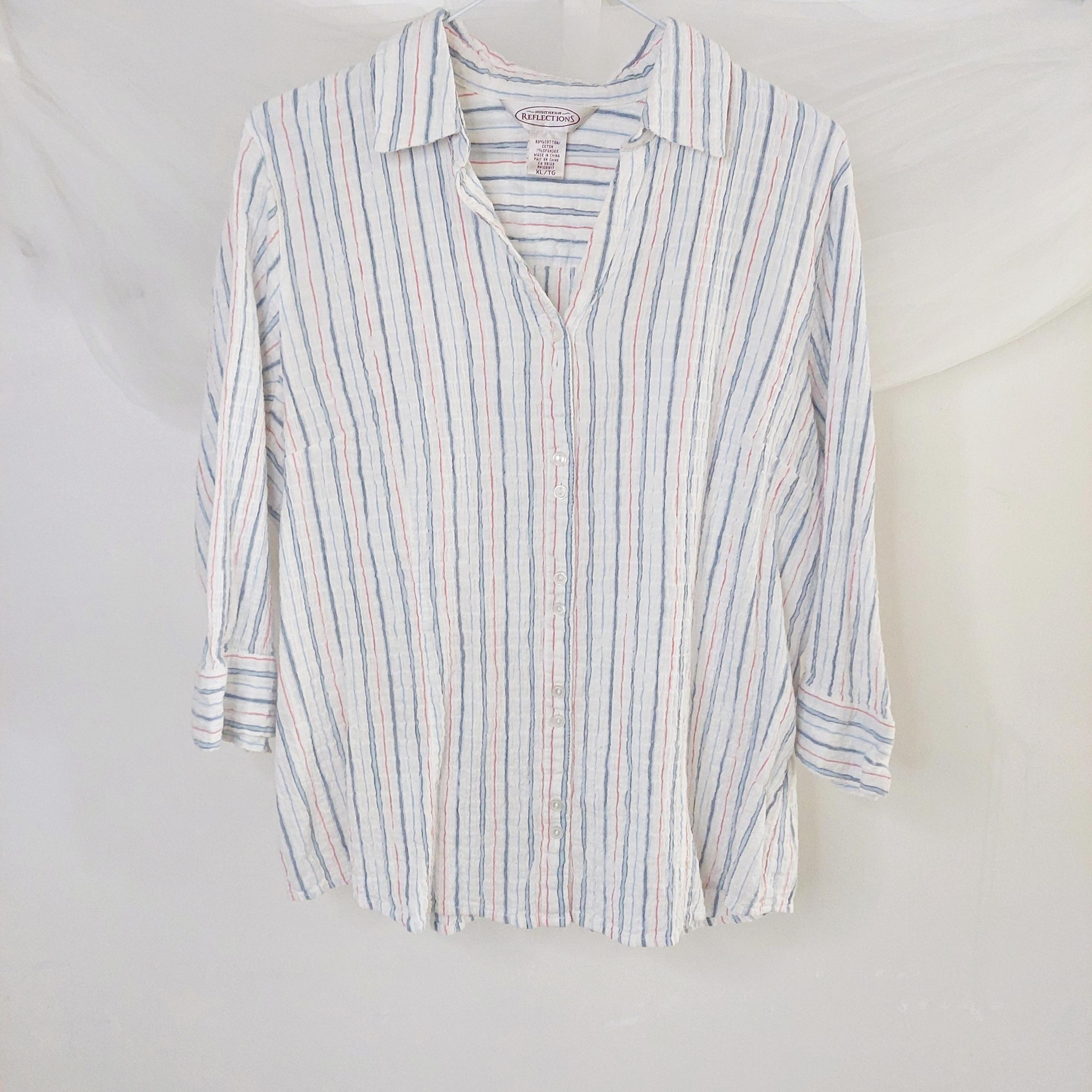 This is a Northern Reflections button-up blouse with vertical stripes in blue and pink. It features a classic split-neck collar and 3/4 length sleeves with cuffed details