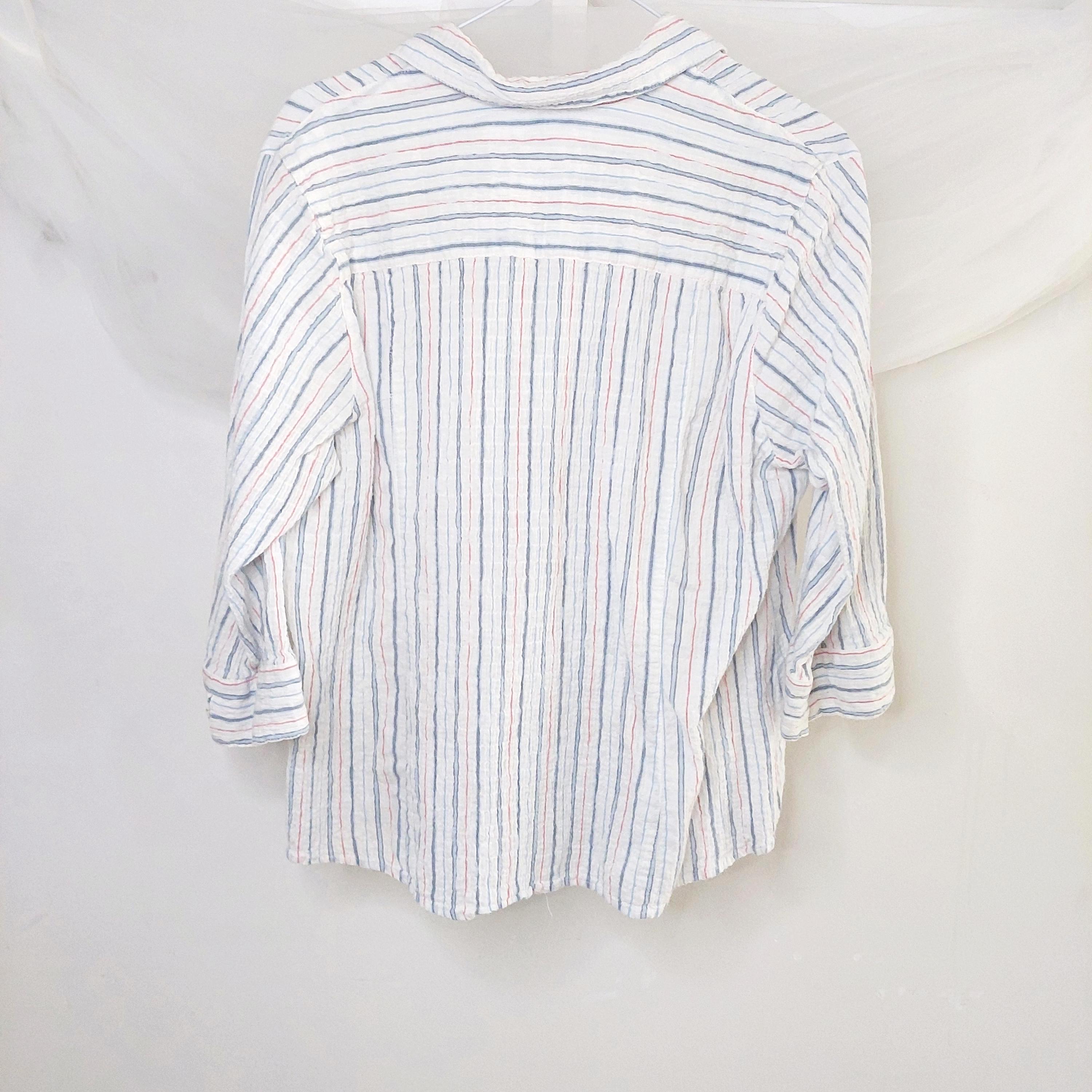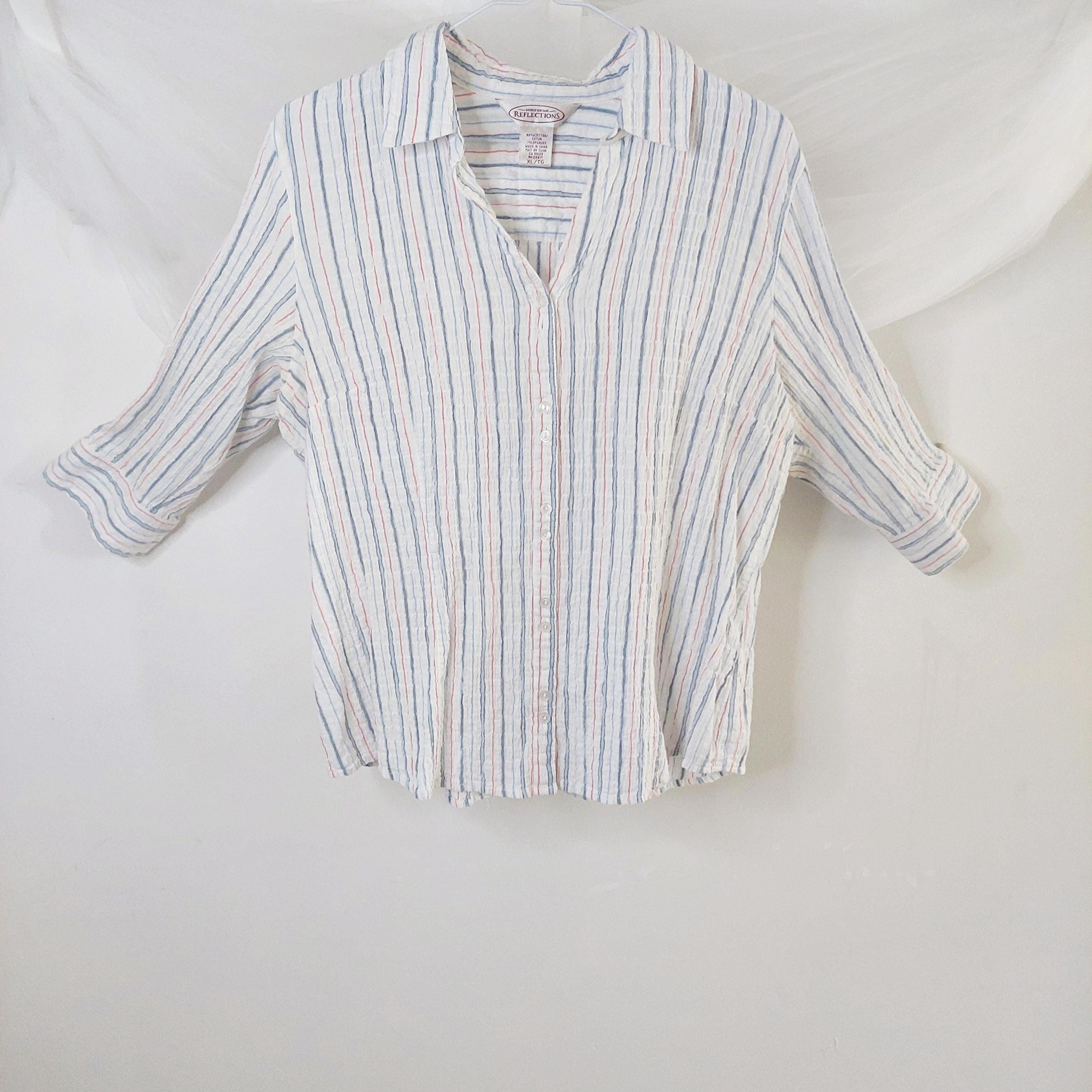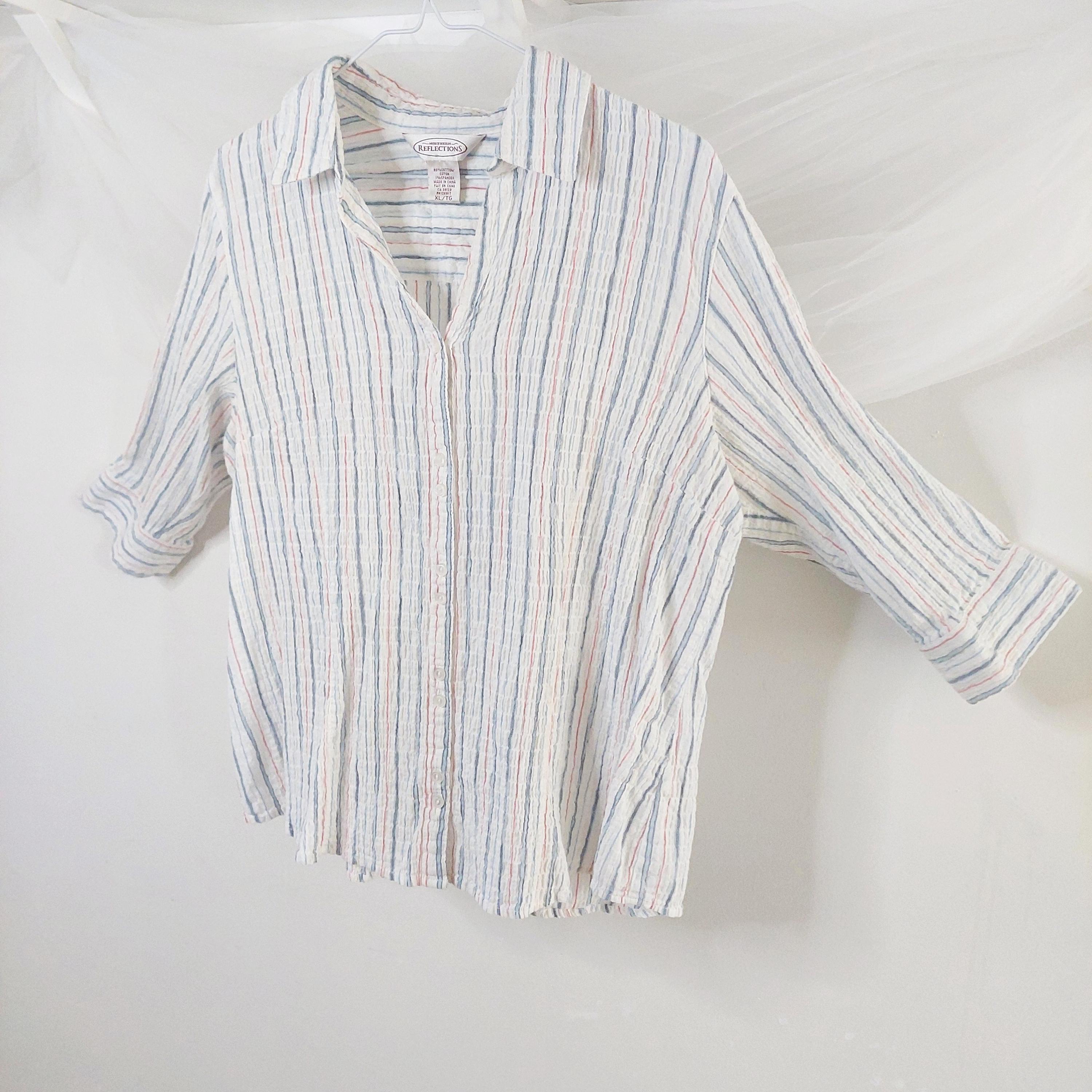 This is a Northern Reflections button-up blouse with vertical stripes in blue and pink. It features a classic split-neck collar and 3/4 length sleeves with cuffed details