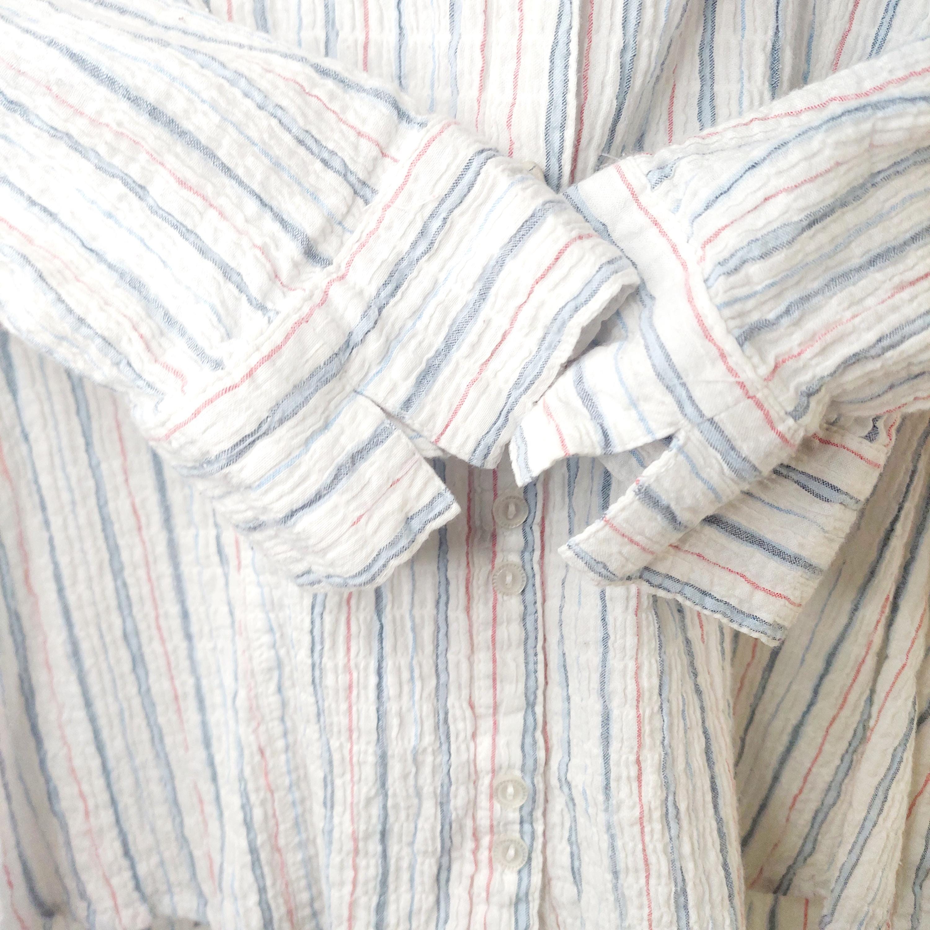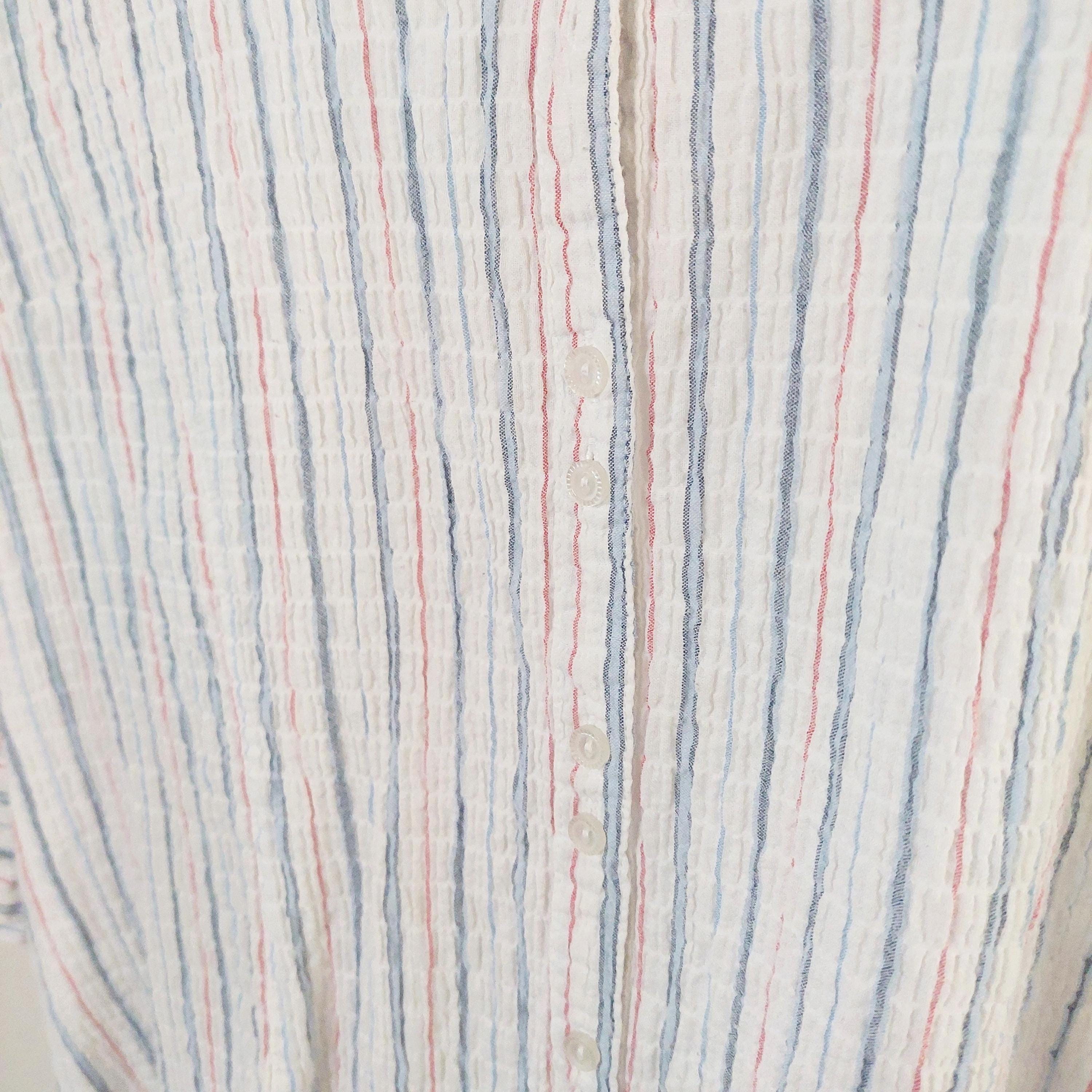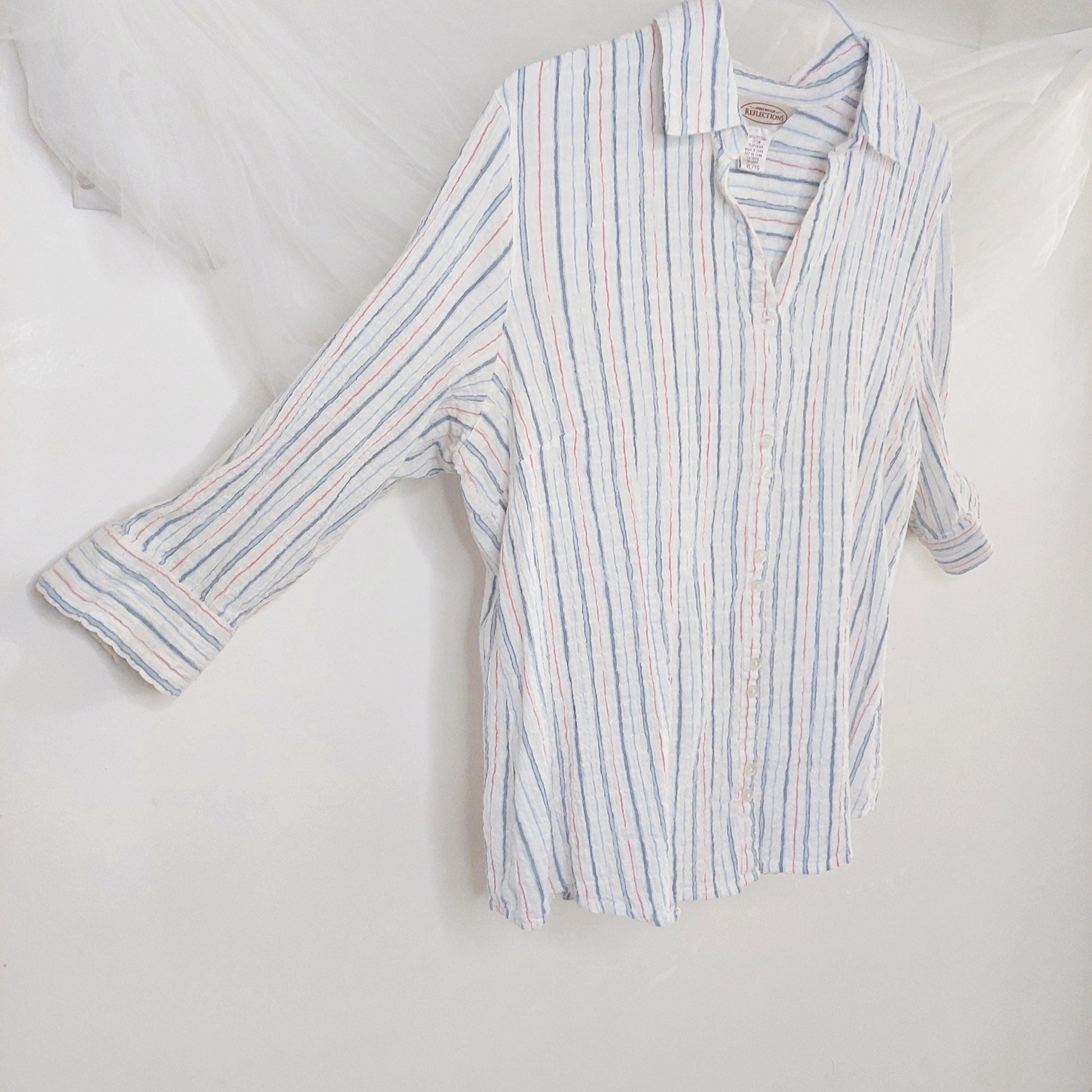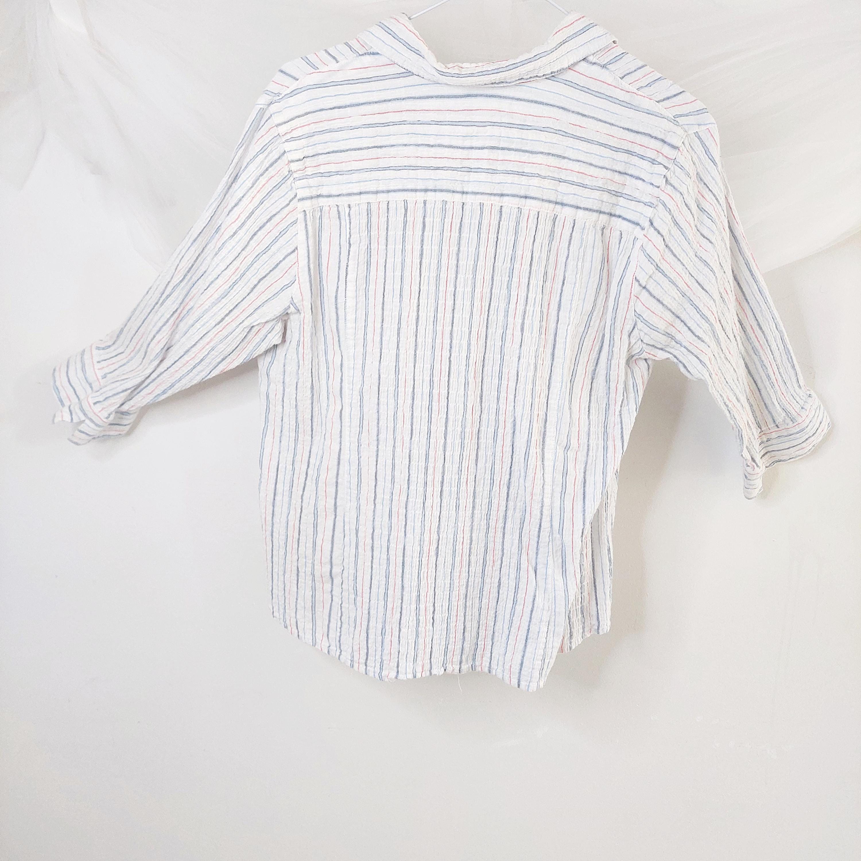 This is a Northern Reflections button-up blouse with vertical stripes in blue and pink. It features a classic split-neck collar and 3/4 length sleeves with cuffed details