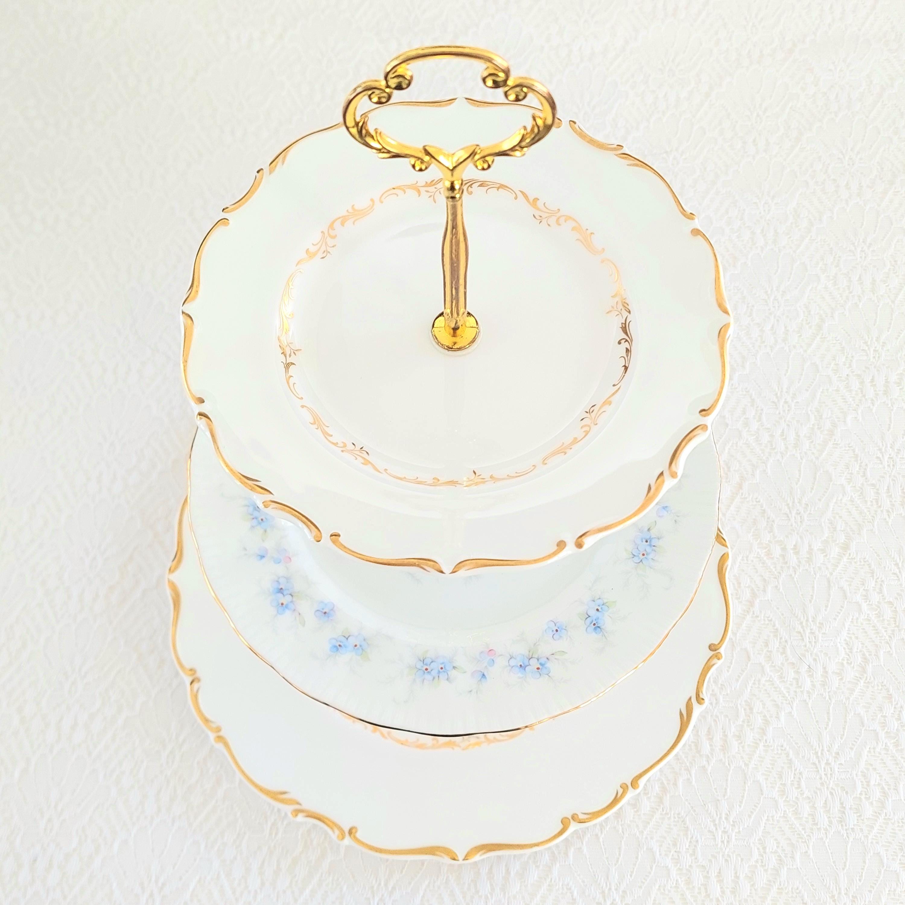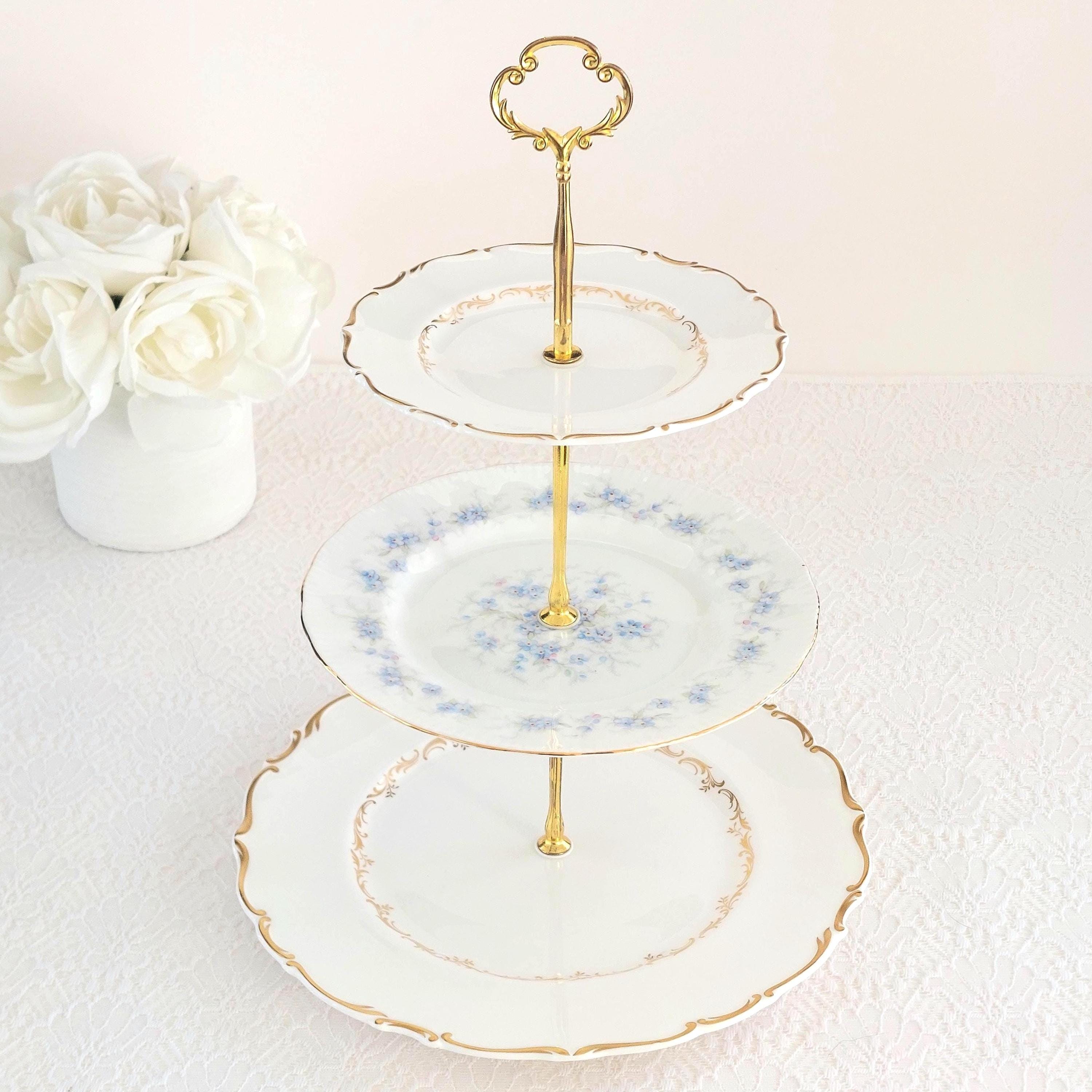 Three tier cake stand, made by me, using Royal Doulton Richelieu and Paragon Morning Petit Fleurs side, salad and dinner plates with gold edge. Plates feature little blue flowers and soft gray and green foliage on crisp white English bone china.
