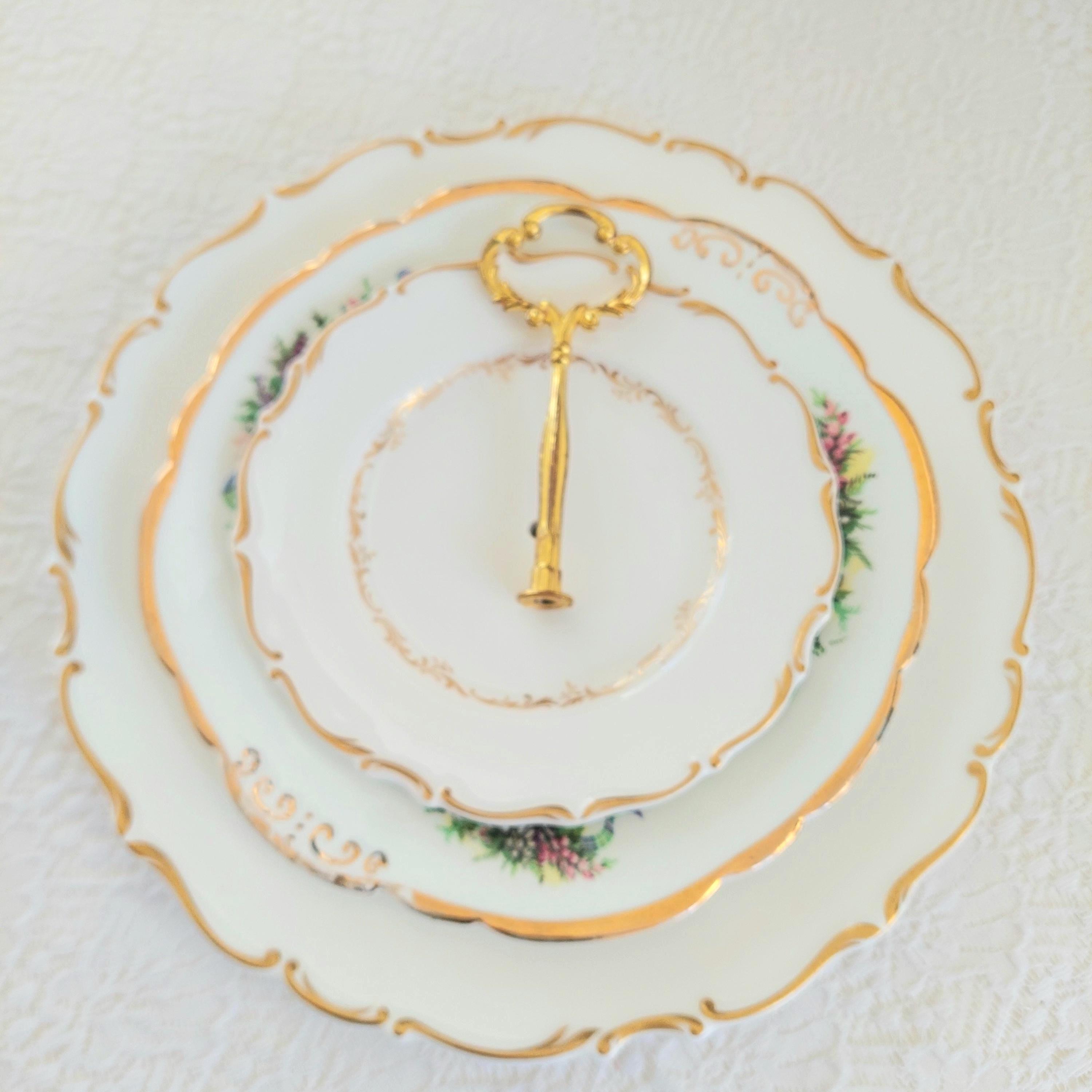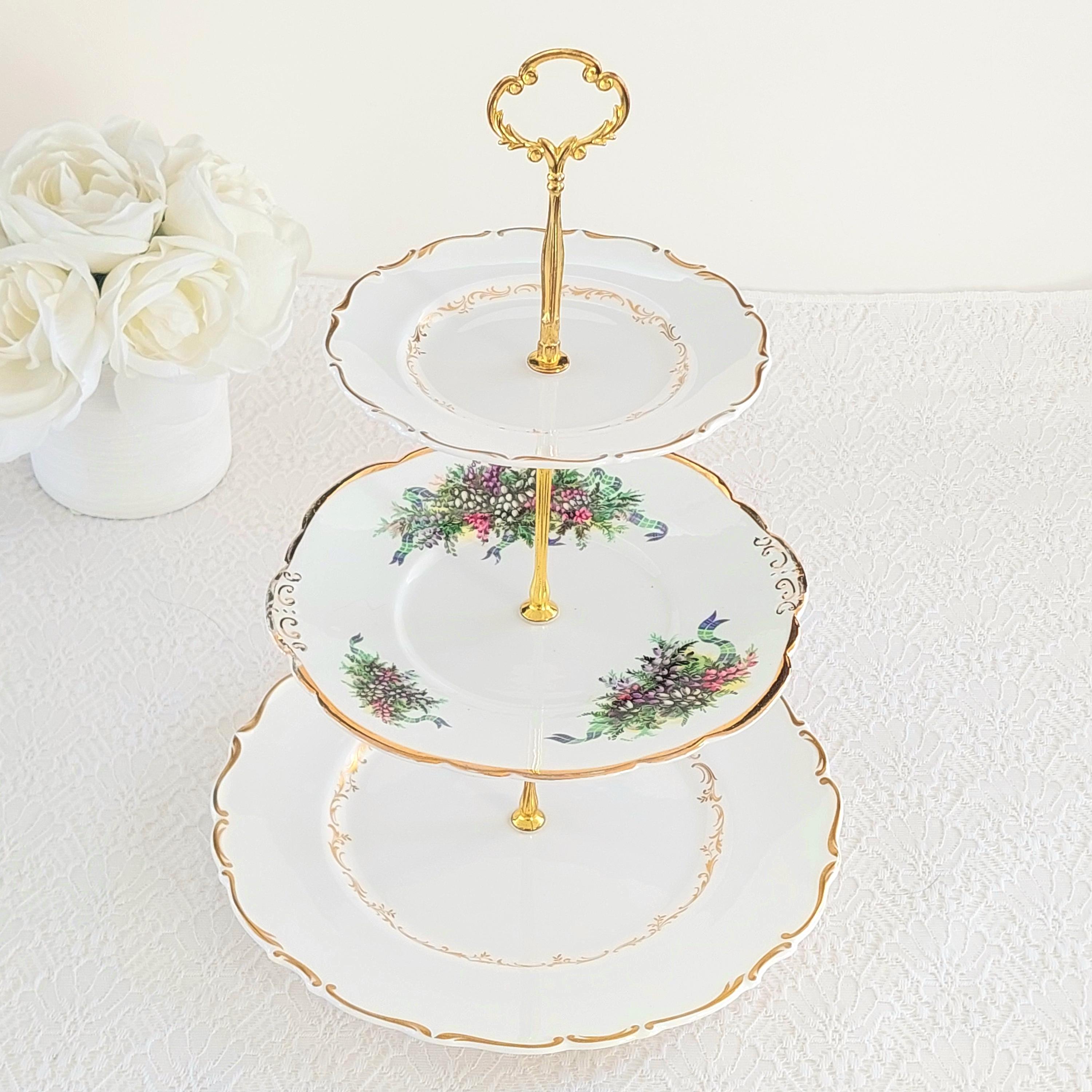 Three tier cake stand, made by me, using mismatched English bone china side, salad and dinner plates. Plates feature floral middle tier and crisp white English bone china with gold gilding.