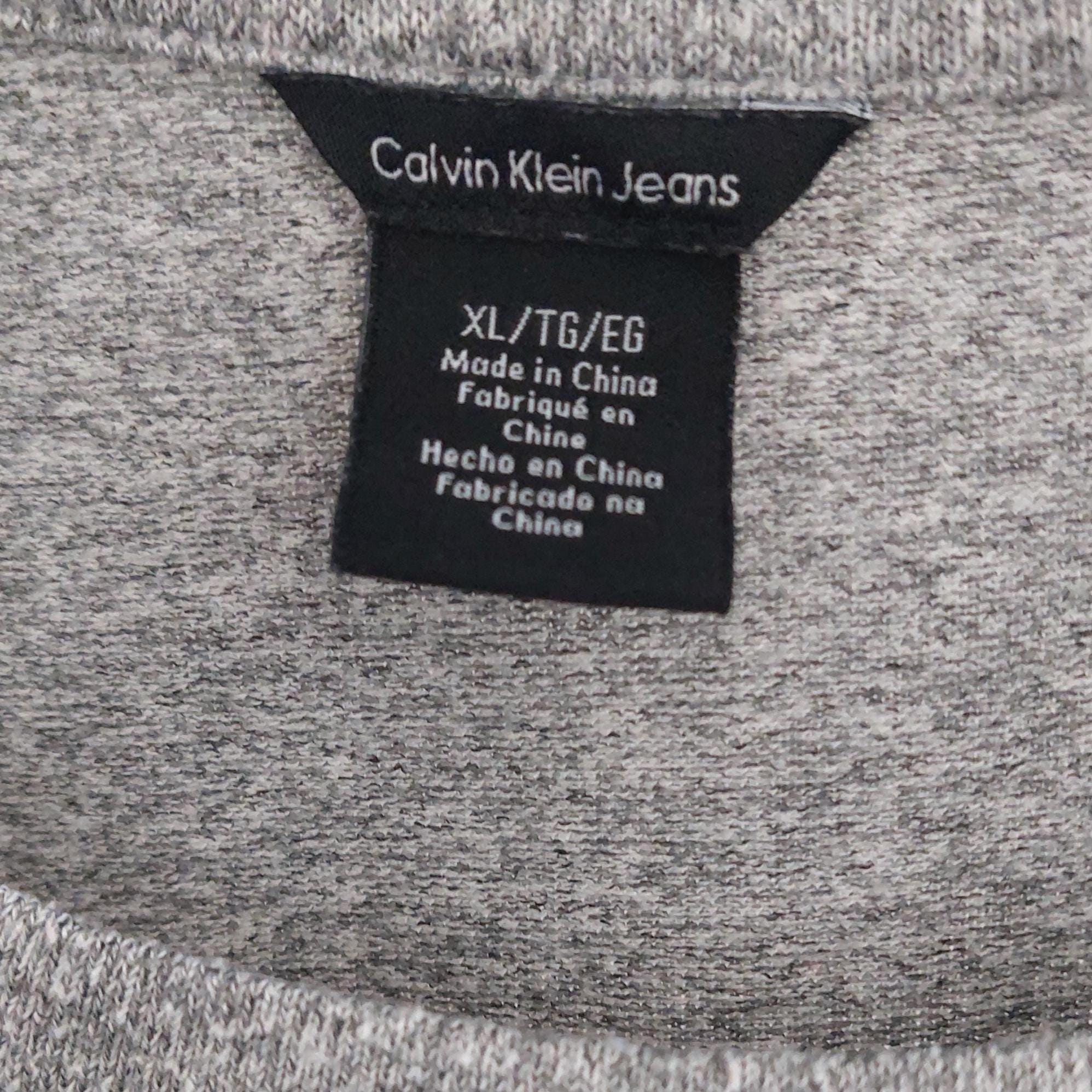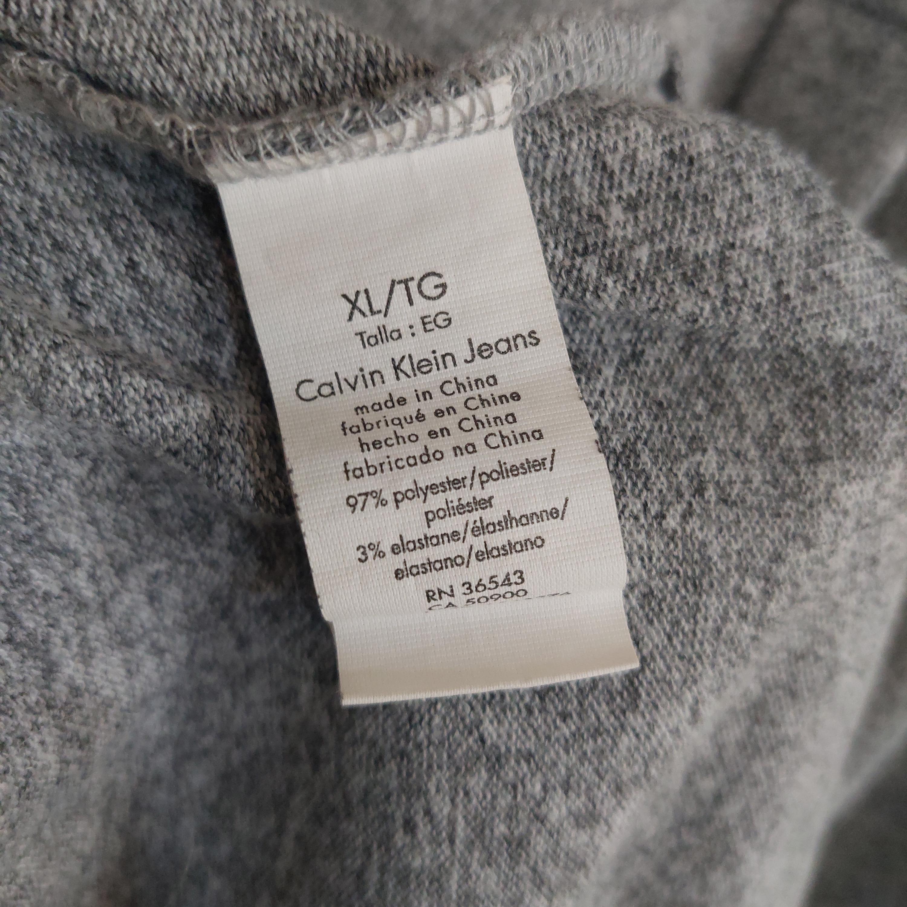 Tag: "Calvin Klein Jeans - XL - Made in China - 97% Polyester, 3% Elastane - Wash and Dry Inside Out - Wash Dark Colors Separately - Dry Promptly"