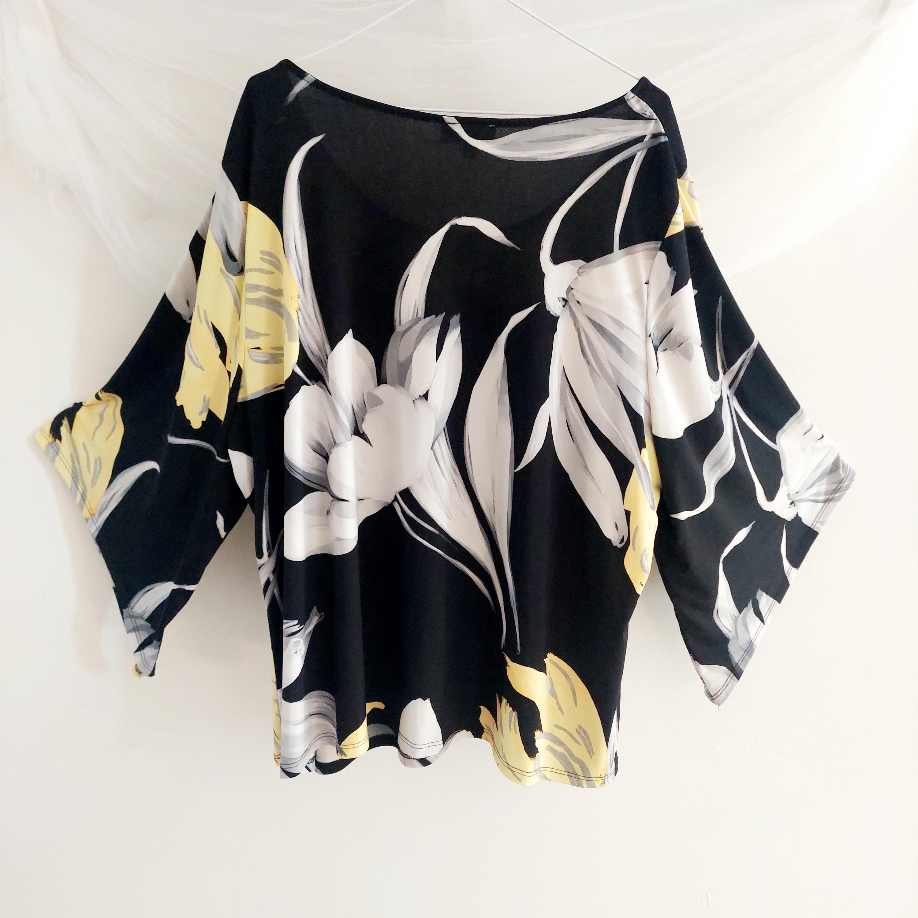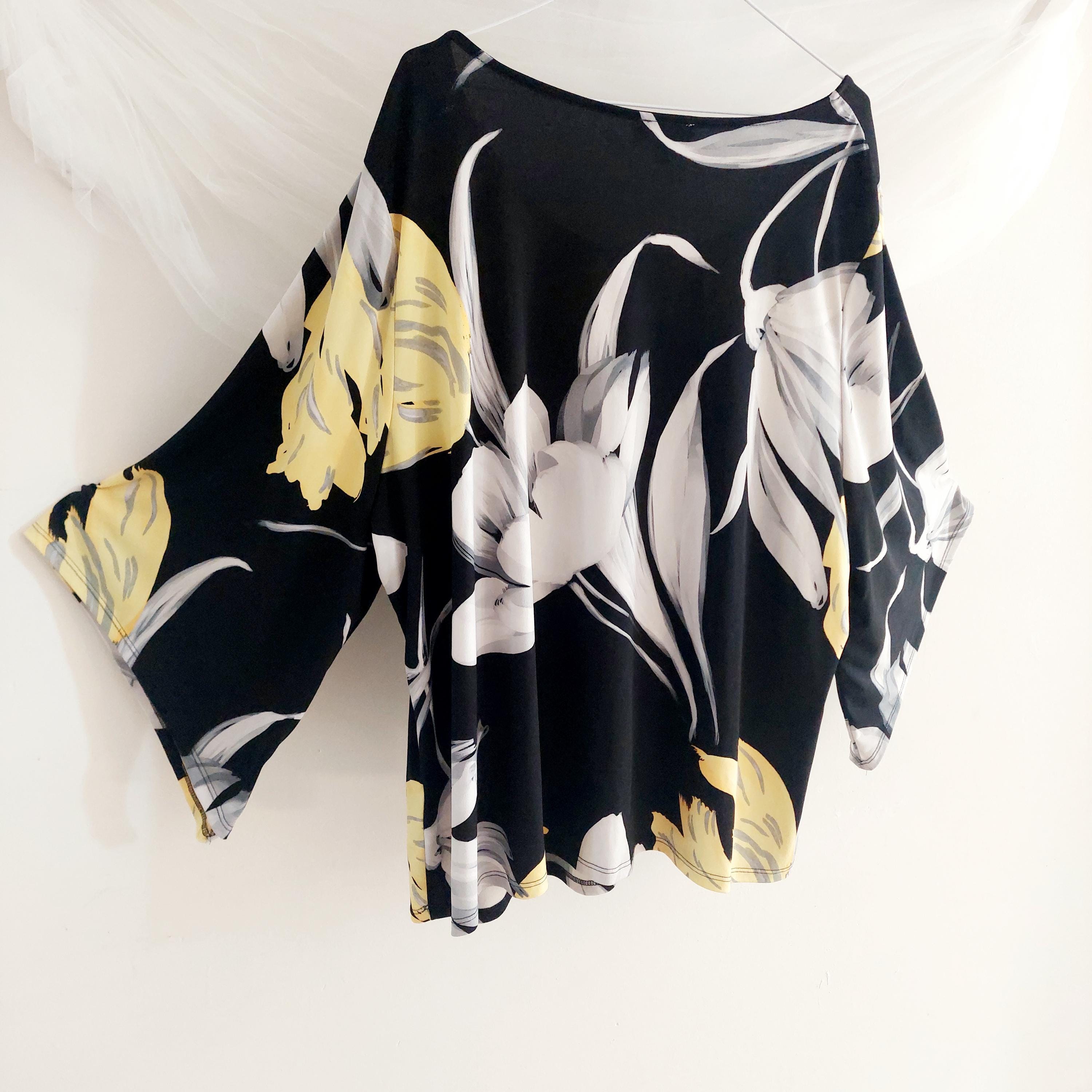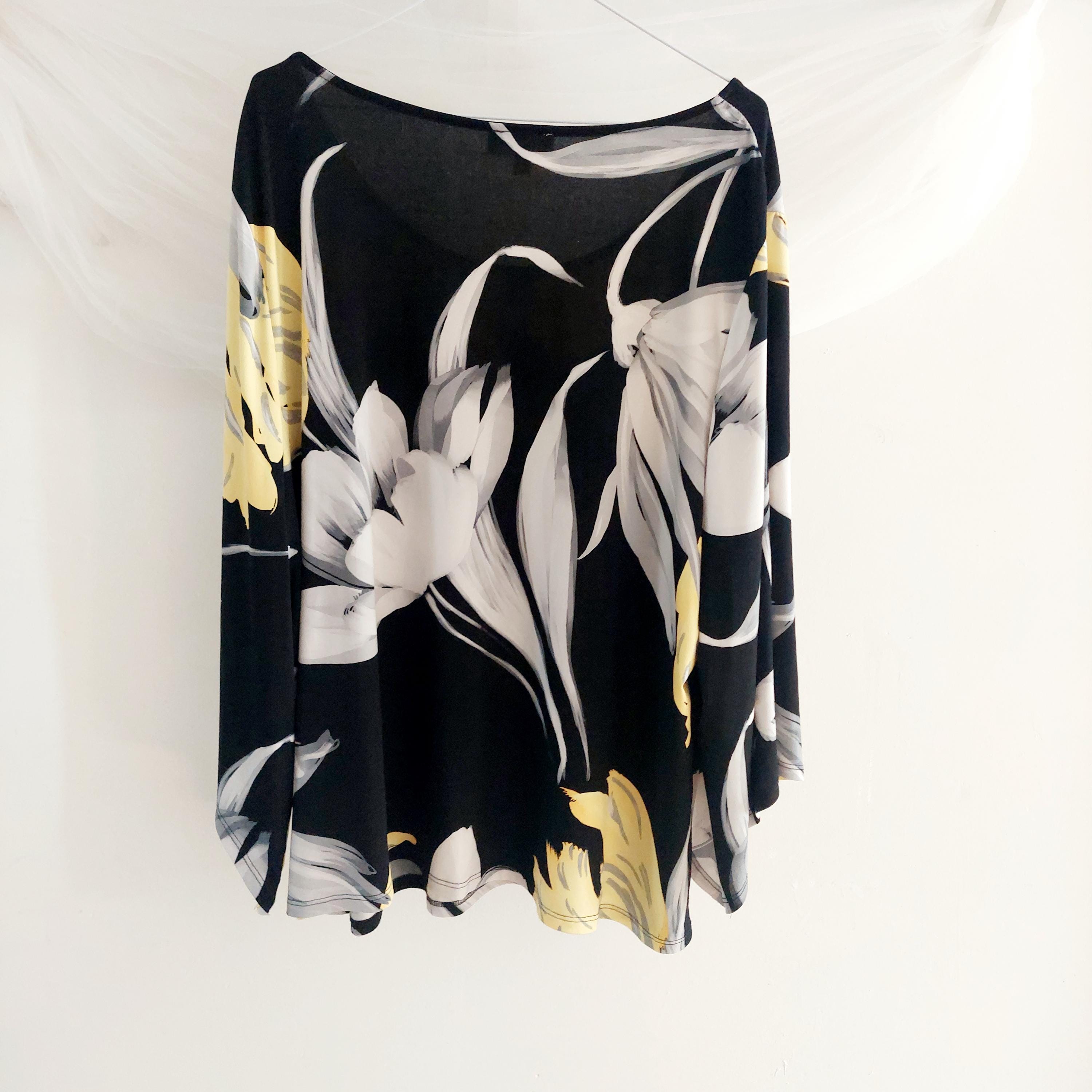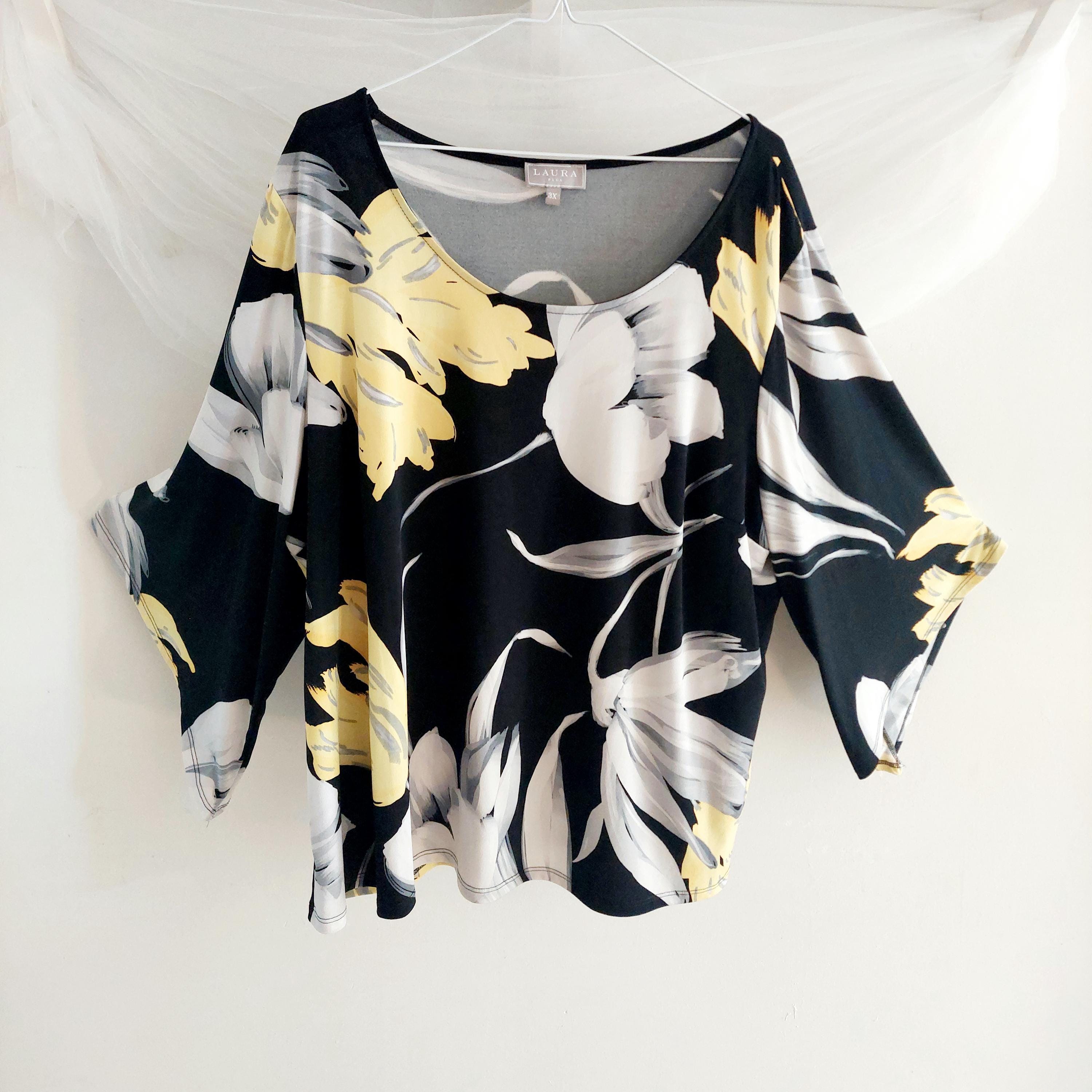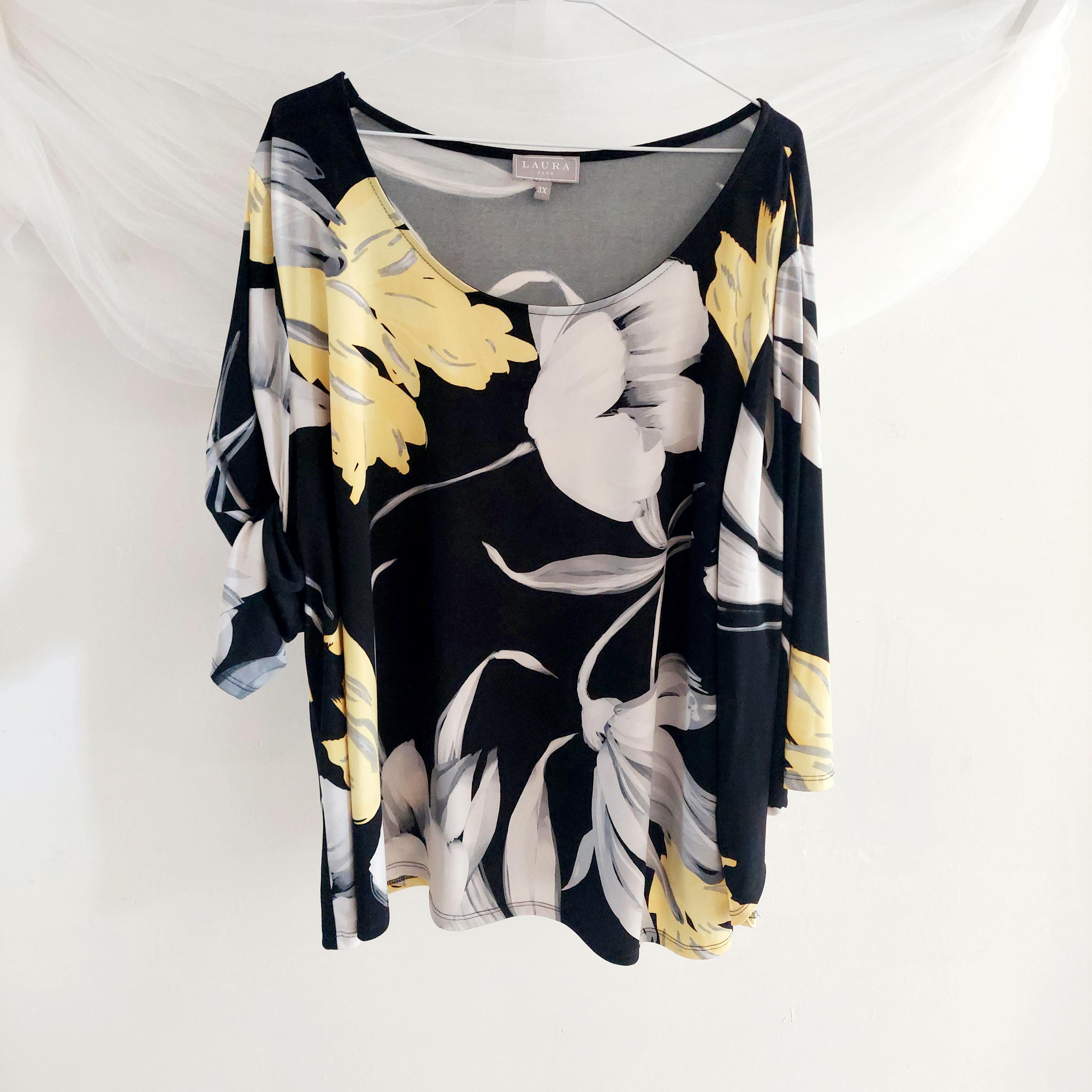 Make a bold statement with this elegant Laura Plus black floral blouse featuring vibrant yellow and white lilies.