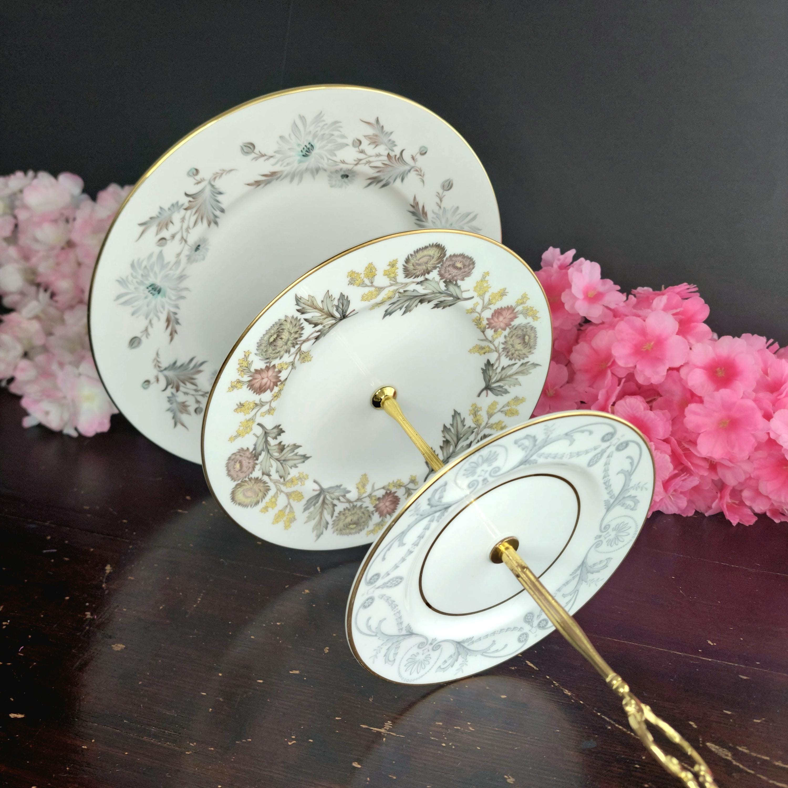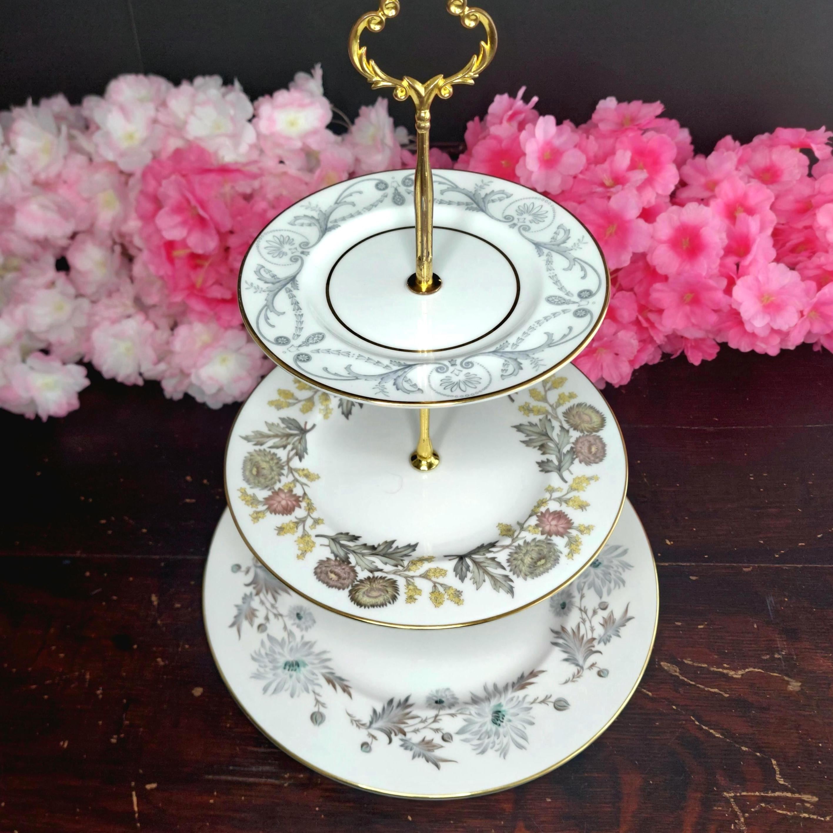 Each stand features genuine bone china plates made in England by renowned brands—Paragon (6" top), Wedgwood (8" middle), and Coalport (10.75" bottom)—selected for their charm and history. Sturdy new hardware in your choice of black, white, silver, or gold tone makes this serving piece both functional and customizable to your style.