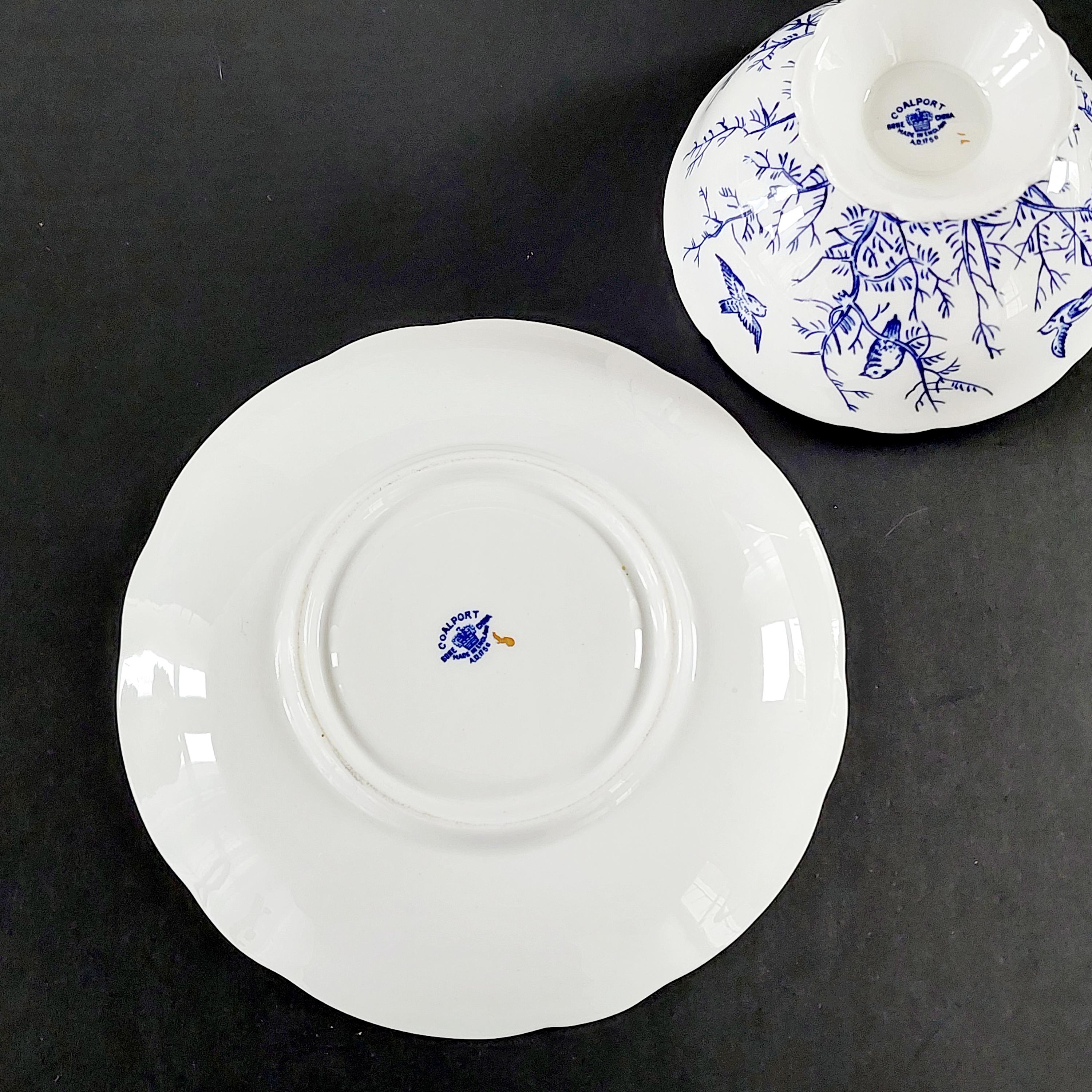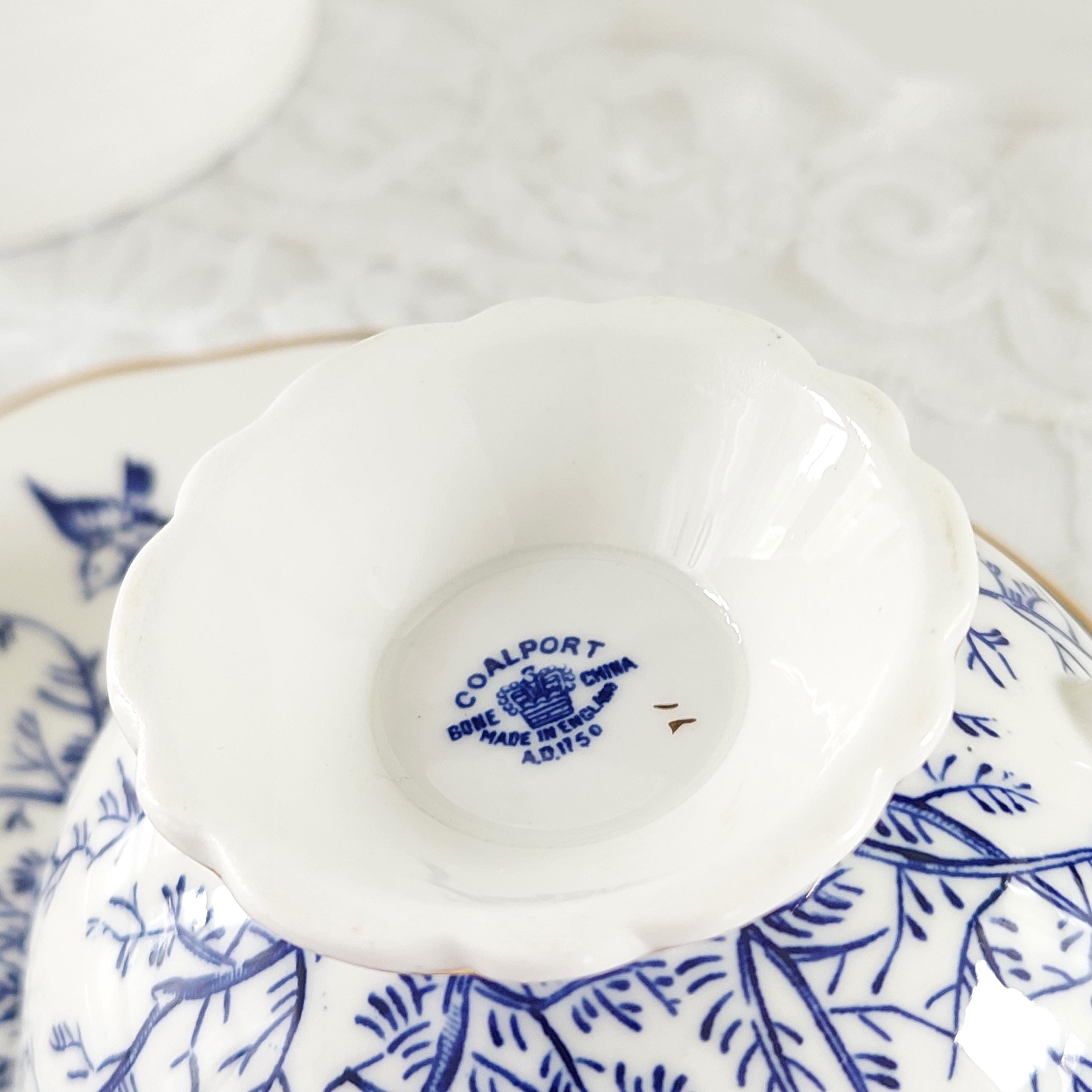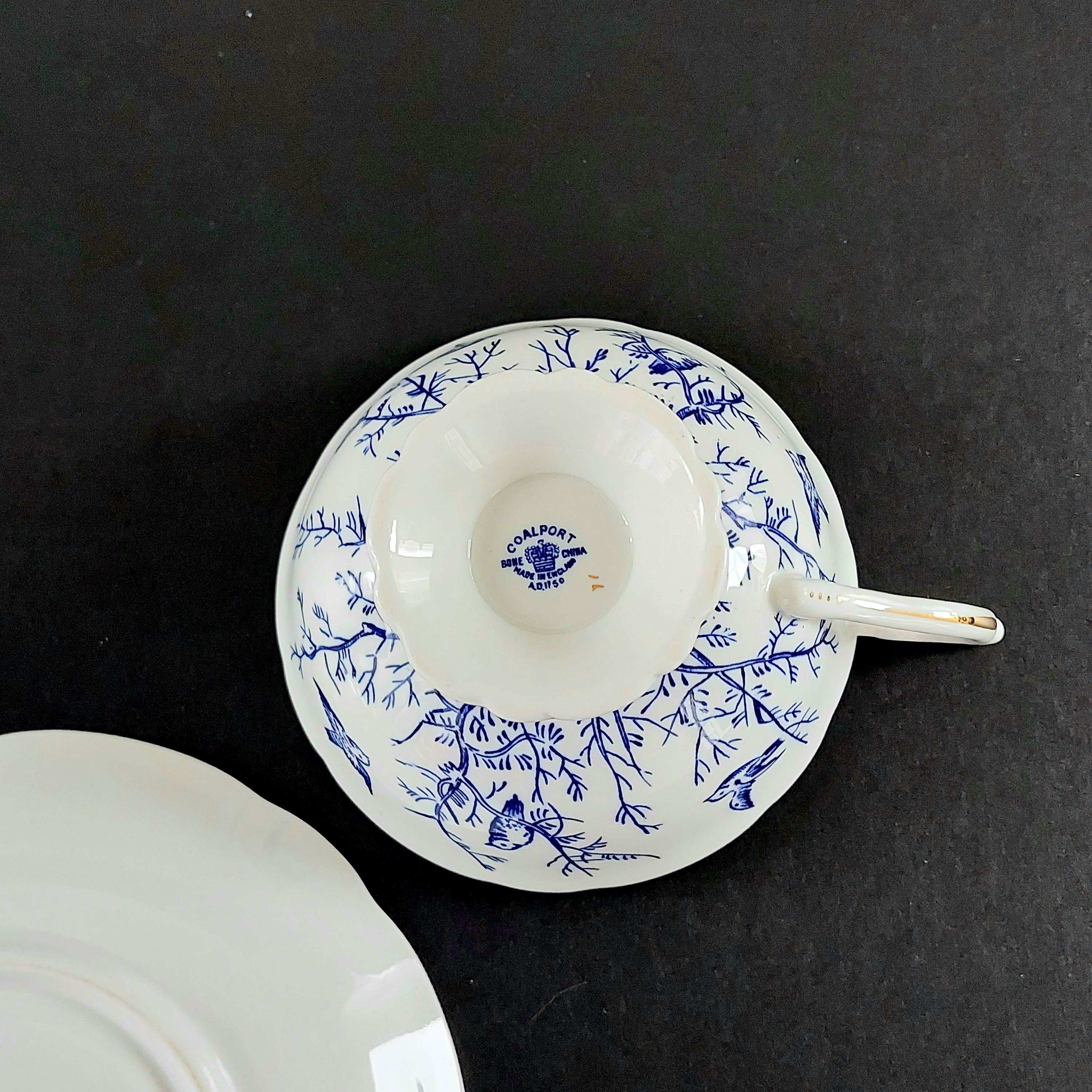 Add a touch of English elegance to your collection with this stunning Coalport fine bone china teacup and saucer set. This sought-after Pattern 8365 features a delicate cobalt blue transferware design of birds perched on branches, set against a crisp white scalloped body with hand-painted gold gilt trim.