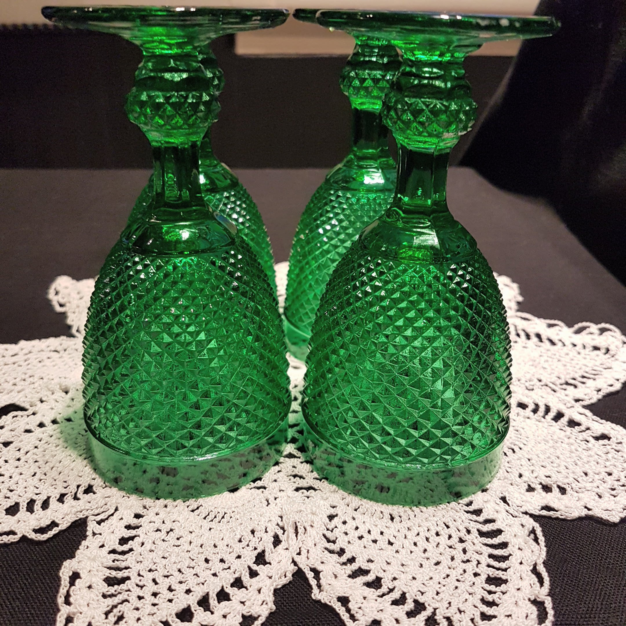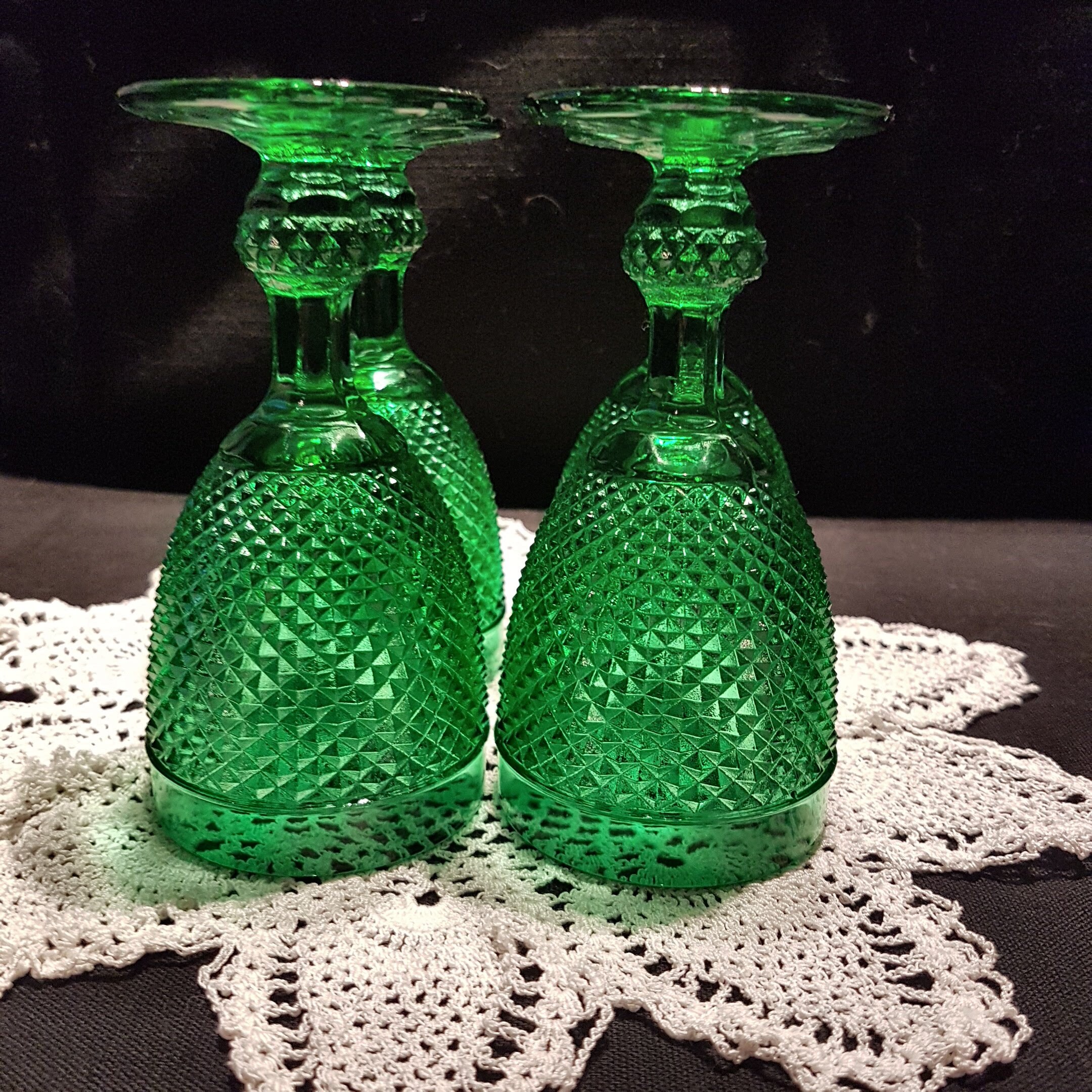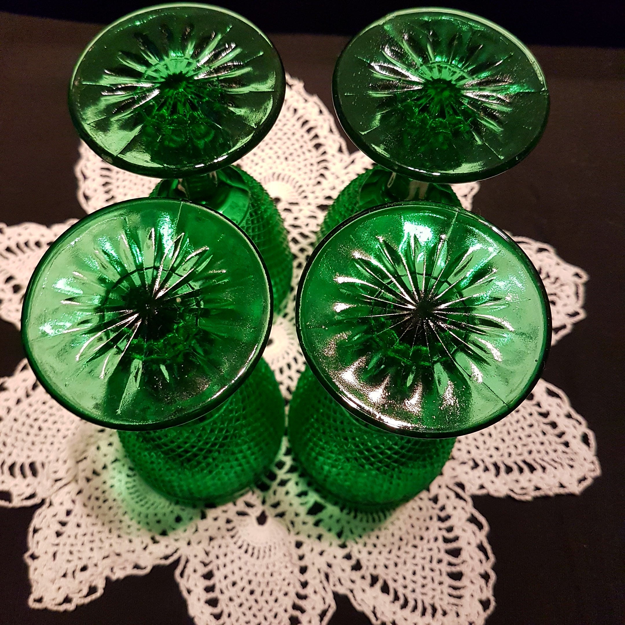 Stunning green set of 4 water glasses or wine glasses! Lovely diamond point on the cup and faceted sculpted ball stems and a star pattern on the foot. Circa 1930's