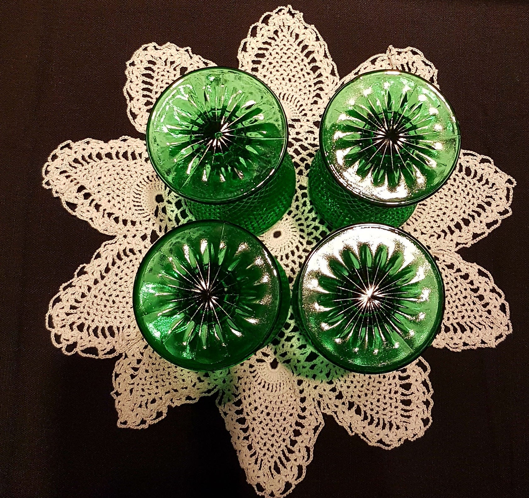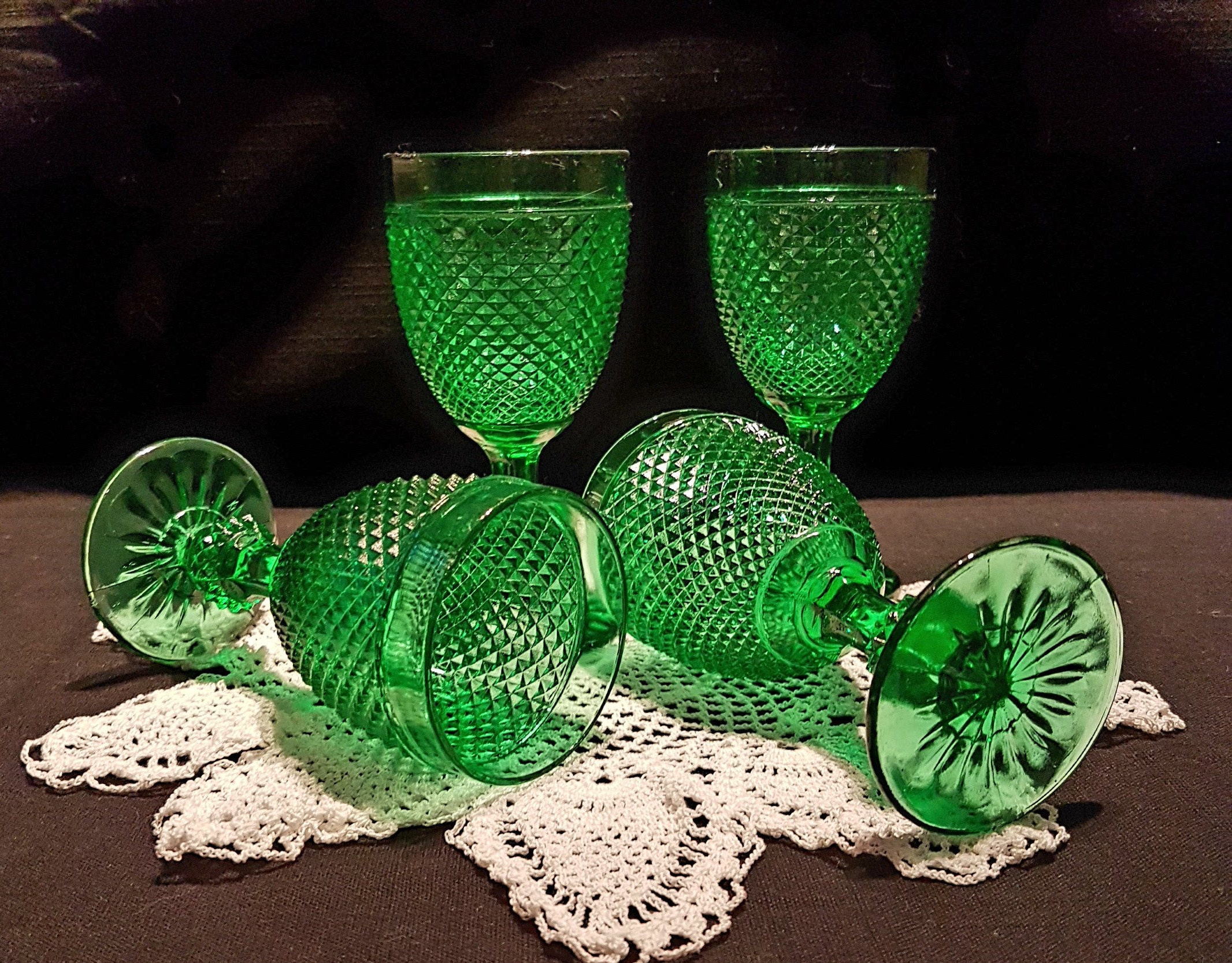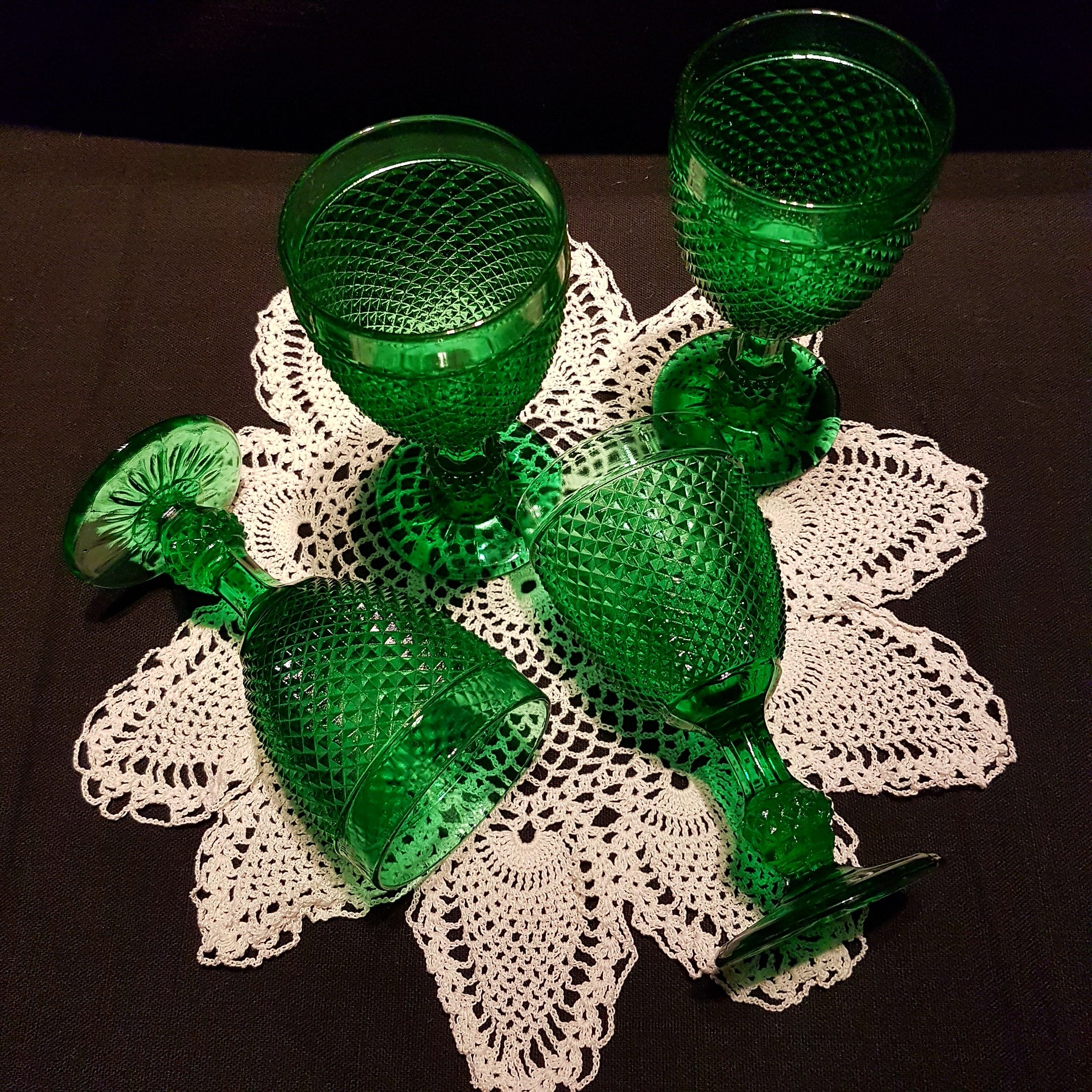 Stunning green set of 4 water glasses or wine glasses! Lovely diamond point on the cup and faceted sculpted ball stems and a star pattern on the foot. Circa 1930's