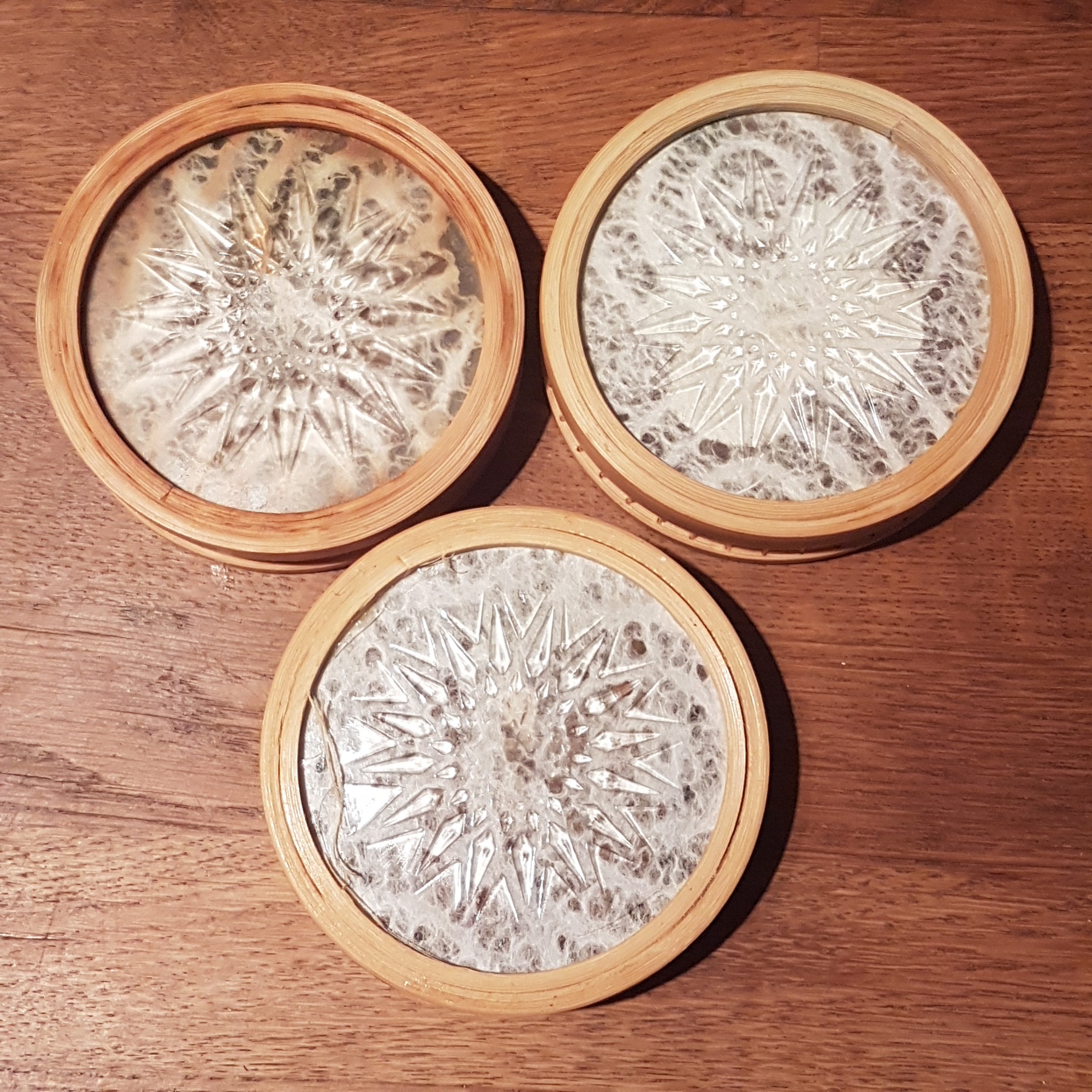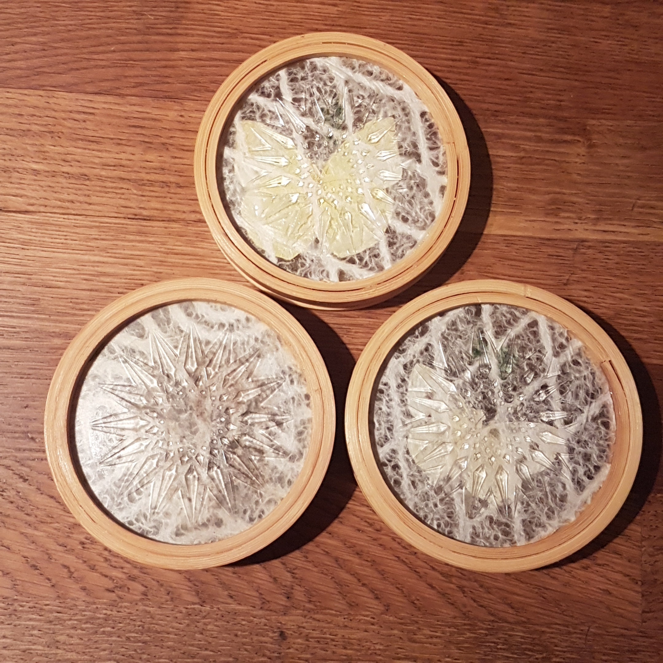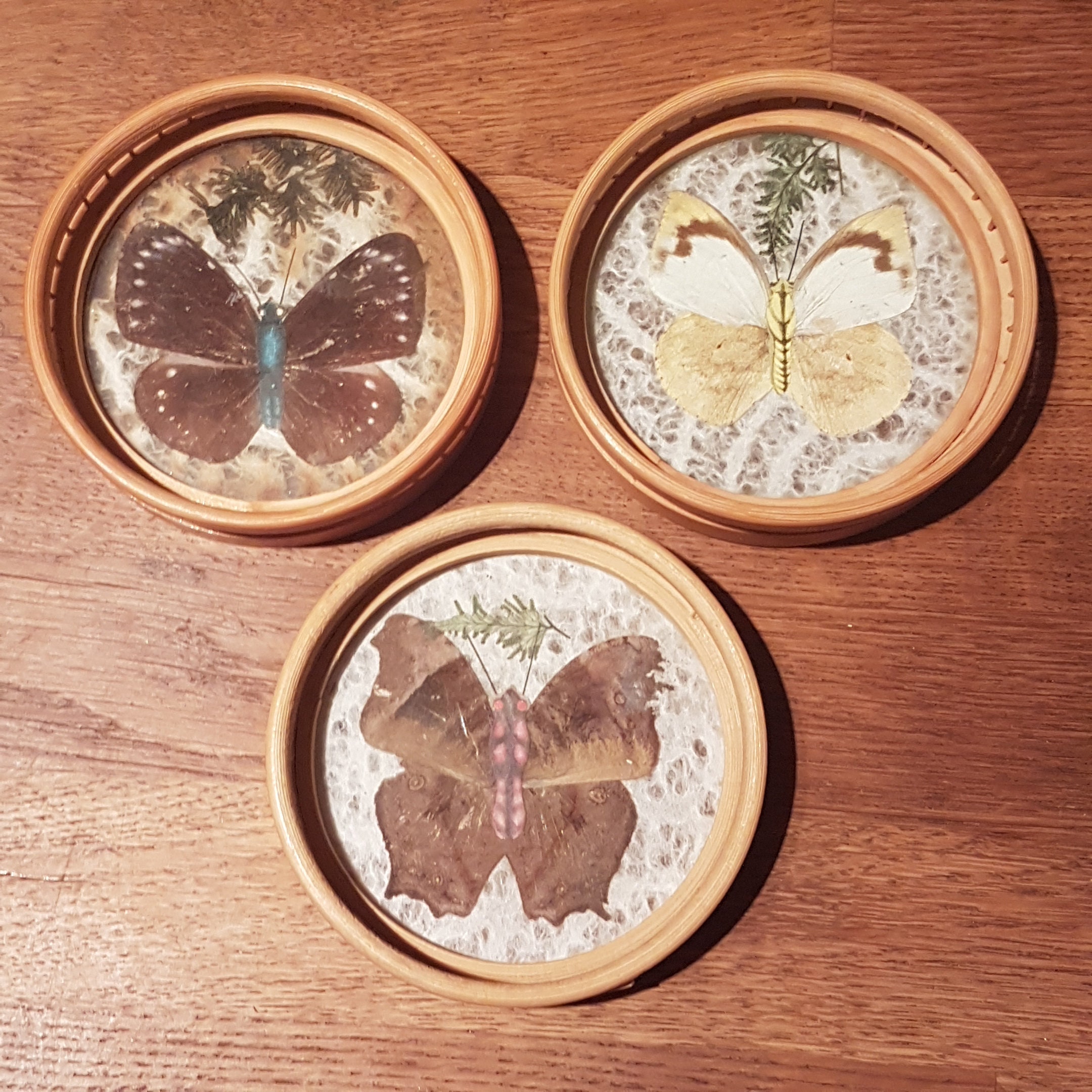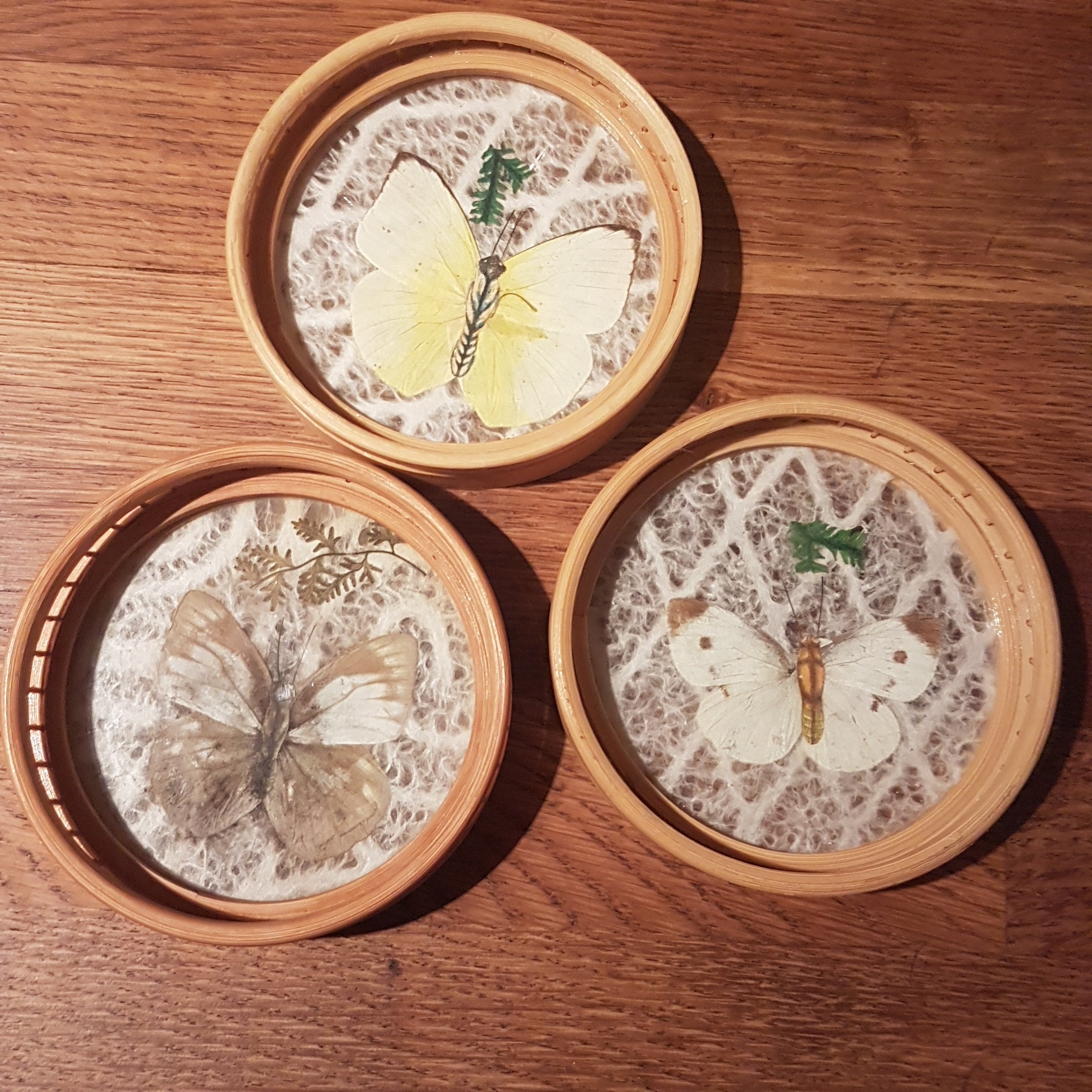 Beautiful round coasters with real butterflies and pressed greenery, protected by thick plastic; to provide years of pretty use!