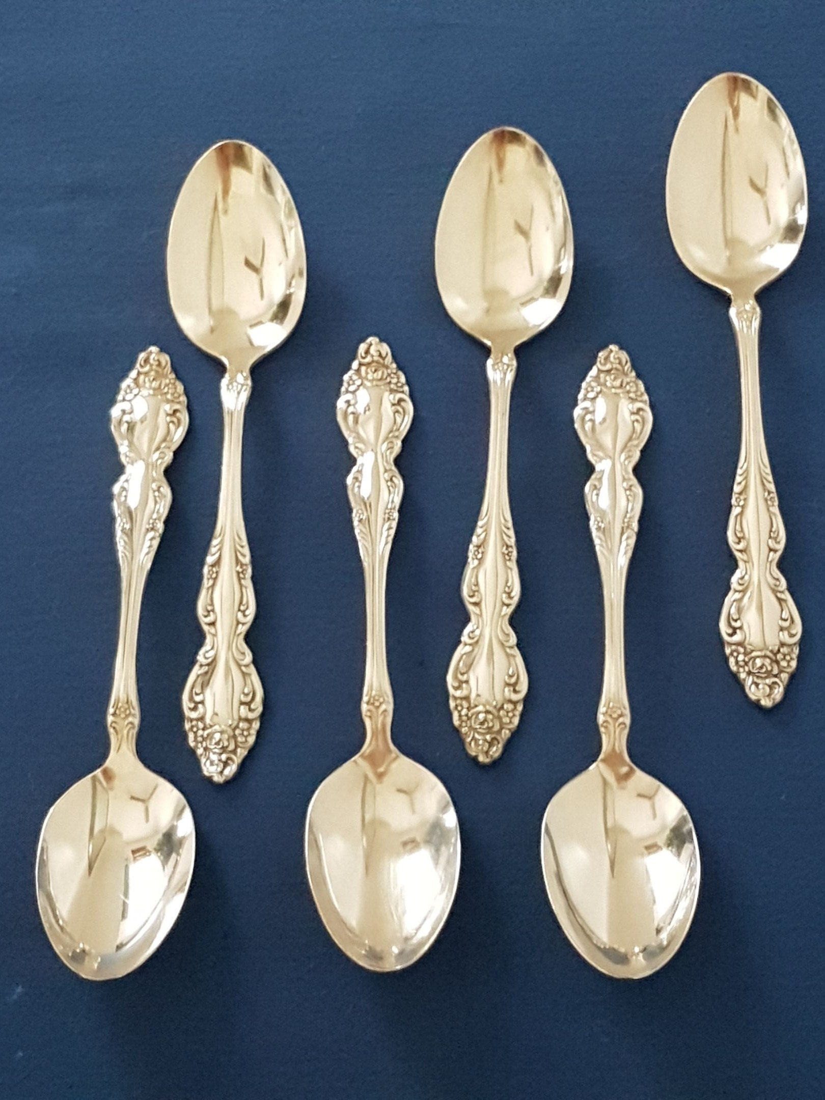 Set of 6 silverplate teaspoons in the romantic Art Deco Baroque Rose pattern, circa 1967, from 1881 Rogers/Oneida Silver.