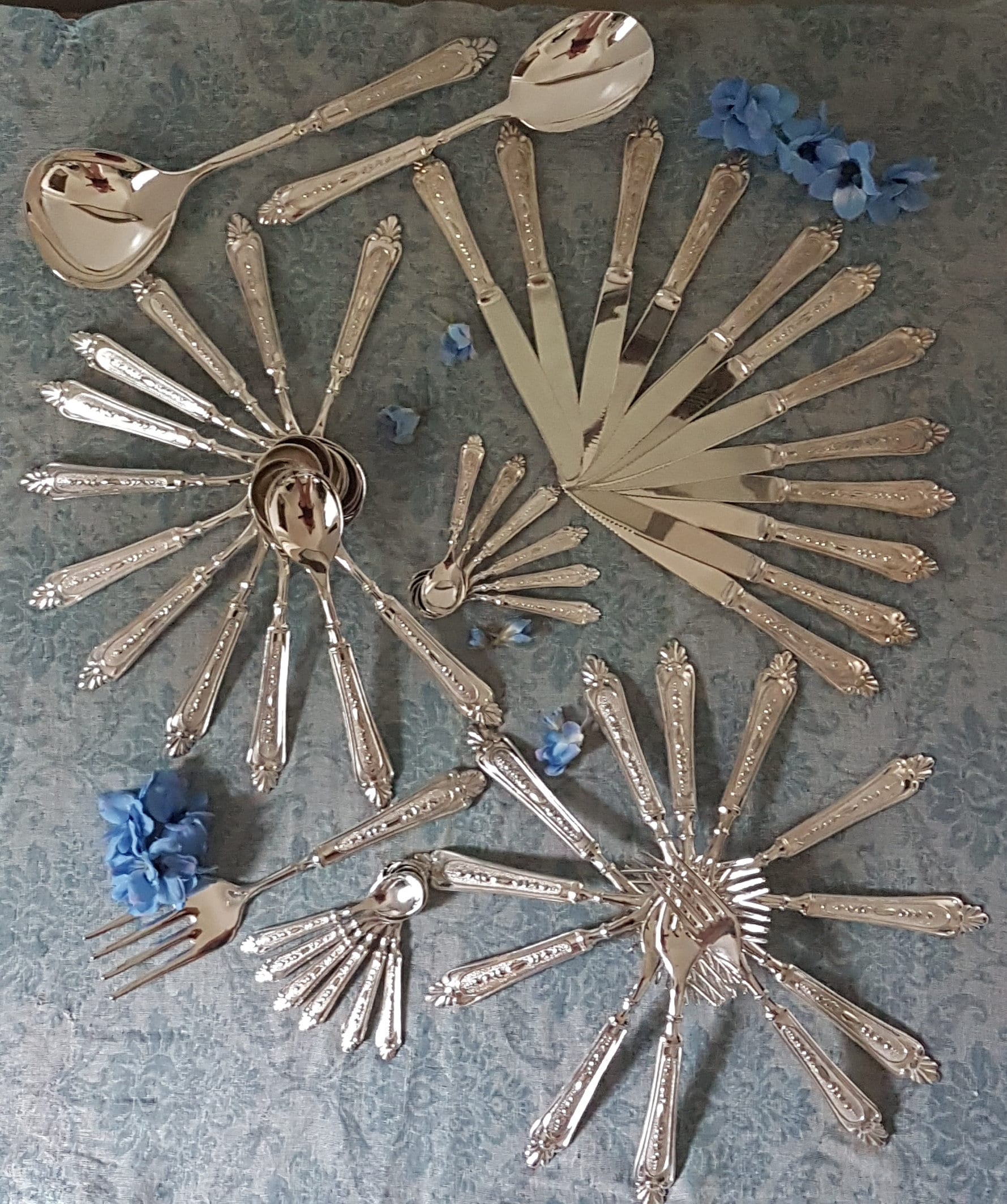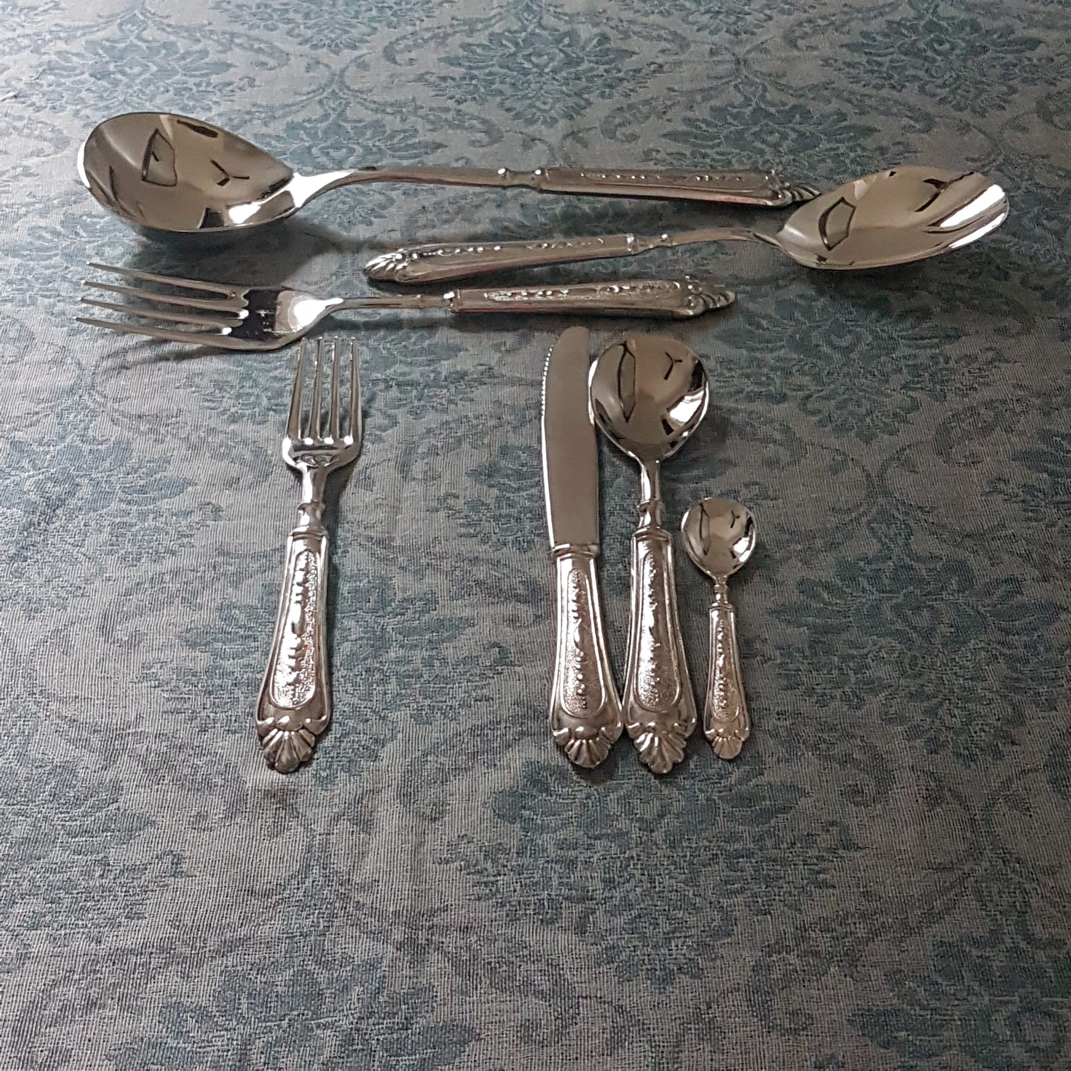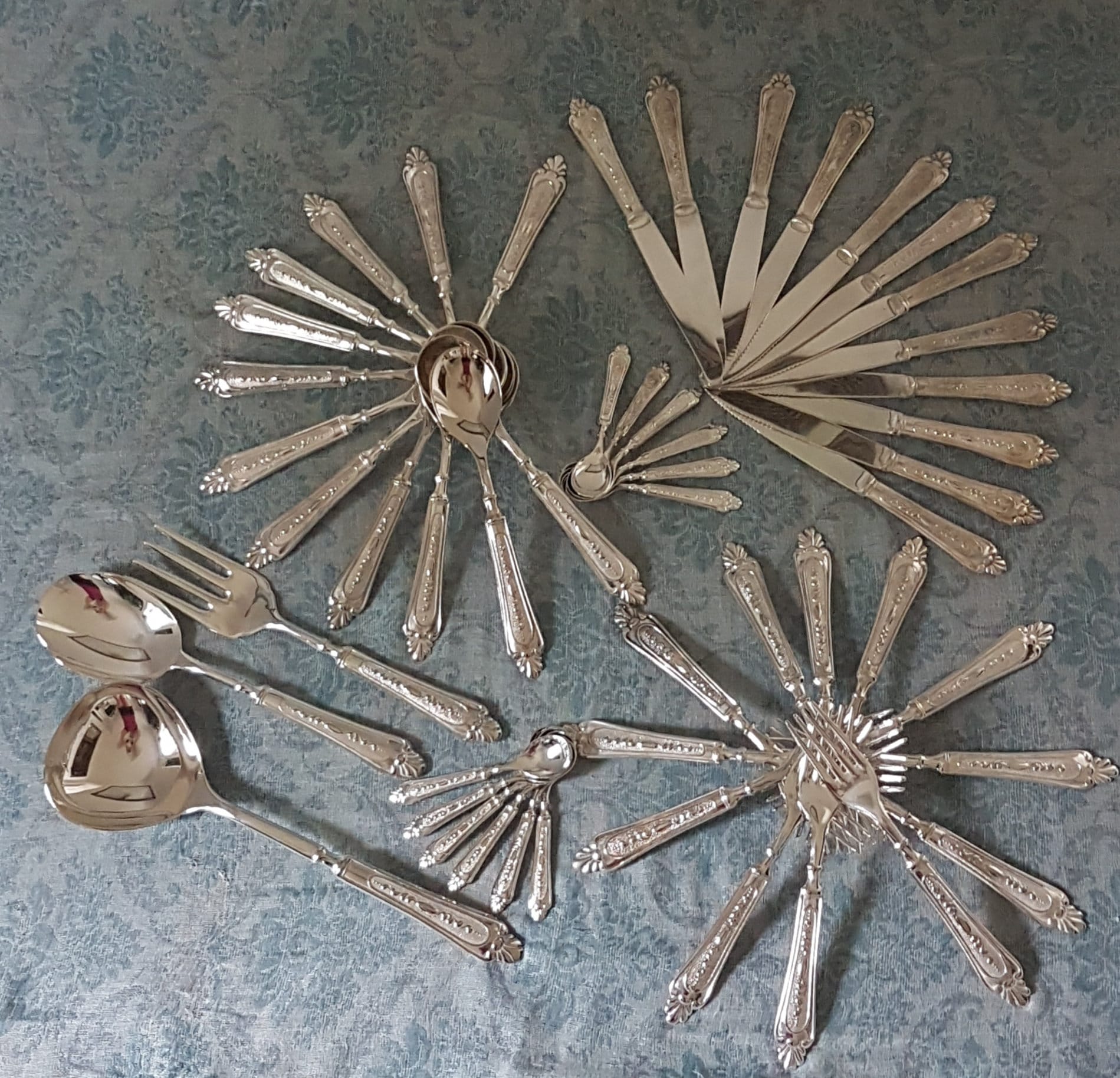 Set includes: 12 dinner forks, 12 dinner knives, 12 demitasse spoons or dessert spoons, 12 round soup spoons or pasta spoons, 1 meat fork, 1 serving spoon and 1 large serving spoon. 51 piece set! In the original box!