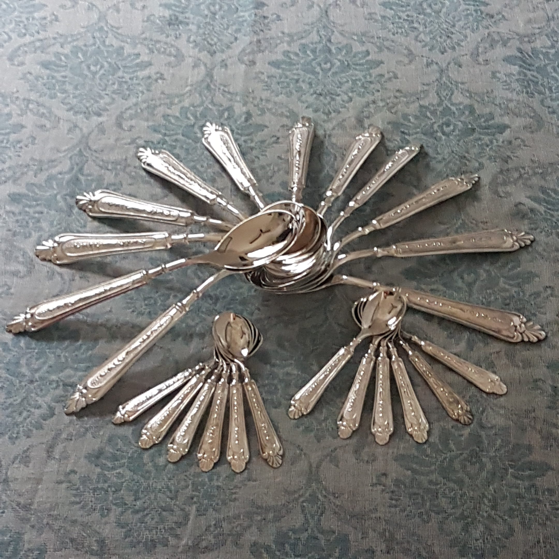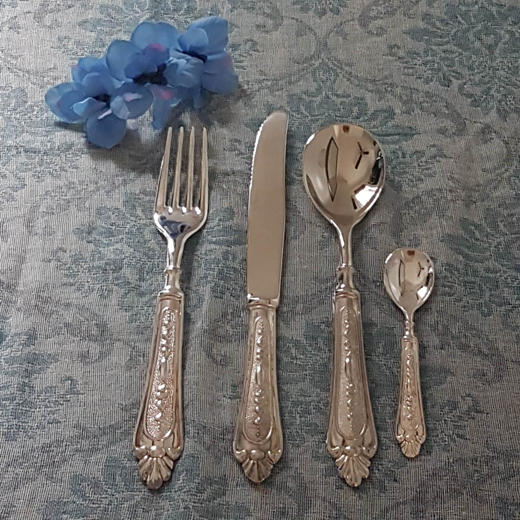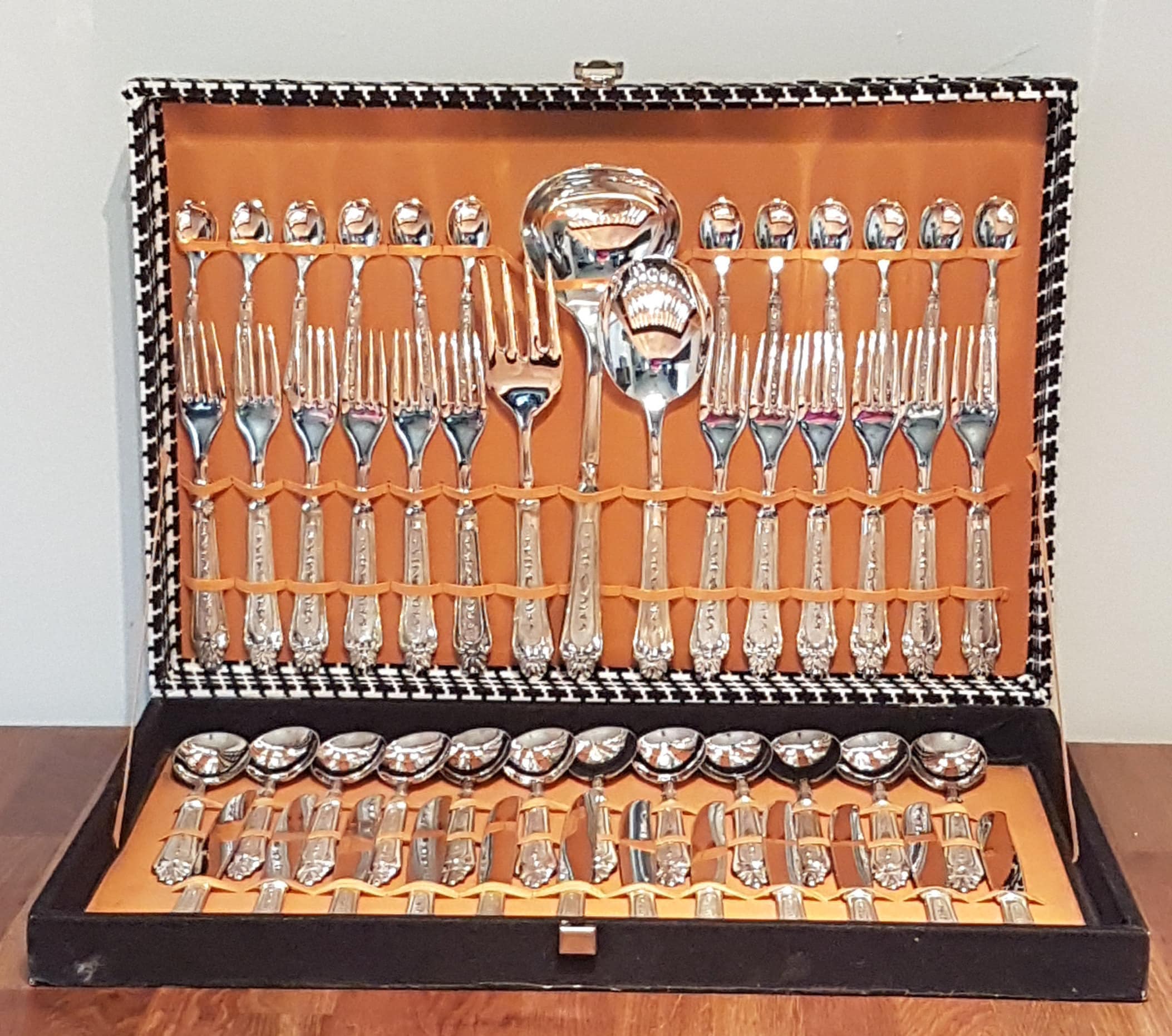 Set includes: 12 dinner forks, 12 dinner knives, 12 demitasse spoons or dessert spoons, 12 round soup spoons or pasta spoons, 1 meat fork, 1 serving spoon and 1 large serving spoon. 51 piece set! In the original box!