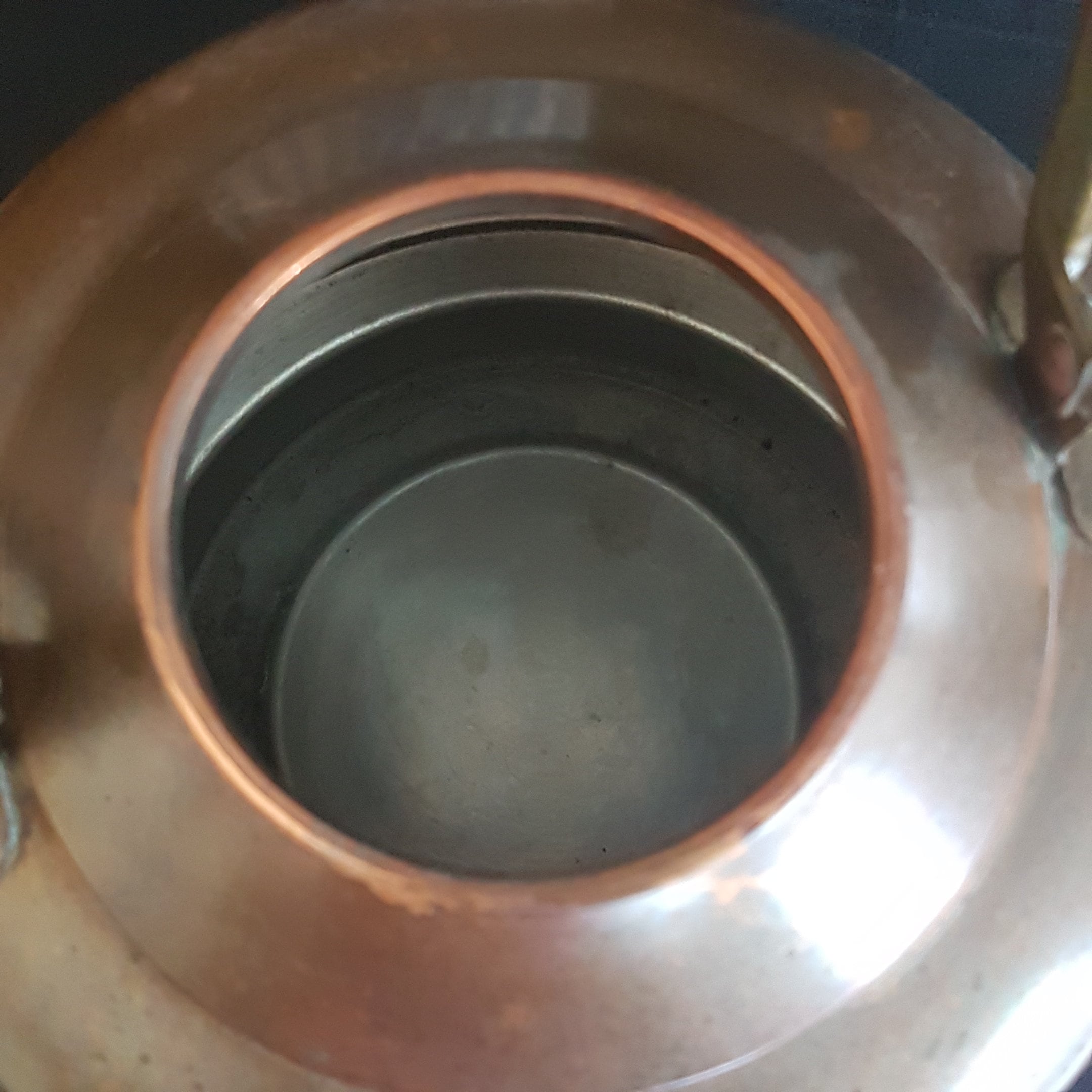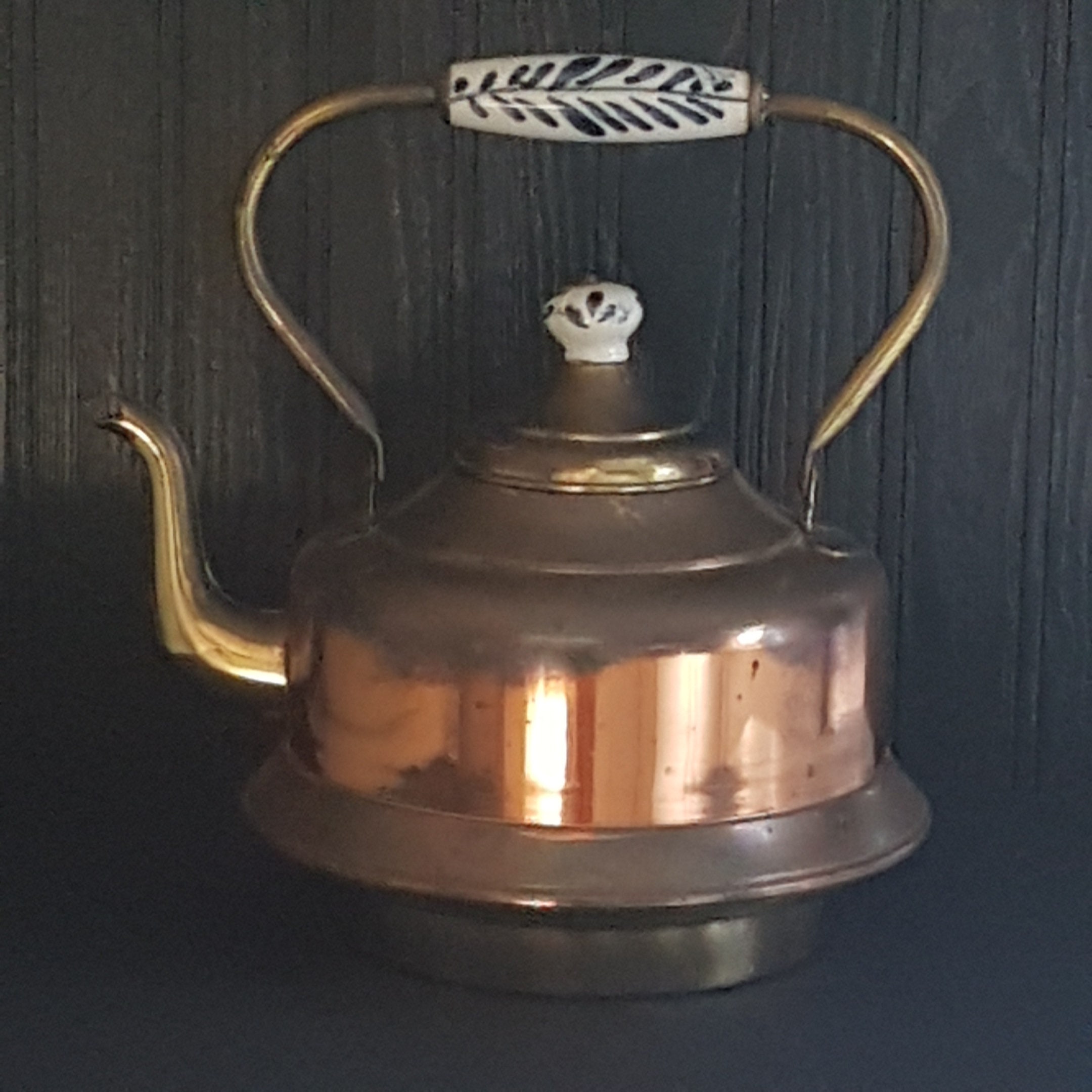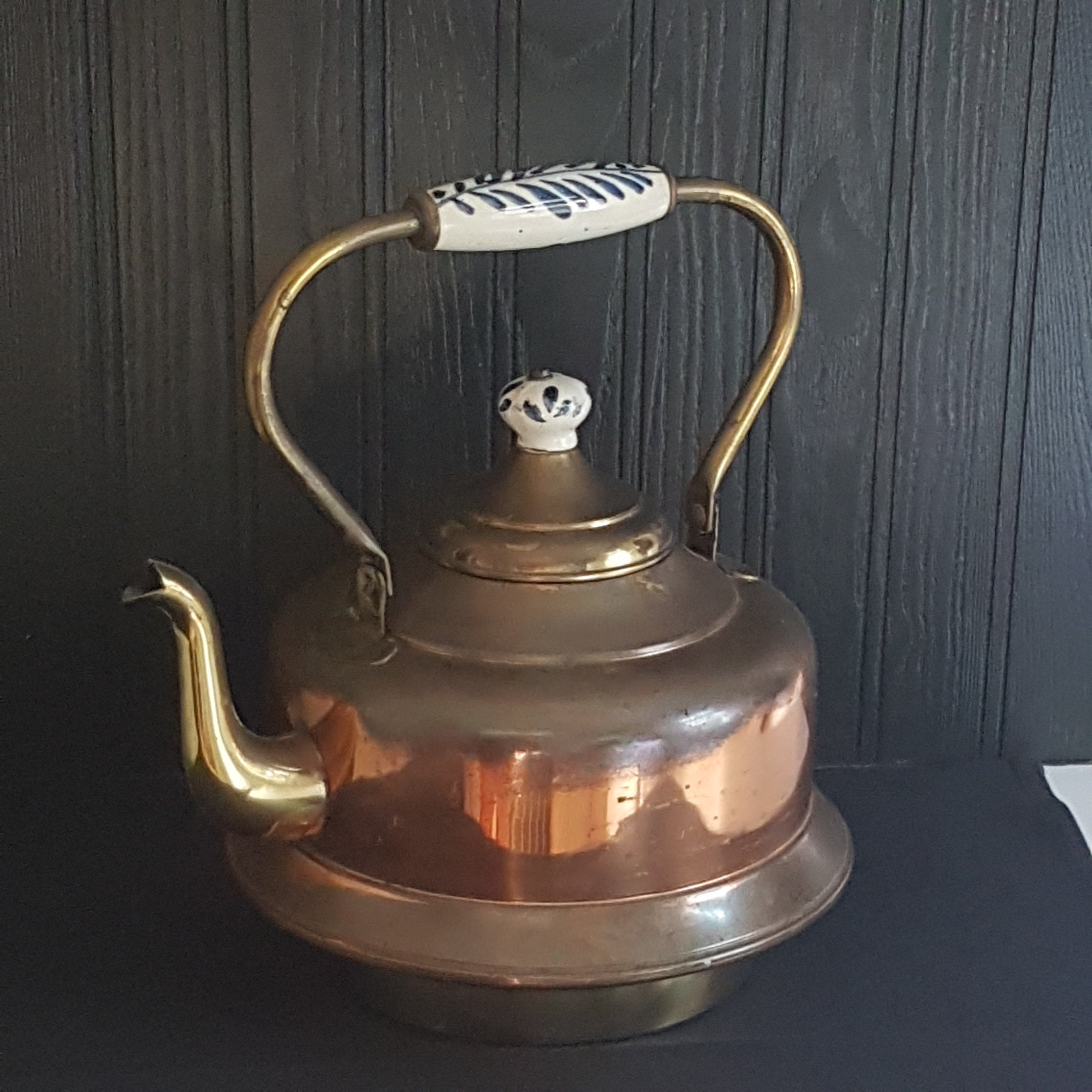 14 cup Copper & brass tea kettle with blue & white porcelain handle and knob. This tea kettle would be fabulous as kitchen decor in a country chic kitchen or farmhouse kitchen. It's large size would also make it the perfect planter size!