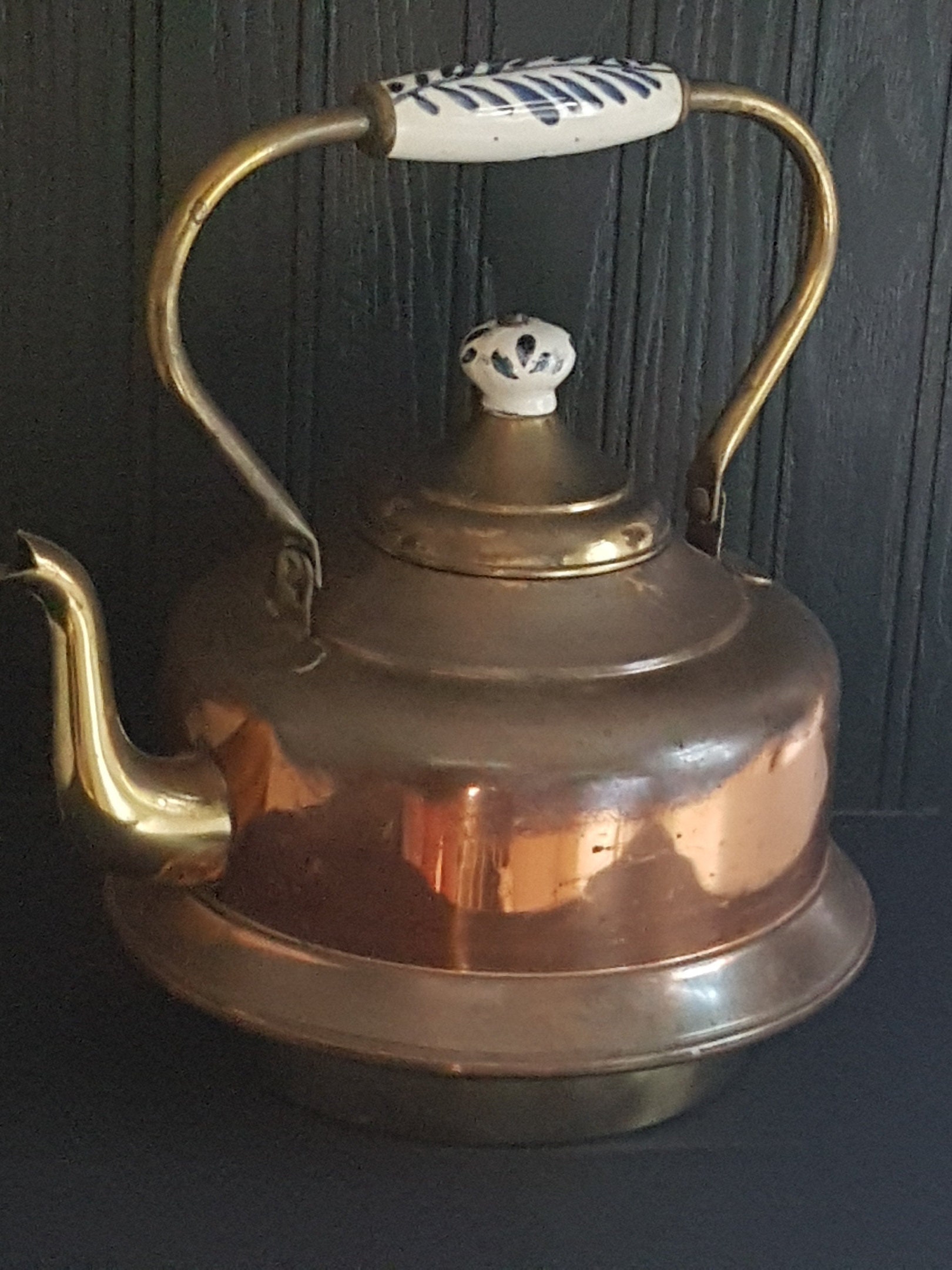 Both the spout and bottom of the tea kettle are brass. Handle and lid finial are blue and white porcelain.
