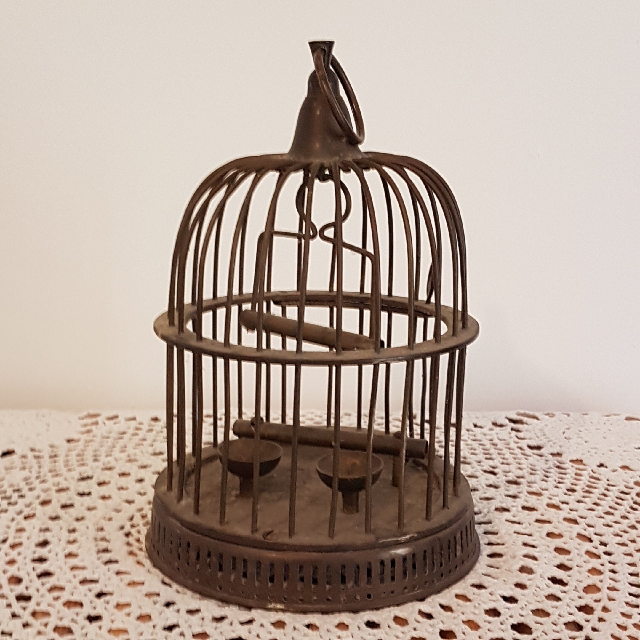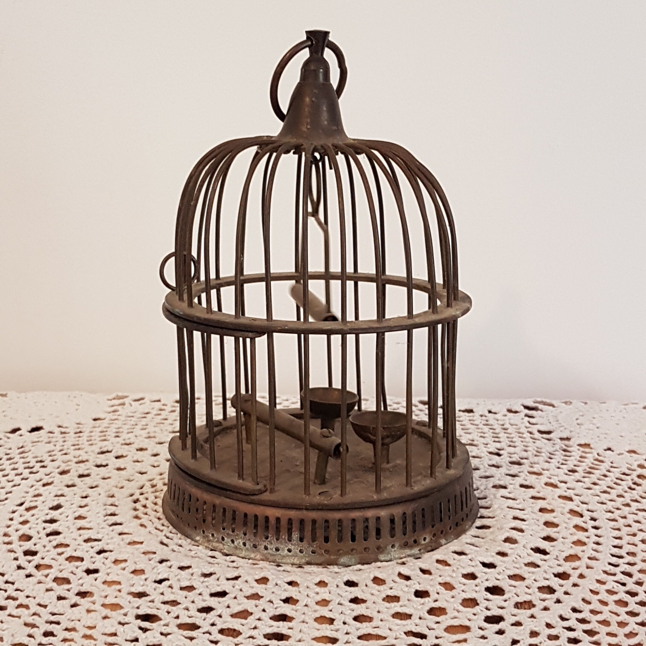 Decorative hanging bird cage with brass swinging perch, brass fixed perch and 2 brass feeder dishes. Unique hanging plant holder or tabletop decor in a Bohemian decor or rustic farmhouse decor!