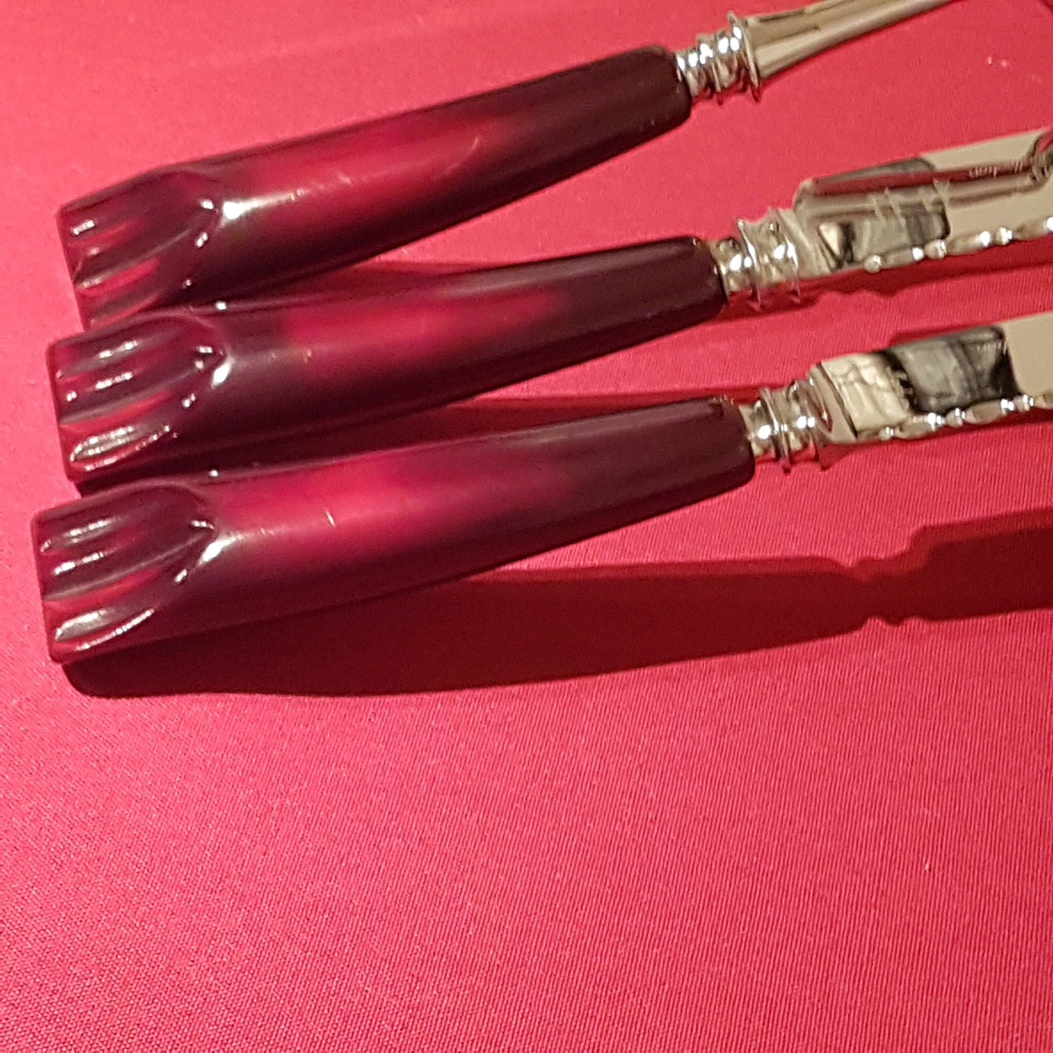 Red bakelite handles on this Canadian made Glo-Hill Cutlery 3 piece meat carving set.