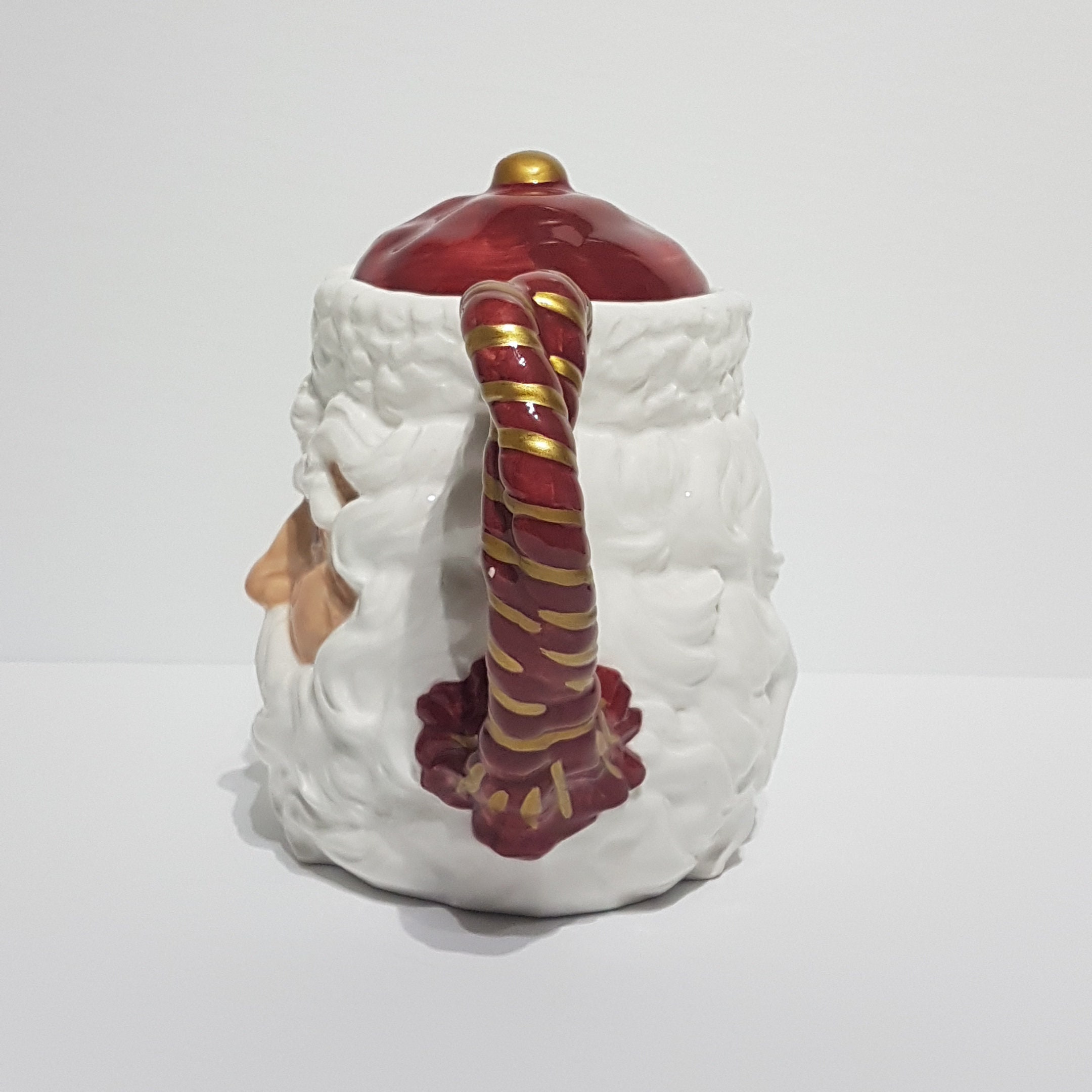3 dimensional Santa Claus face, with Santa's beard extending to the spout! Red and gold colored candy cane handle completes the look!