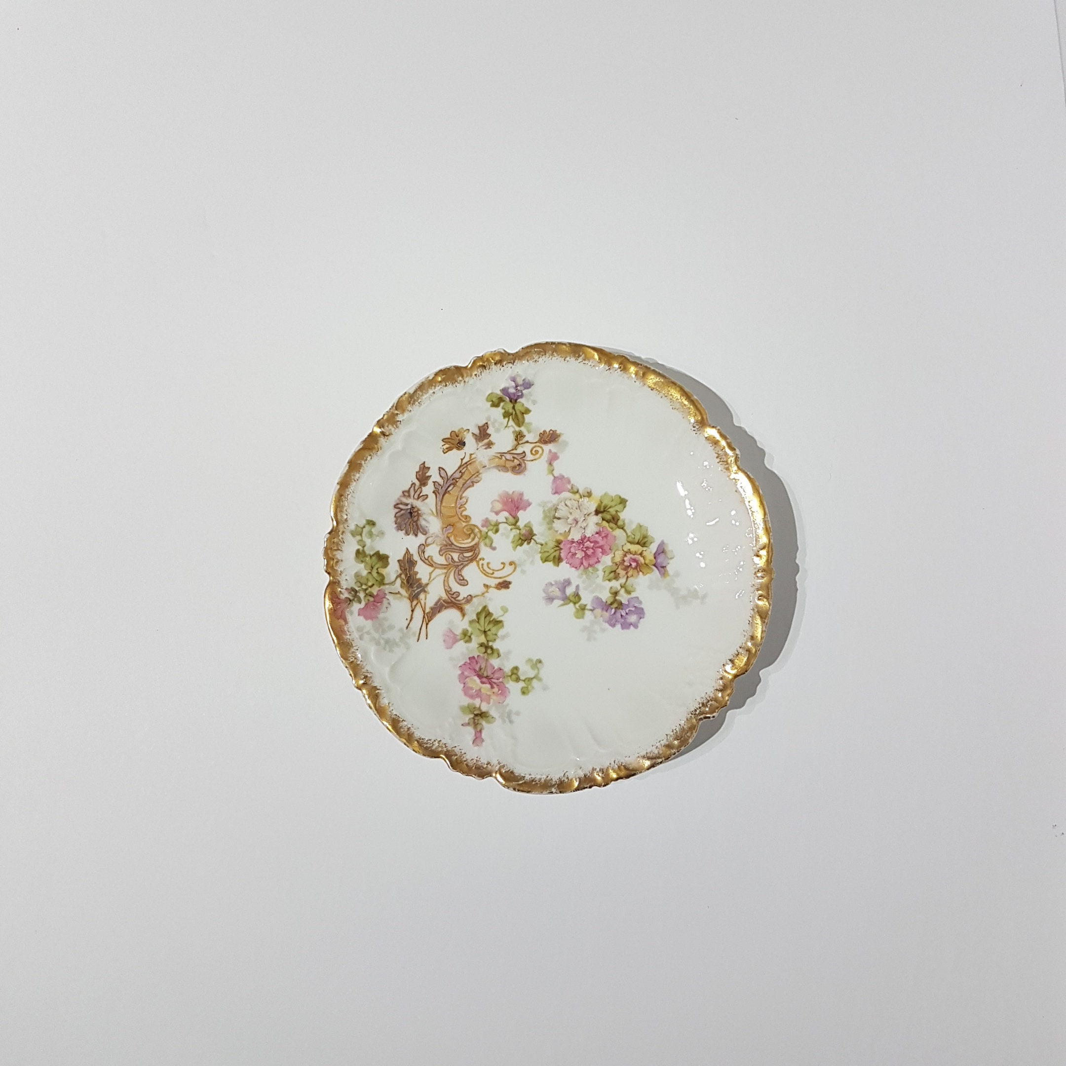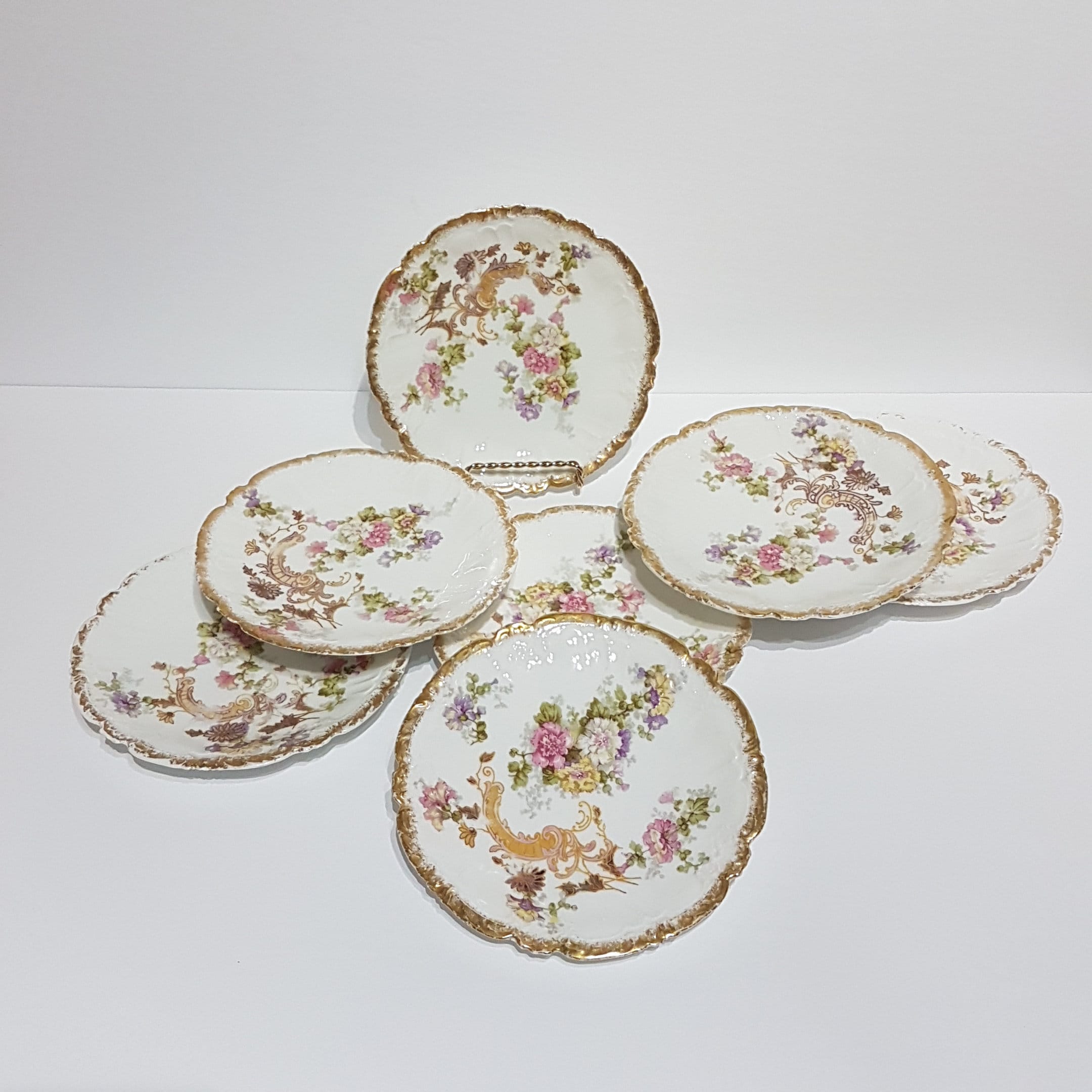 Set of 7 antique Limoges side plates, hand painted with a beautiful pattern of pink, purple and white flowers and soft green leaves on an embossed porcelain. Gold floral and scrolled pattern with a thick border of gold trim.