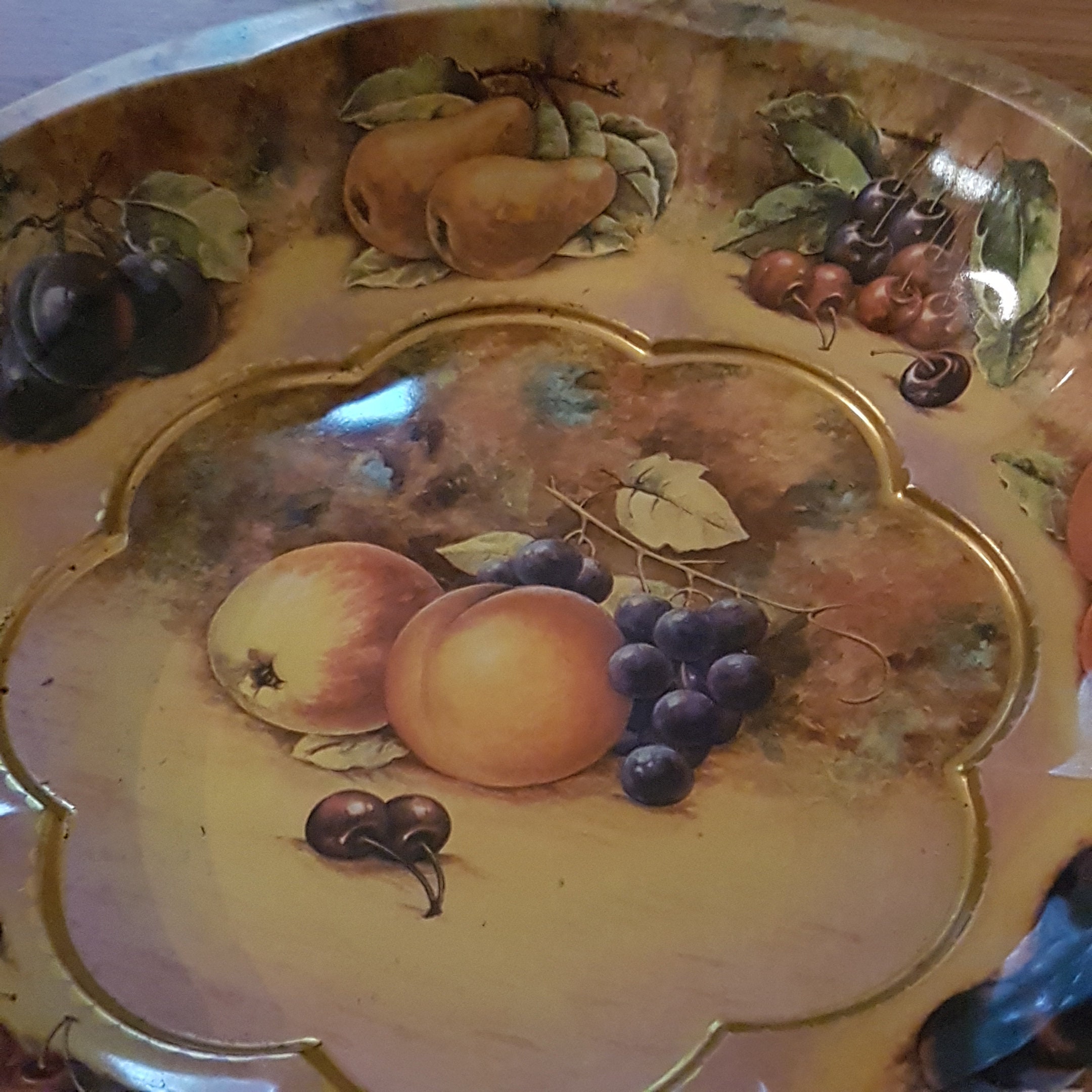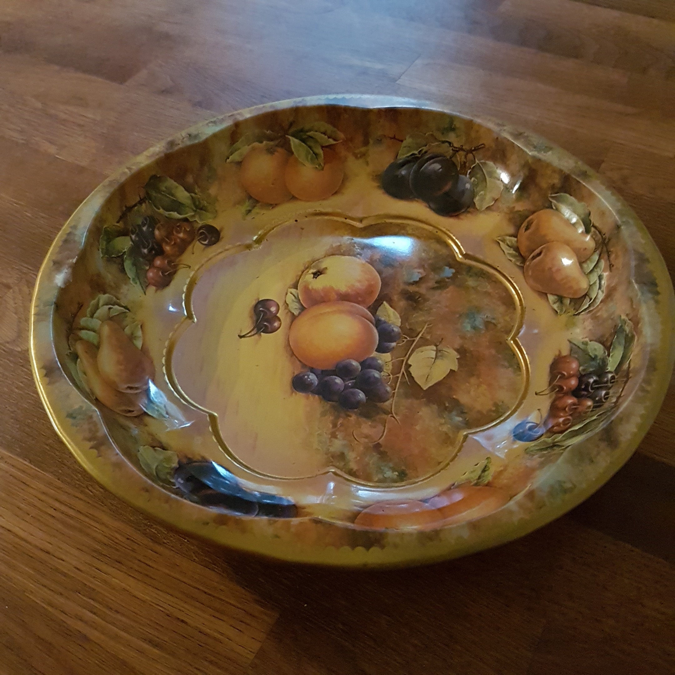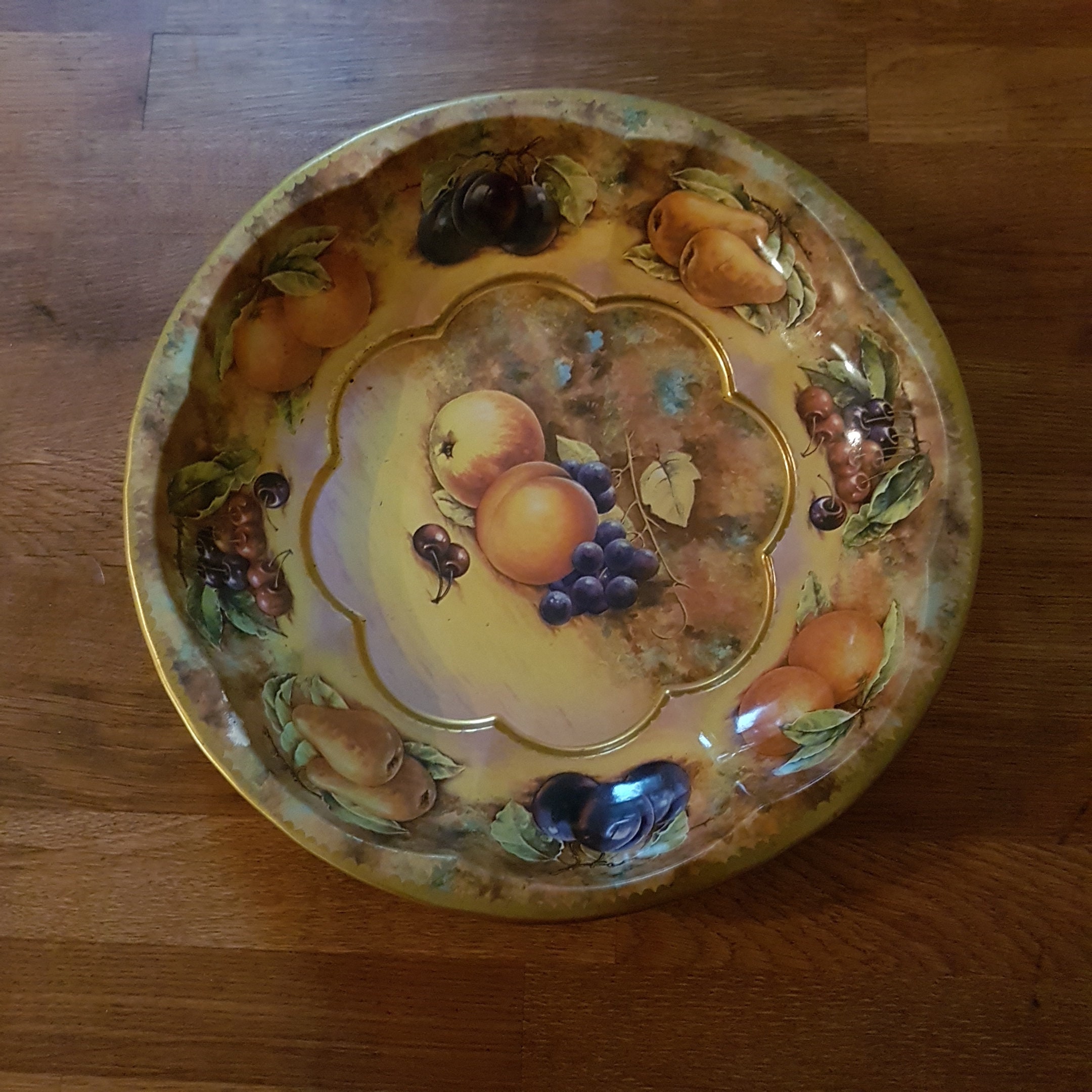Autumn themed tin fruit bowl with pears, cherries oranges plums, grapes and apples, on a softly muted background of tans, browns and greens. A lovely vintage metal fruit bowl for display as kitchen decor or use as a fruit bowl.