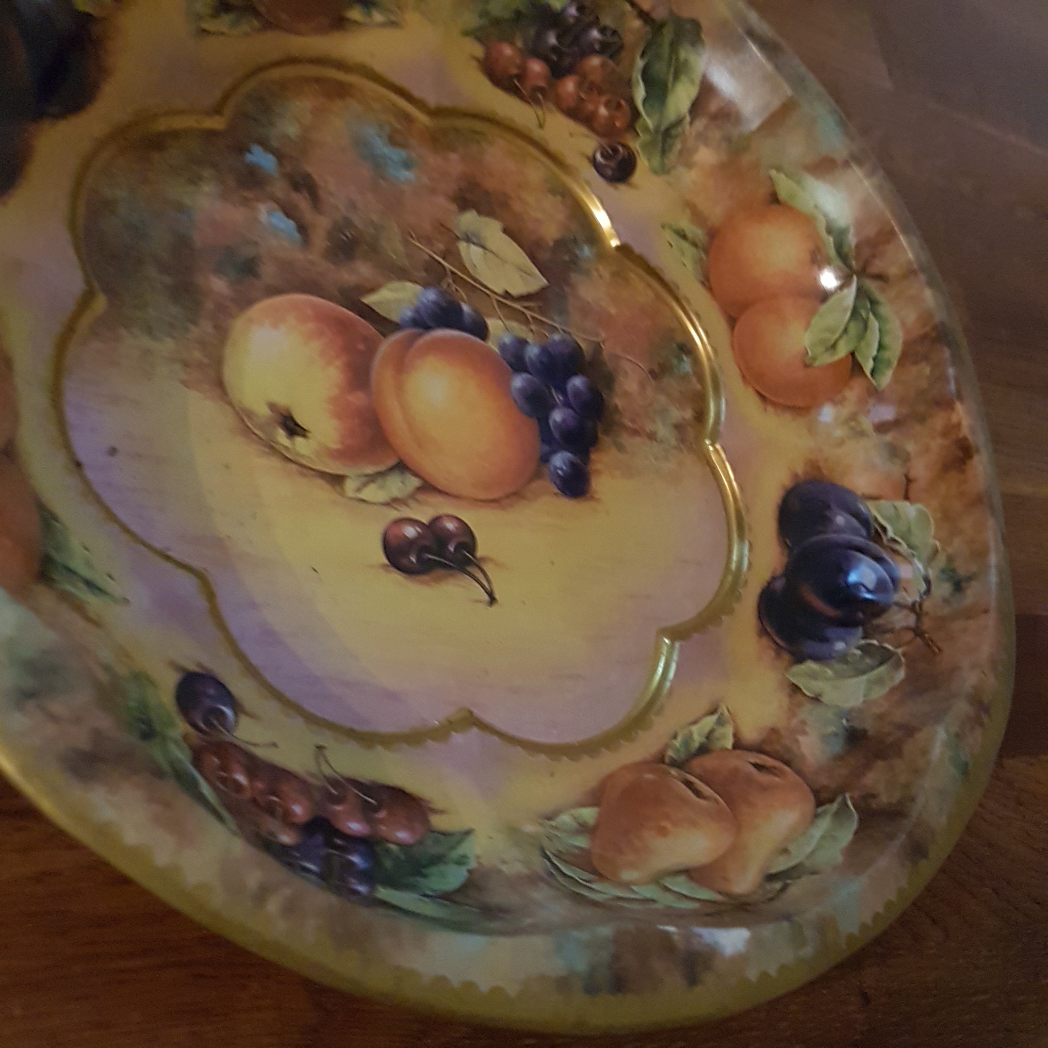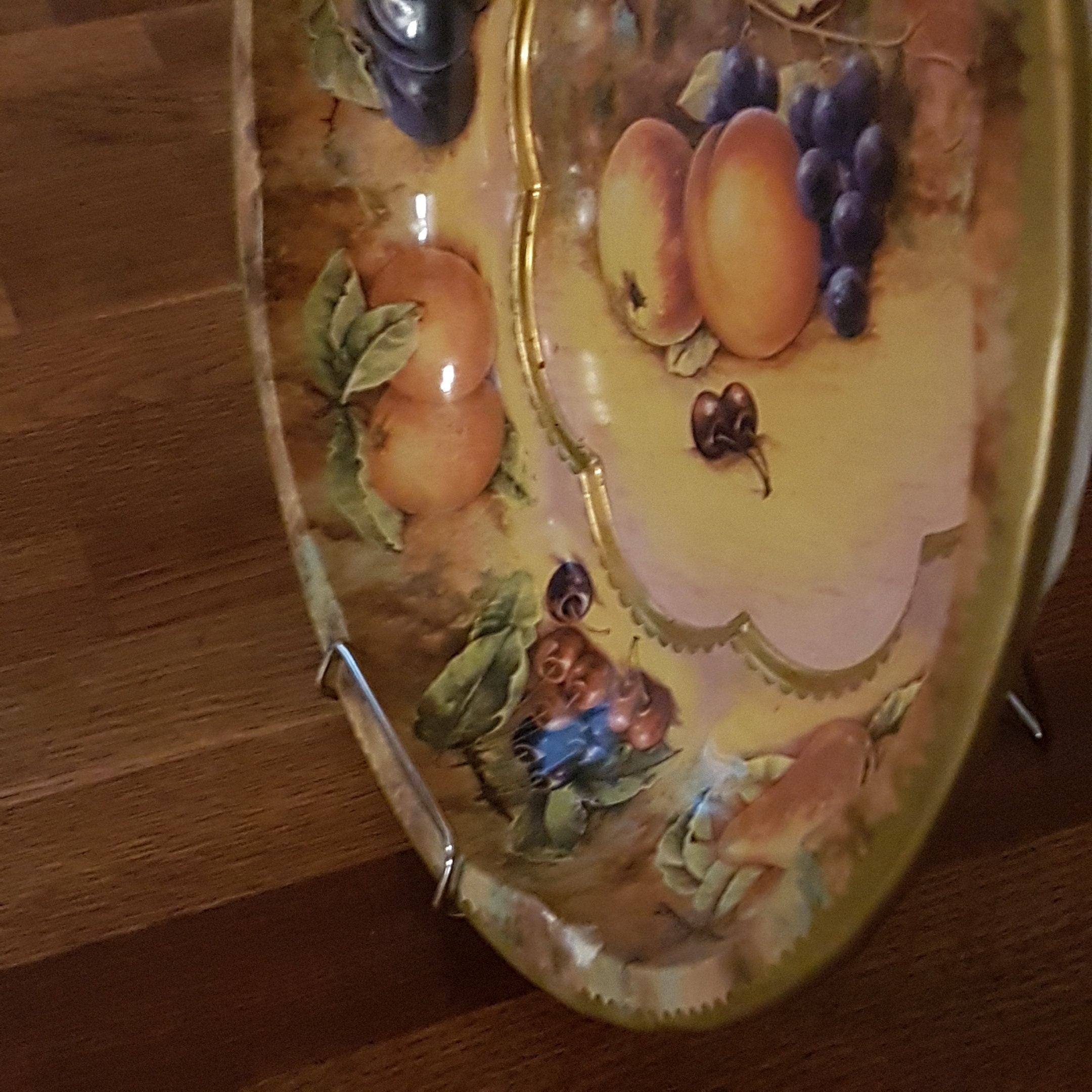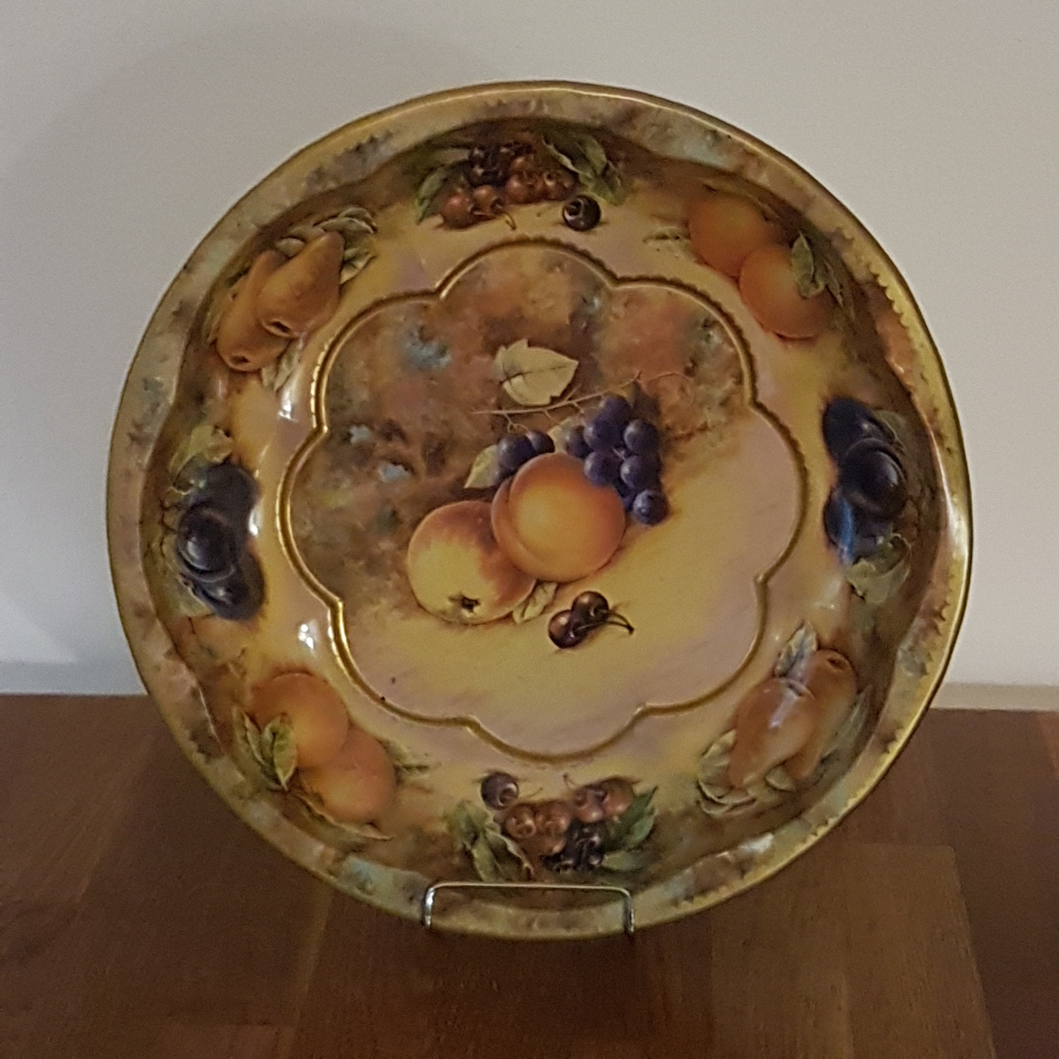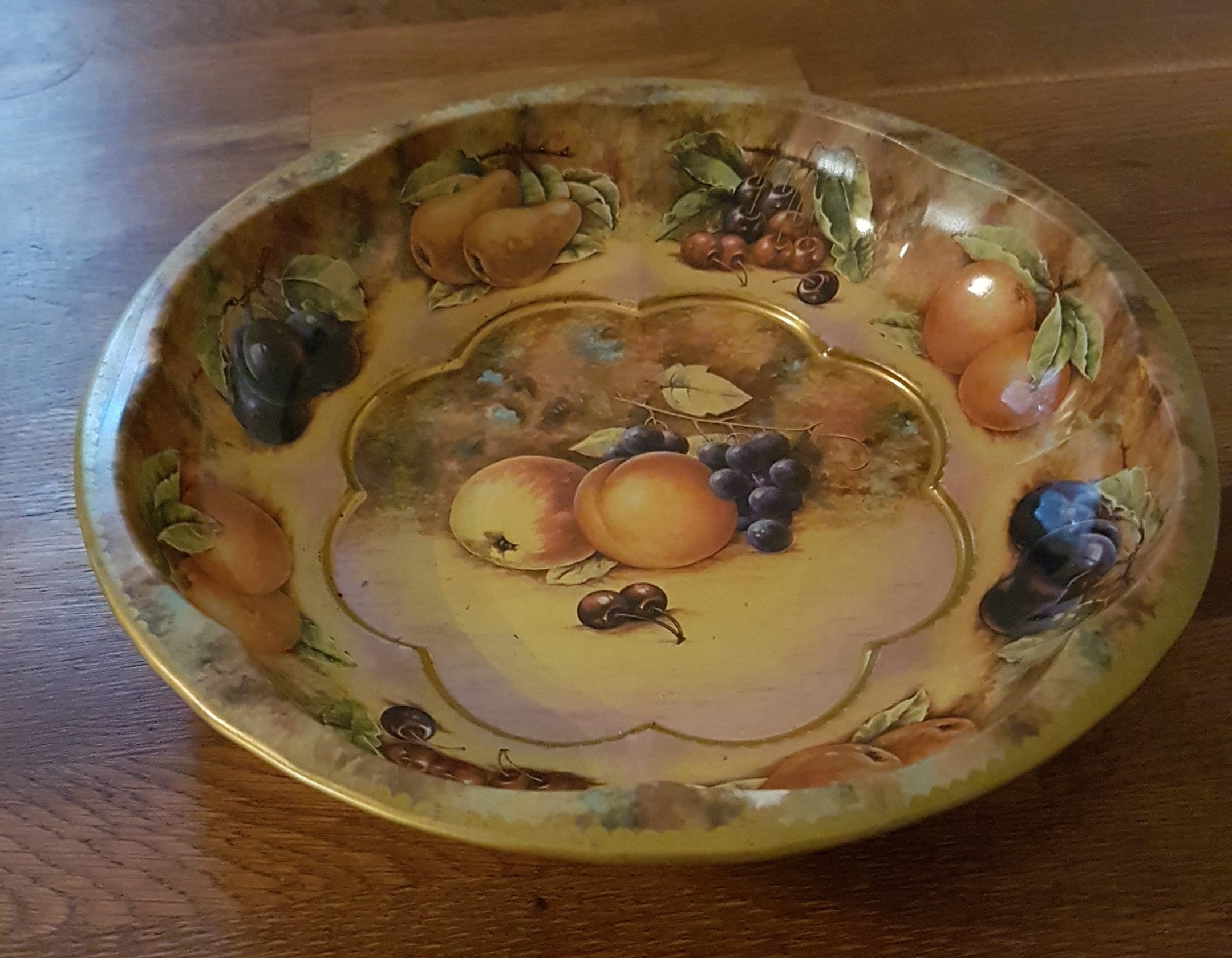 Autumn themed tin fruit bowl with pears, cherries oranges plums, grapes and apples, on a softly muted background of tans, browns and greens. A lovely vintage metal fruit bowl for display as kitchen decor or use as a fruit bowl.