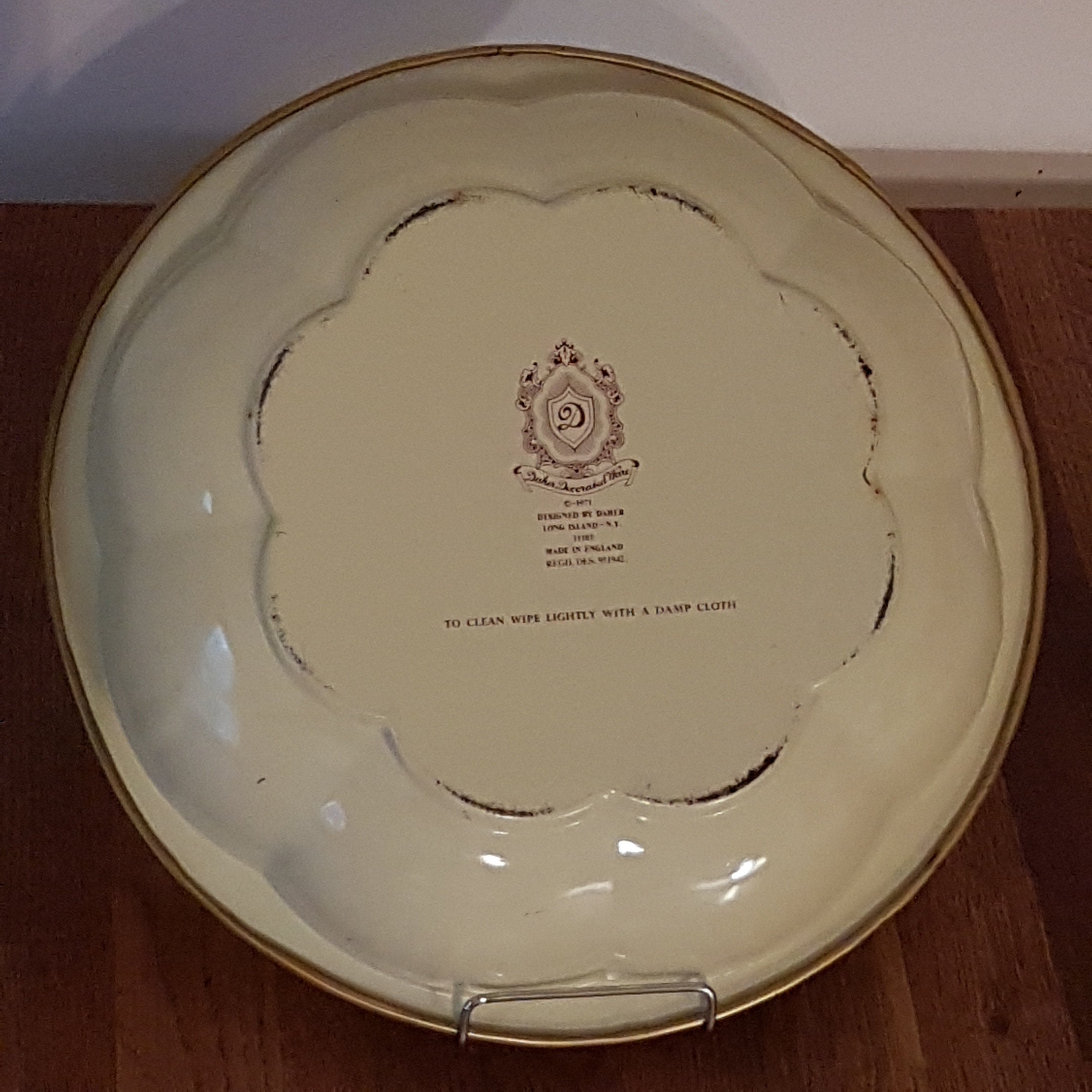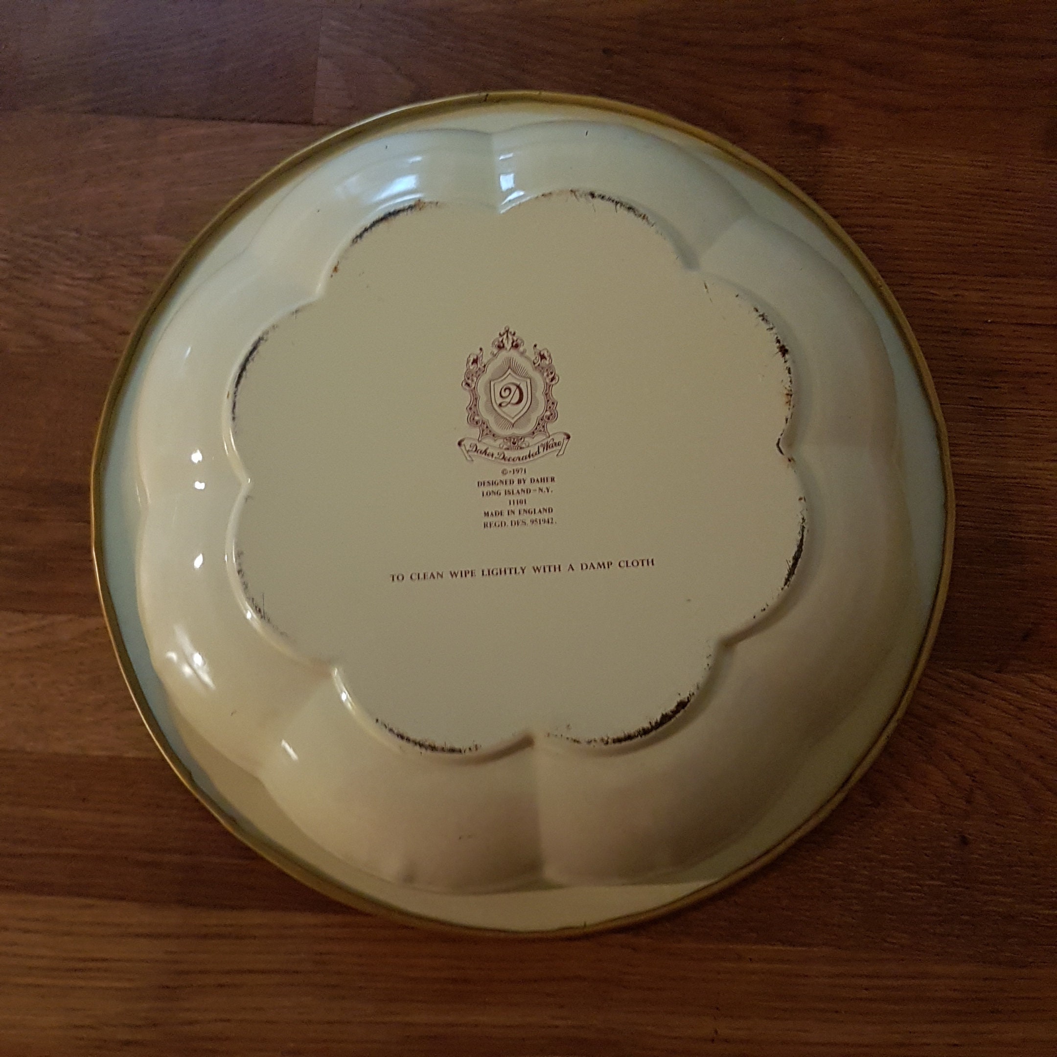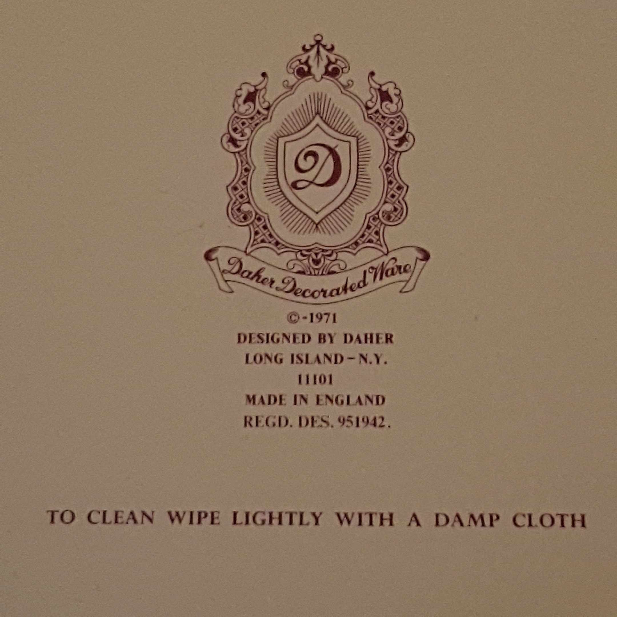 Printed on back of tin bowl "Daher Decorated Ware, 1971, Designed by Daher, Long Island - NY, 11101, Made in England, Regd Des 951942, To clean wipe lightly with a damp cloth"