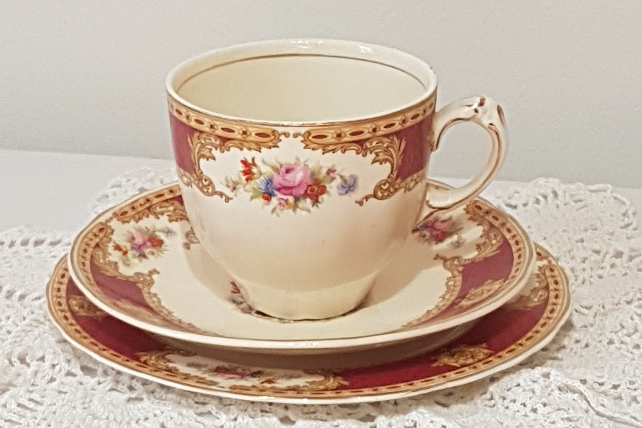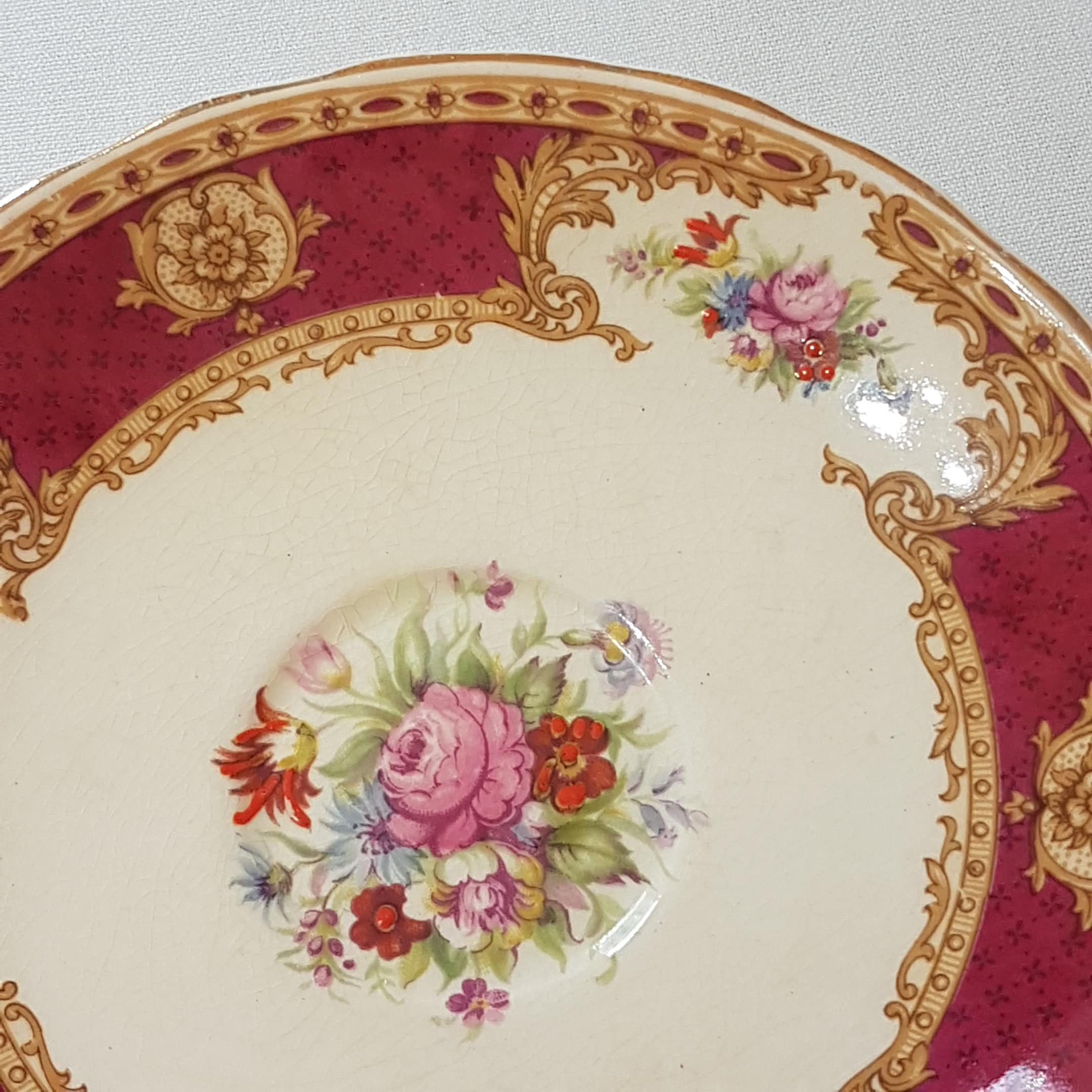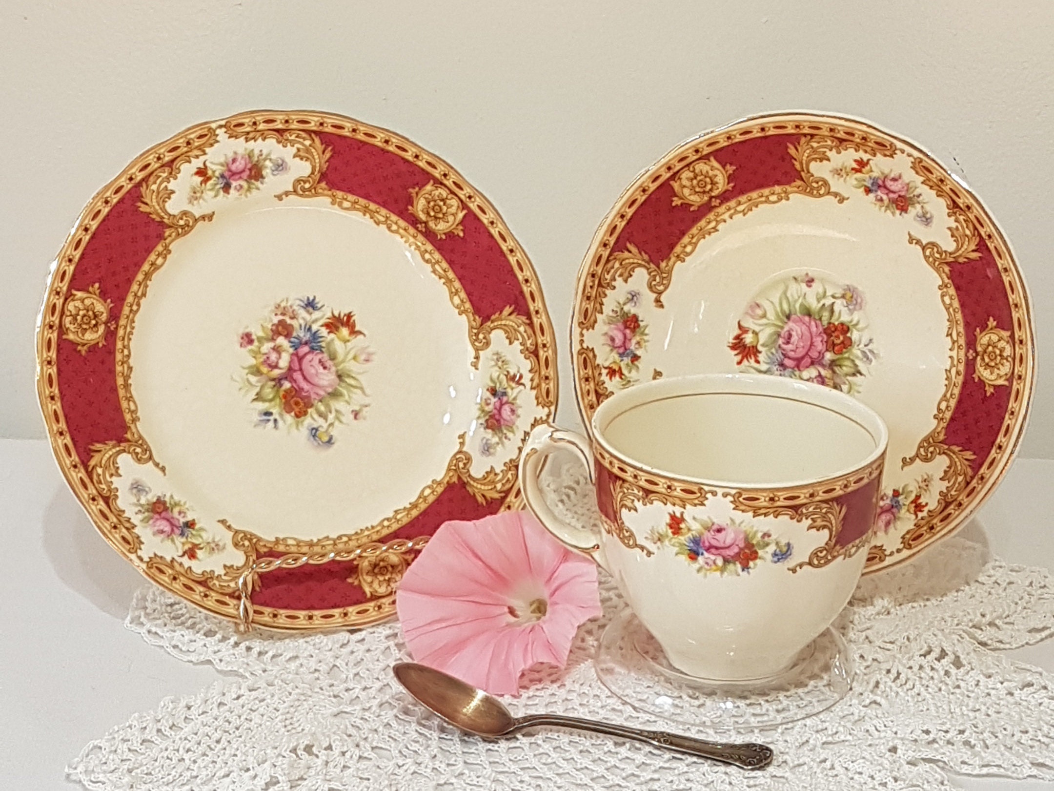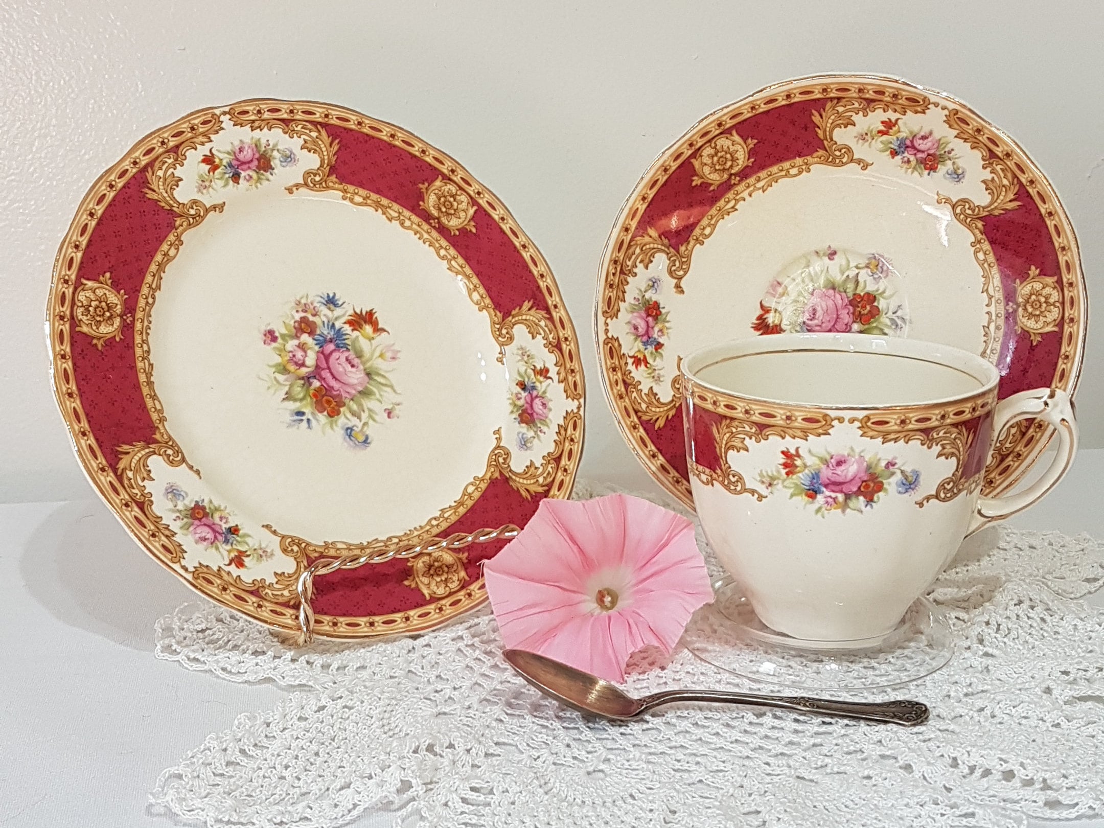 Antique Josiah Wedgwood in Vincent pattern. Lovely trio of tea cup, saucer and dessert plate. Vincent by Wedgwood is a lovely pattern of florals in pink, red, blue and yellow in the center and on the rim, with maroon rim. Tan scrolls bring further elegance to the pattern.