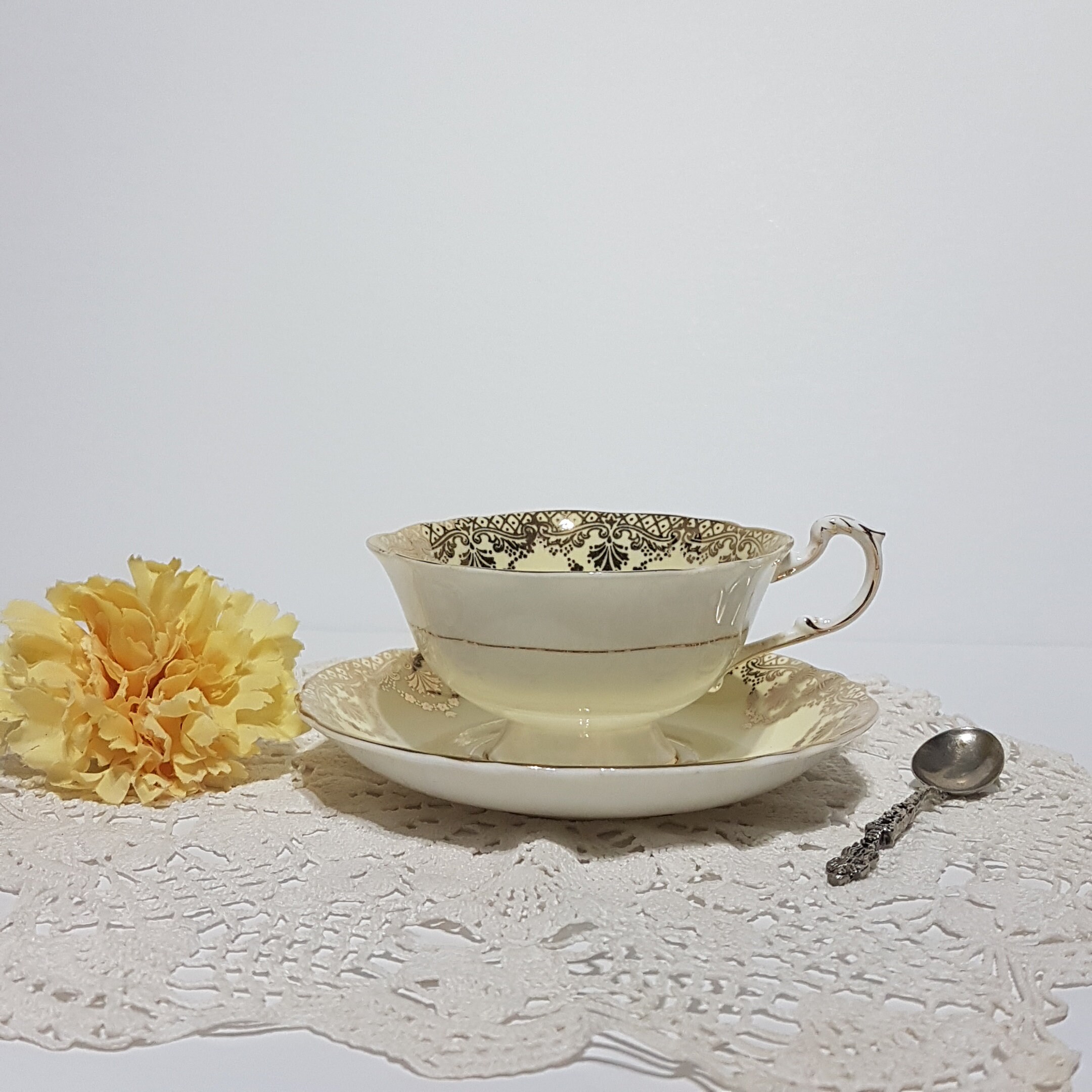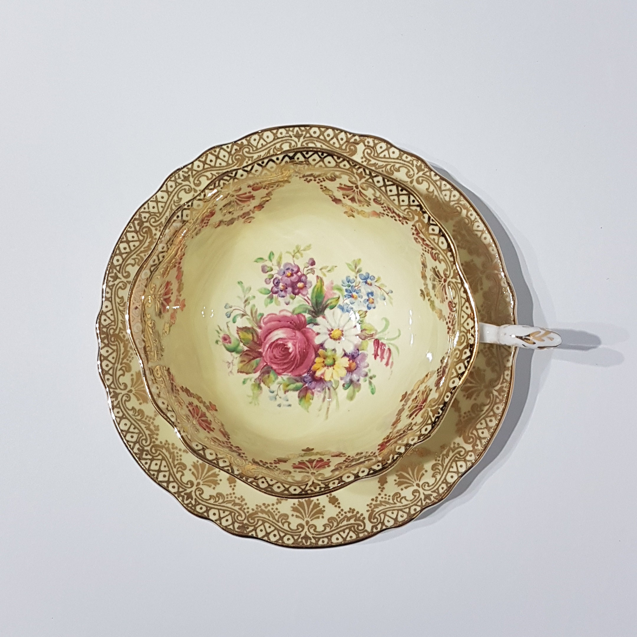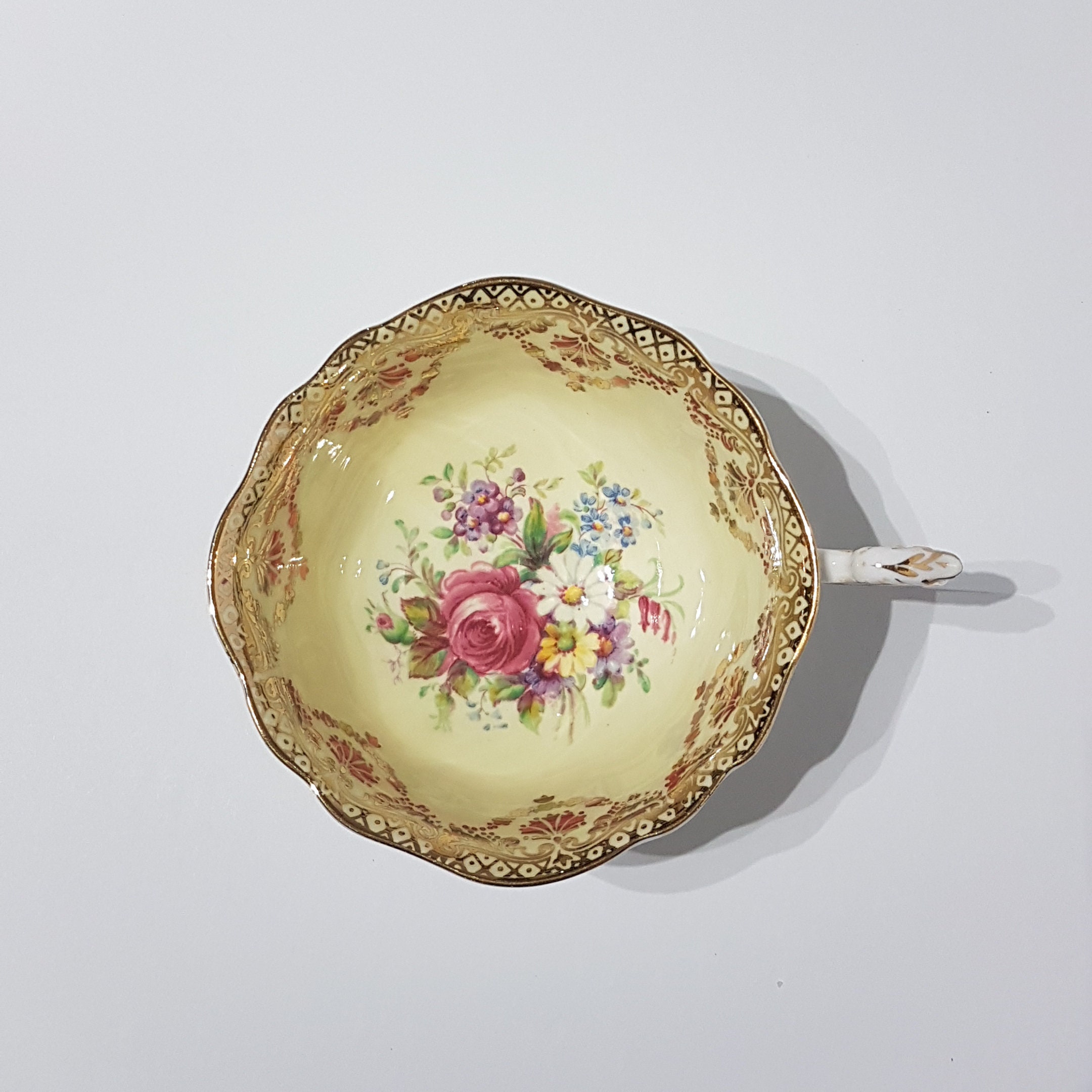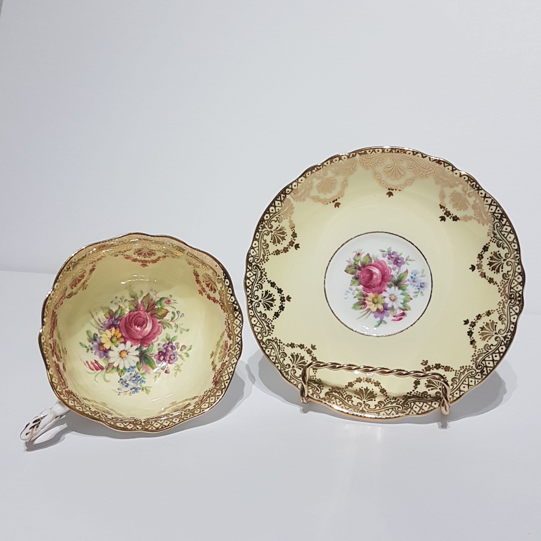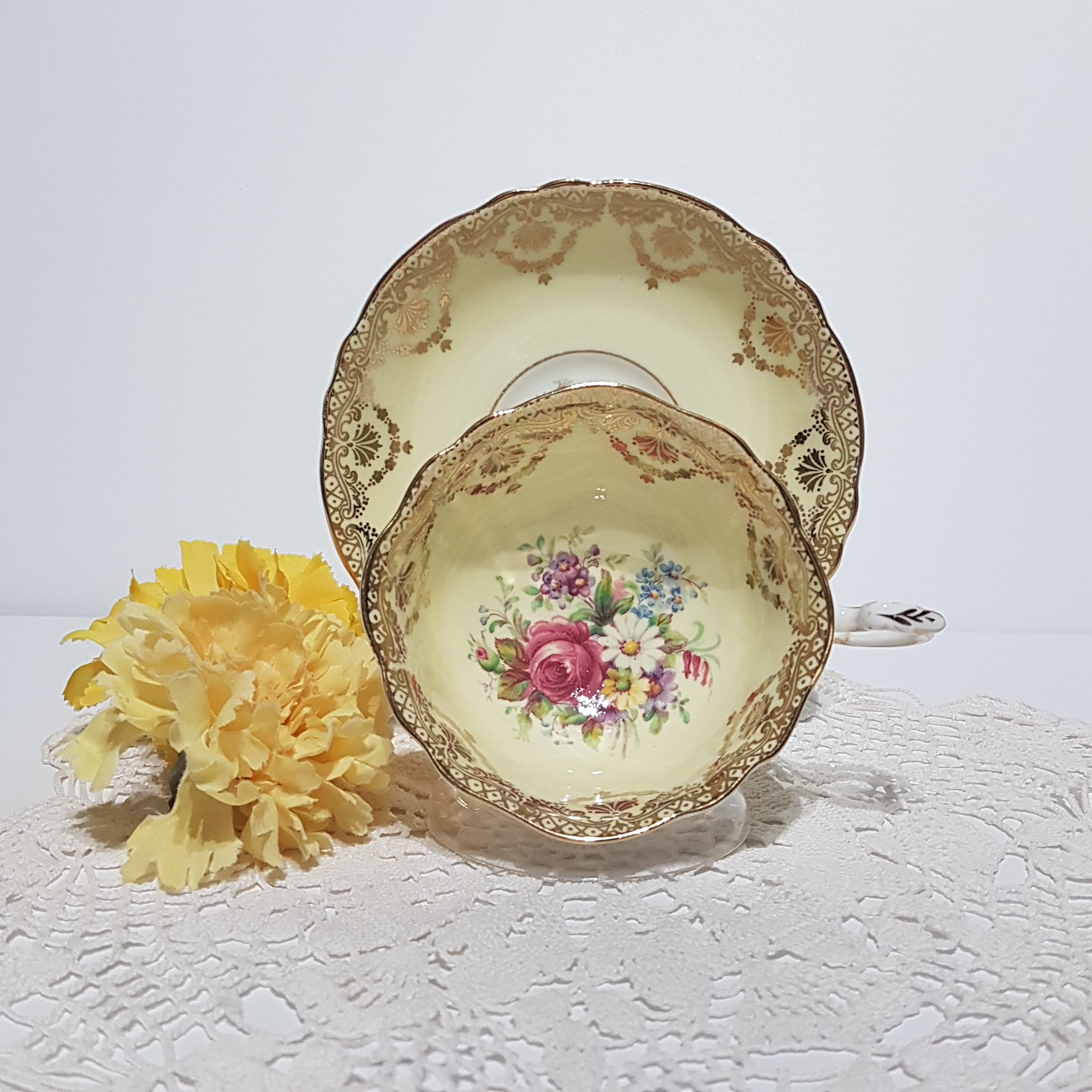 Gorgeous Paragon bone china tea cup with gold gilded scrolls, pink rose florals on soft yellow background. Gently scalloped edges on tea cup and saucer with gold trim.