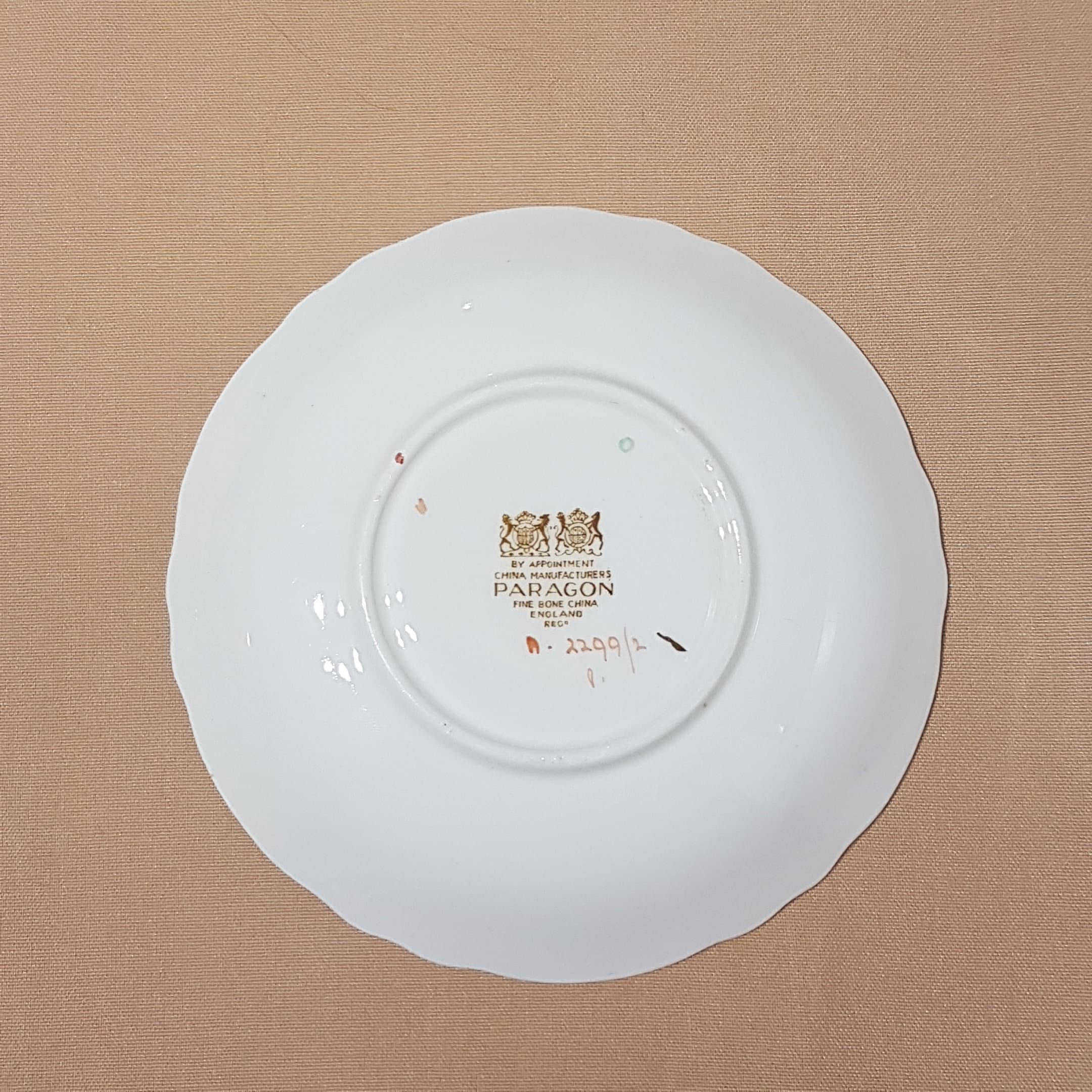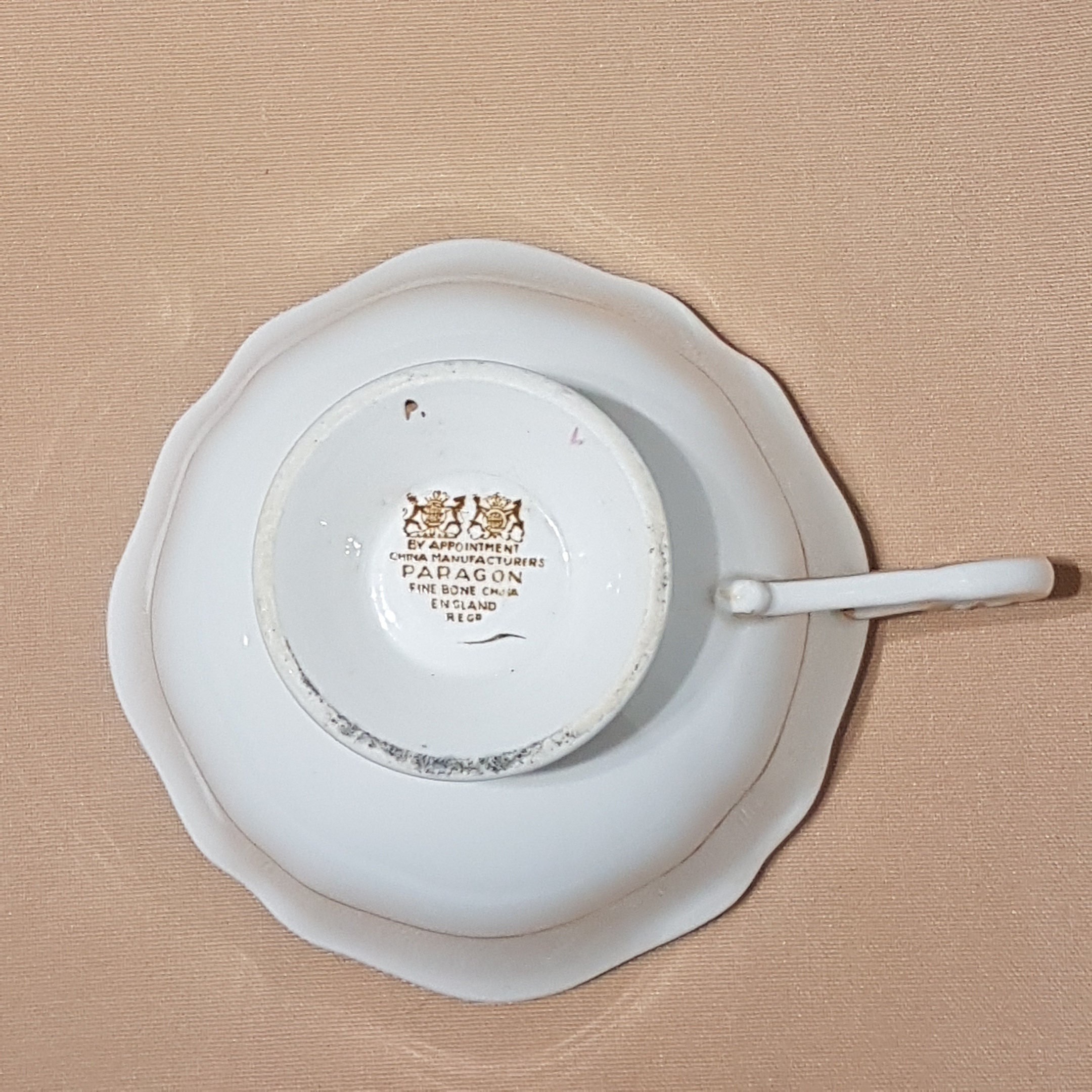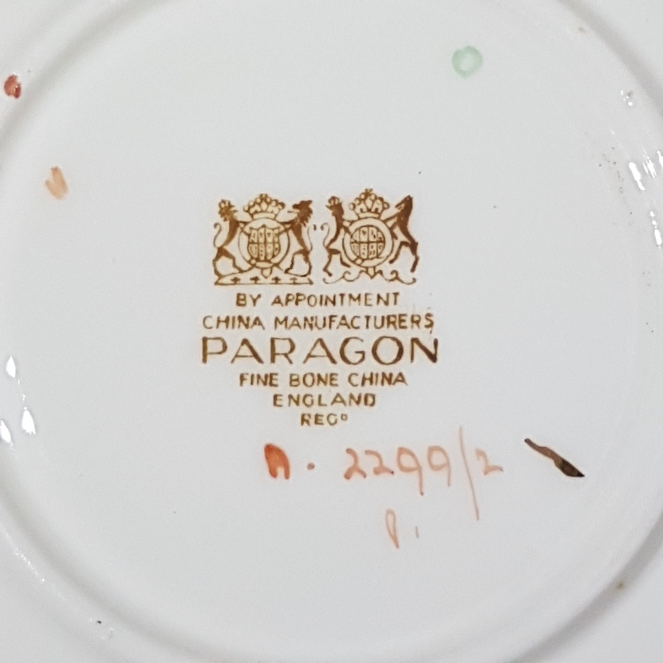 On bottom of teacup "By Appointment China Manufacturers PARAGON - Fine Bone China - Regd - A2299/2"