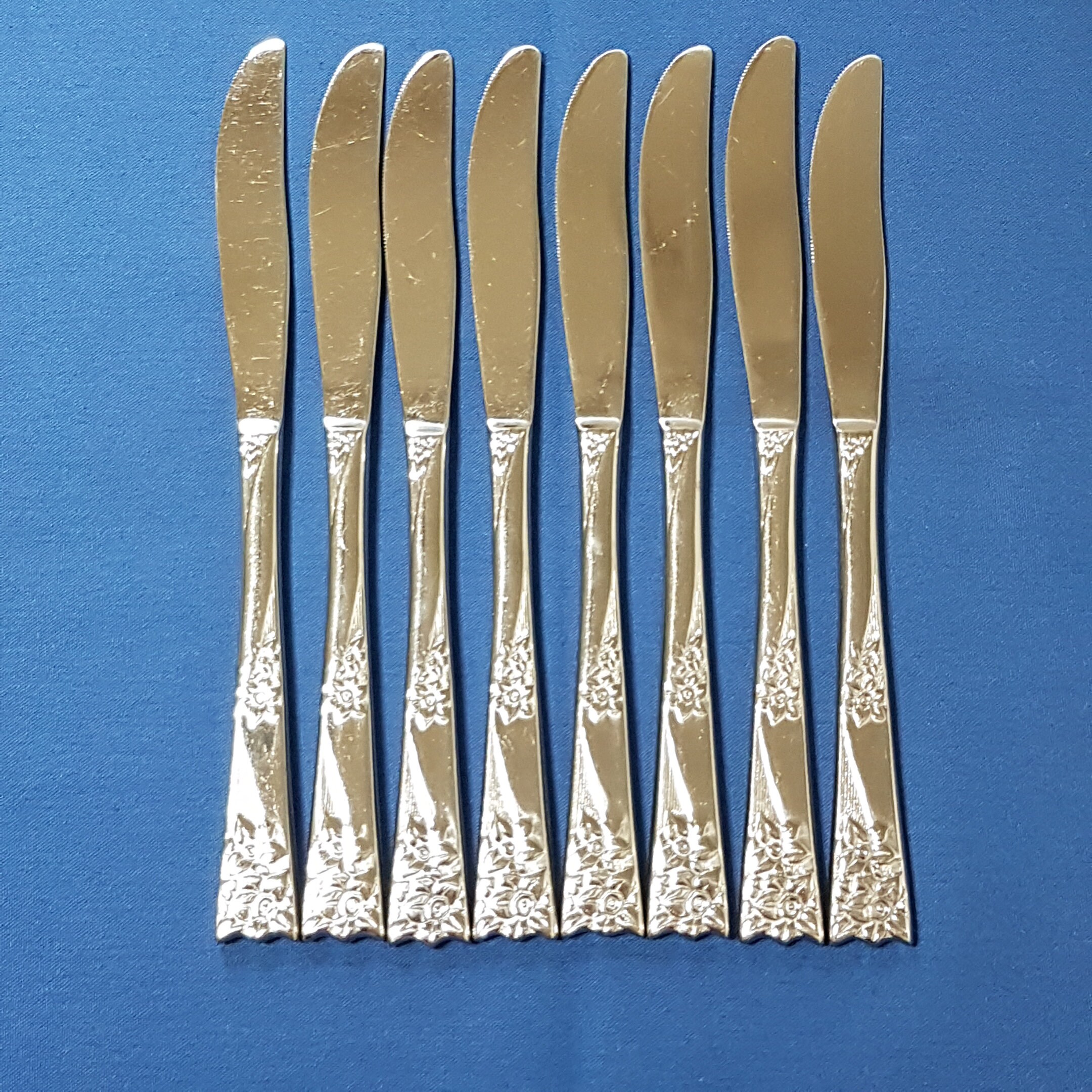 8 of Dinner knife is 8 1/2" - lightly serrated edge, stainless steel blade