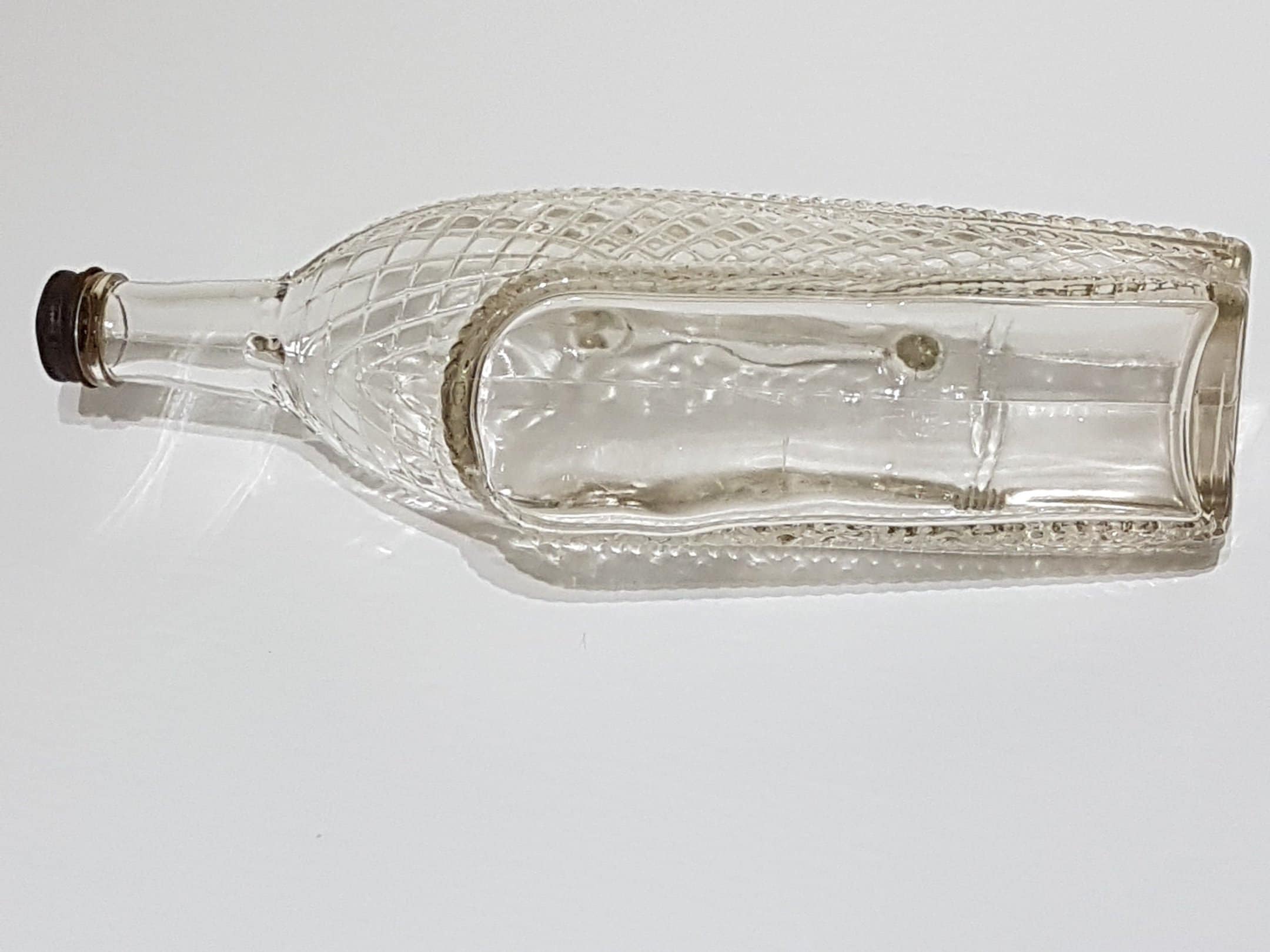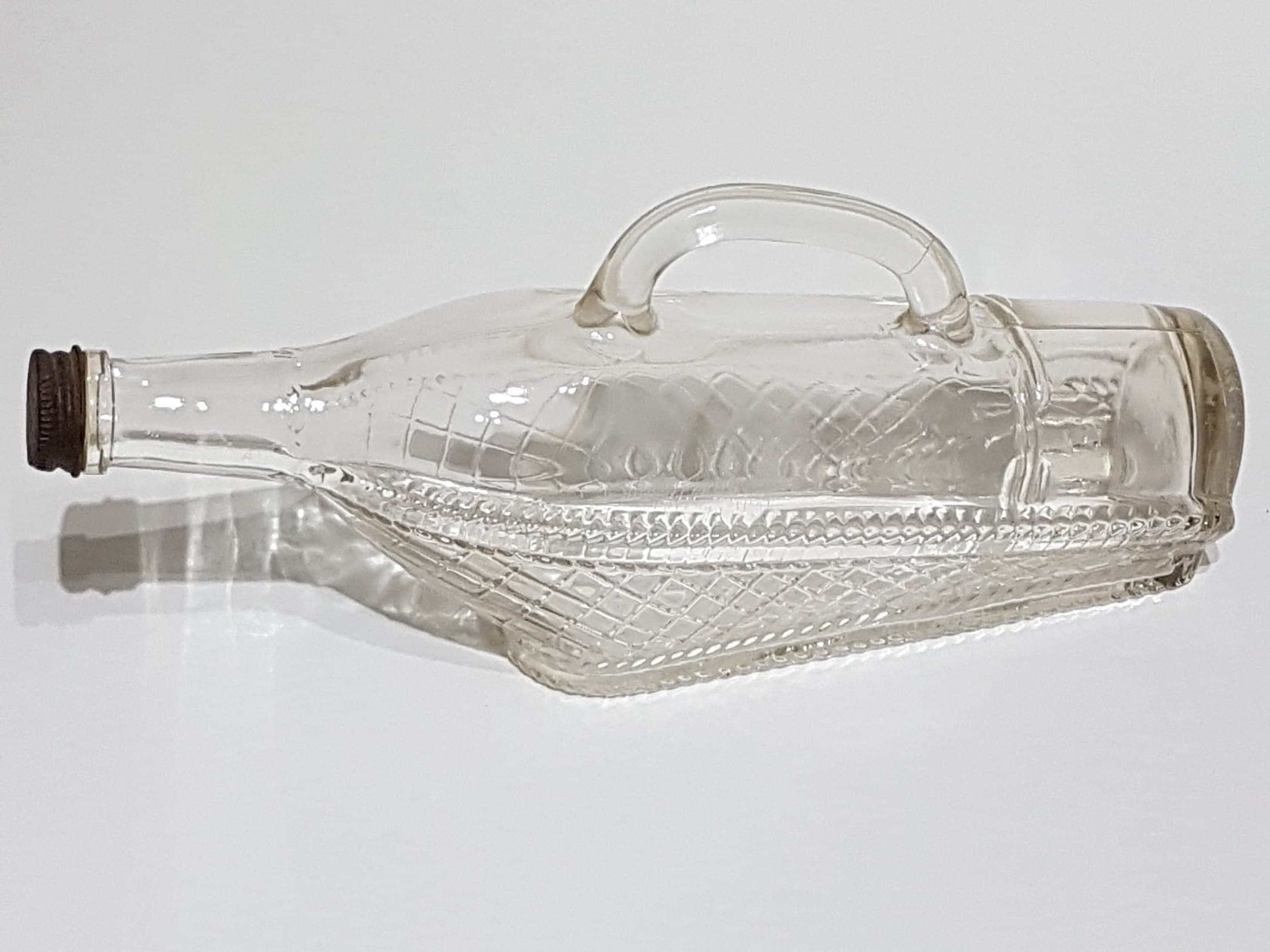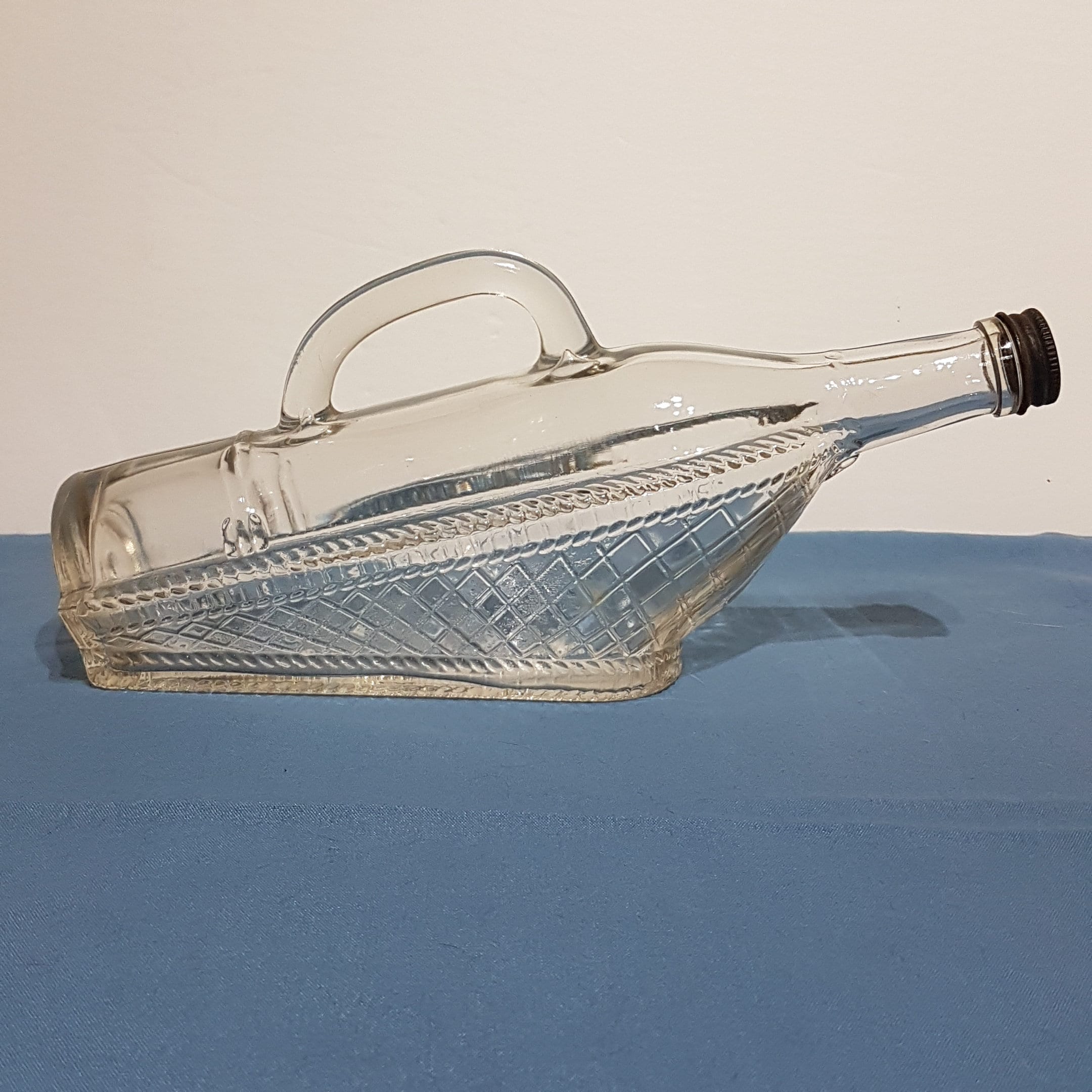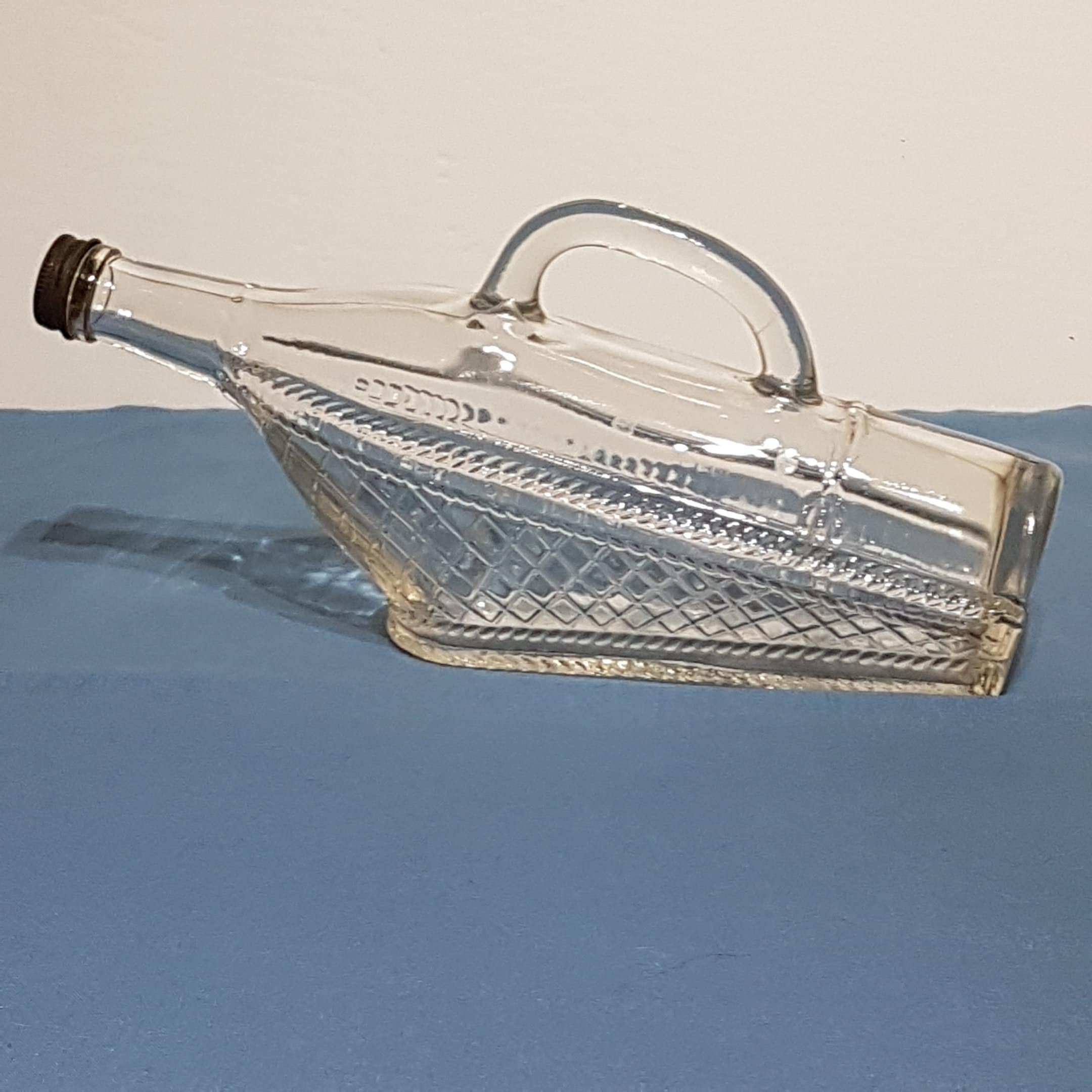 Vintage clear glass ship shaped wine bottle from London Winery in London, Ontario, Canada, circa 1966. Bottom half of bottle has a clear diamond pattern given the appearance of laying in a wicker basket.