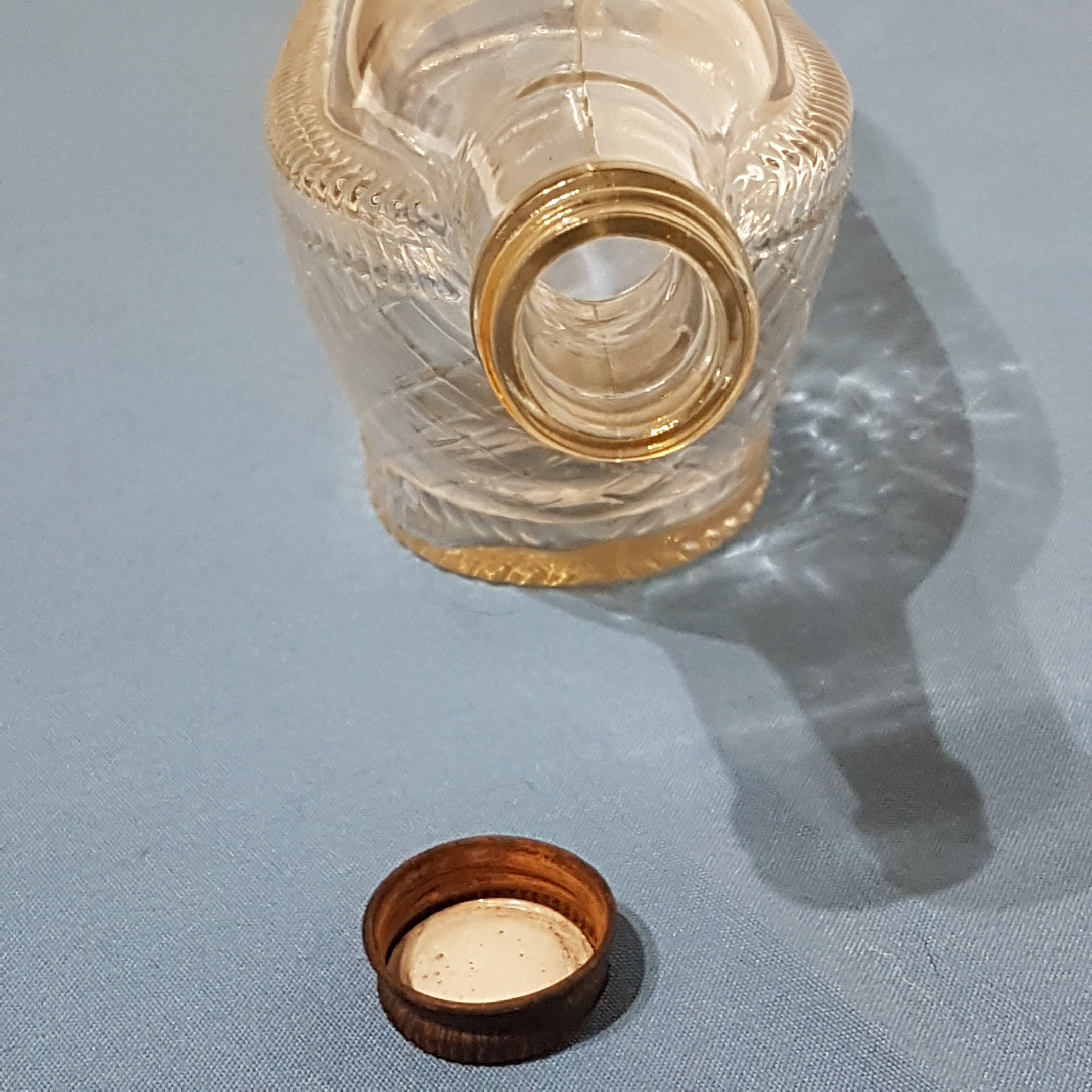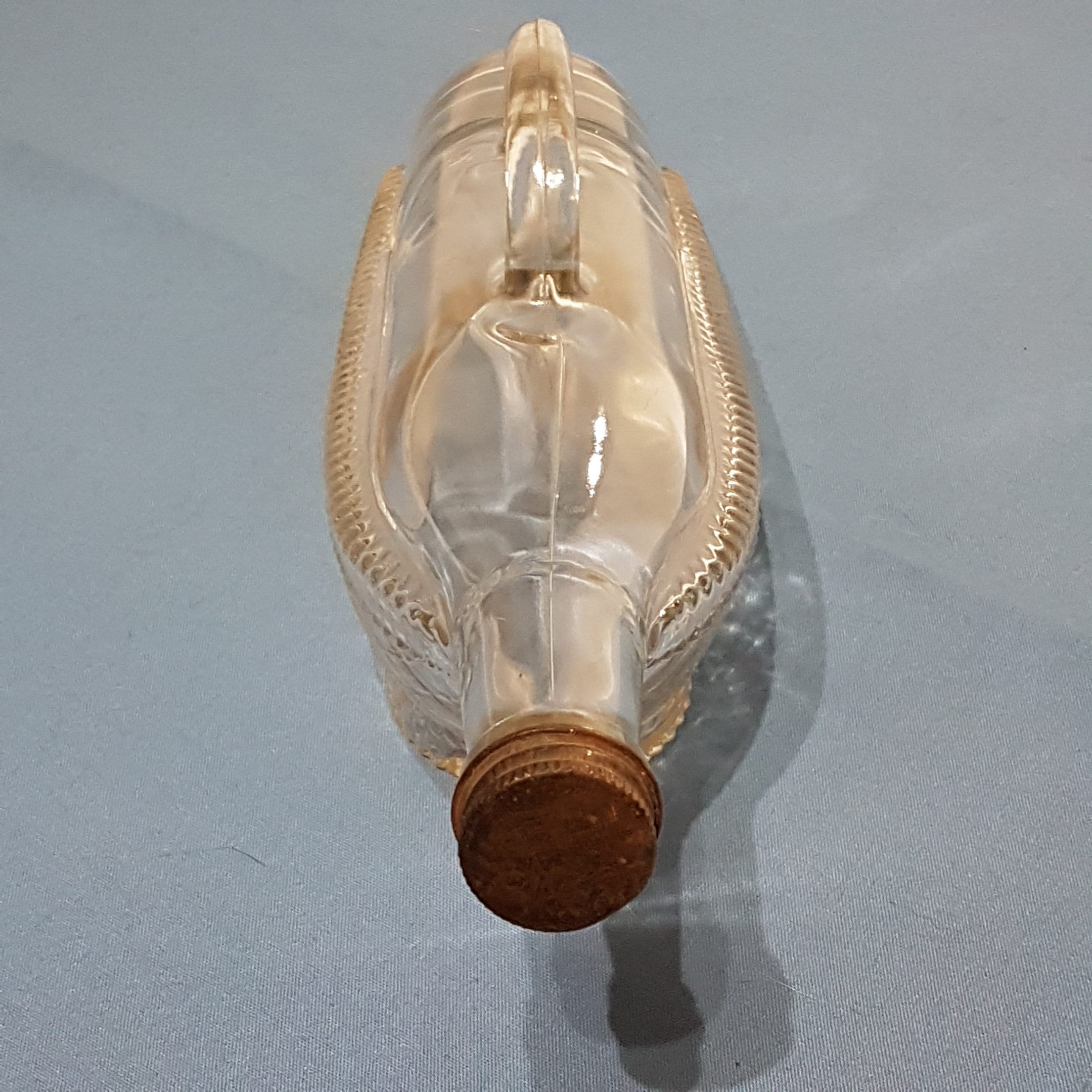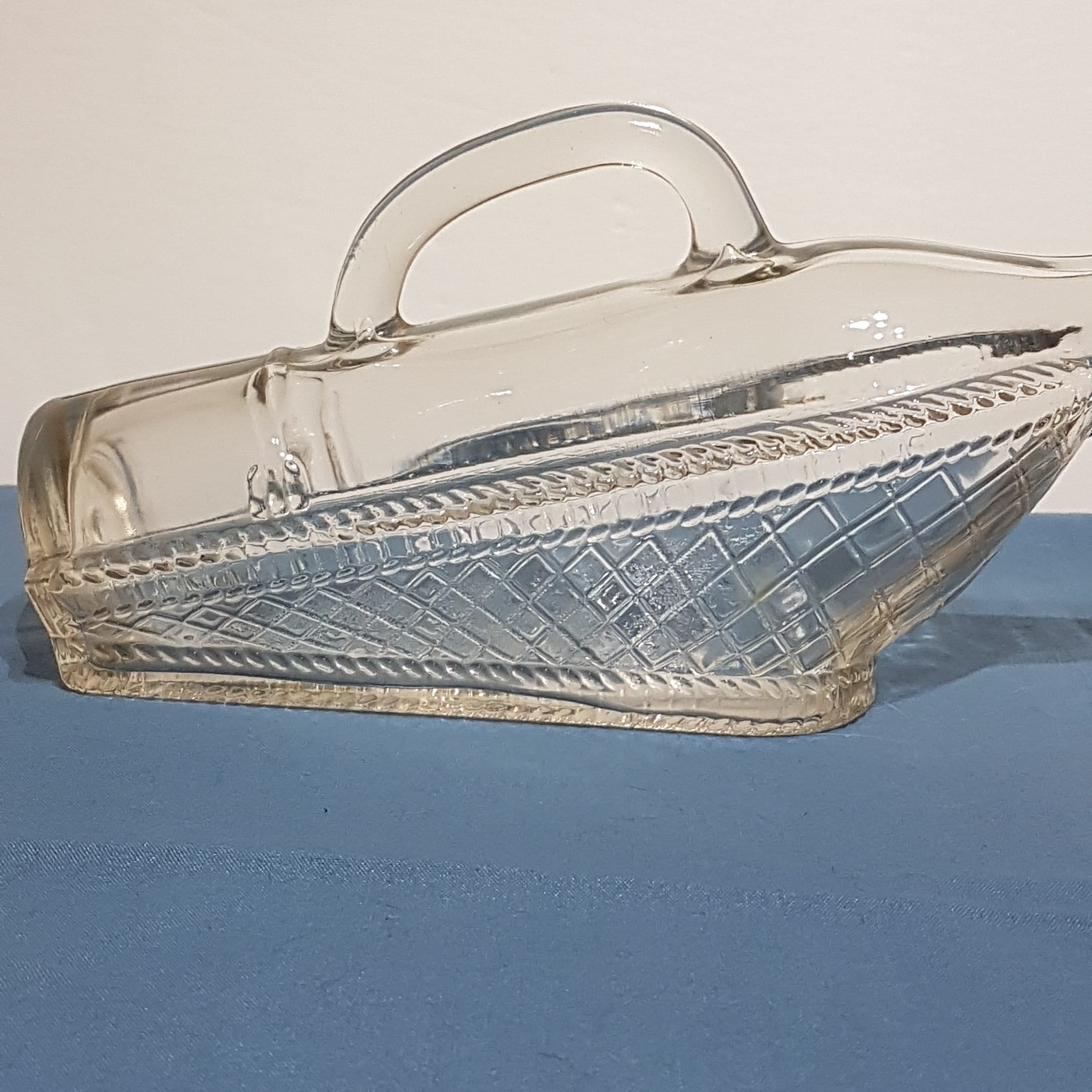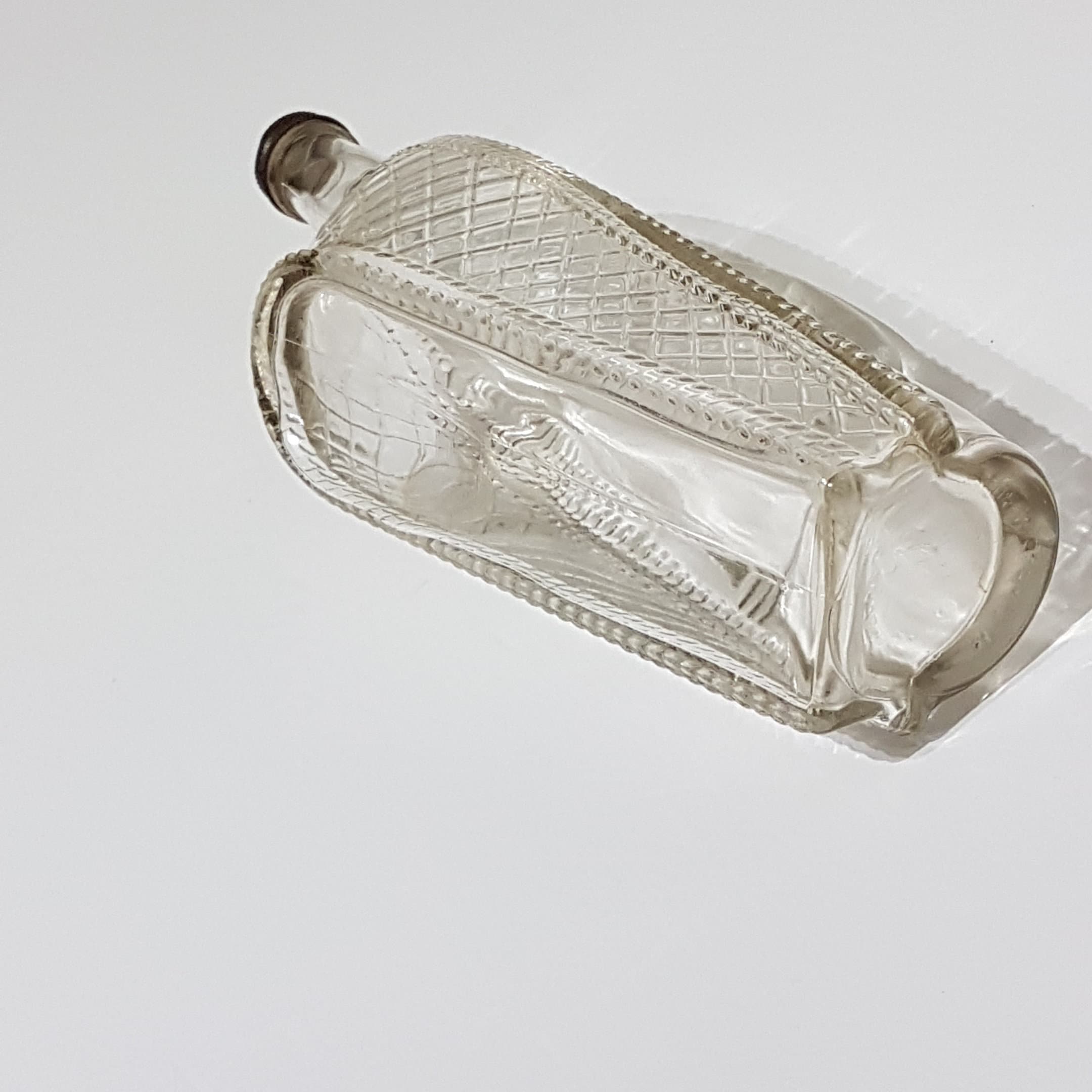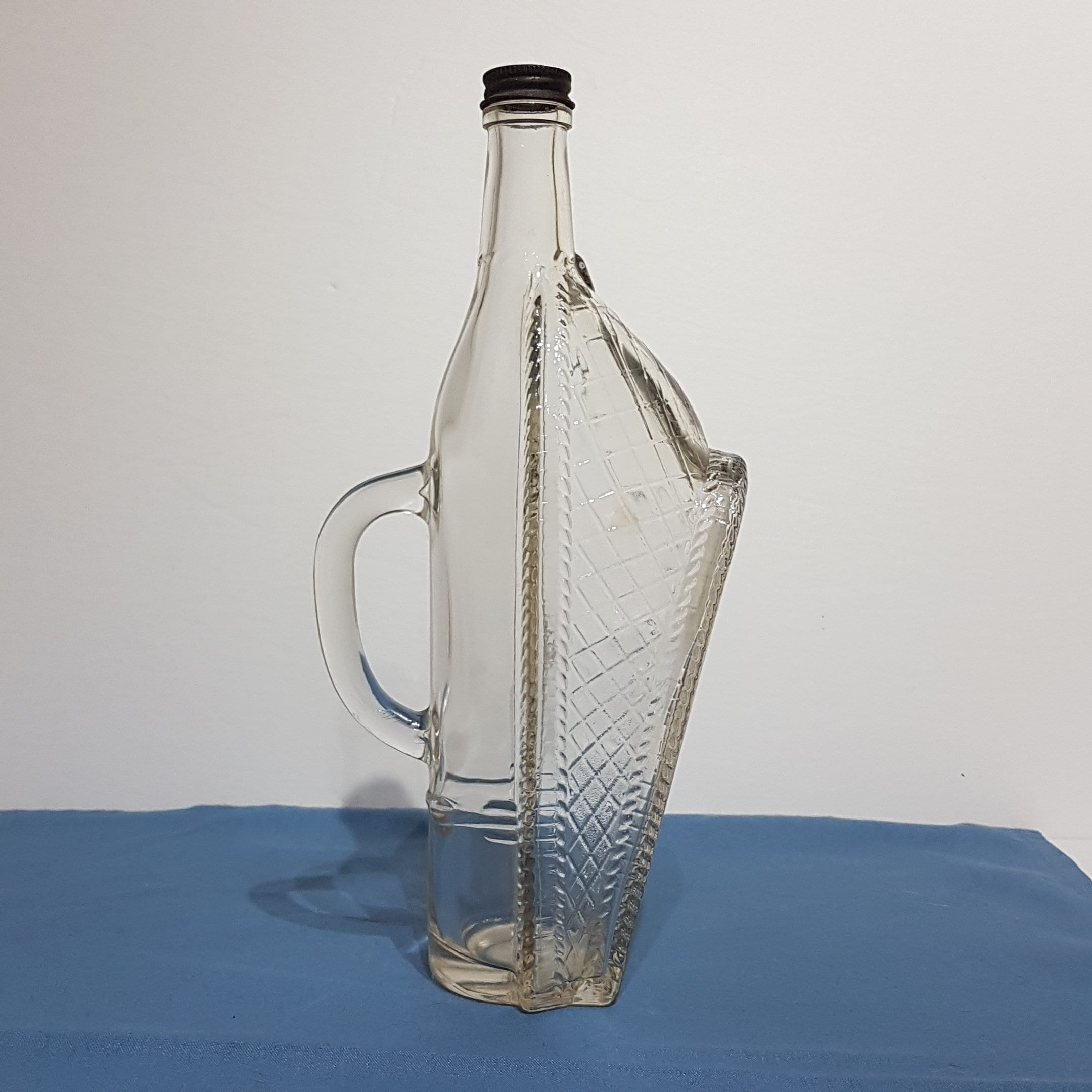 Vintage clear glass ship shaped wine bottle from London Winery in London, Ontario, Canada, circa 1966. Bottom half of bottle has a clear diamond pattern given the appearance of laying in a wicker basket.