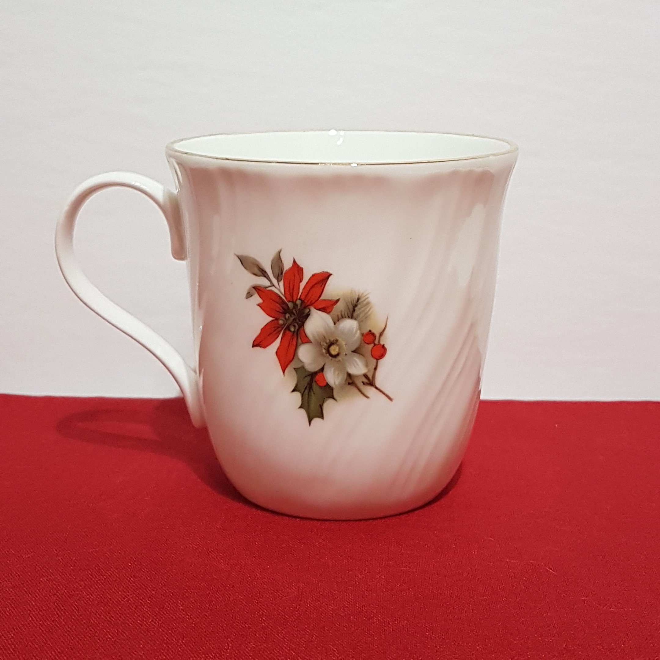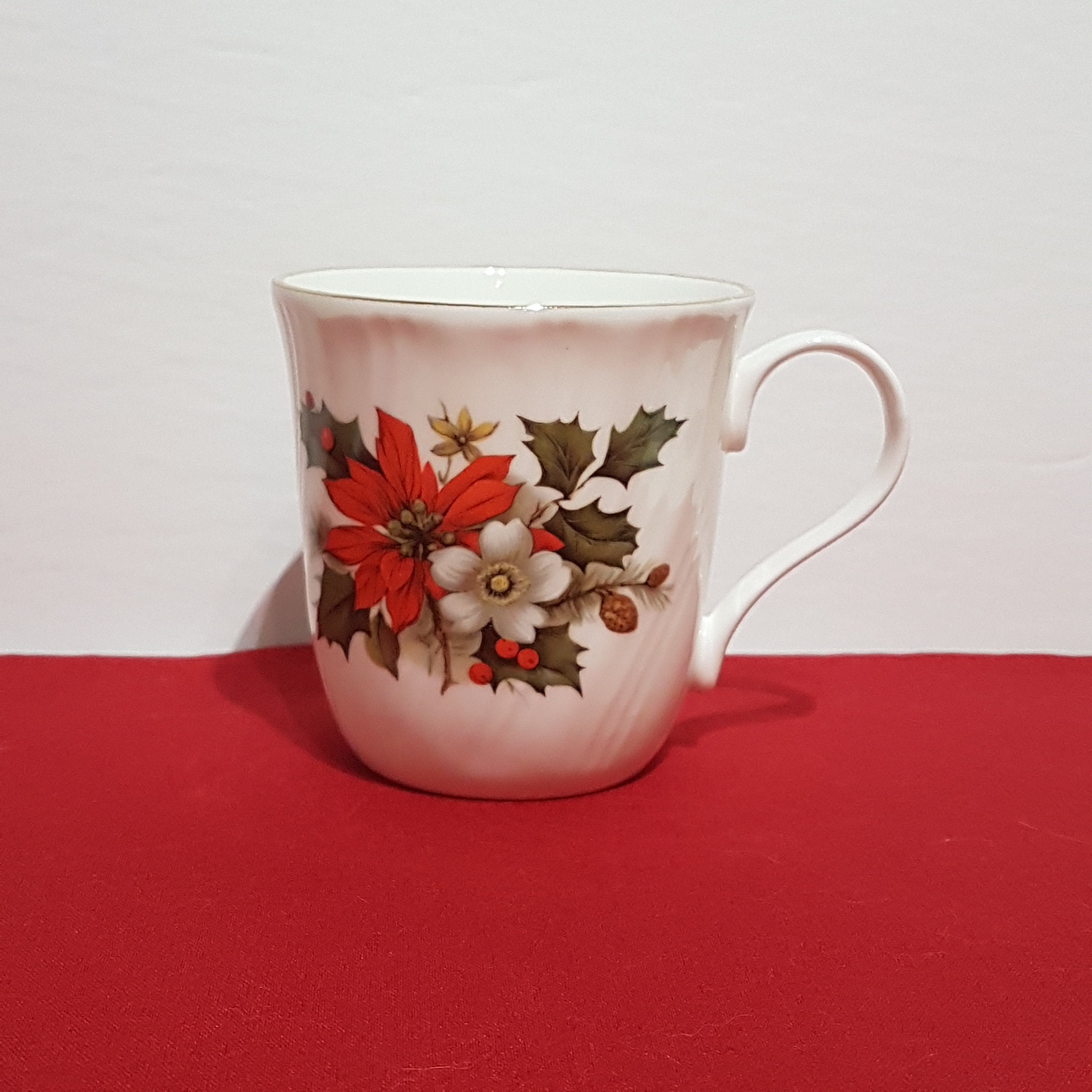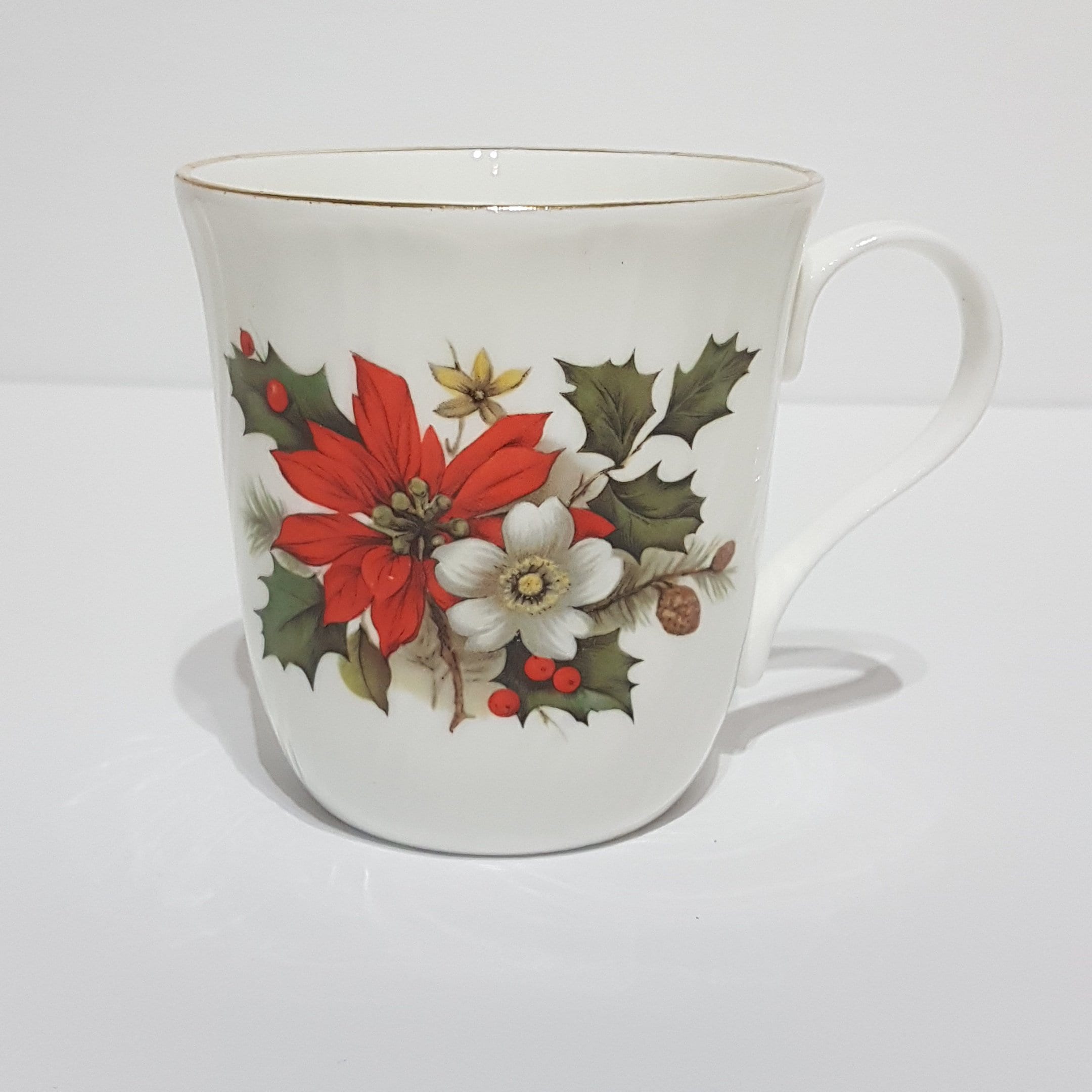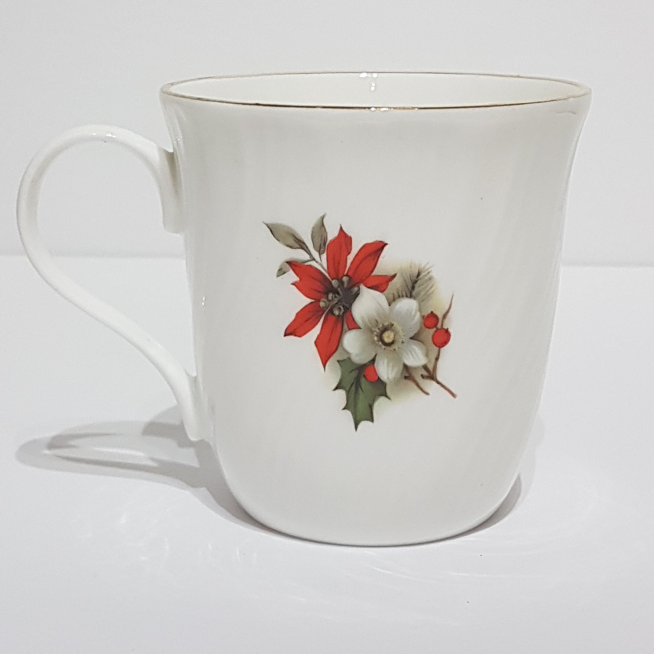 Gold trimmed Christmas mug by Sadler. Festive pattern of holly, berries and red poinsettia on a crisp white background. The bone china has a lovely ripped twist. (see pic #10 for a close up)