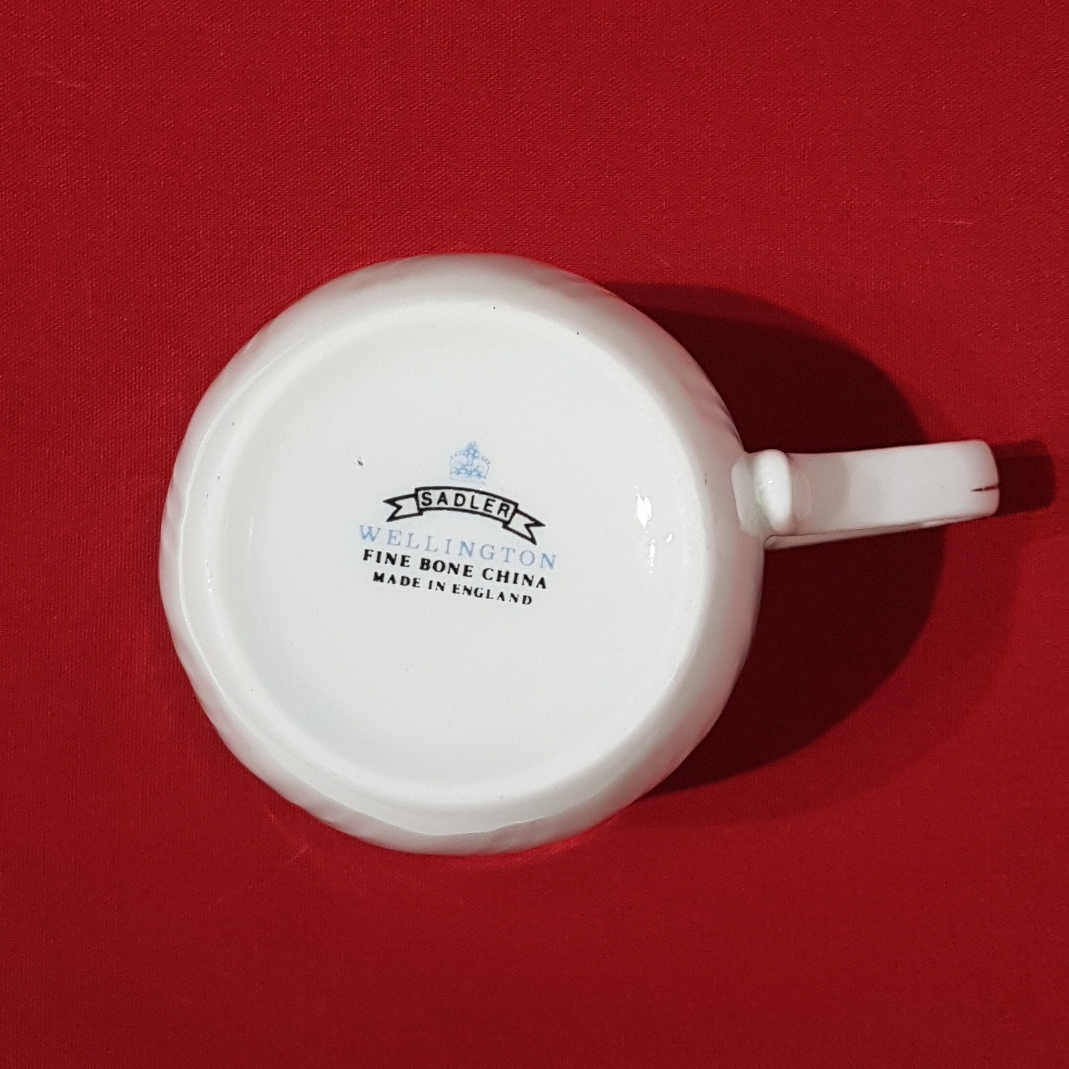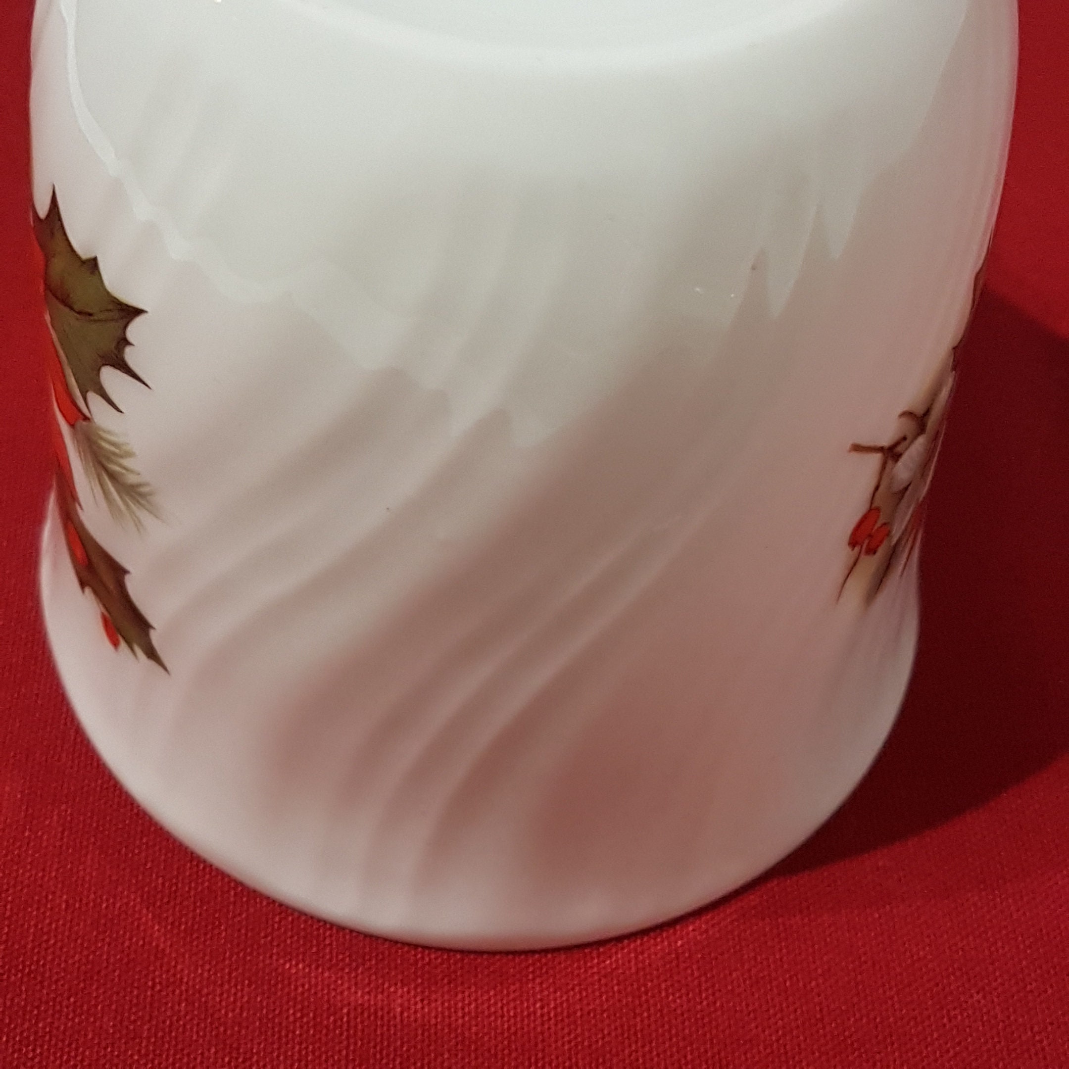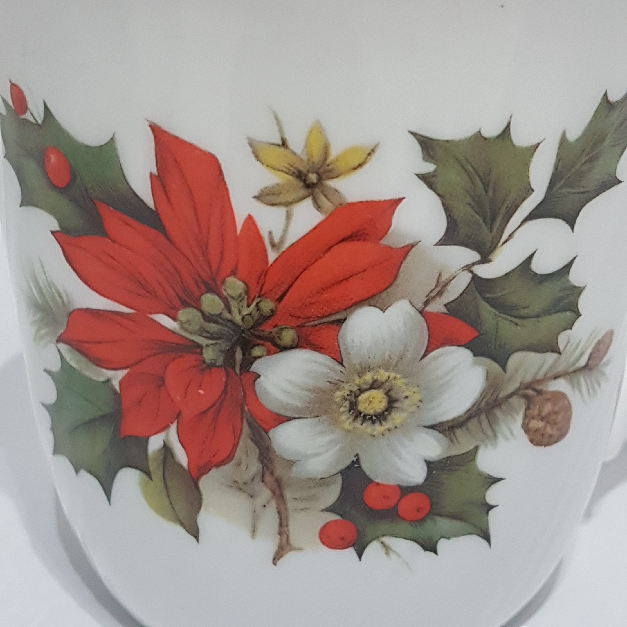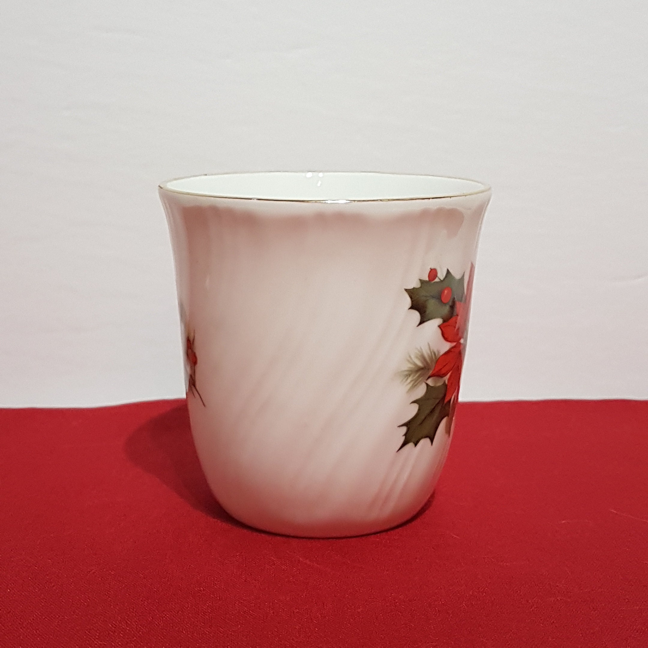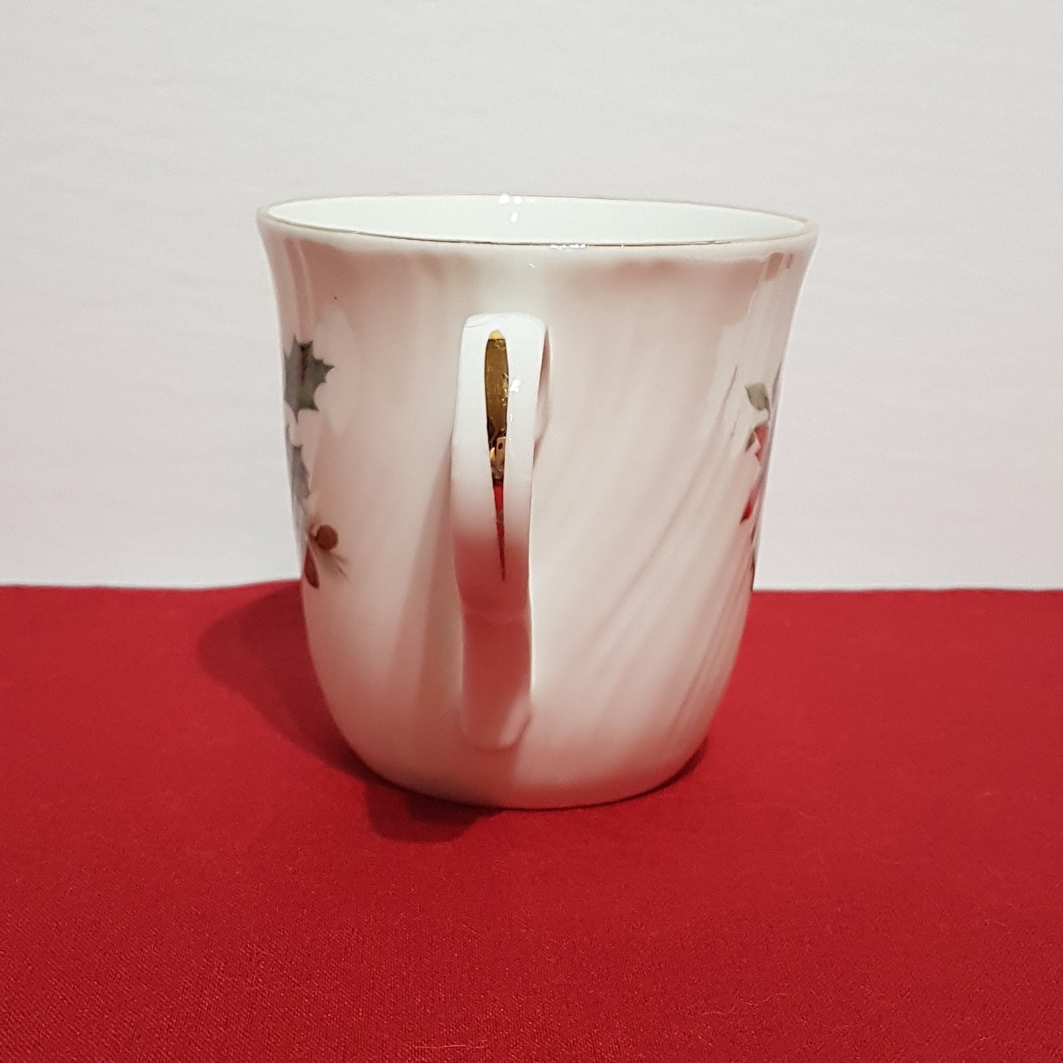 Gold trimmed Christmas mug by Sadler. Festive pattern of holly, berries and red poinsettia on a crisp white background. The bone china has a lovely ripped twist. (see pic #10 for a close up)