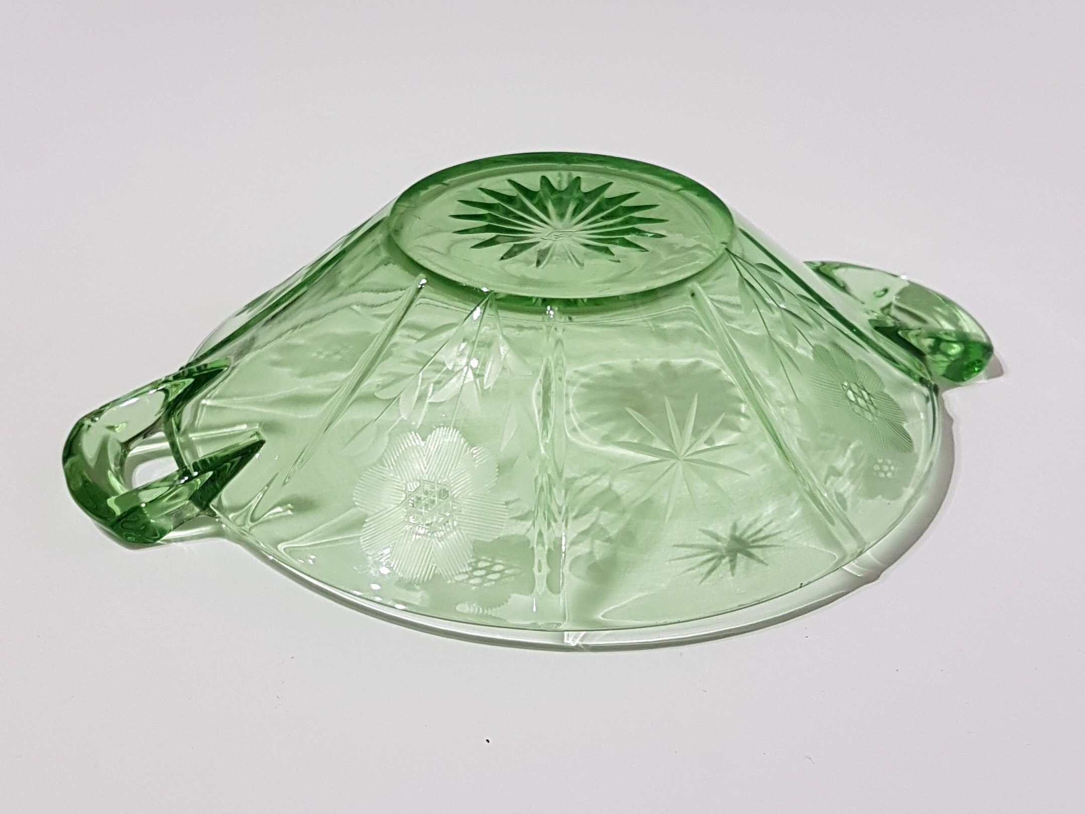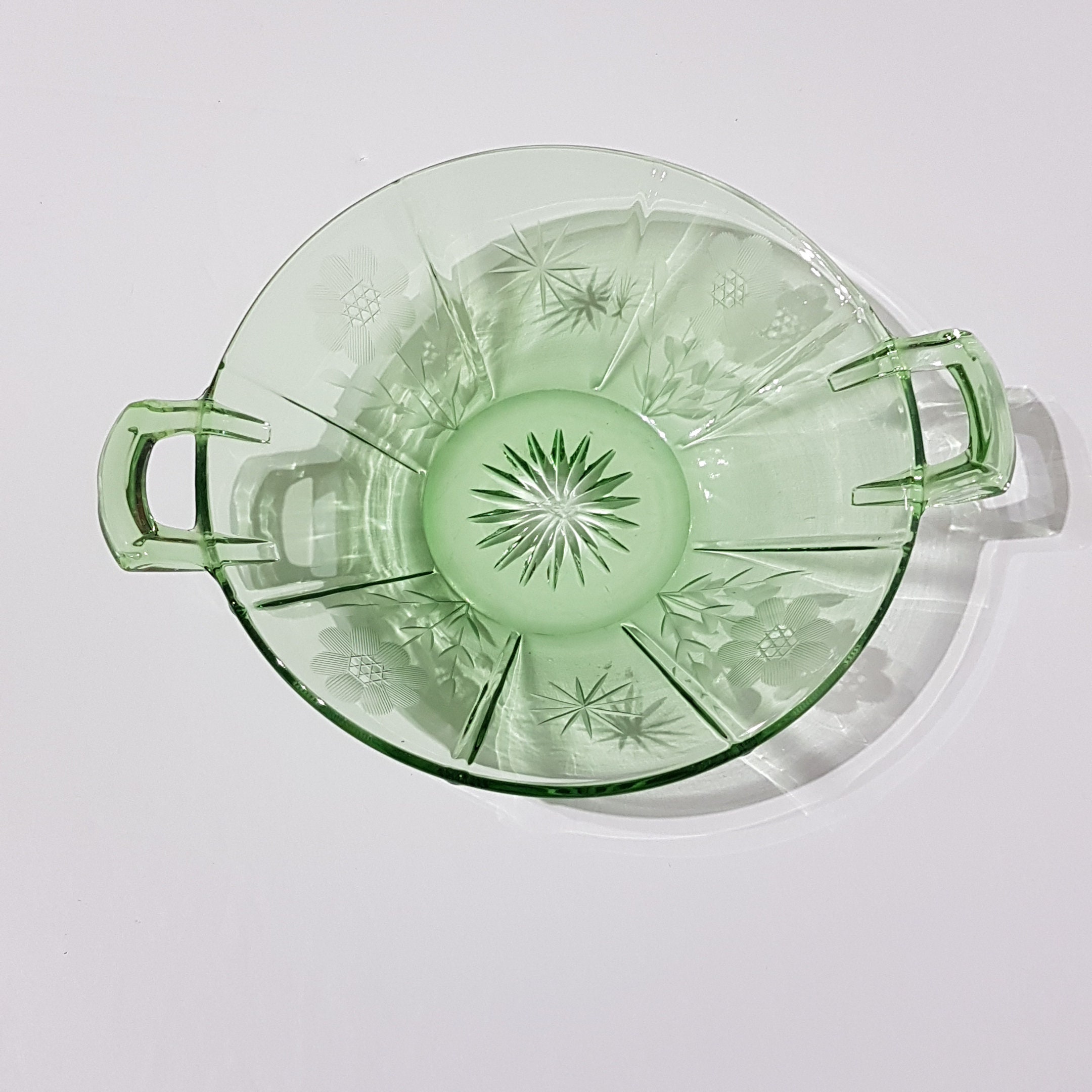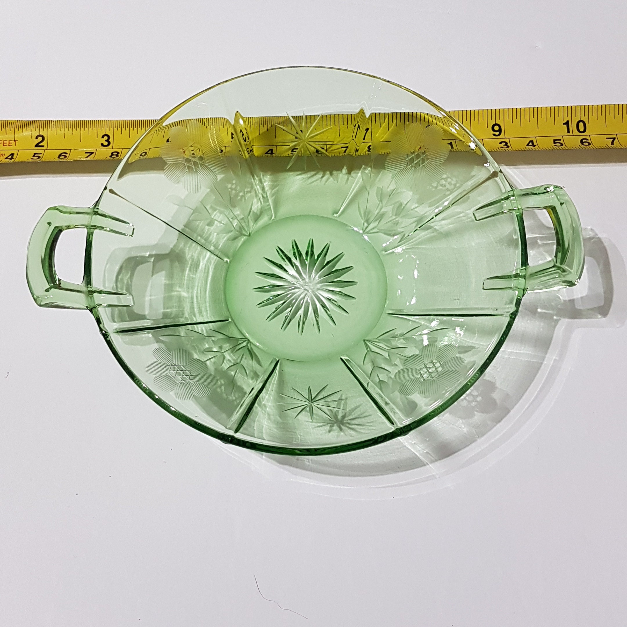 Vintage green Depression glass serving dish with floral and starburst etchings.