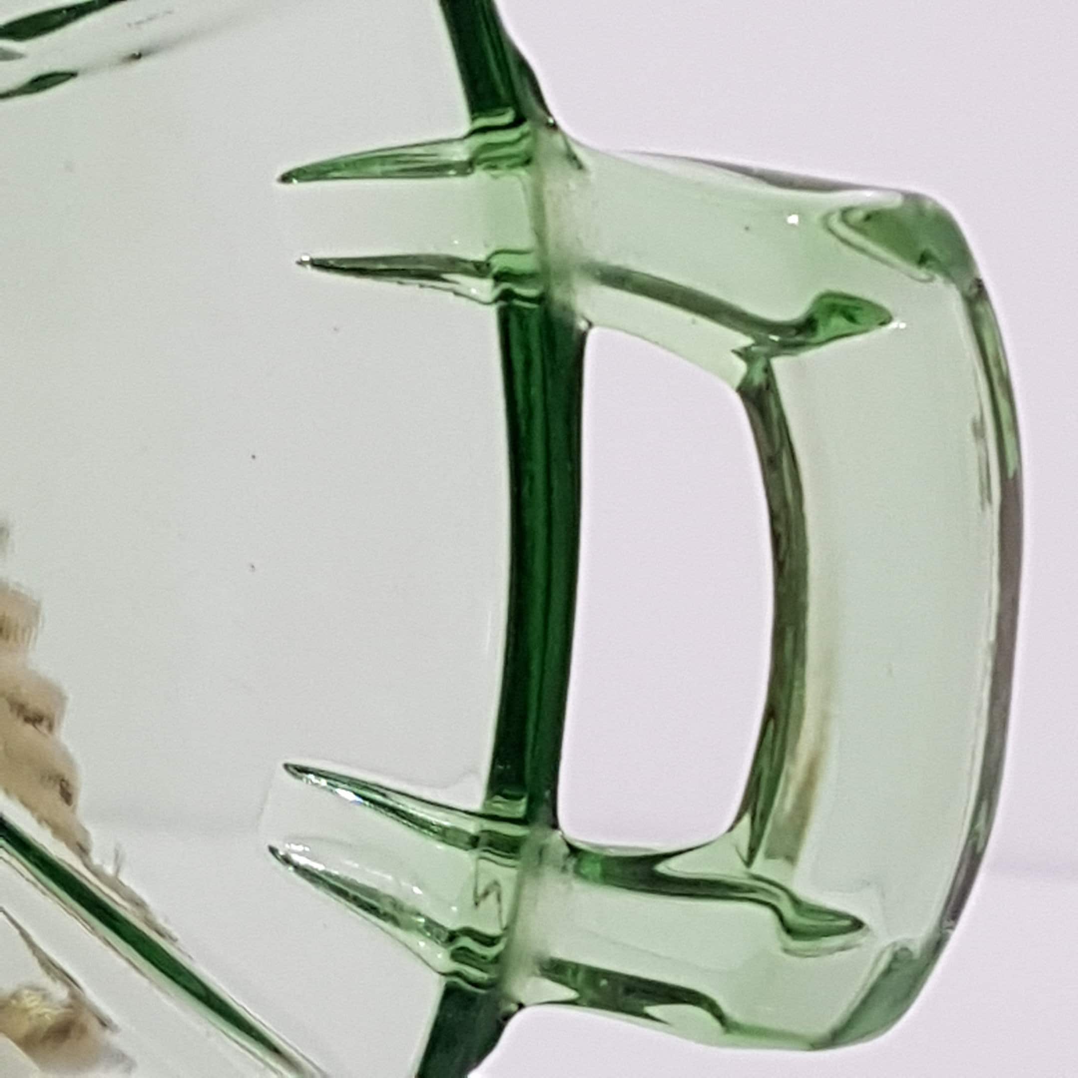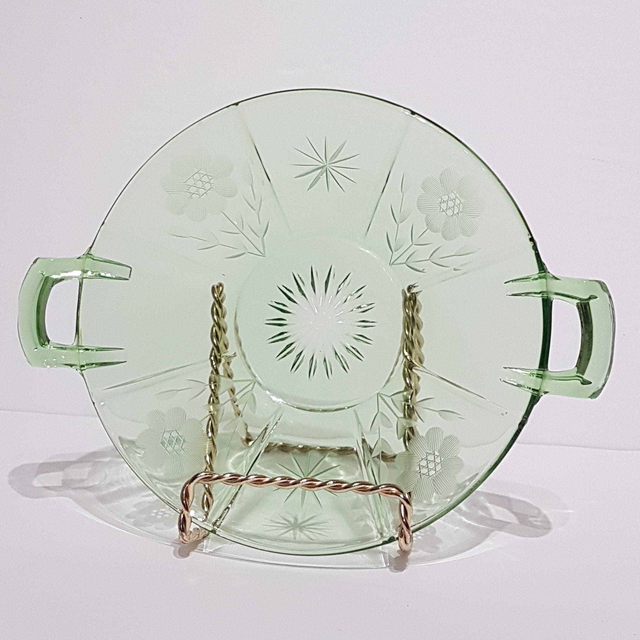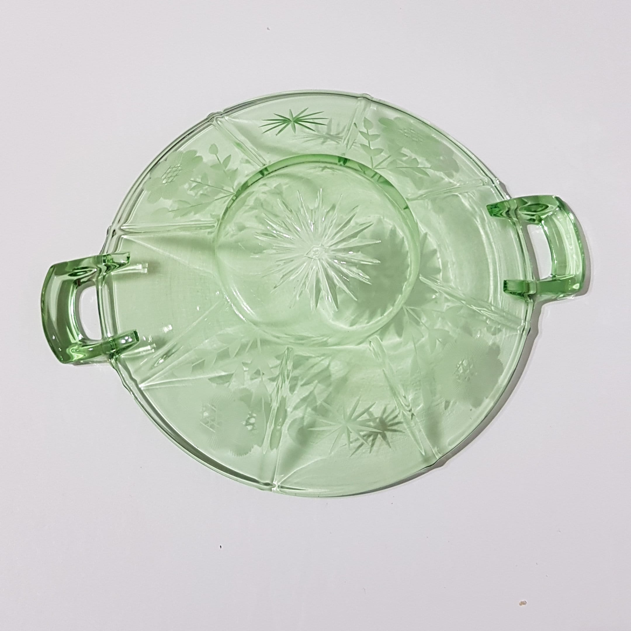 Vintage green Depression glass serving dish with floral and starburst etchings.